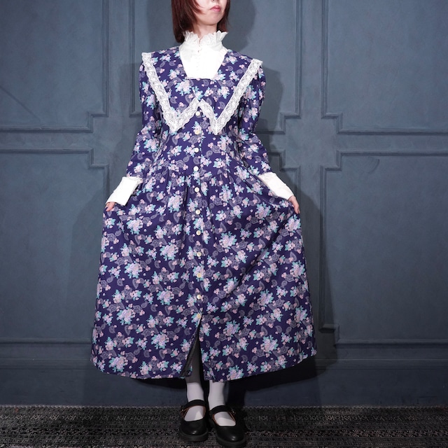 80’s USA VINTAGE Eder SANFRANCISCO FLOWER PATTERNED SAILER LACE COLLAR DESIGN ONE PIECE/80年代お花柄セーラーレースカラーデザインワンピース