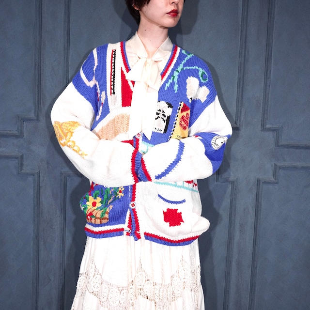 USA VINTAGE the eagle's eye HOSPITAL TEDDY BEAR DESIGN COTTON RAMIE HAND KNIT CARDIGAN/アメリカ古着ホスピタルテディベアデザインコットンラミーハンドニットカーディガン