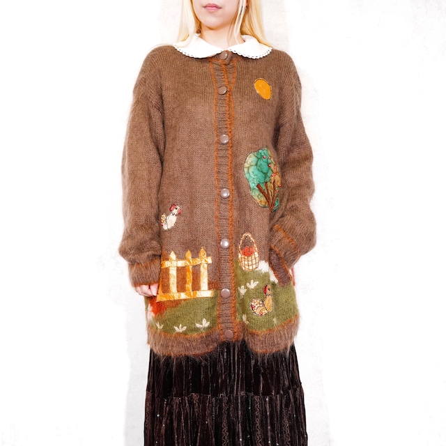 EU VINTAGE TAGORE HAND EMBROIDERY PATCHWORK DESIGN MOHAIR KNIT CARDIGAN/ヨーロッパ古着ハンド刺繍パッチワークデザインモヘアニットカーディガン