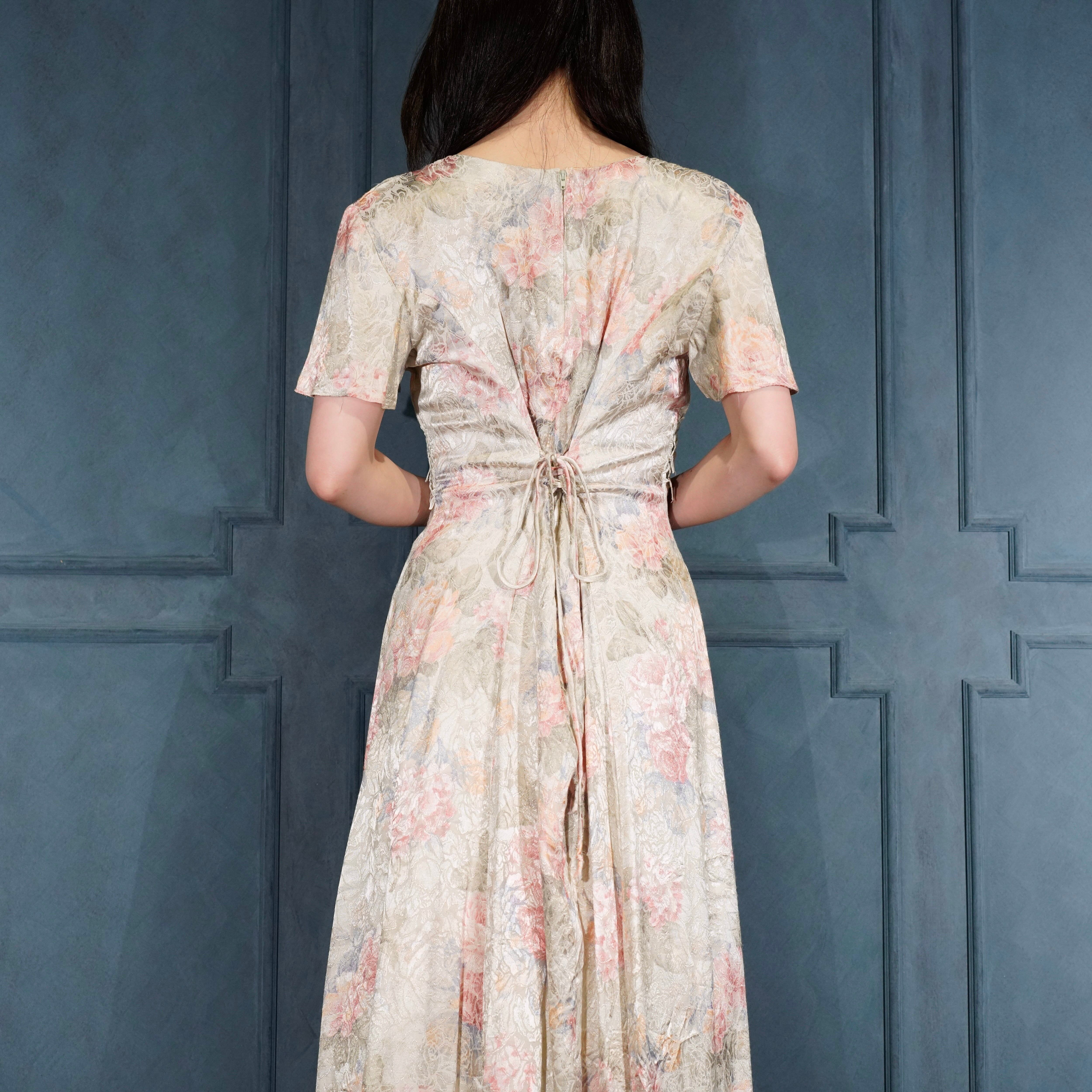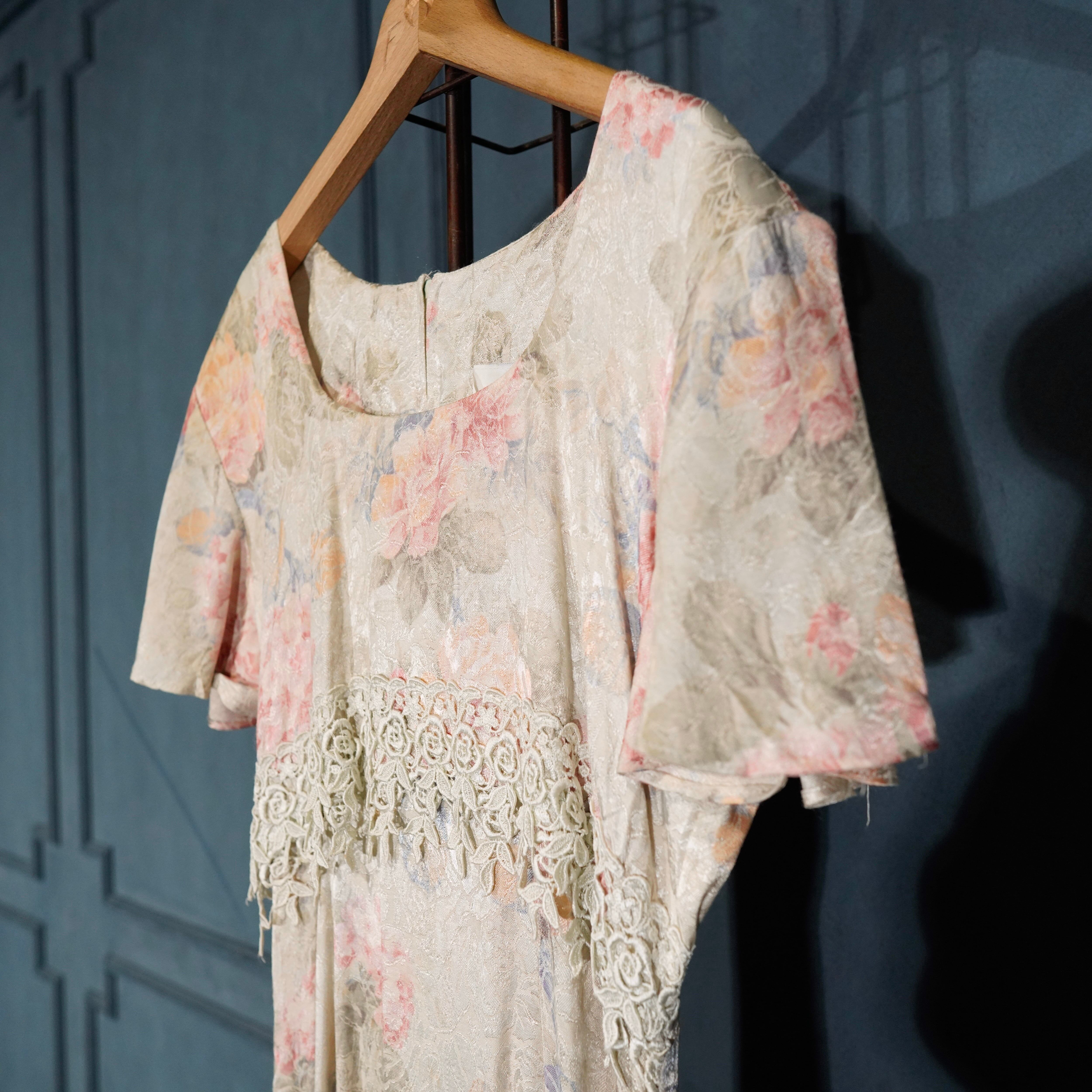 USA VINTAGE Jody of California FLOWER PATTERNED EMBROIDERY JACQUARD BACK RIBBON LACE DESIGN ONE PIECE MADE IN USA/アメリカ古着お花ジャガード刺繍バッグリボンレースデザインワンピース