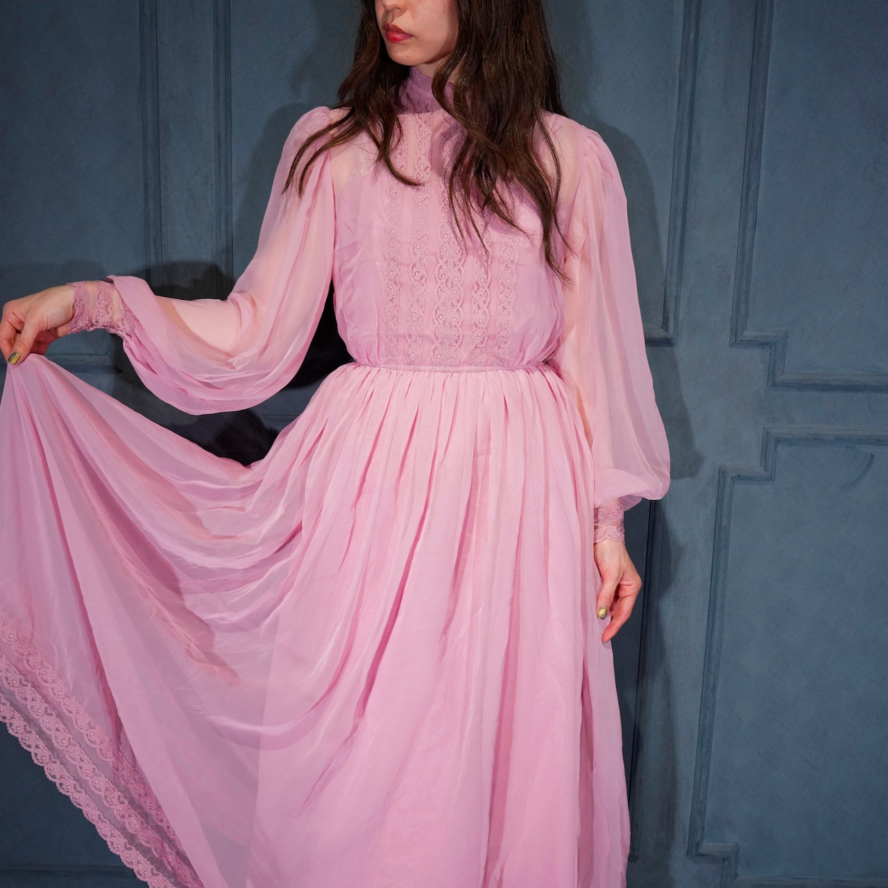 *SPECIAL ITEM* 70's USA VINTAGE LACE DESIGN CHIFFON COLOR DRESS ONE PIECE/70年代アメリカ古着レースデザインシフォンカラードレスワンピース