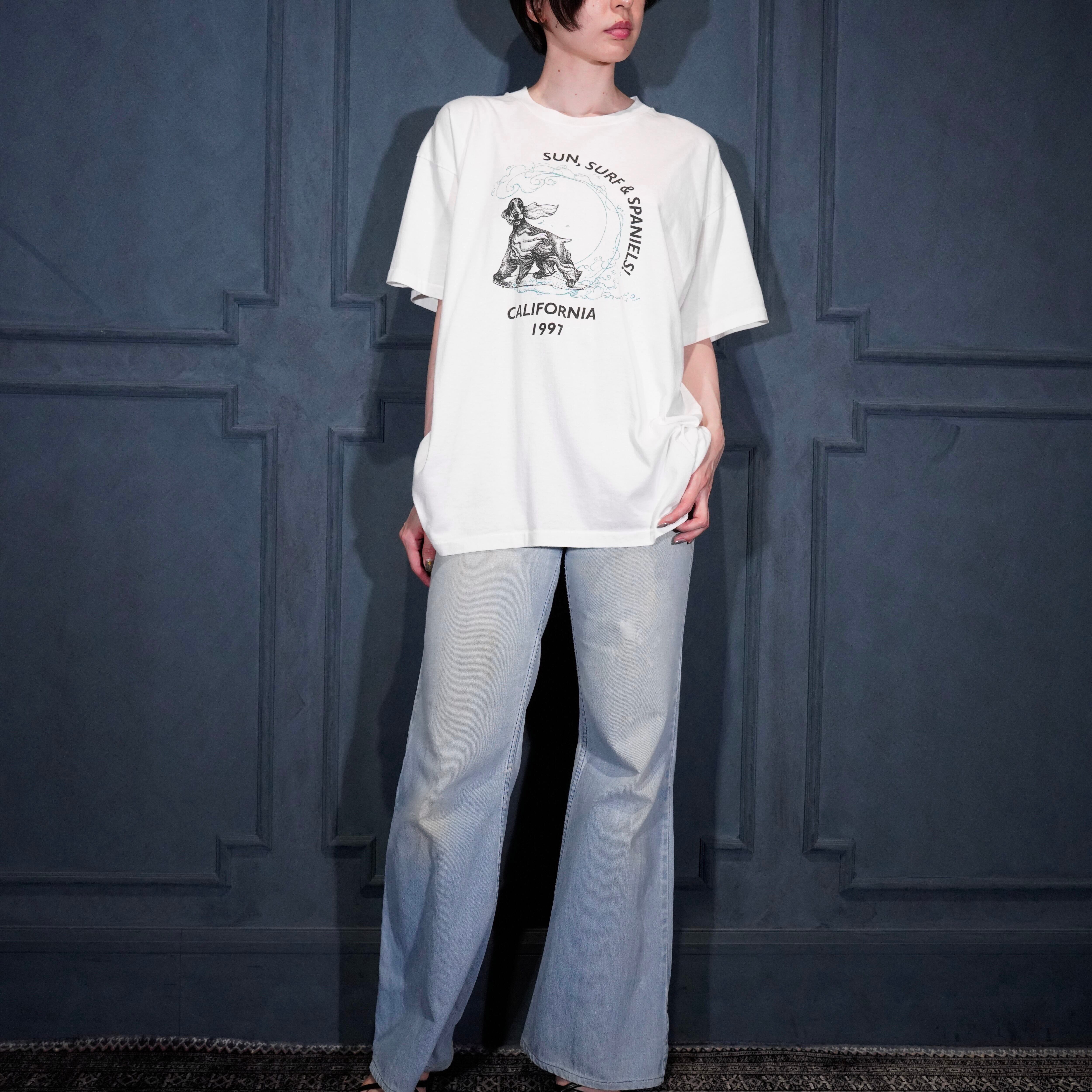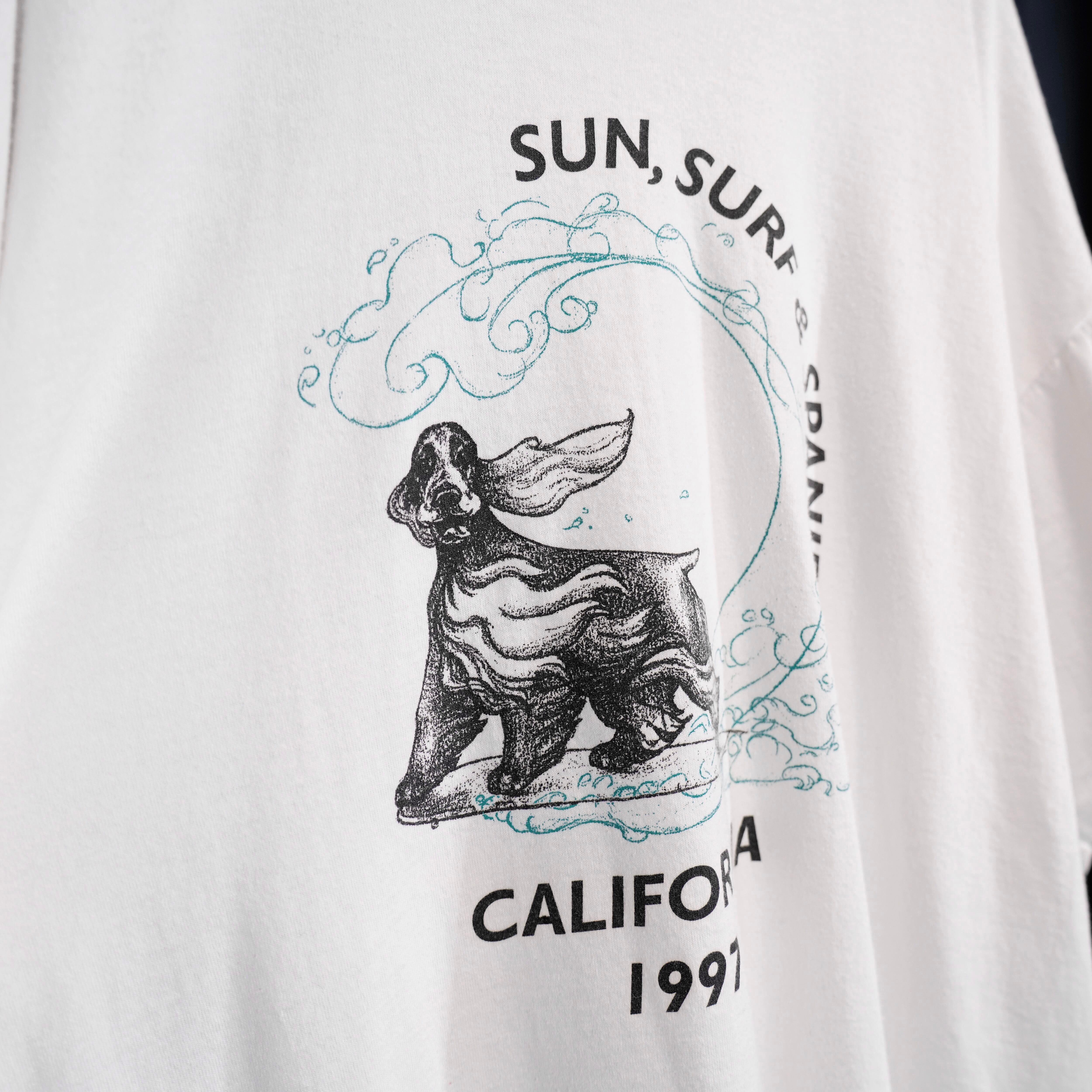 90's USA VINTAGE ONEITA SUN, SURF&SPANIELS! SURFING DOG PRINT DESIGN T SHIRT/90年代アメリカ古着サーフィンわんこプリントデザインTシャツ