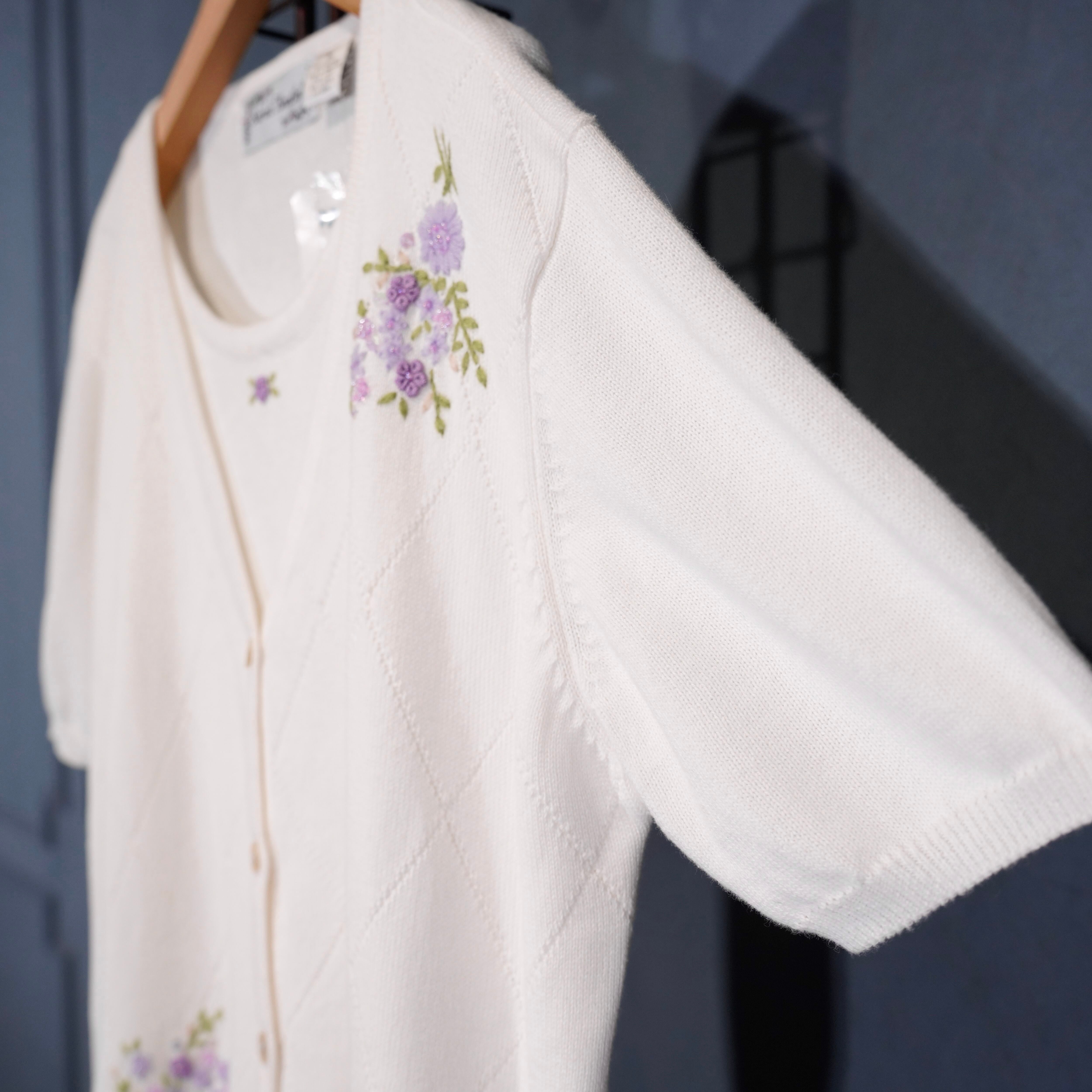 USA VINTAGE Sarah Bentley FLOWER EMBROIDERY DESIGN HALF SLEEVE ENSEMBLE KNIT CARDIGAN/アメリカ古着お花刺繍デザイン半袖アンサンブルニットカーディガン