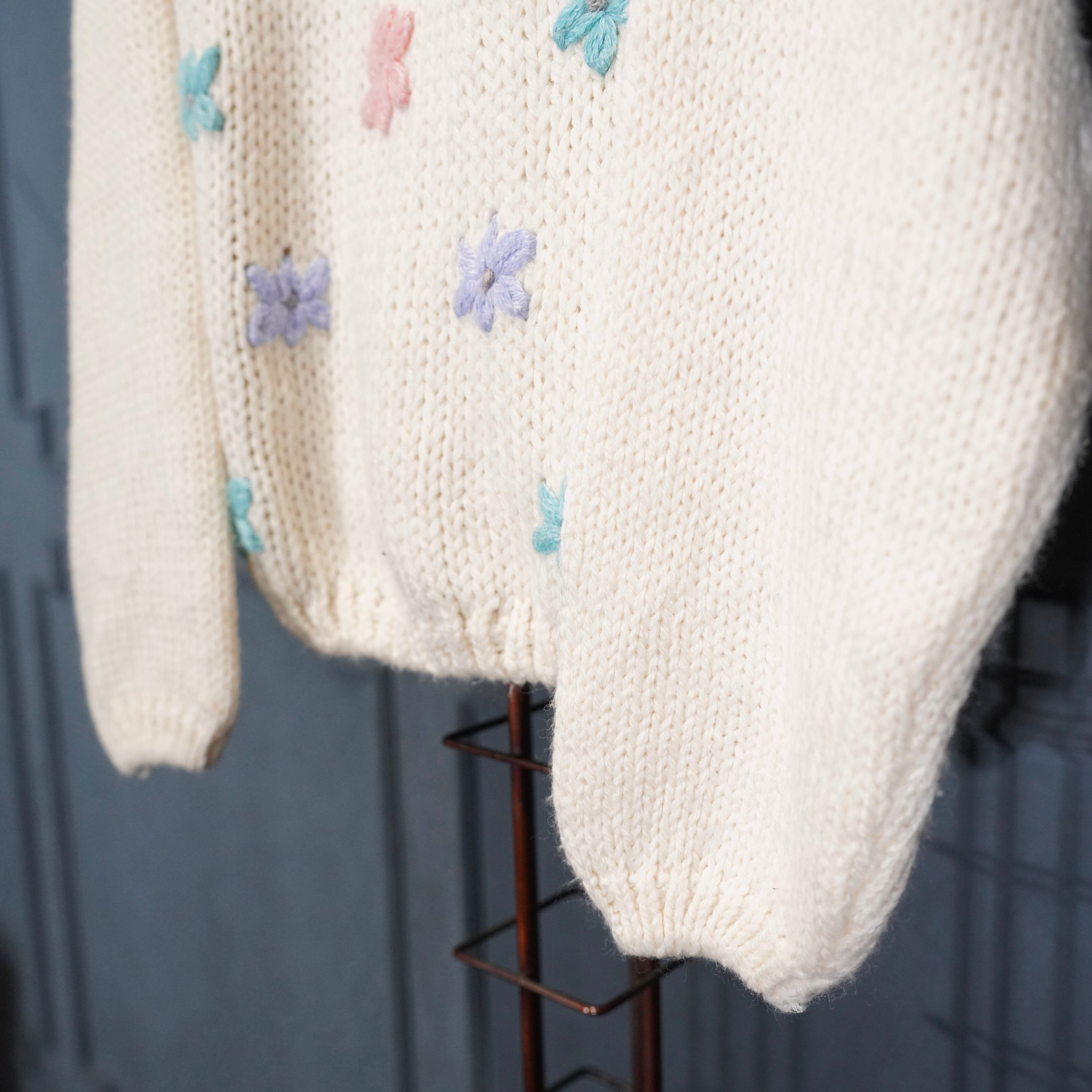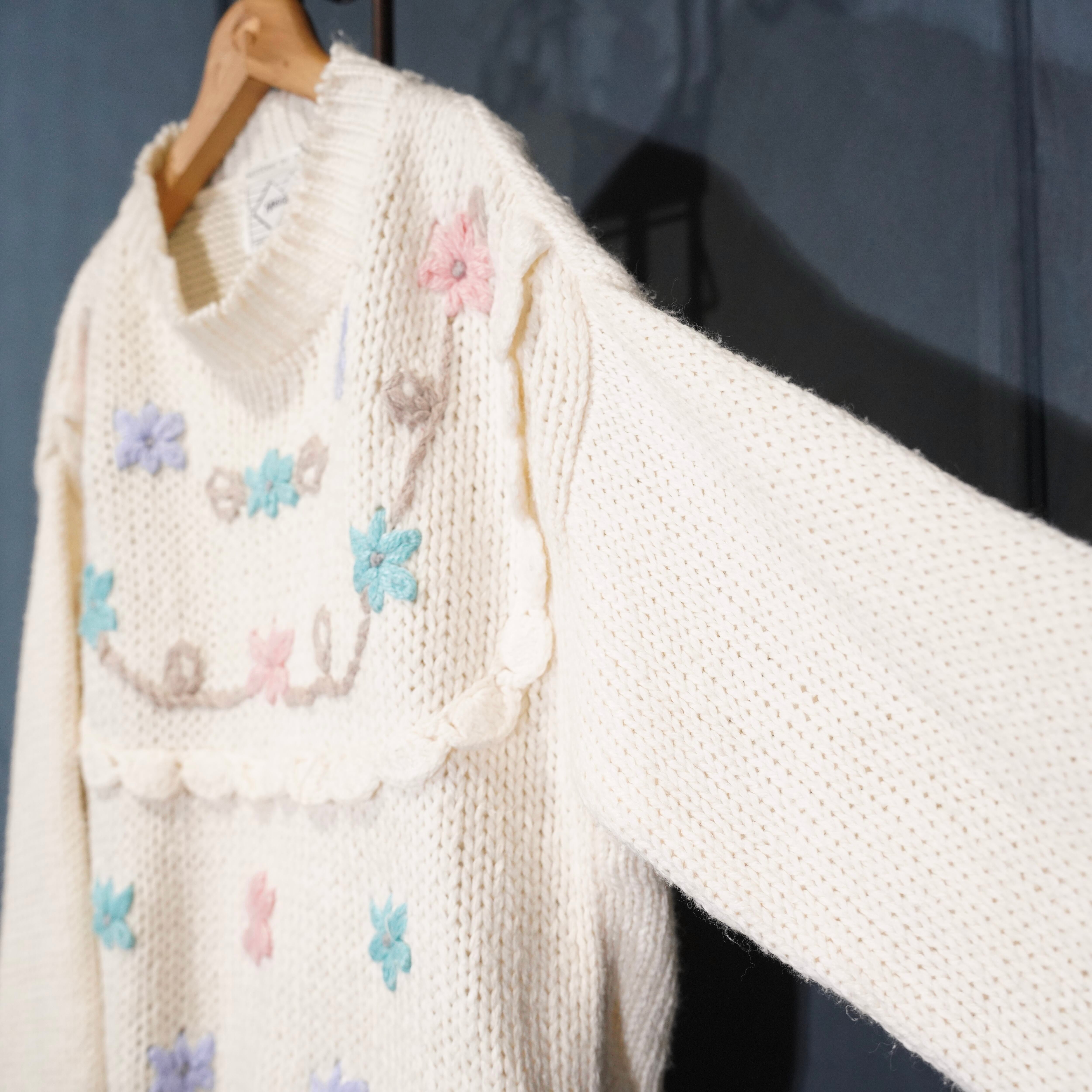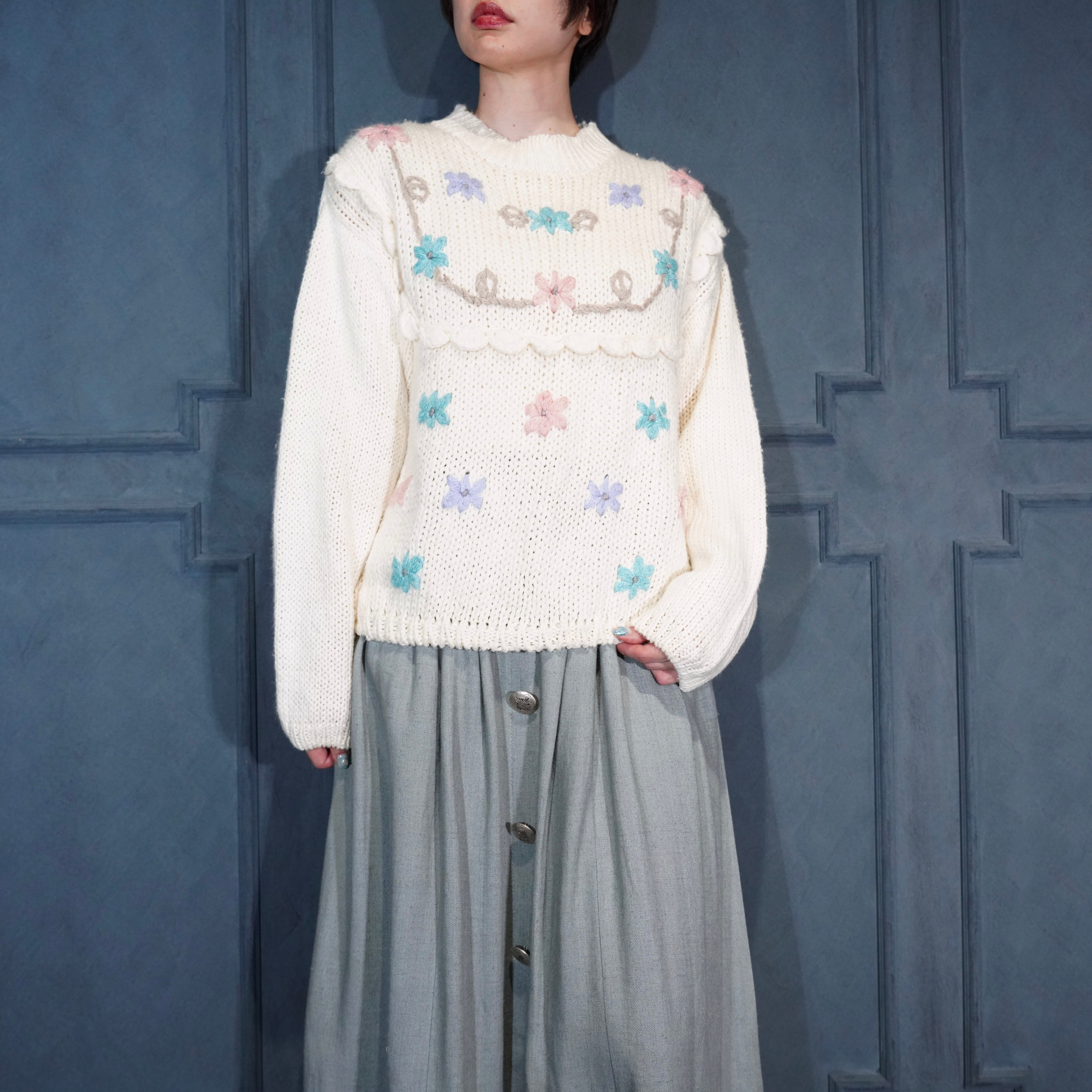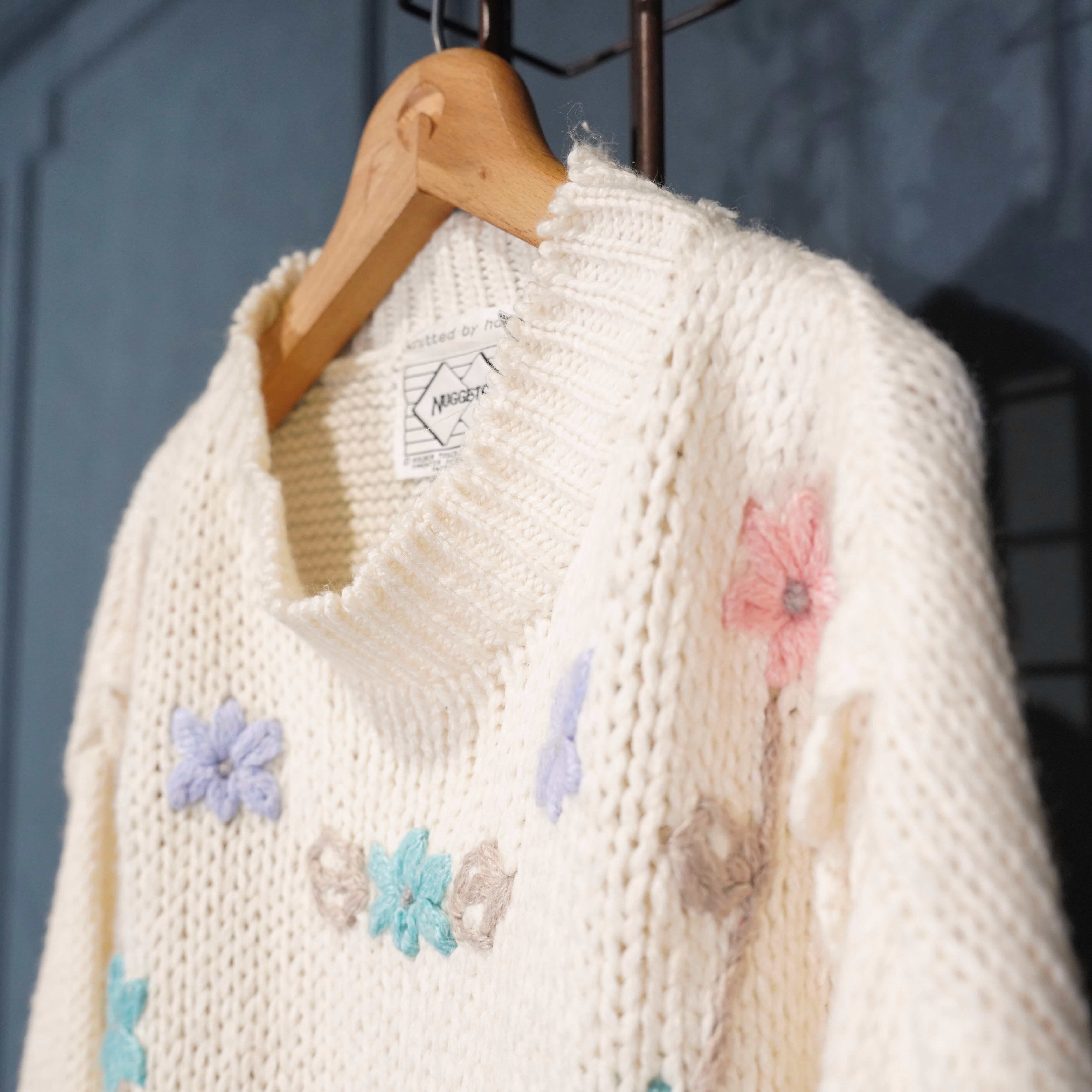 USA VINTAGE knitted by hand NUGGETS FLOWER EMBROIDERY FRILL DESIGN HAND KNIT/アメリカ古着お花刺繍フリルデザインハンドニット