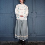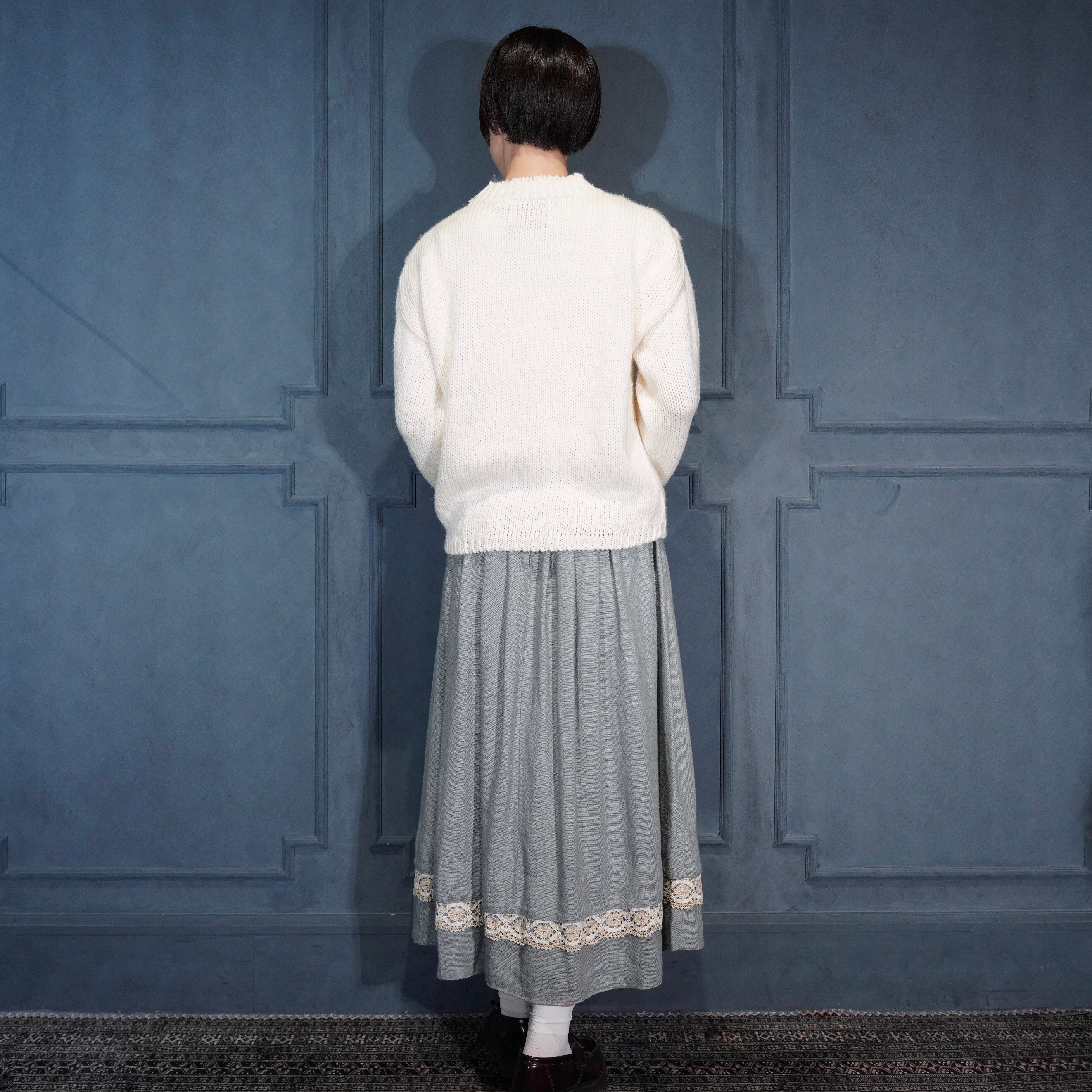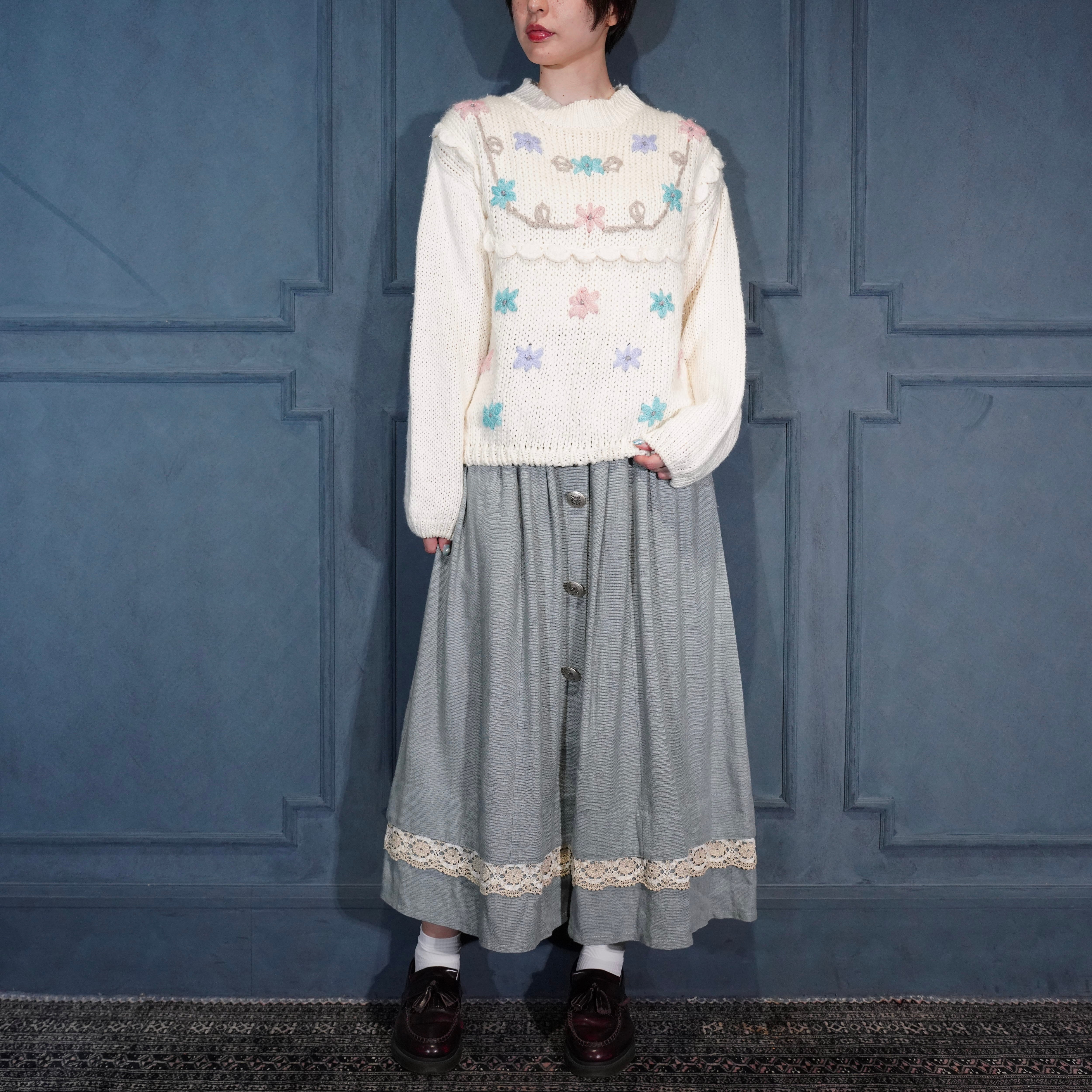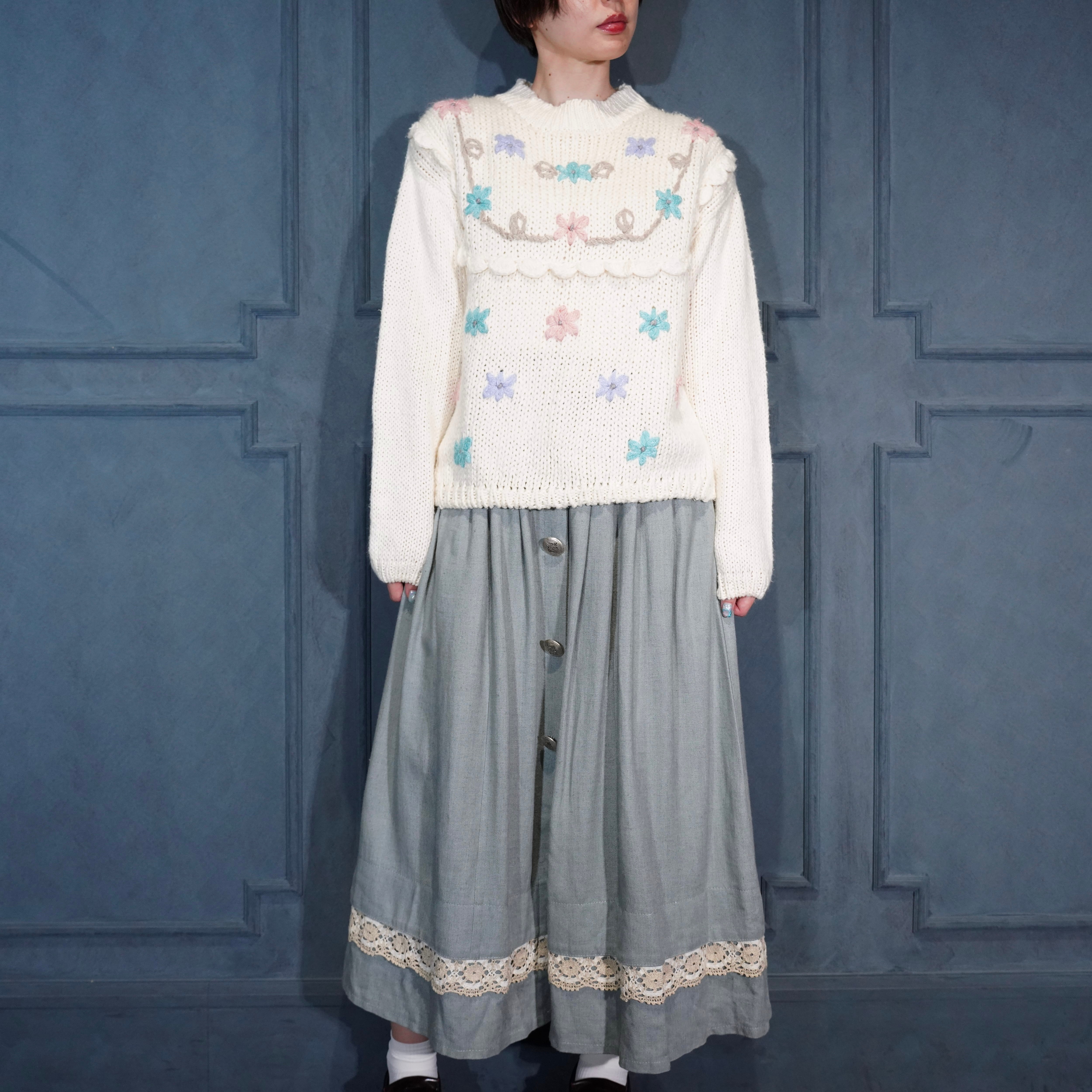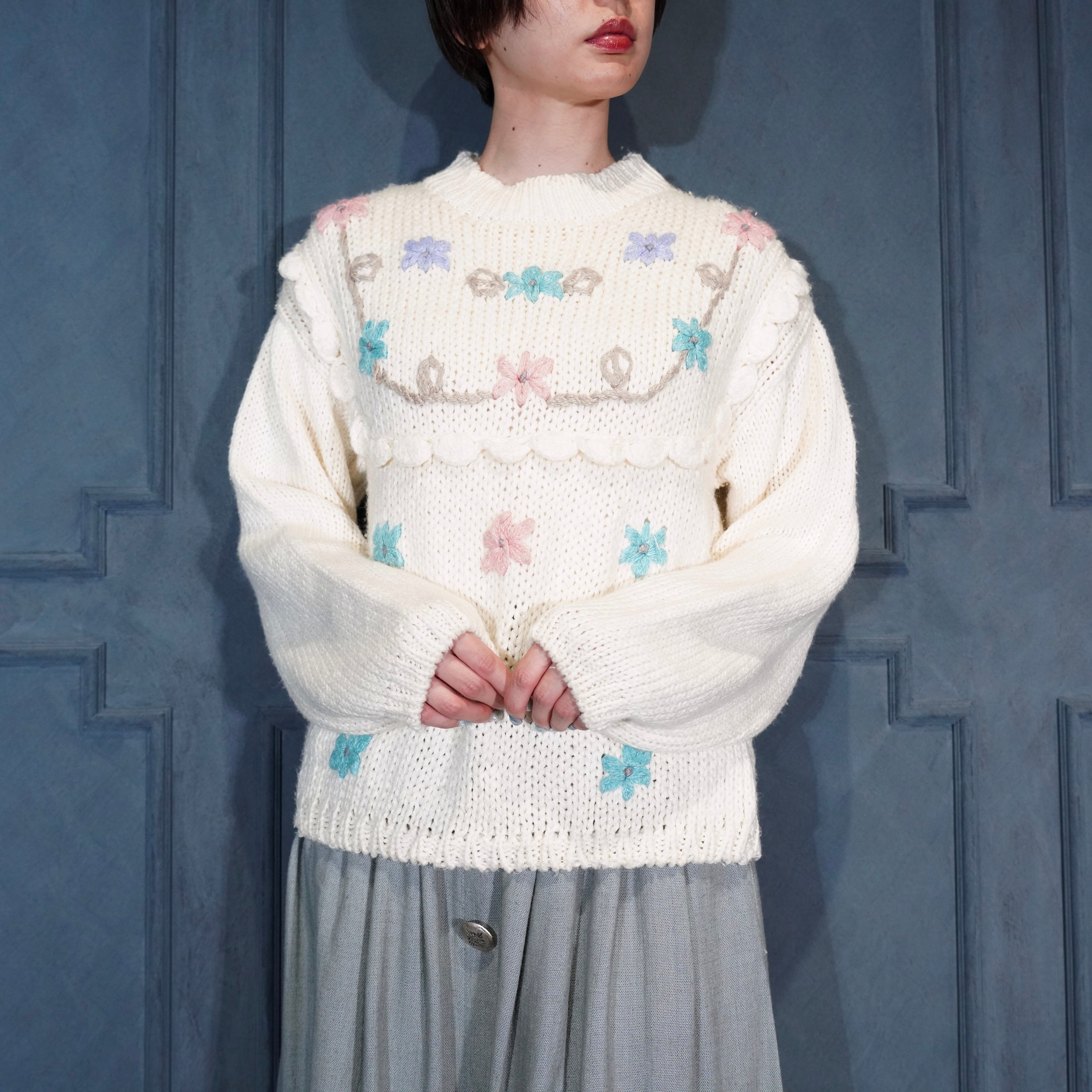 USA VINTAGE knitted by hand NUGGETS FLOWER EMBROIDERY FRILL DESIGN HAND KNIT/アメリカ古着お花刺繍フリルデザインハンドニット