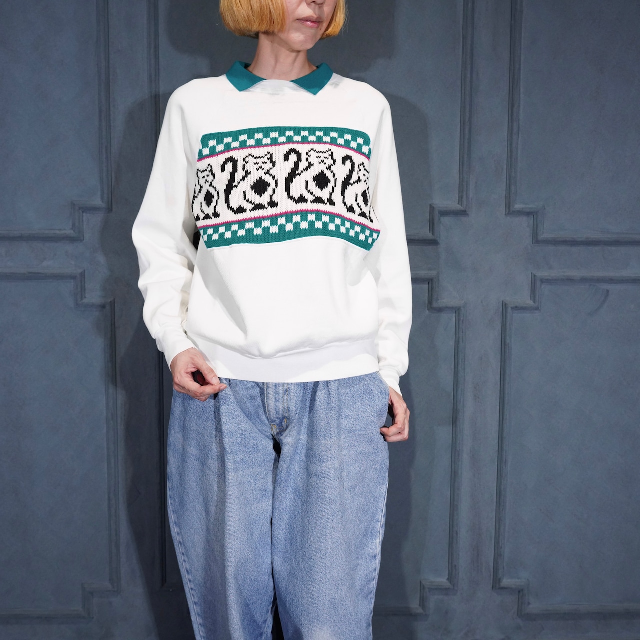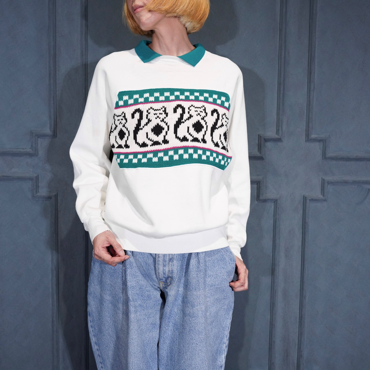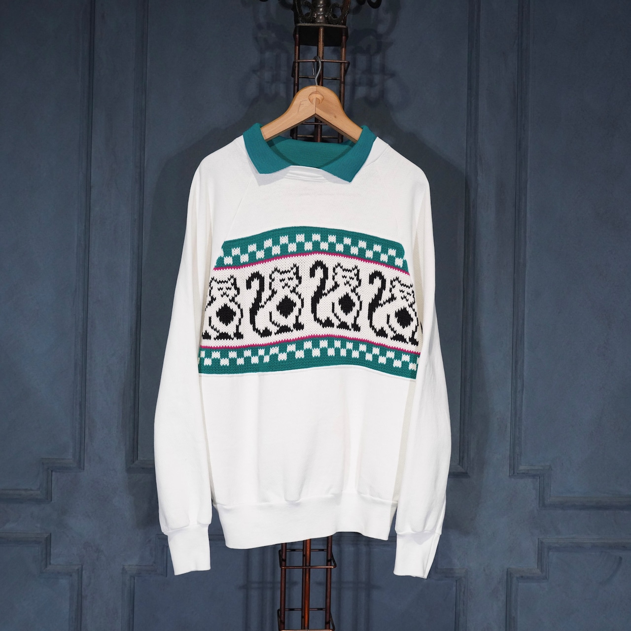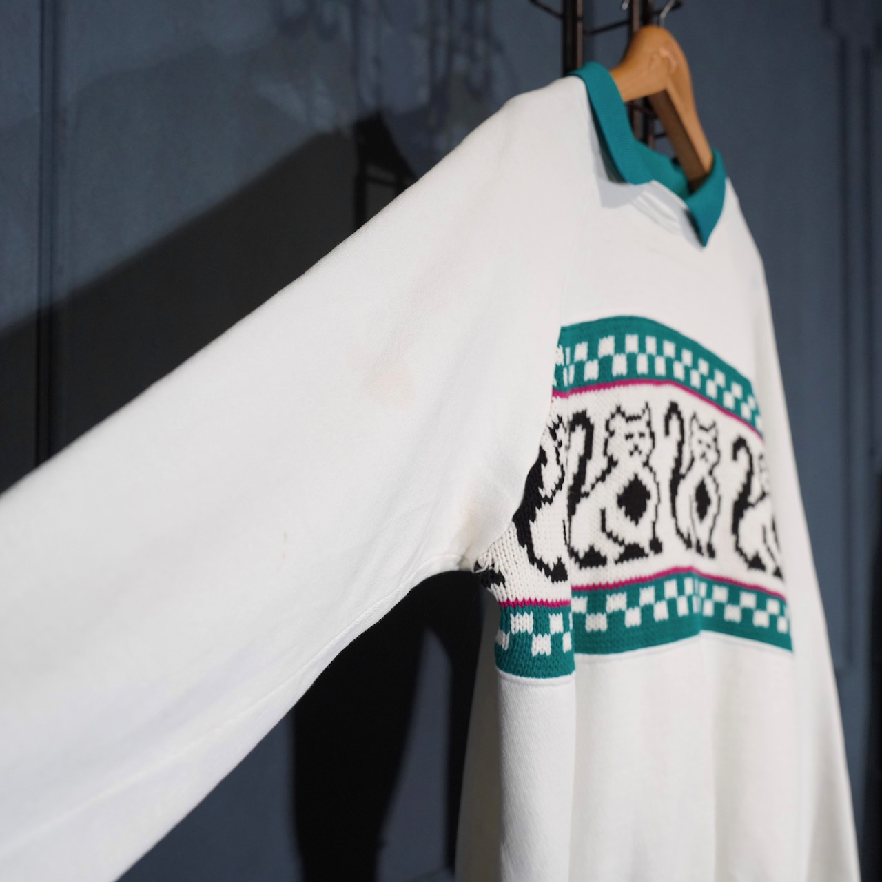 USA VINTAGE Heartland CAT DESIGN KNIT SWITCHED DESIGN POLO SWEAT SHIRT/アメリカ古着にゃんこデザインニット切替ポロスウェット