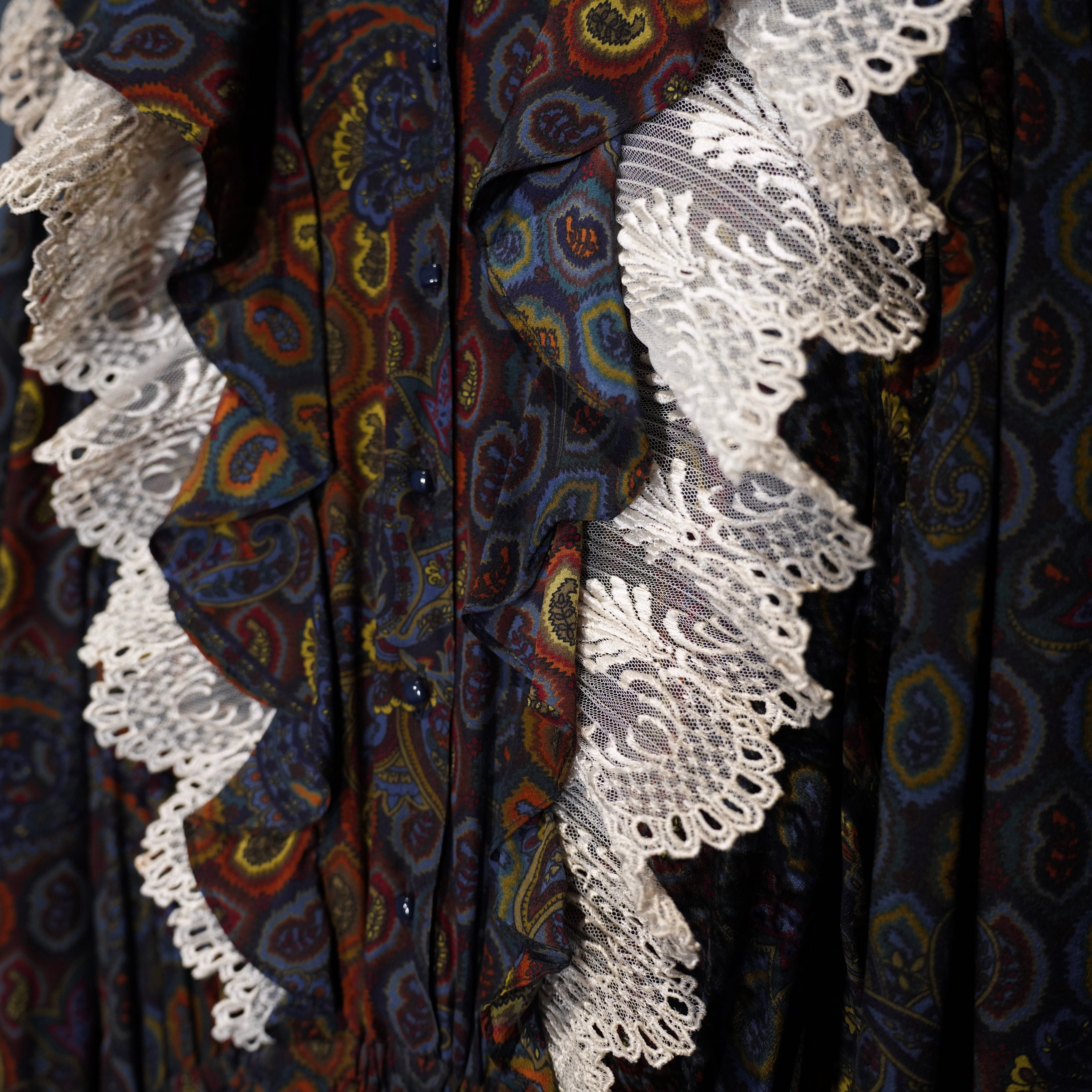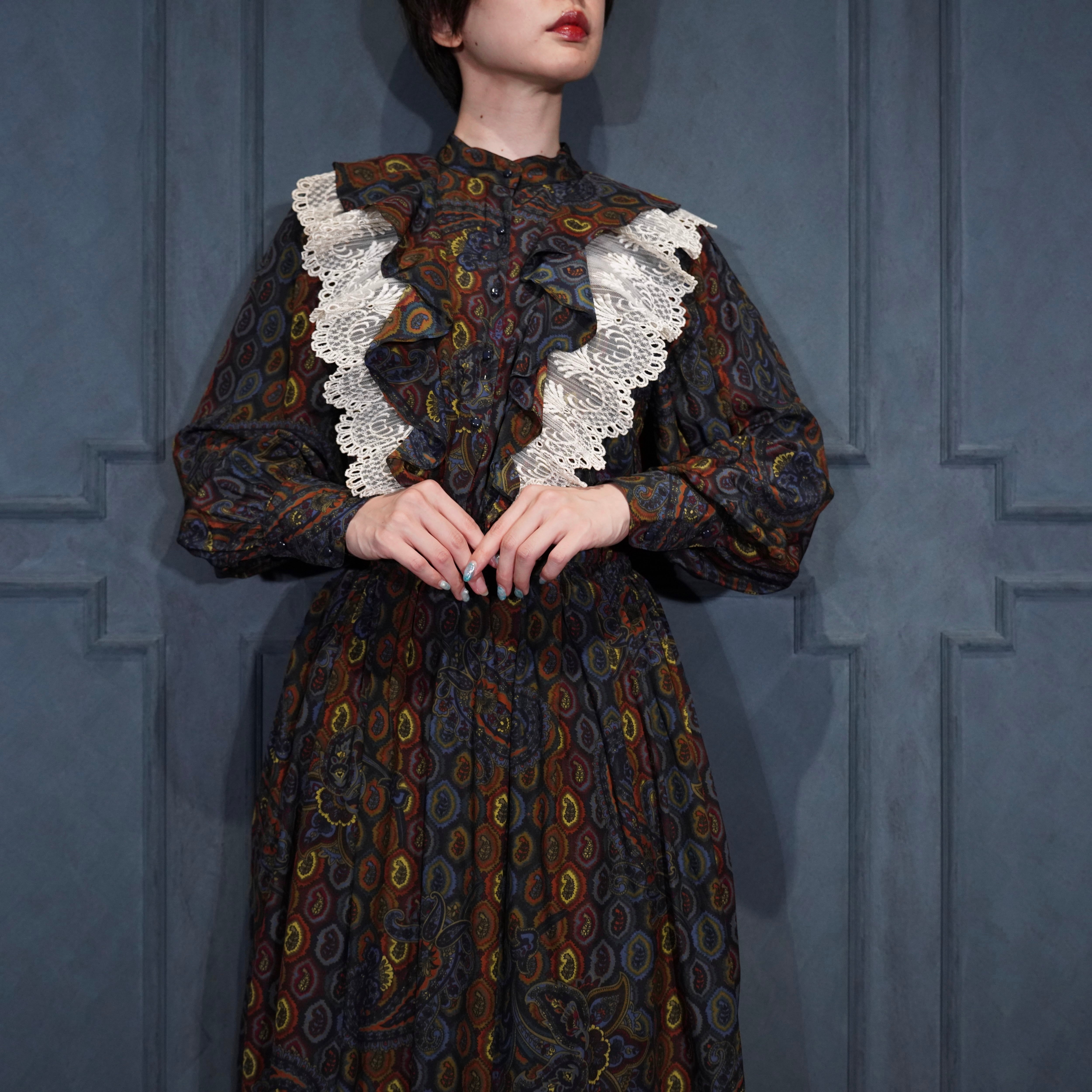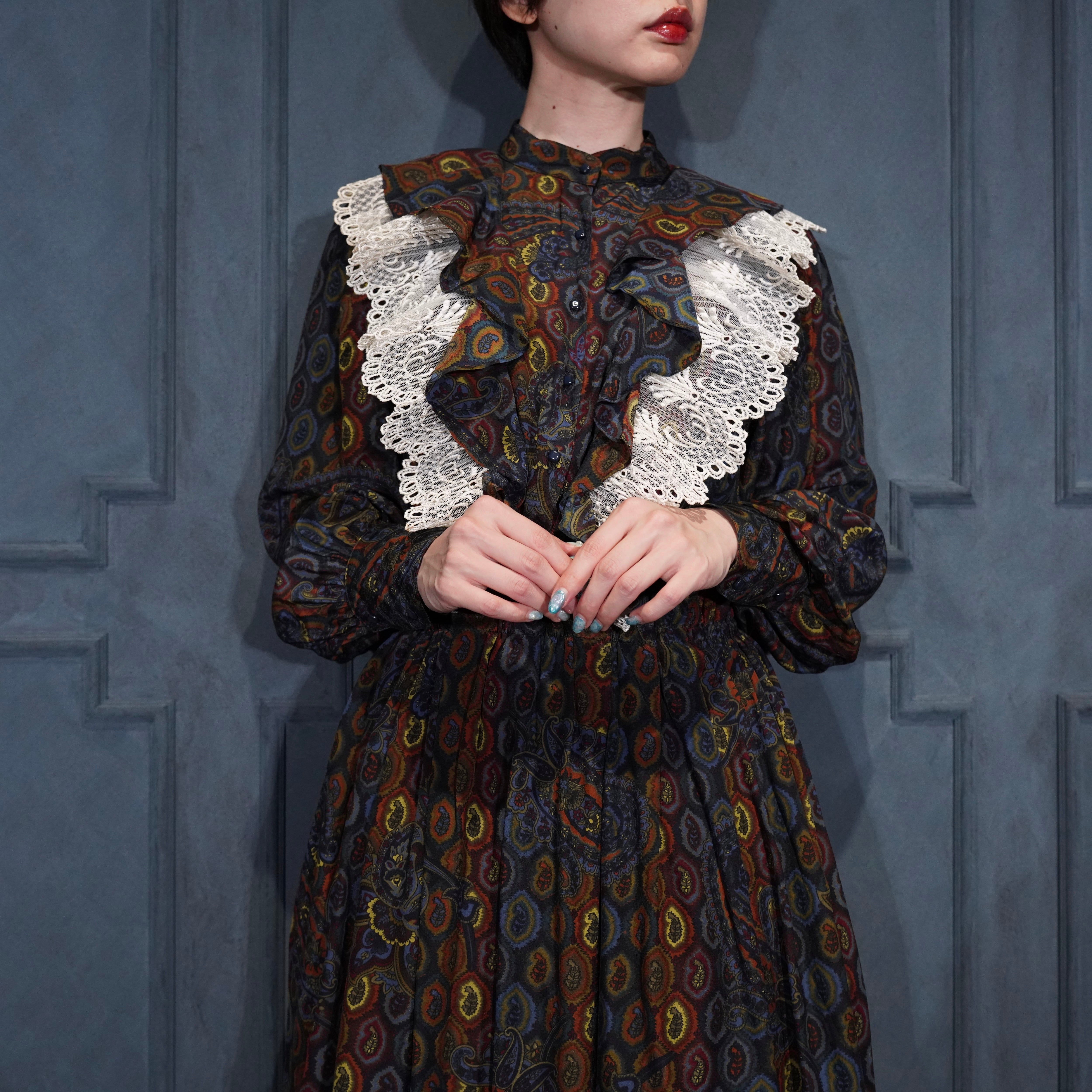 EU VINTAGE DRESS WITHJOY by Trixi Schober PAISLEY PATTERNED LACE FRILL DESIGN SILK ONE PIECE/ヨーロッパ古着ペイズリー柄レースフリルデザインシルクワンピース