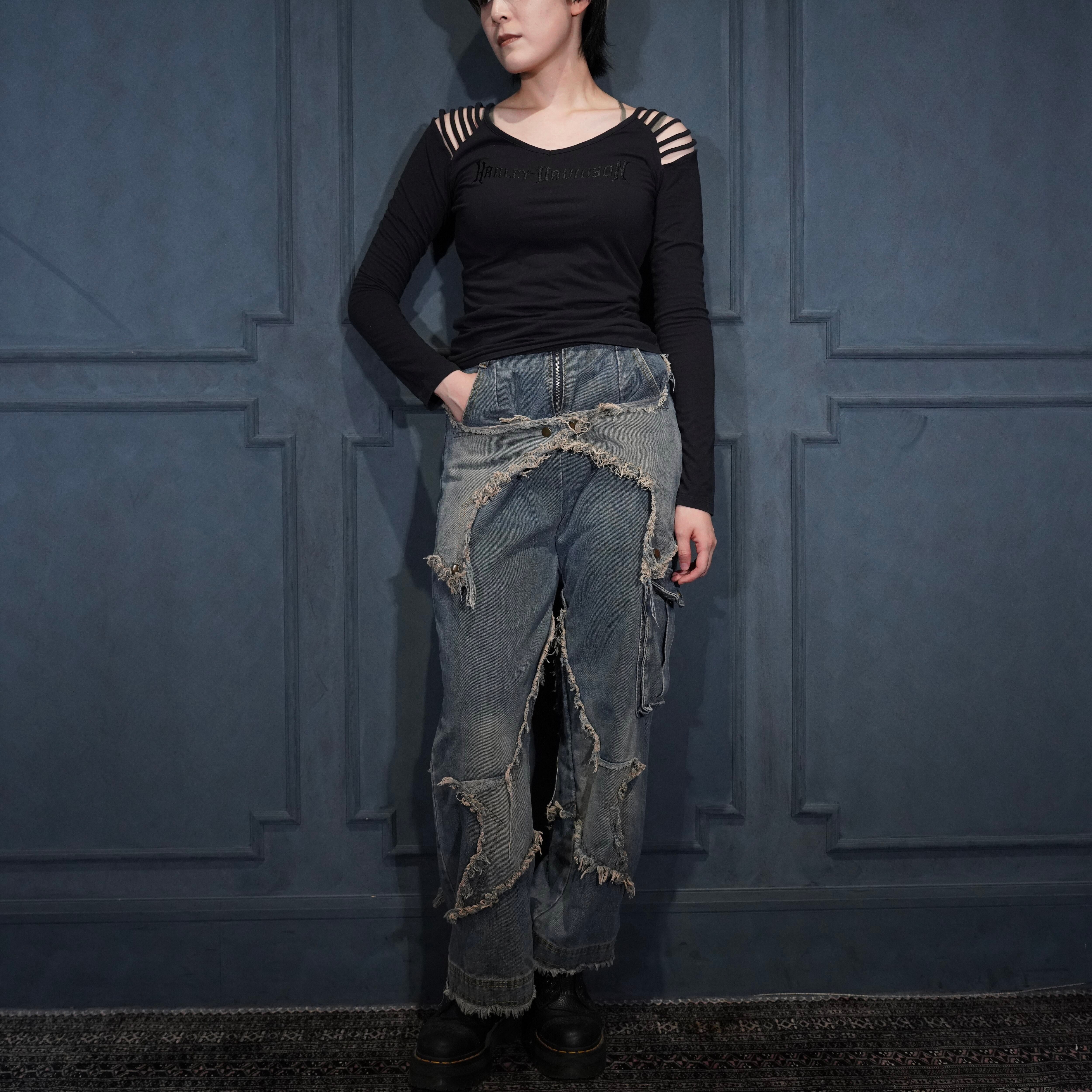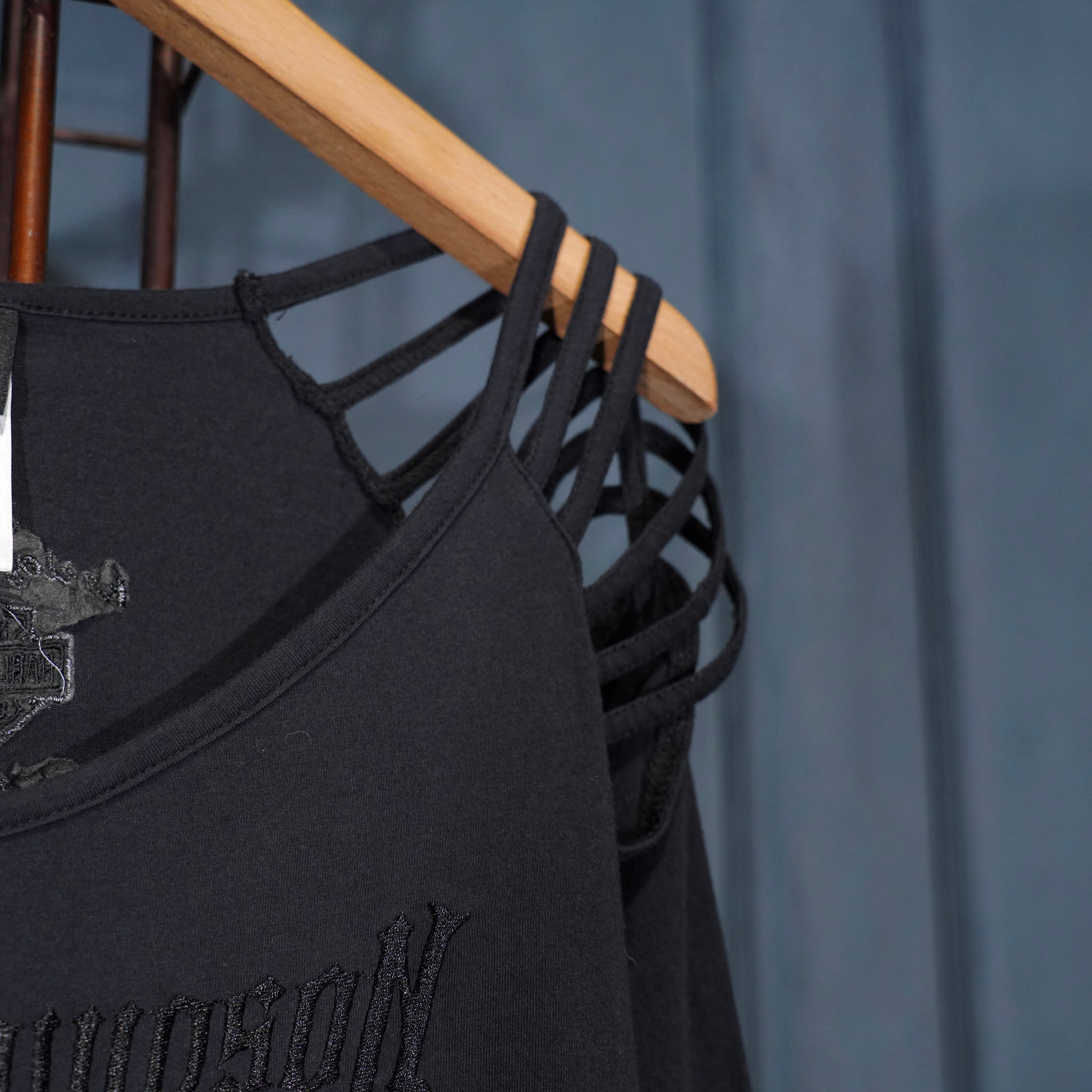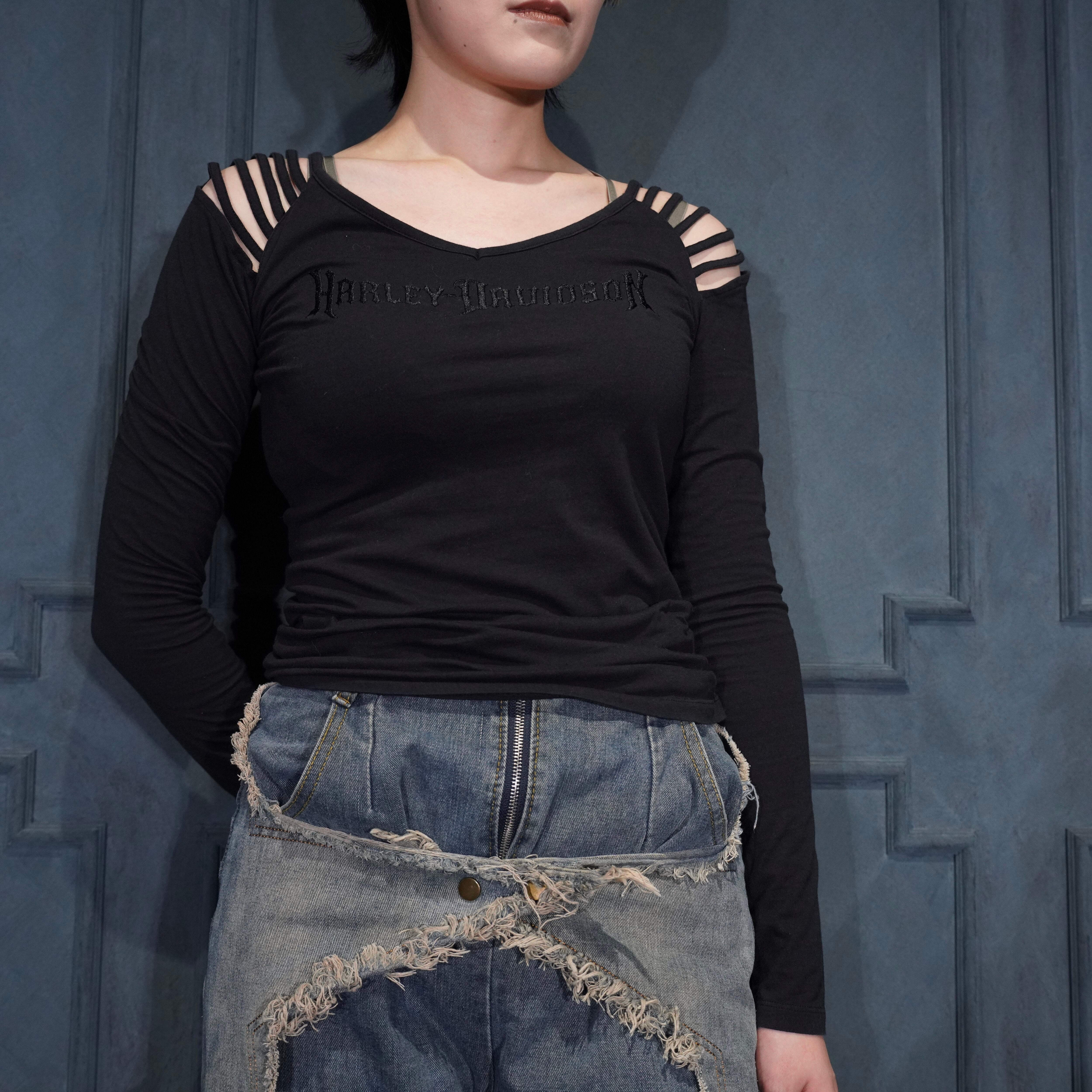 USA VINTAGE HARLEY DAVIDSON LOGO EMBROIDERY OFF SHOULDER DESIGN LONG SLEEVE CUT&SEWN/アメリカ古着ハーレーダヴィッドソンロゴ刺繍オフショルダーデザイン長袖カットソー(ロンT)