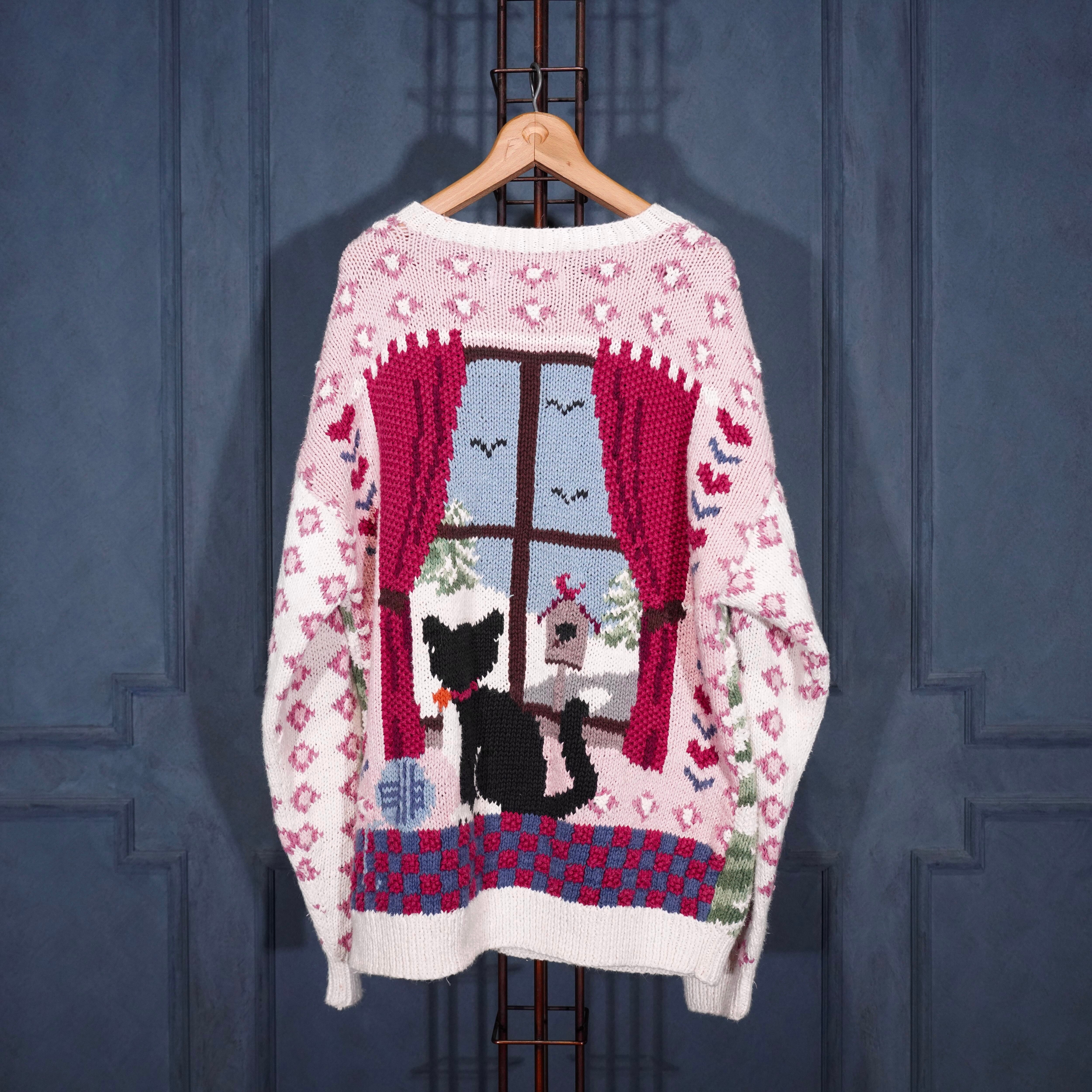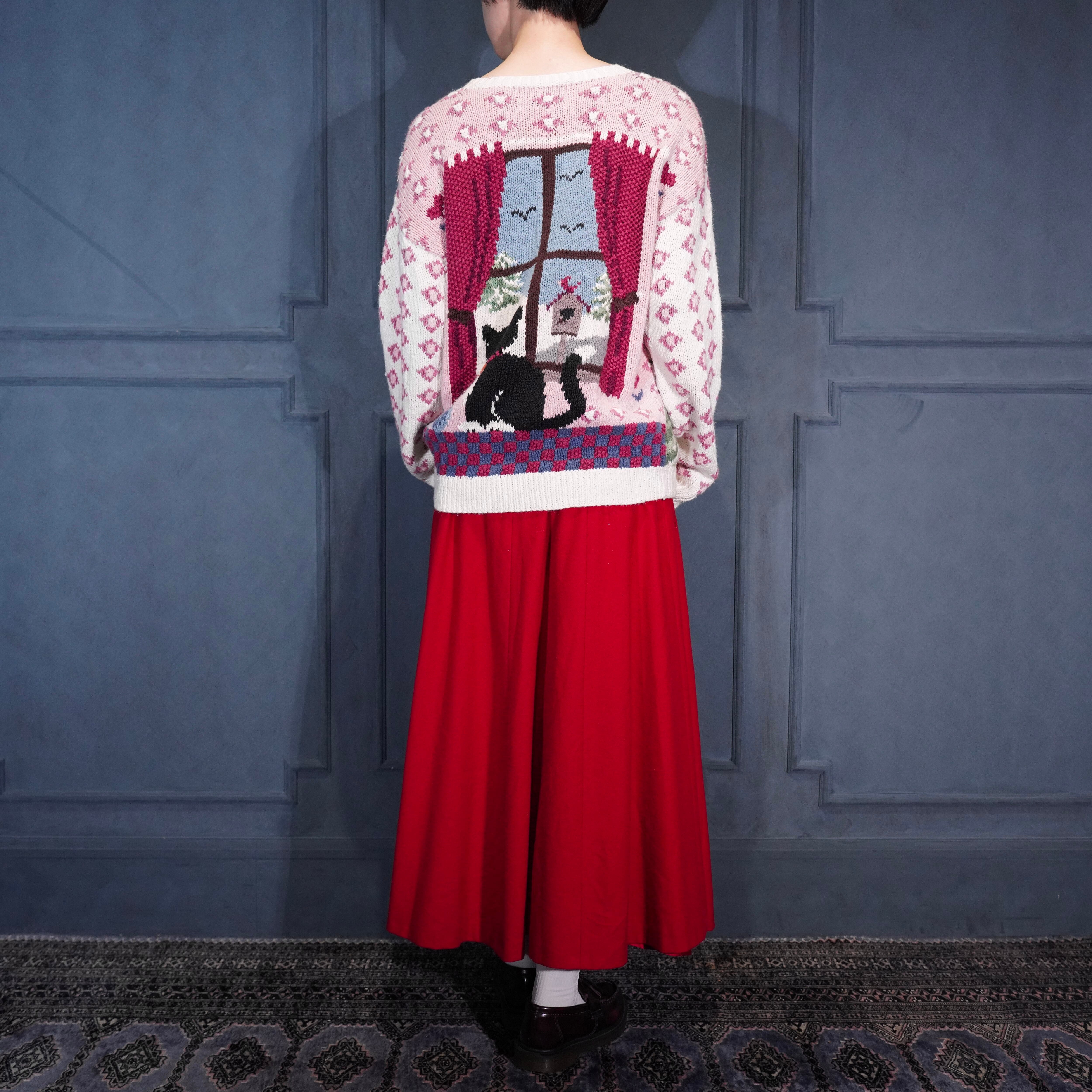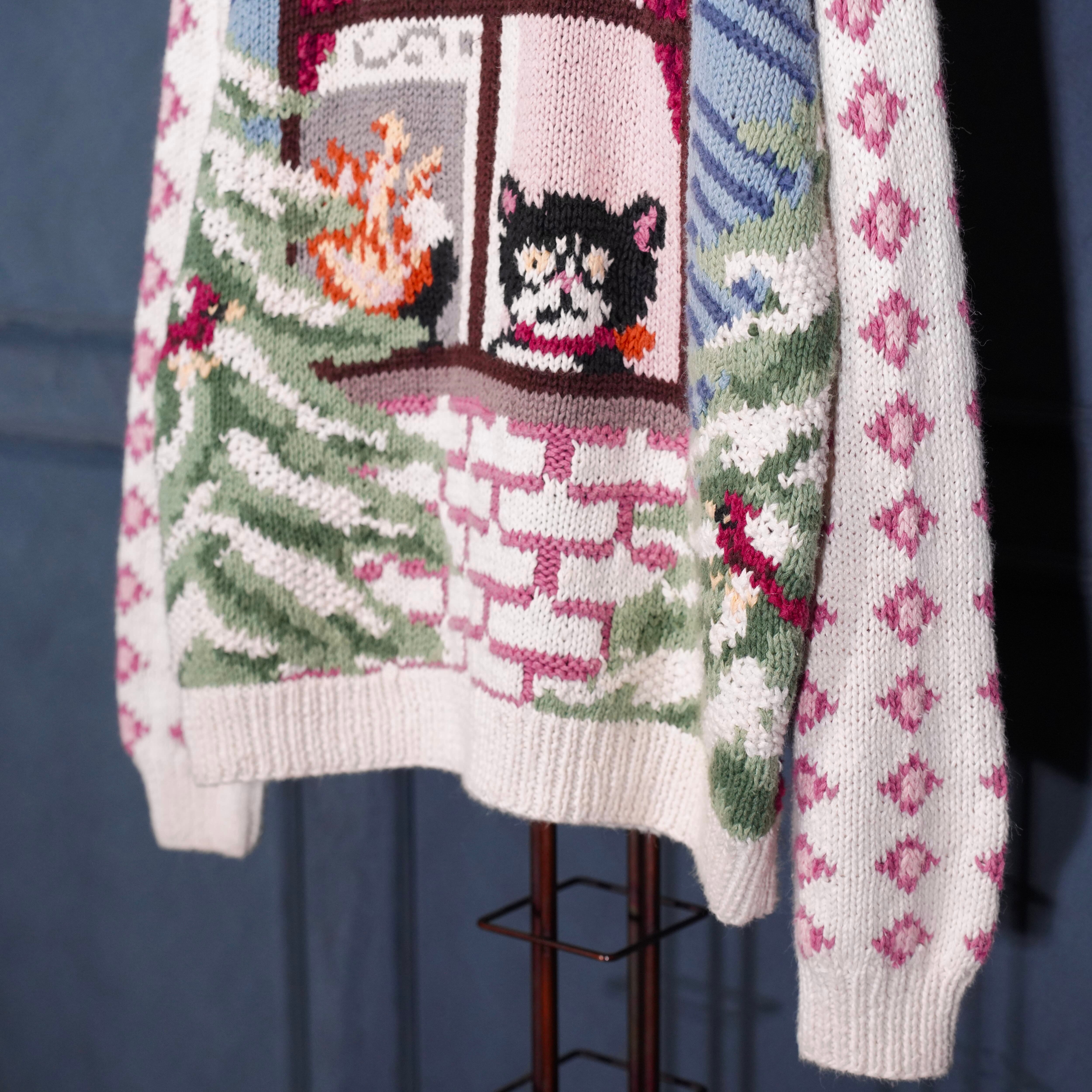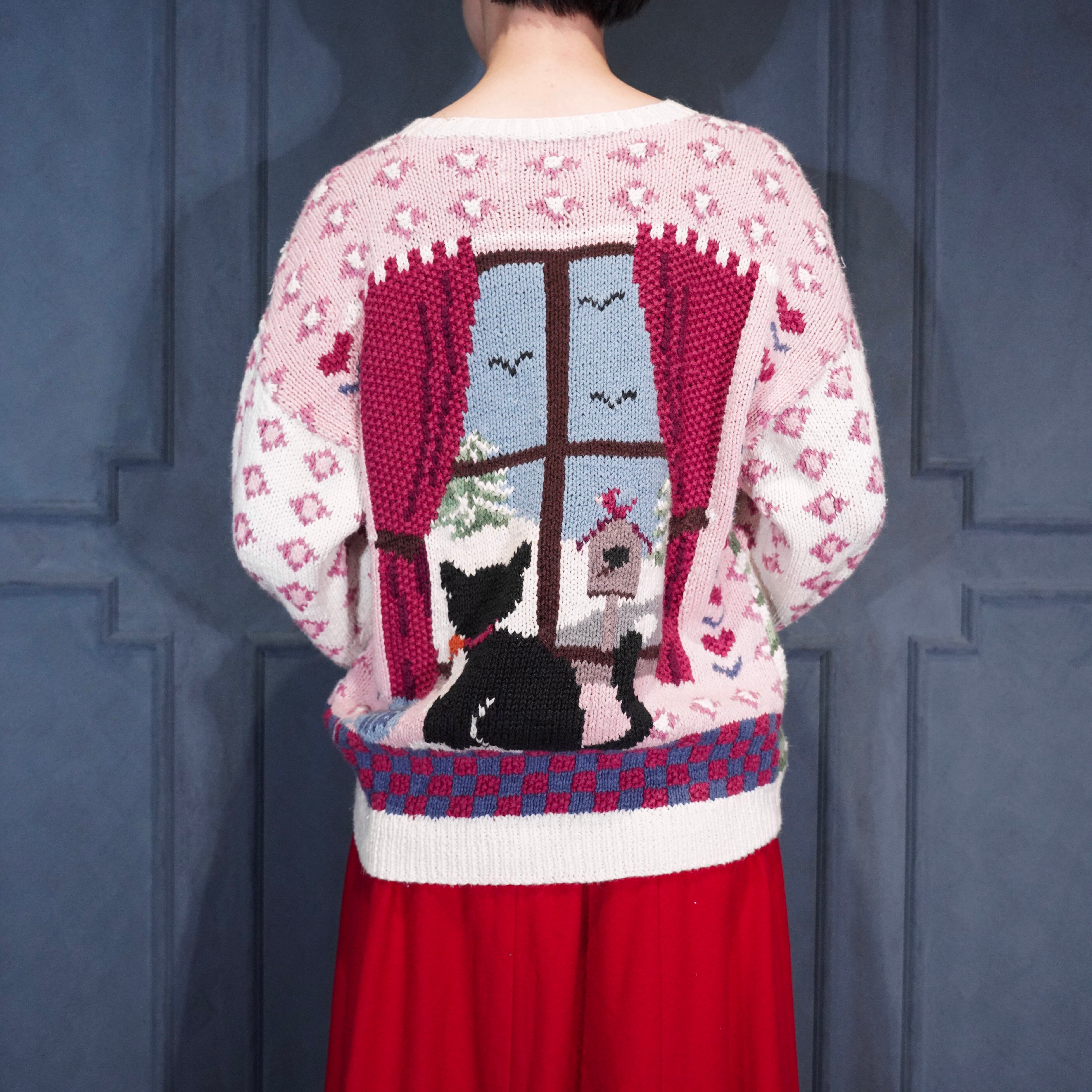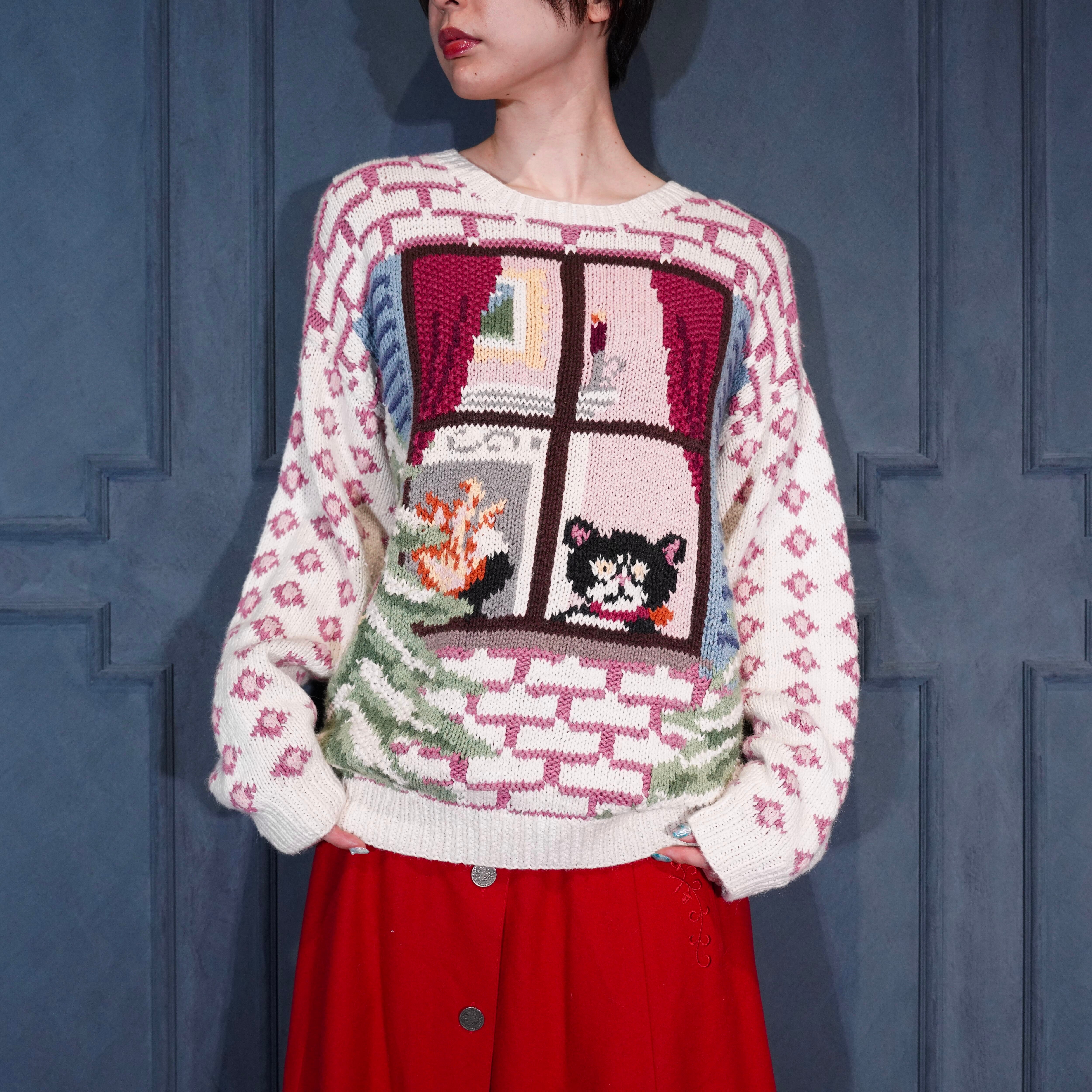 *SPECIAL ITEM* USA VINTAGE Signatures by NORTHERN ISLES knitted by hand CAT IN THE ROOM PRINT DESIGN COTTON RAMIE HAND KNIT/アメリカ古着部屋のにゃんこプリントデザインコットンラミーハンドニット