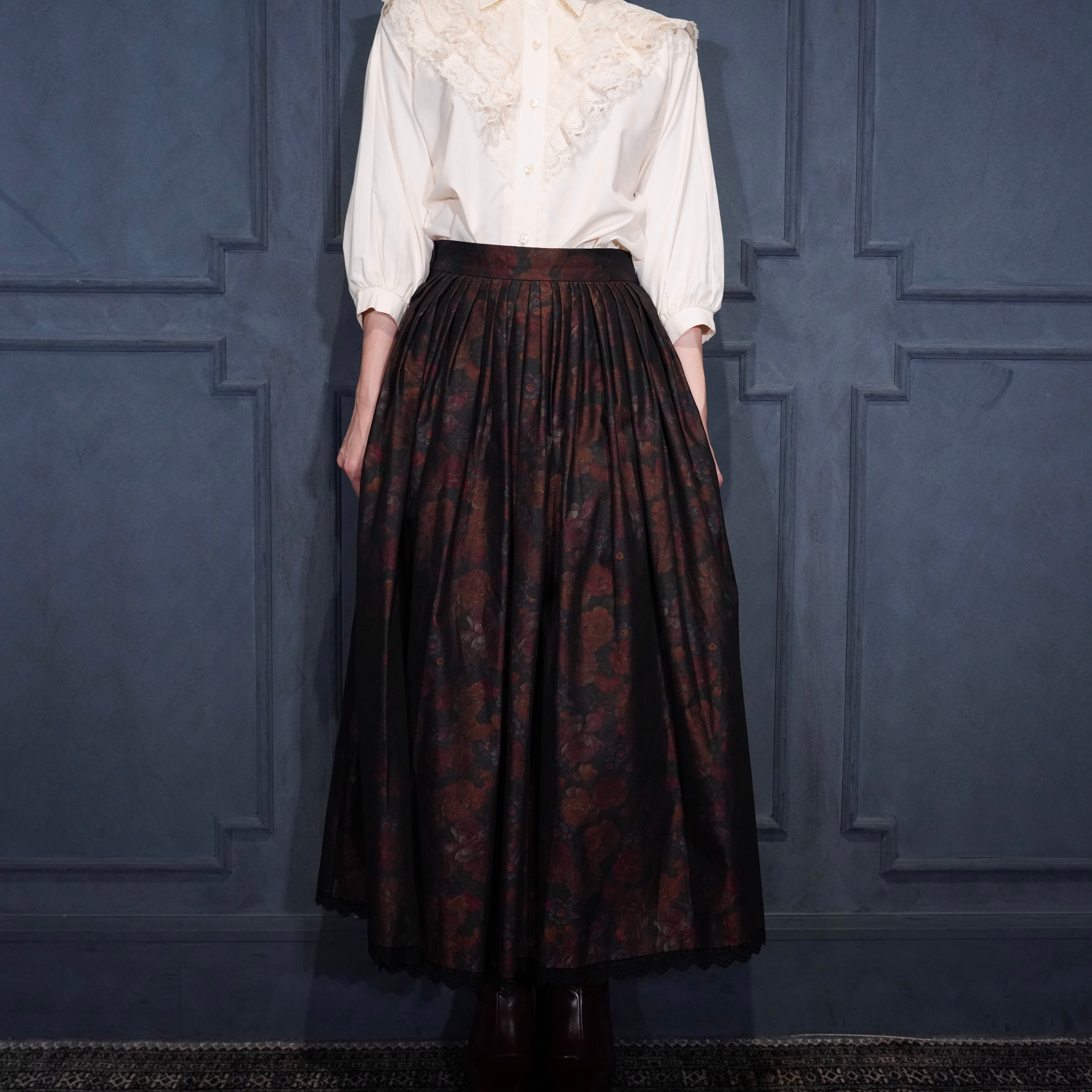 EU VINTAGE SHADOW FLOWER PATTERNED PLATES DESIGN LONG SKIRT/ヨーロッパ古着シャドウフラワー柄プリーツデザインロングスカート