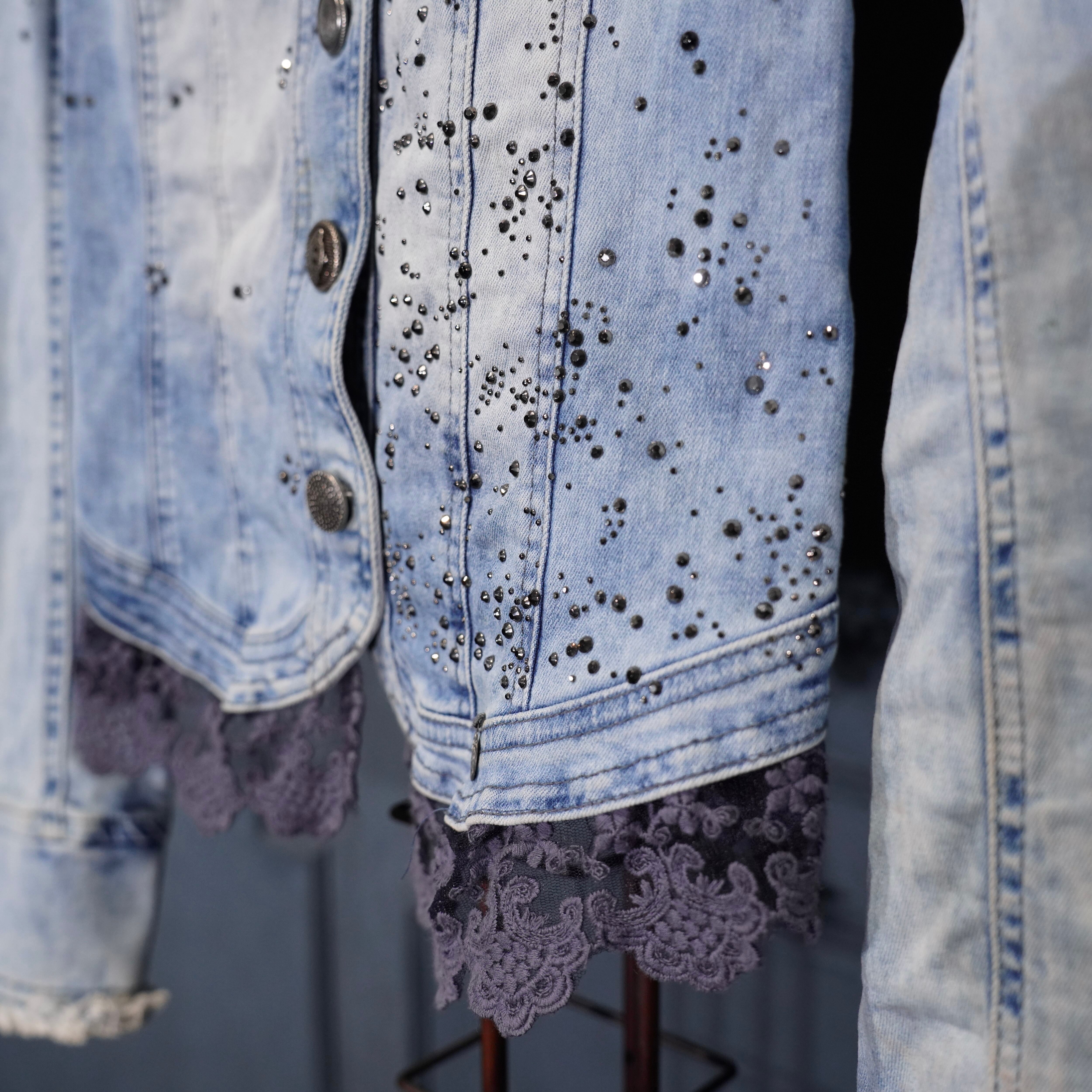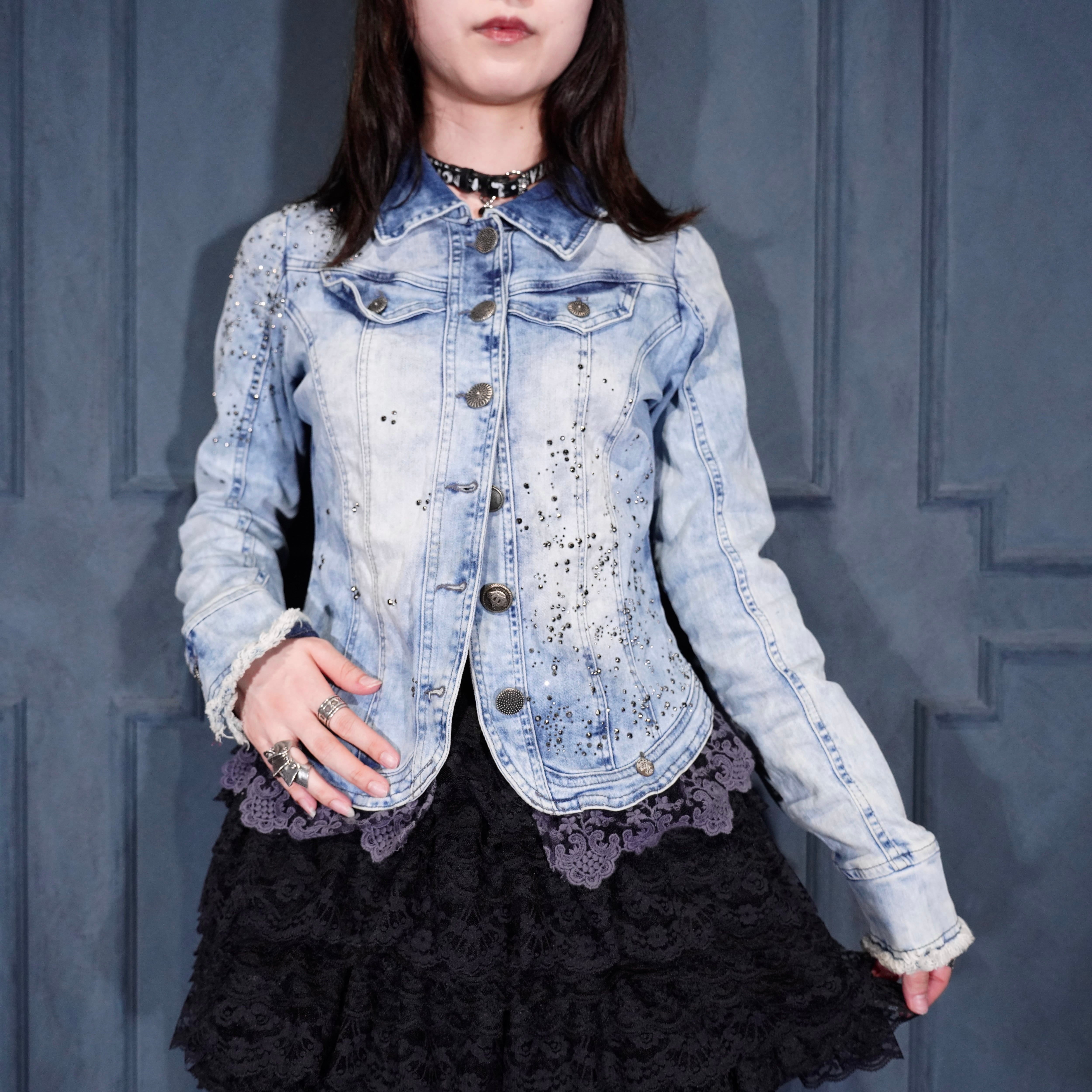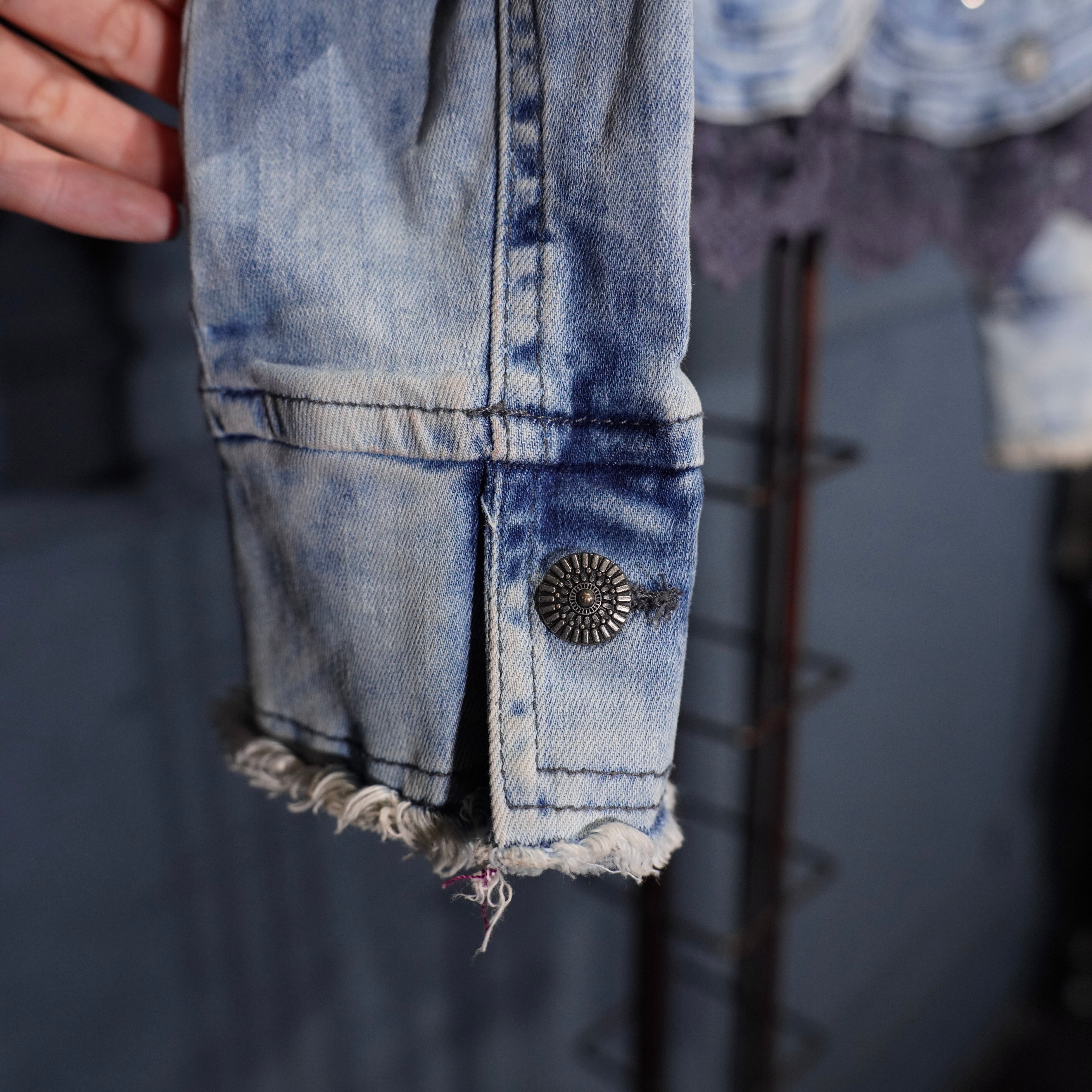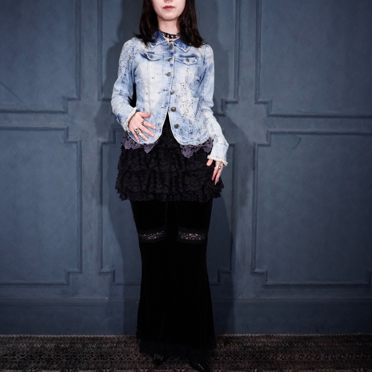 EU VINTAGE tredy LINESTONE LACE DESIGN WASHED DENIME SHIRT JACKET/ヨーロッパ古着ラインストーンレースデザインウォッシュドデニムシャツジャケット