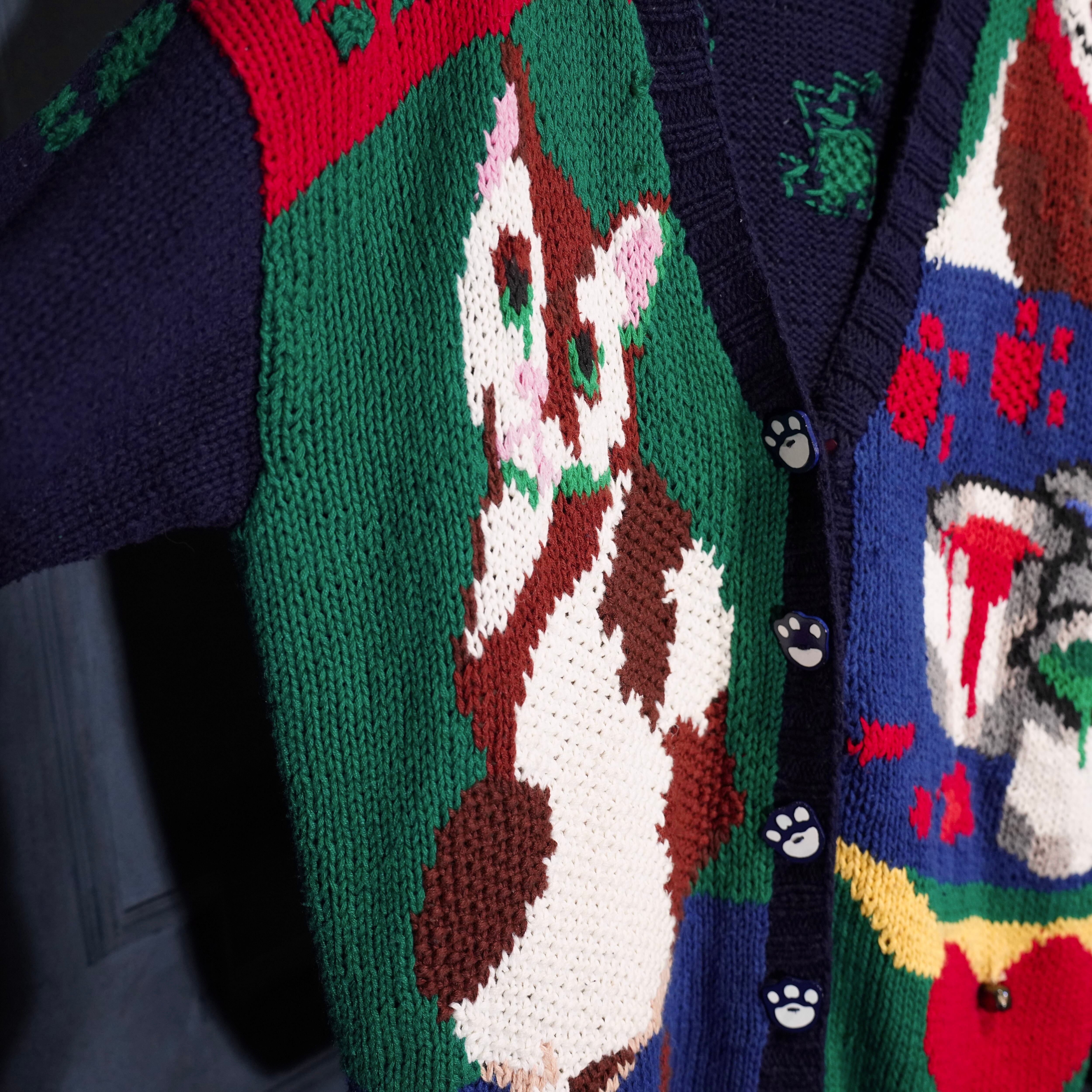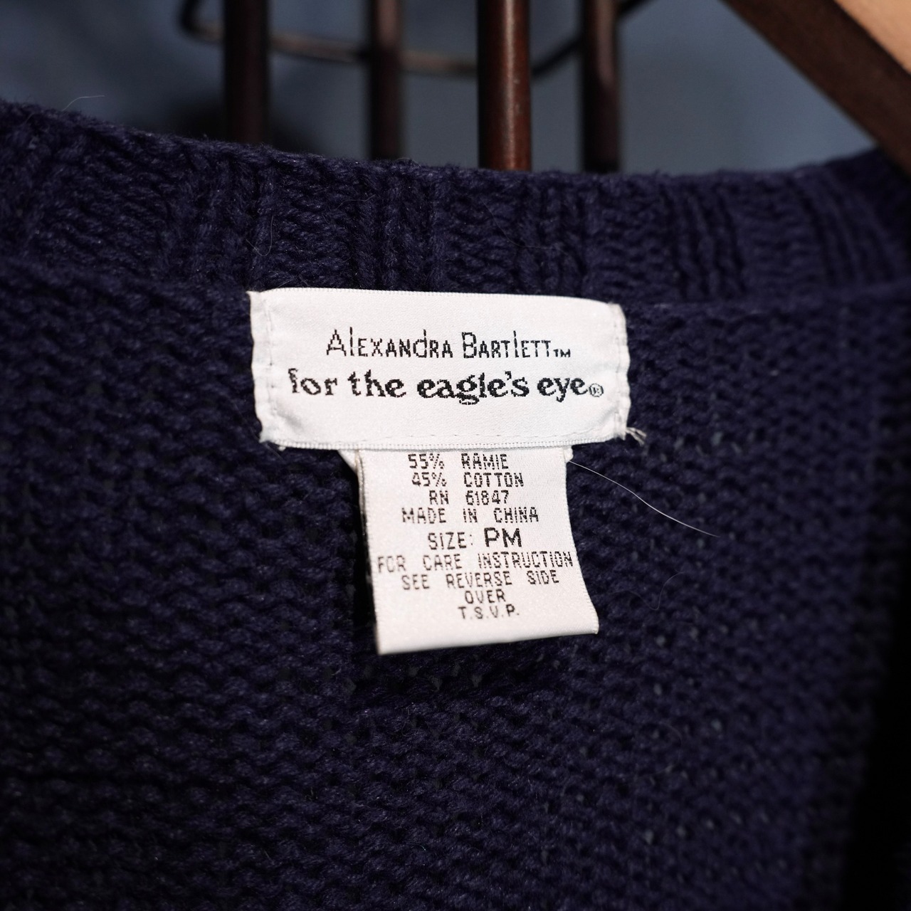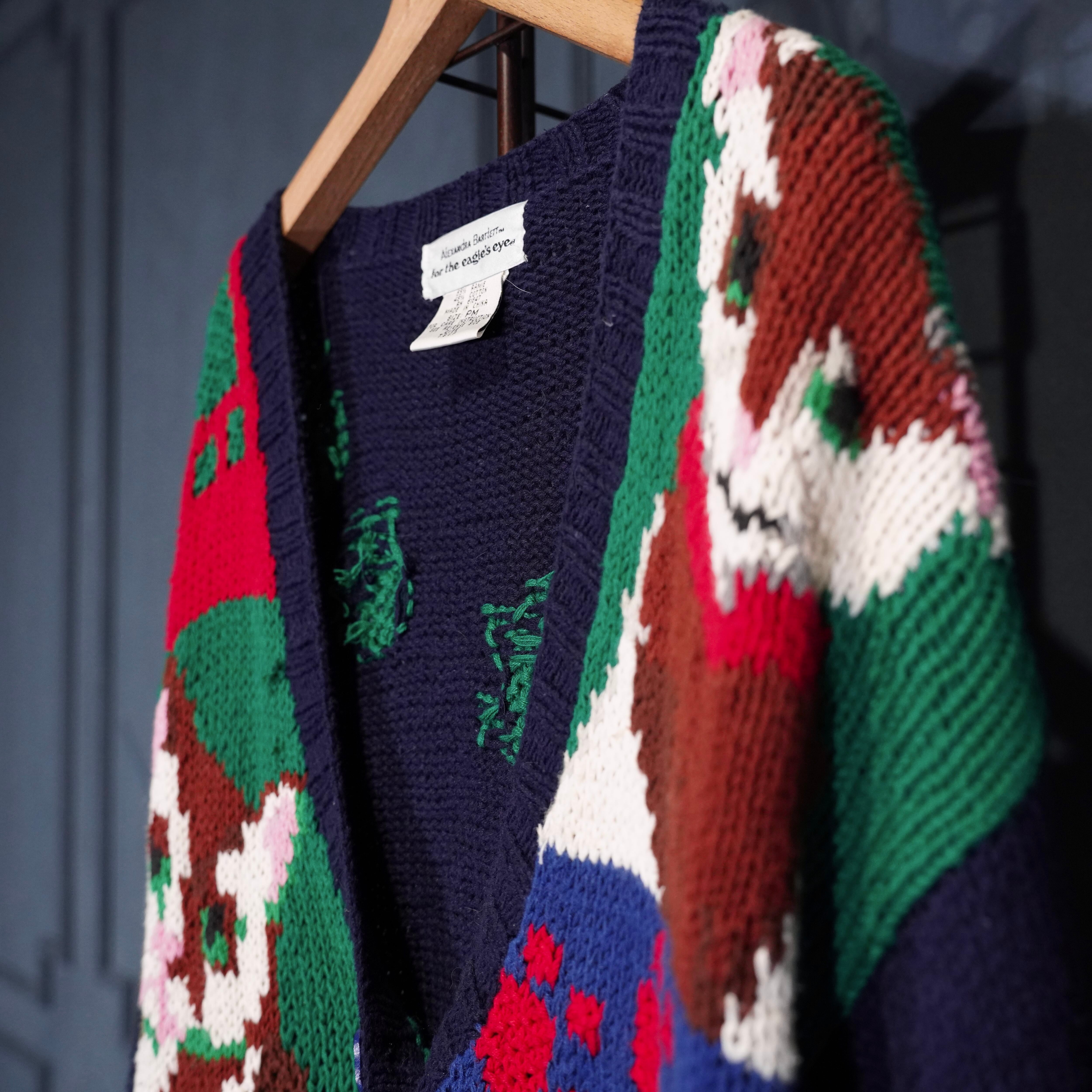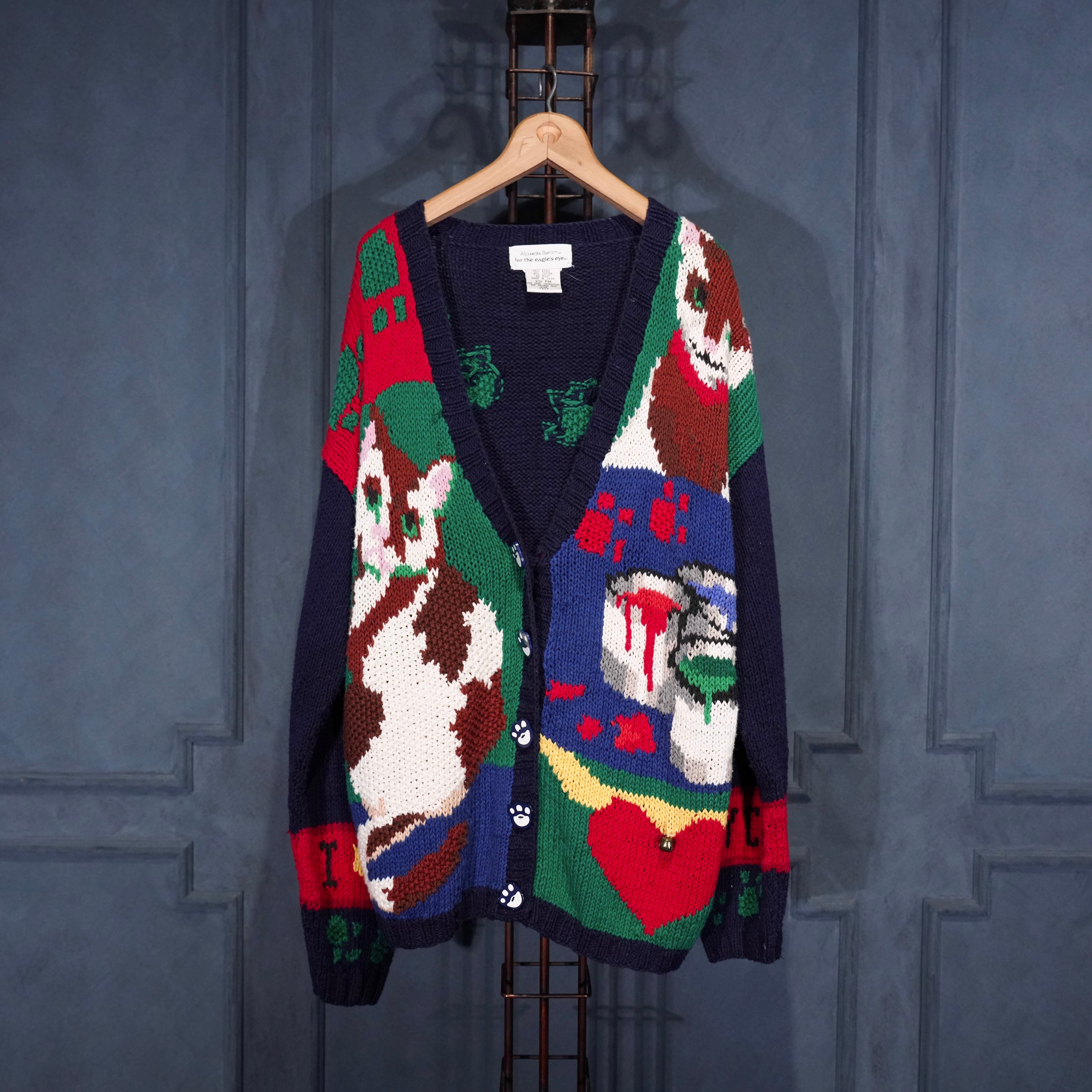 USA VINTAGE ALEXANdRA BARILETT for the eagle's eye CAT DESIGN COTTON RAMIE HAND KNIT CARDIGAN/アメリカ古着にゃんこデザインコットンラミーハンドニットカーディガン