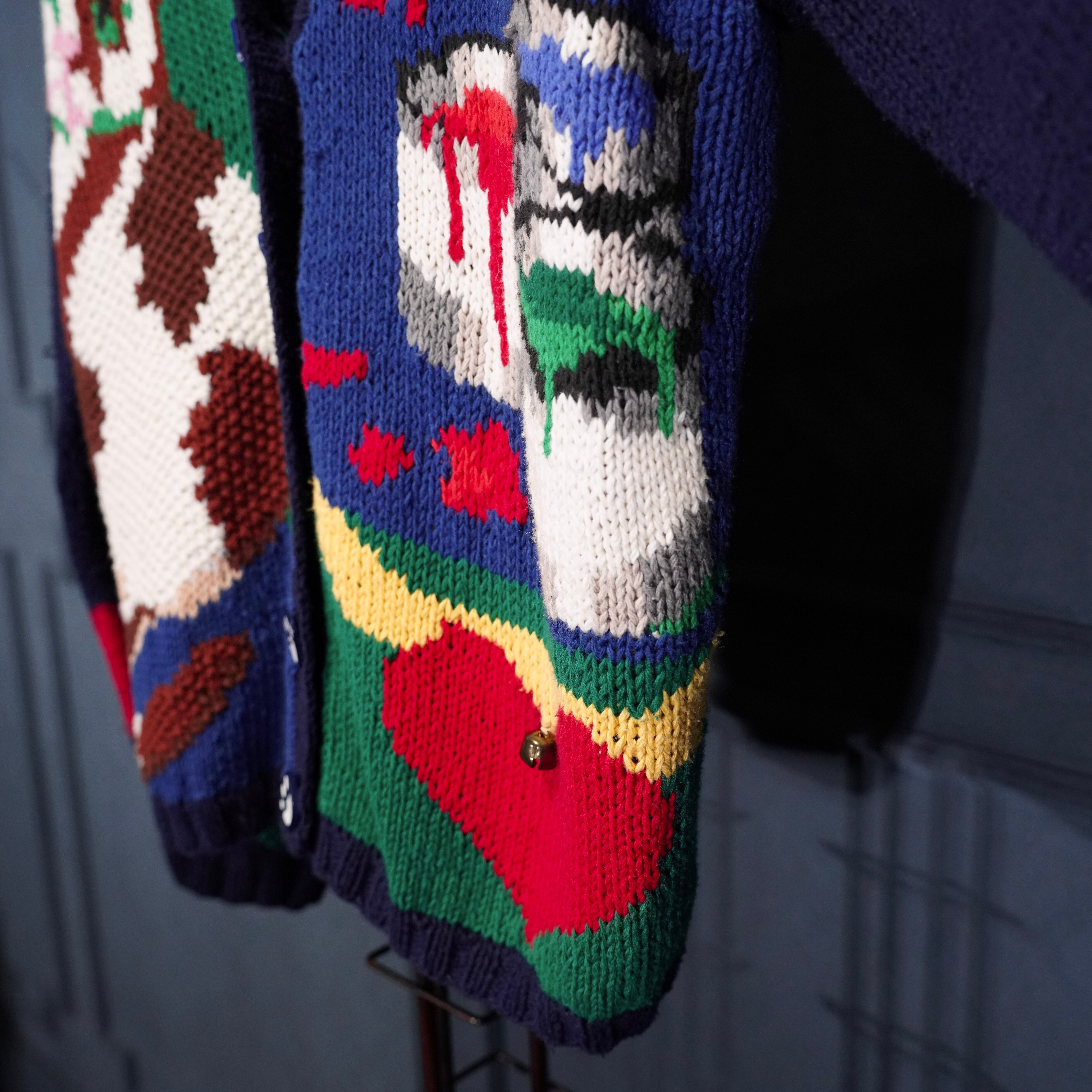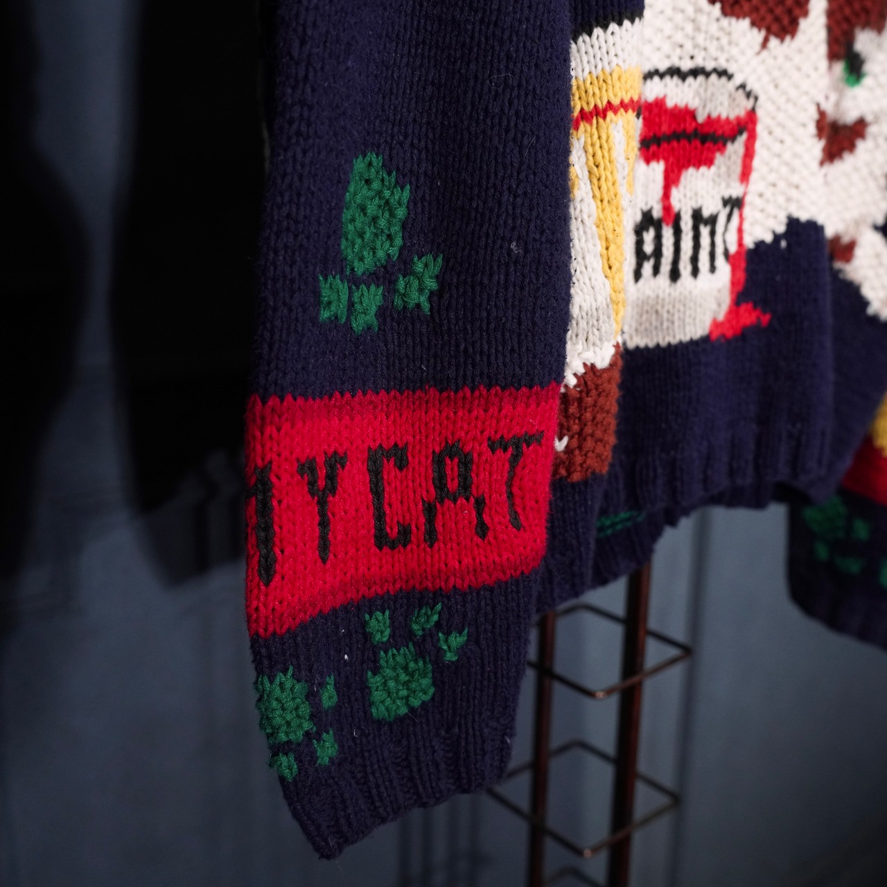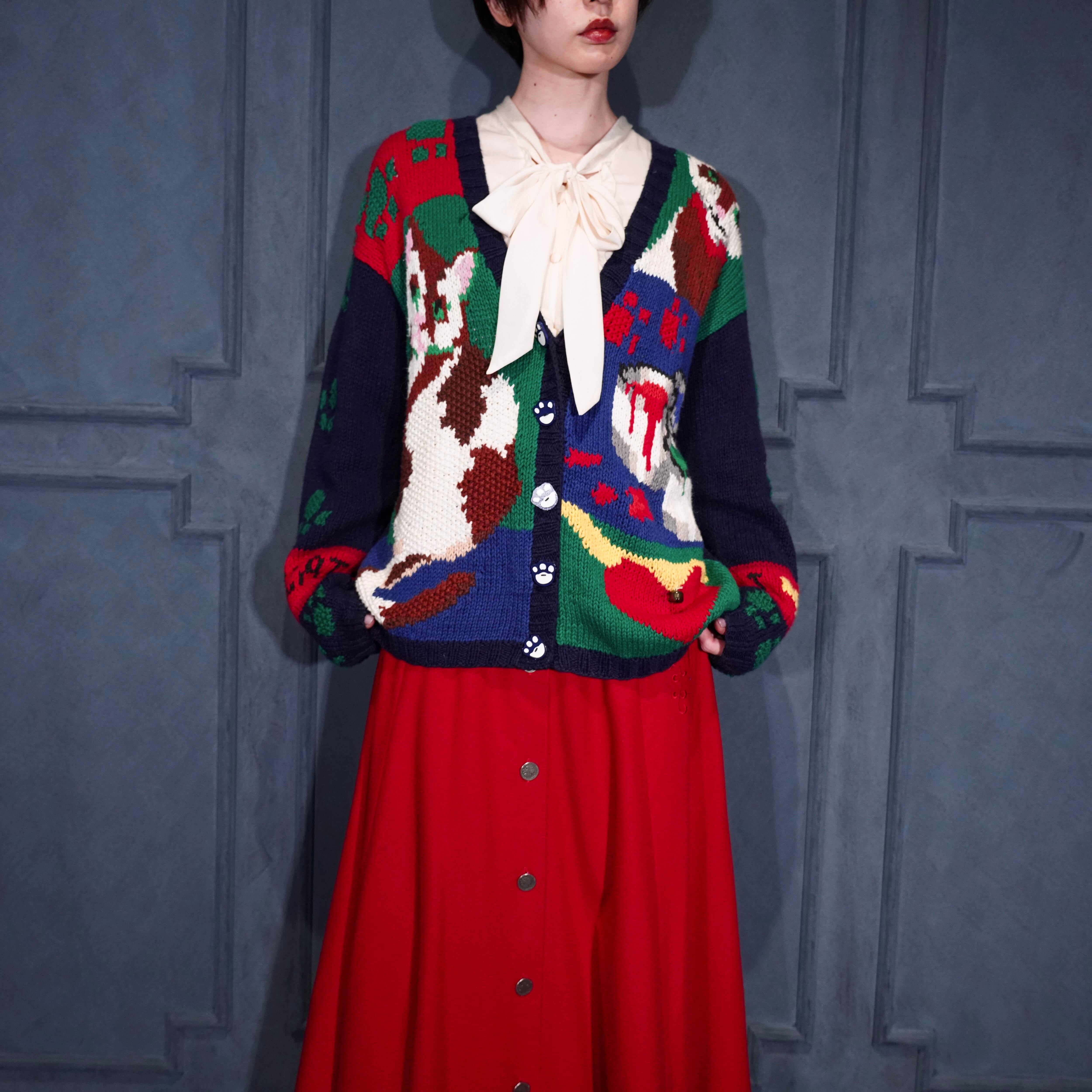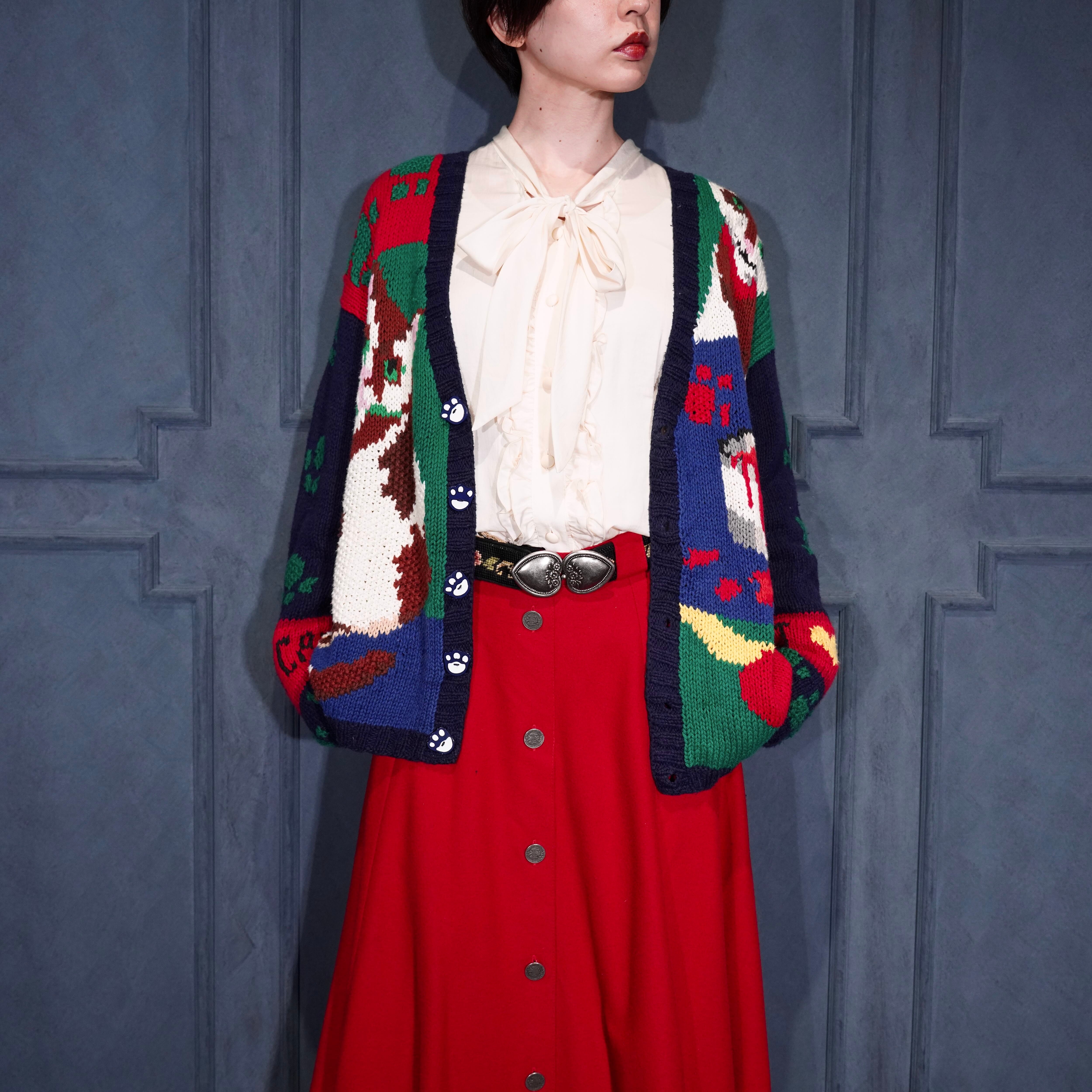 USA VINTAGE ALEXANdRA BARILETT for the eagle's eye CAT DESIGN COTTON RAMIE HAND KNIT CARDIGAN/アメリカ古着にゃんこデザインコットンラミーハンドニットカーディガン