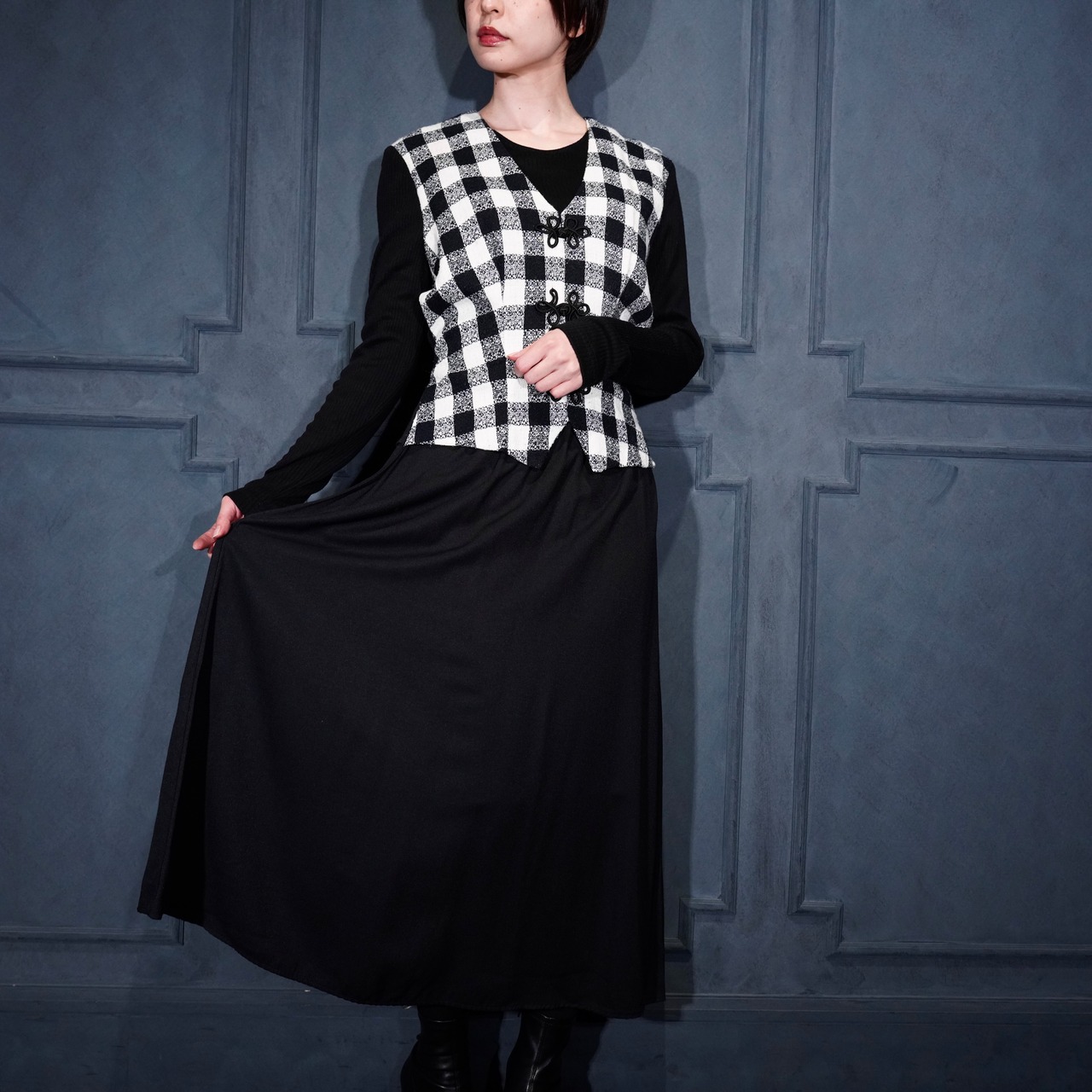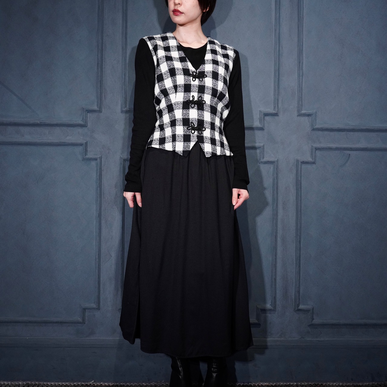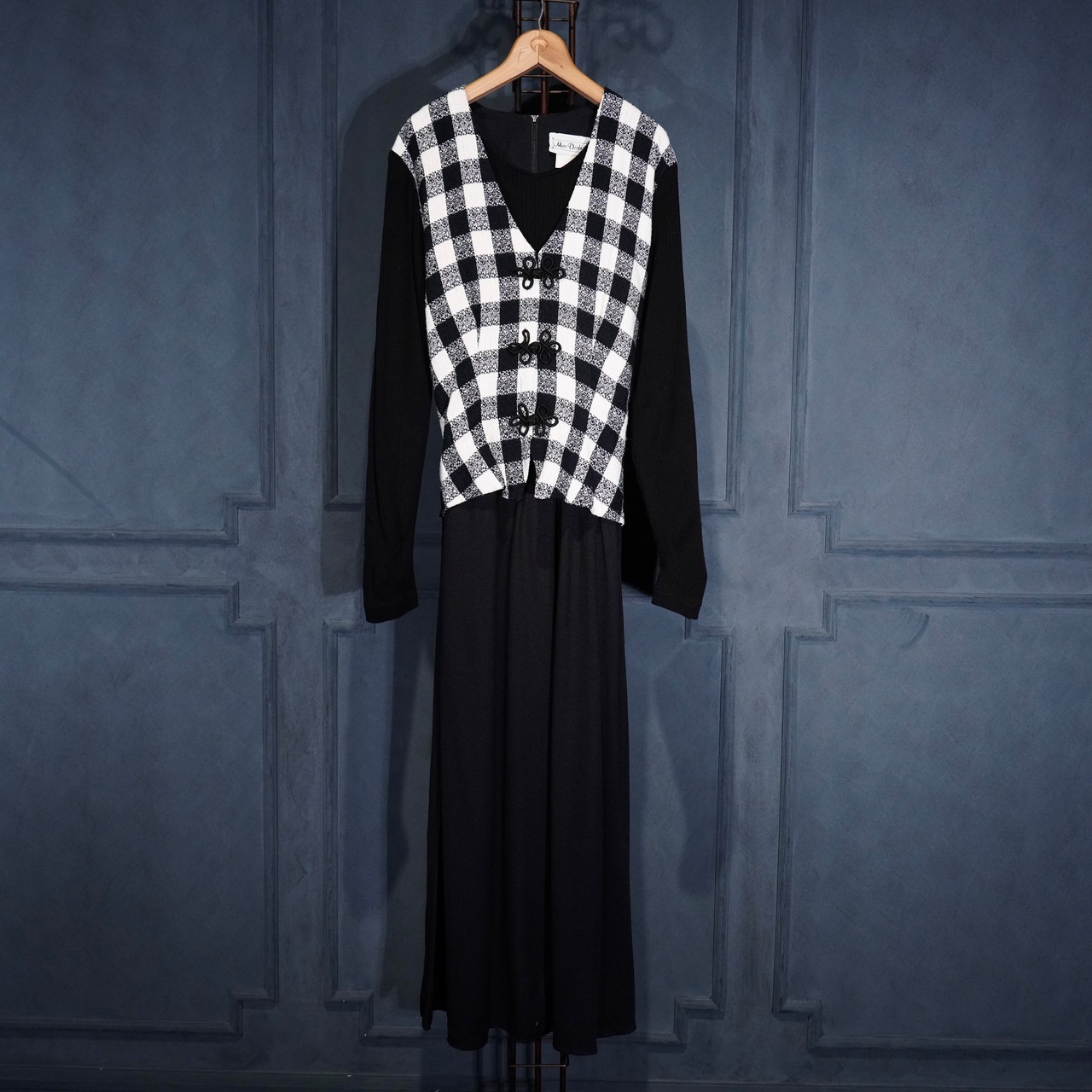 USA VINTAGE Miss Dorby CHECK PATTERNED BACK RIBBON LAYARD DESIGN CHINA BUTTON ONE PIECE/アメリカ古着チェック柄バックリボンレイヤードデザインチャイナボタンワンピース
