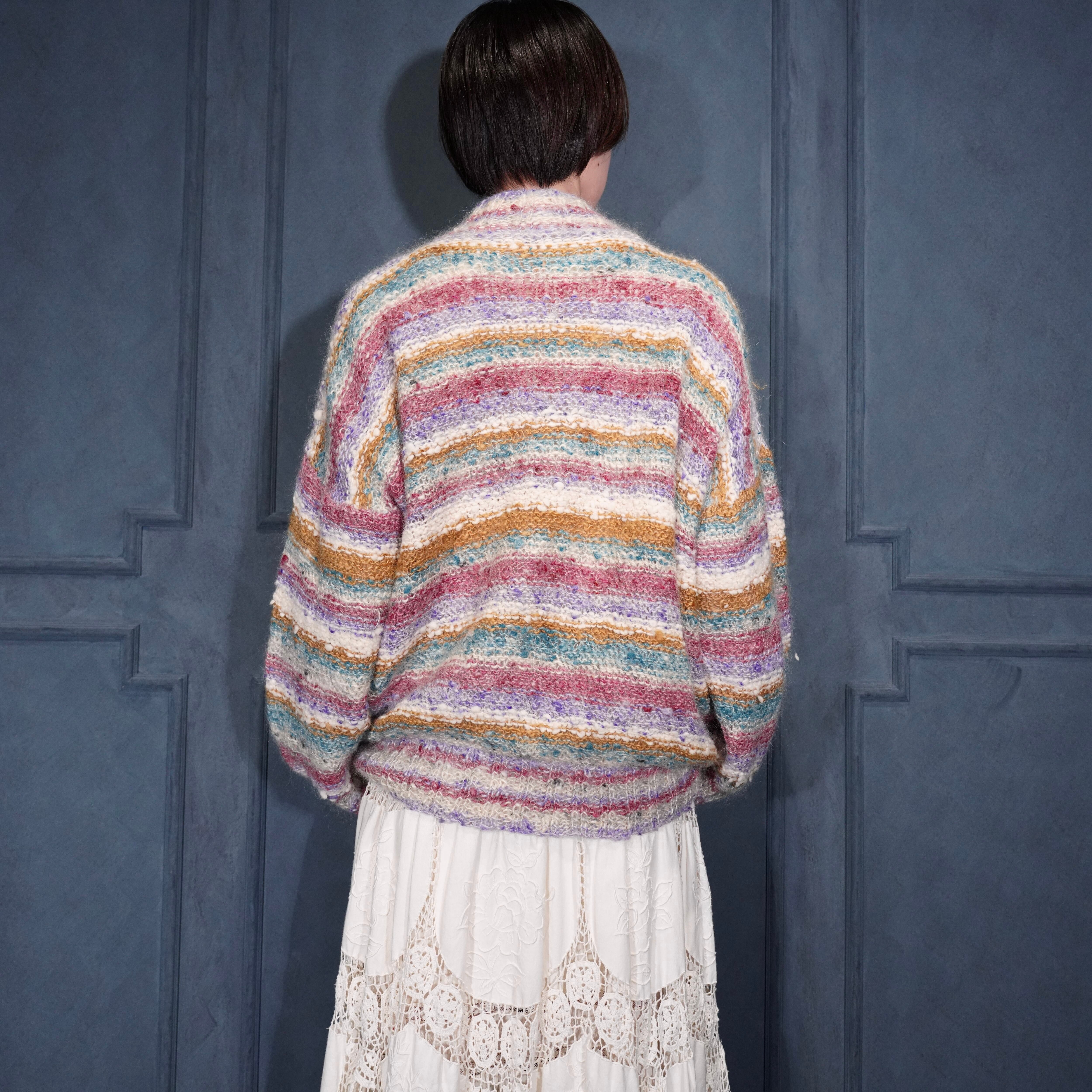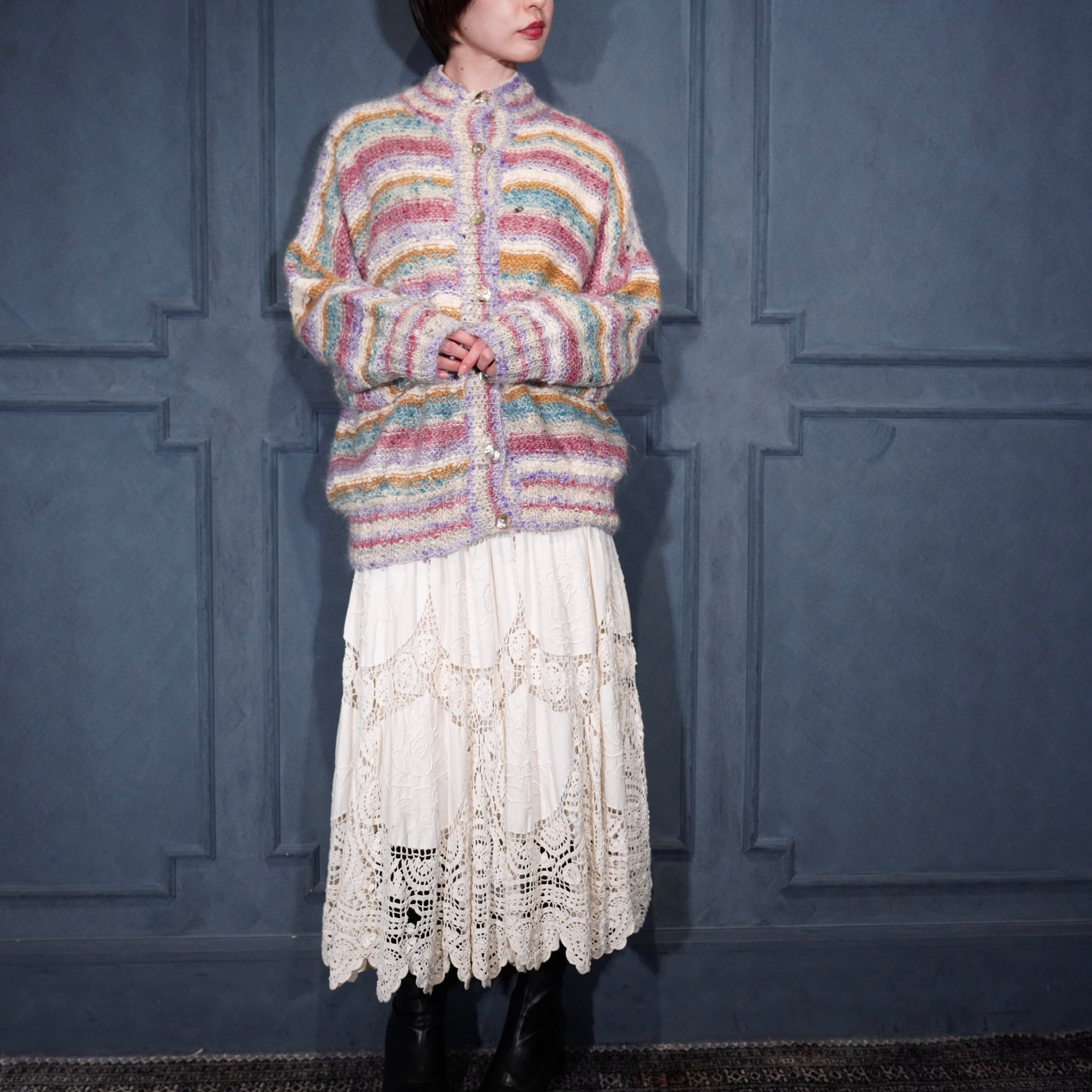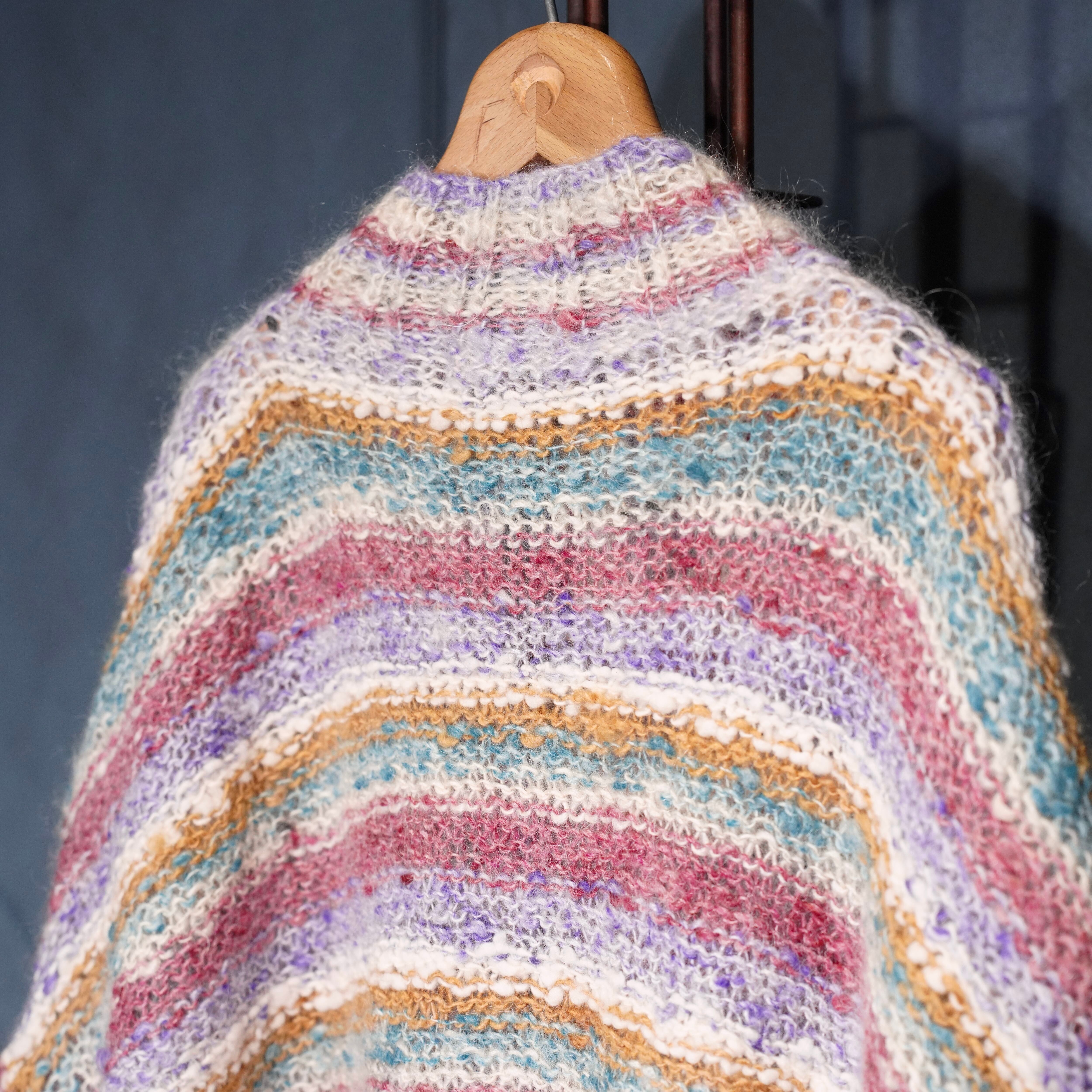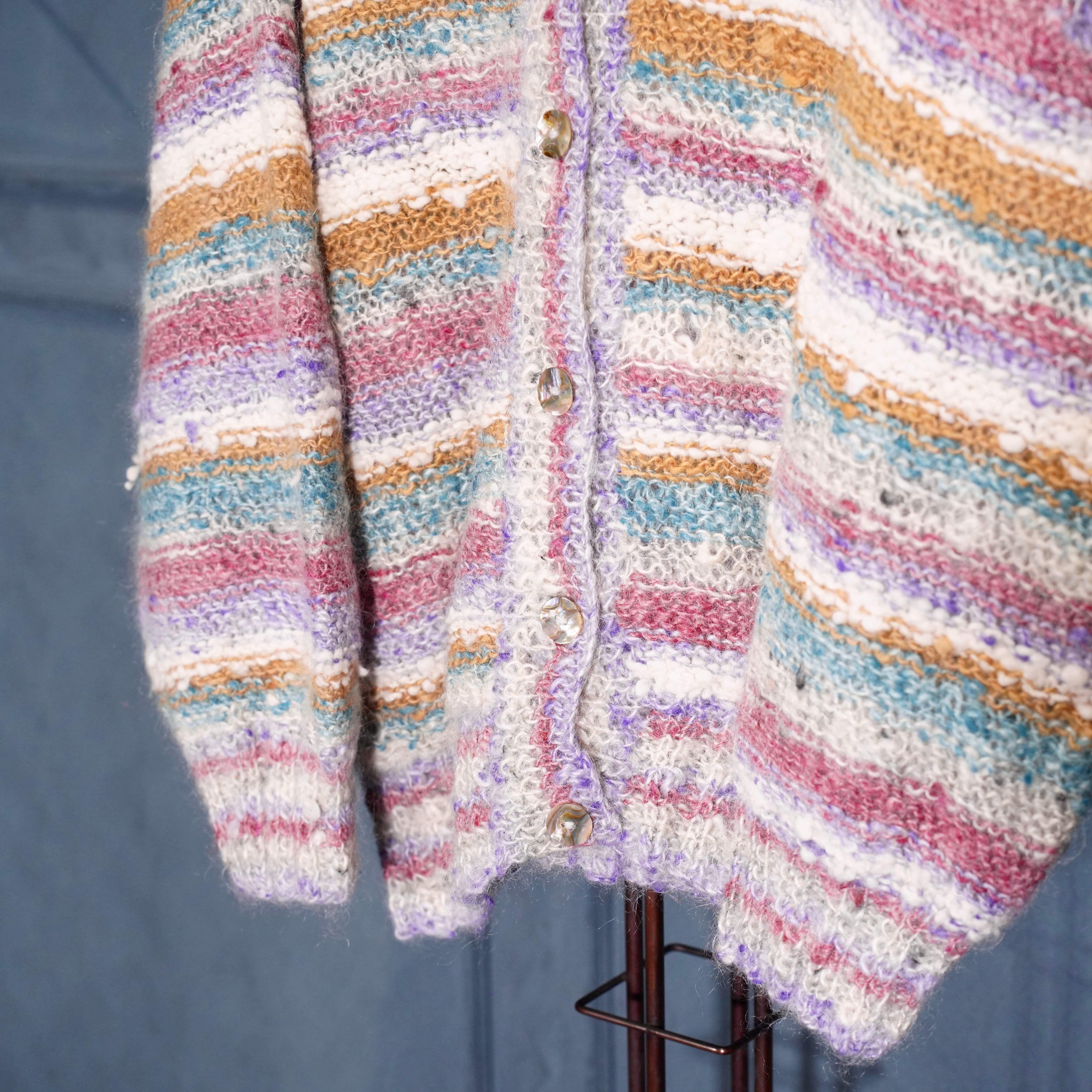 EU VINTAGE SPINADOR COLORFUL BORDER PATTERNED DESIGN MOHAIR HAND KNIT CARDIGAN/ヨーロッパ古着カラフルボーダー柄デザインモヘアハンドニットカーディガン