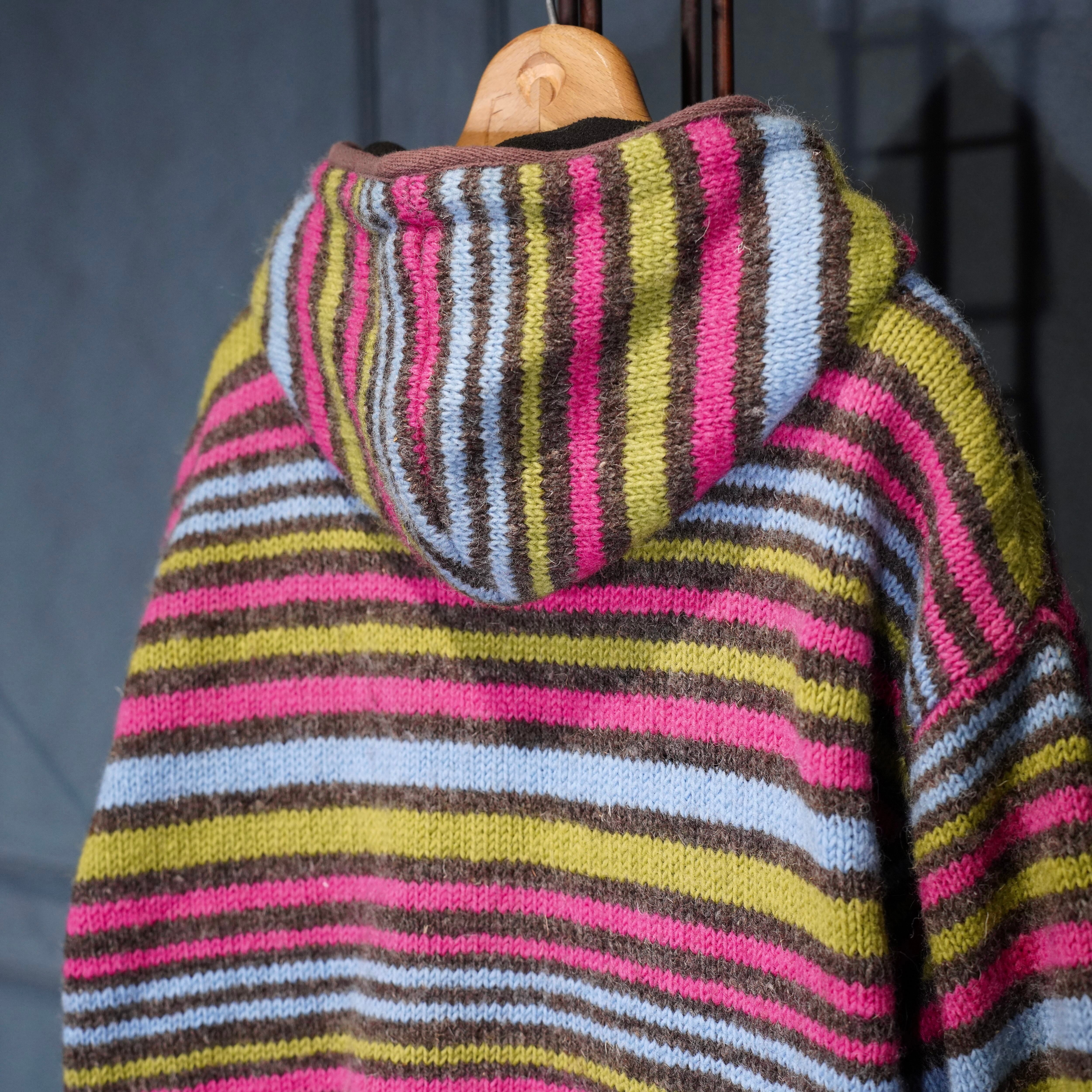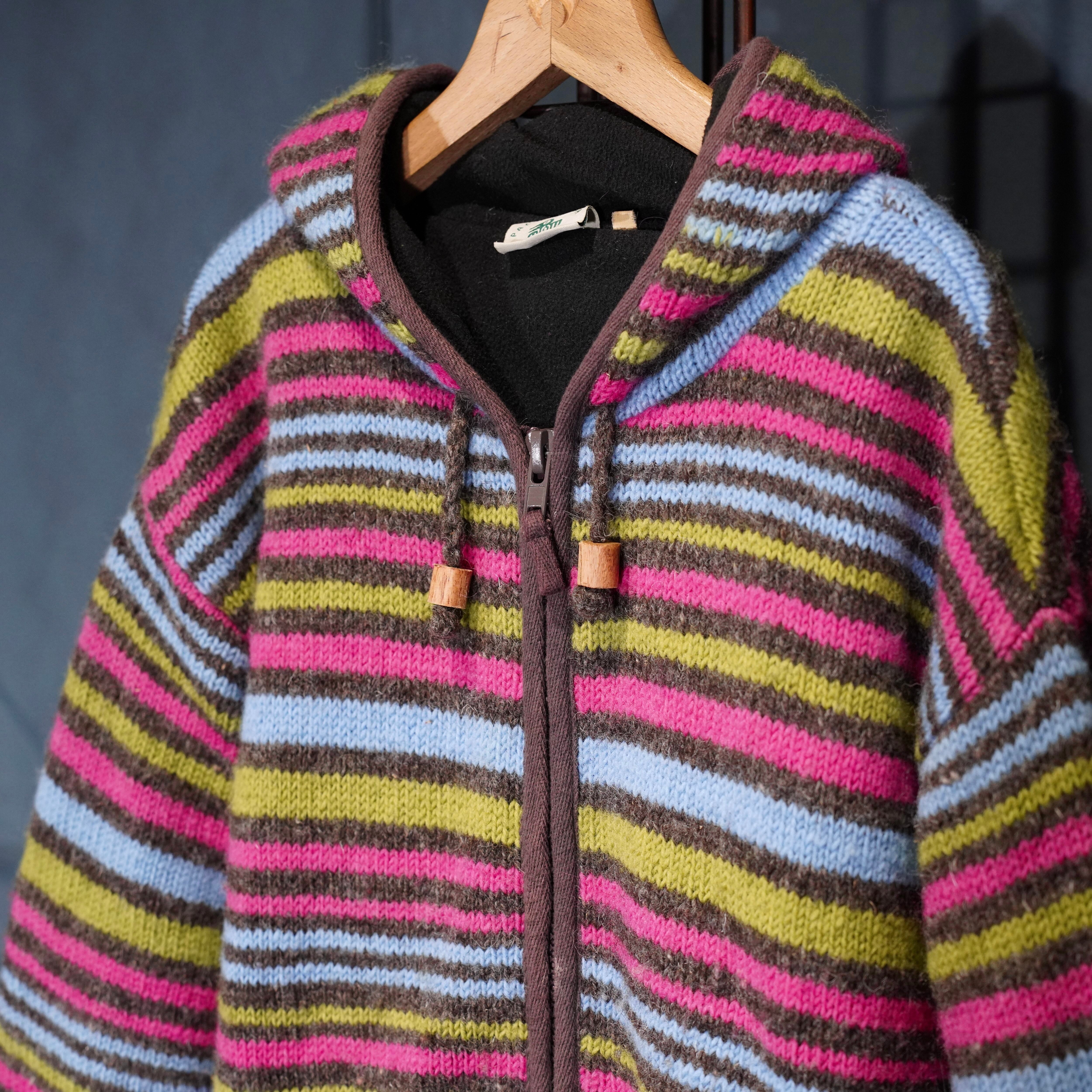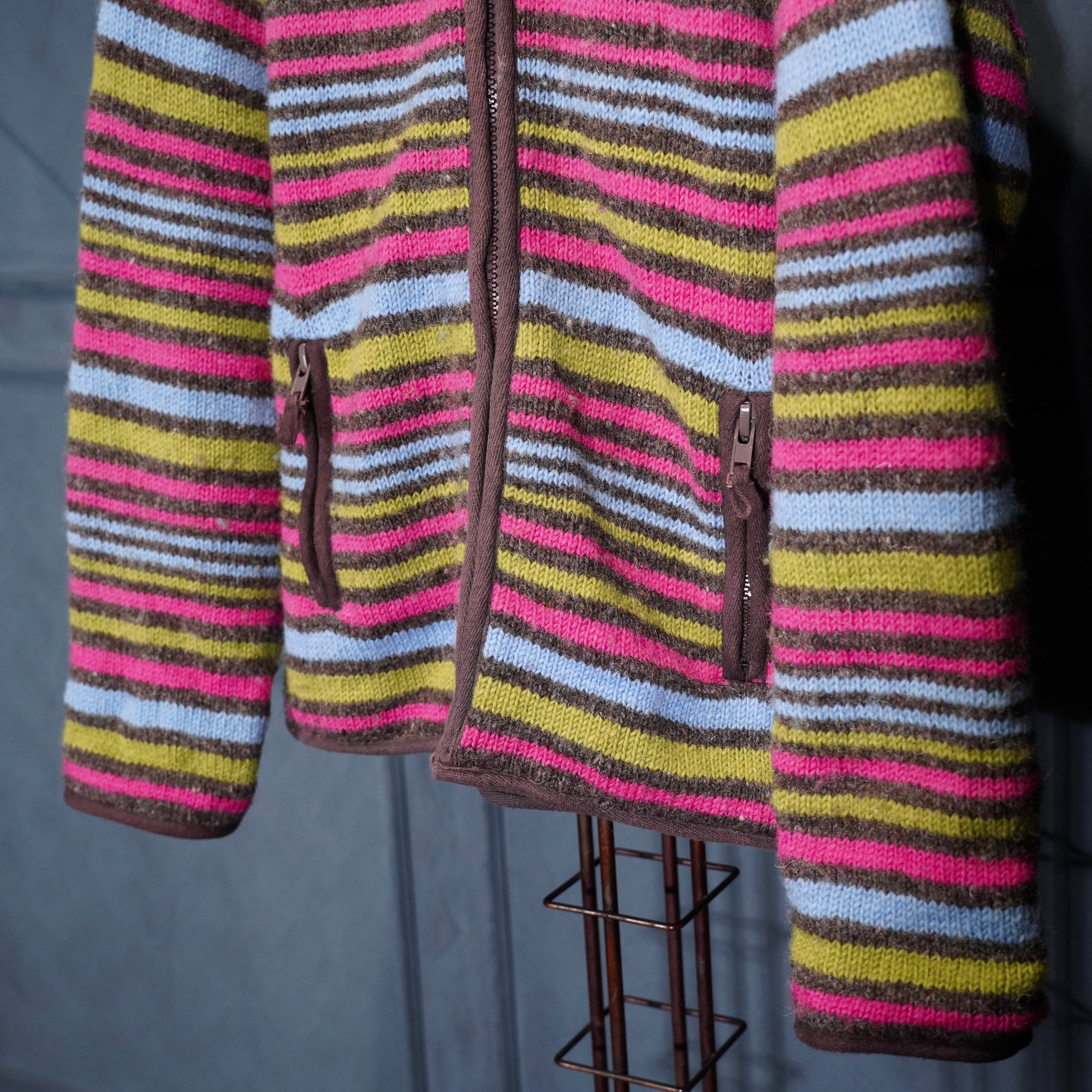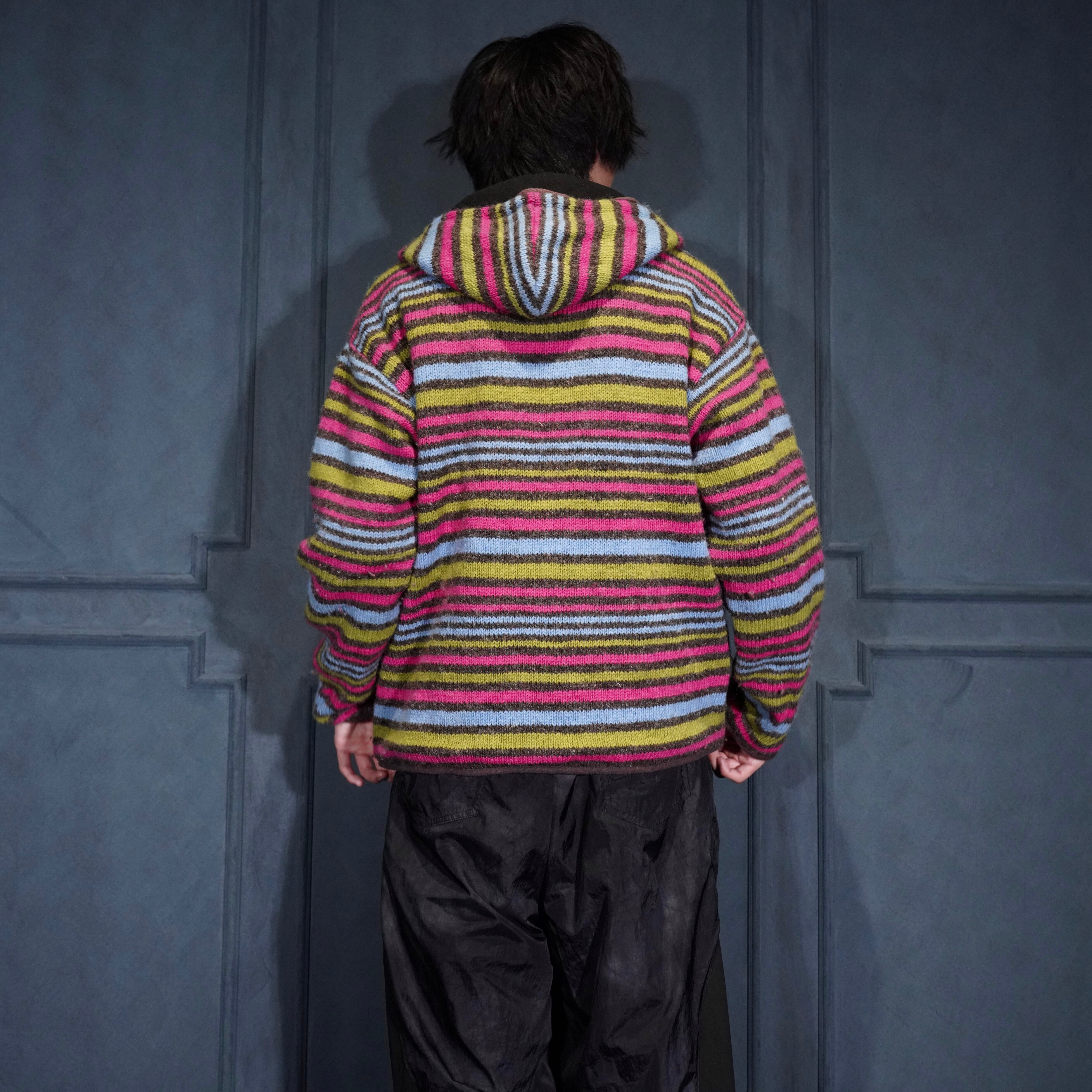 USA VINTAGE PACHAMAMA MULTI BORDER DESIGN HAND WOOL KNIT ZIP UP HOODIE BLOUSON/アメリカ古着マルチボーダーデザインハンドウールニットジップアップフーディブルゾン