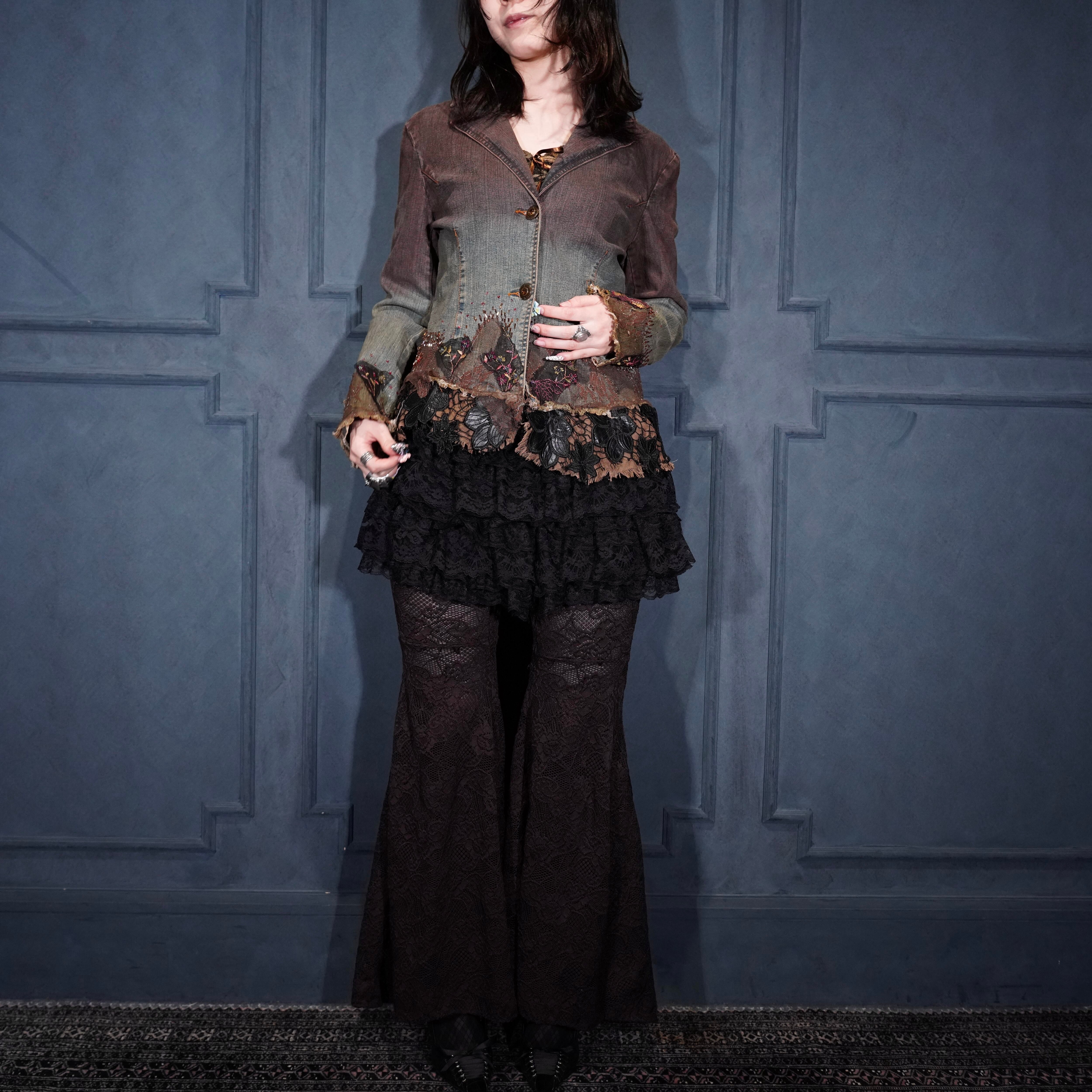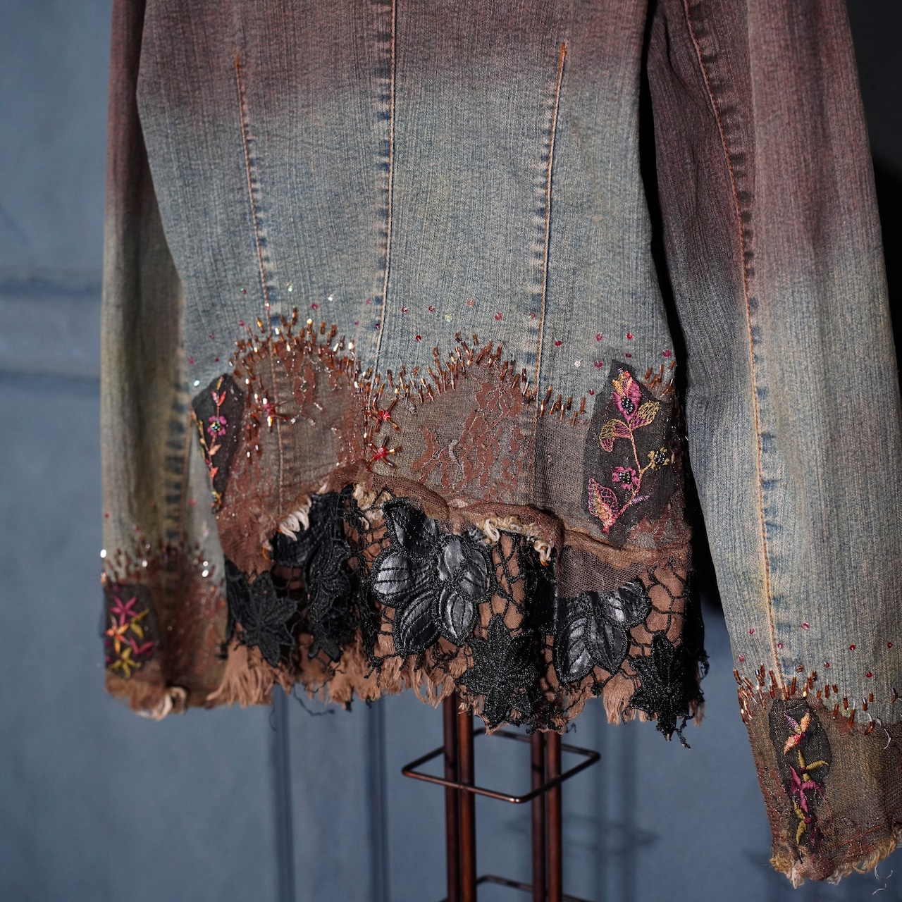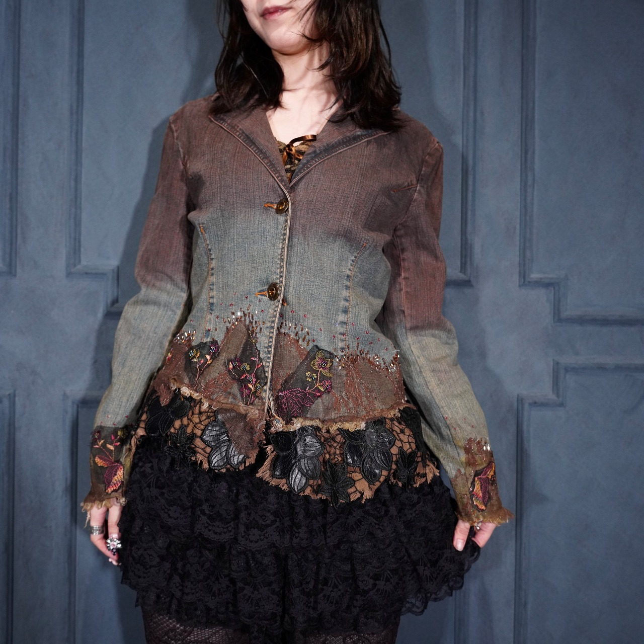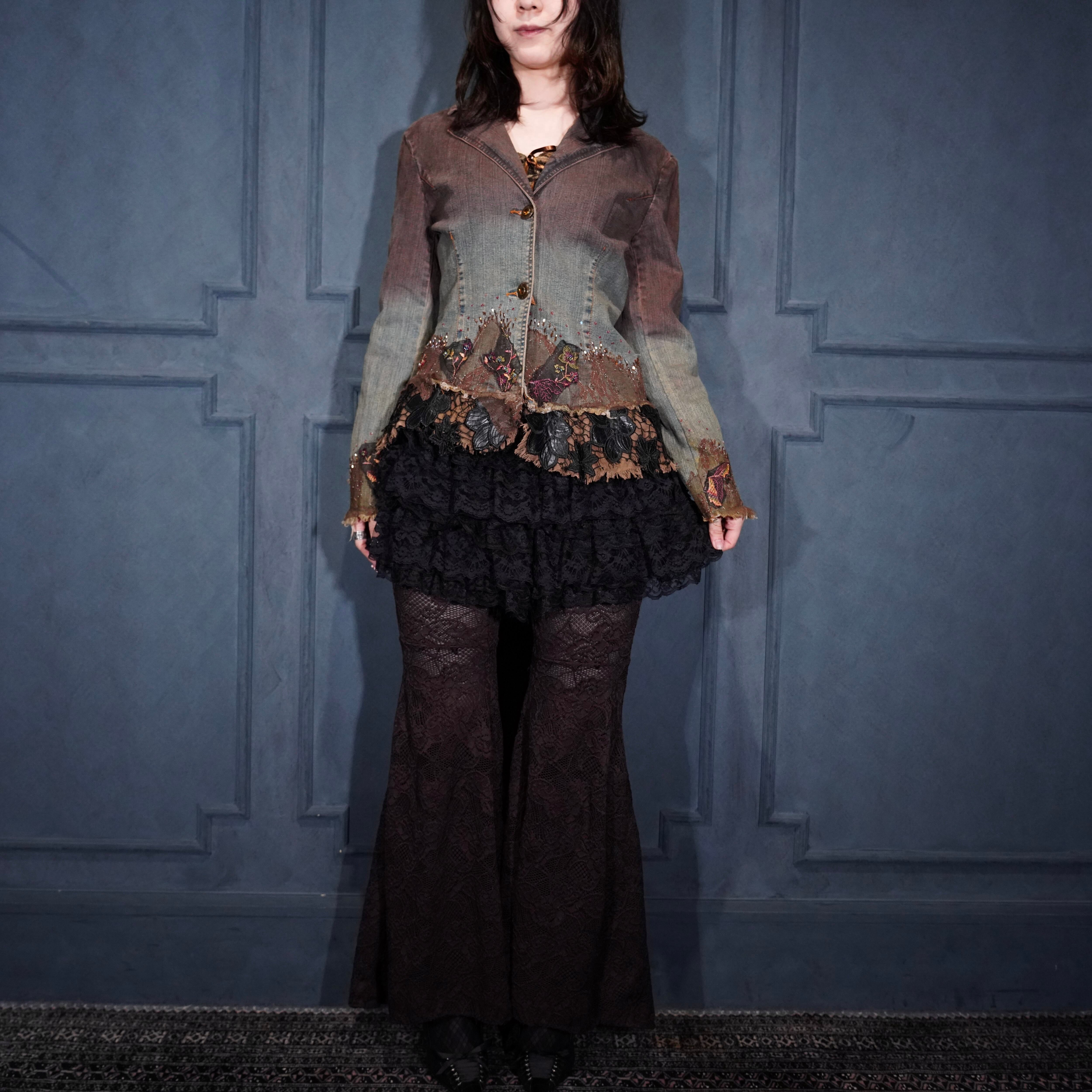 EU VINTAGE LUCKY FASHION LEATHER FLOWER LACE GRADATION DESIGN DENIM TAILORED JACKET/ヨーロッパ古着レザーお花レースグラデーションデザインデニムテーラードジャケット