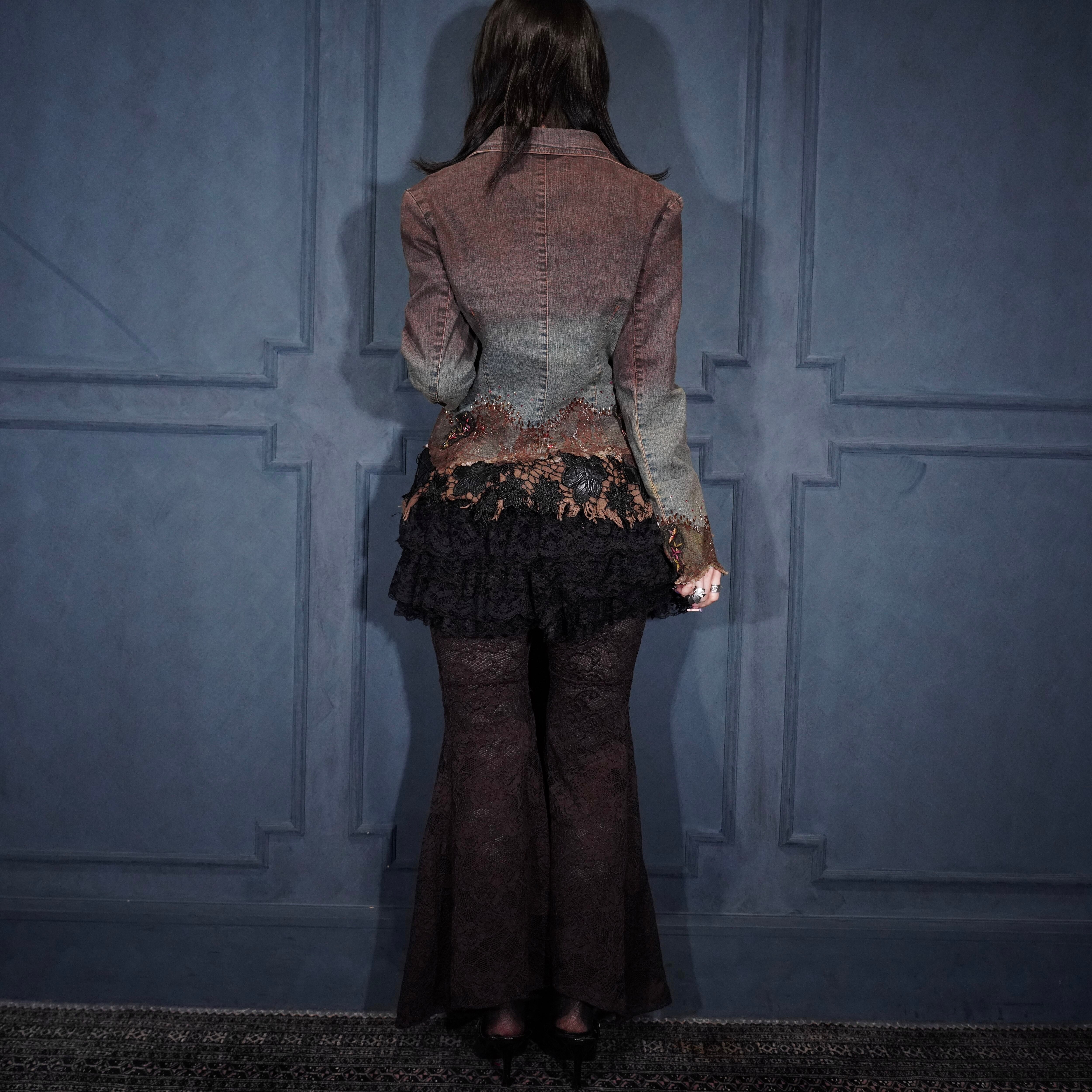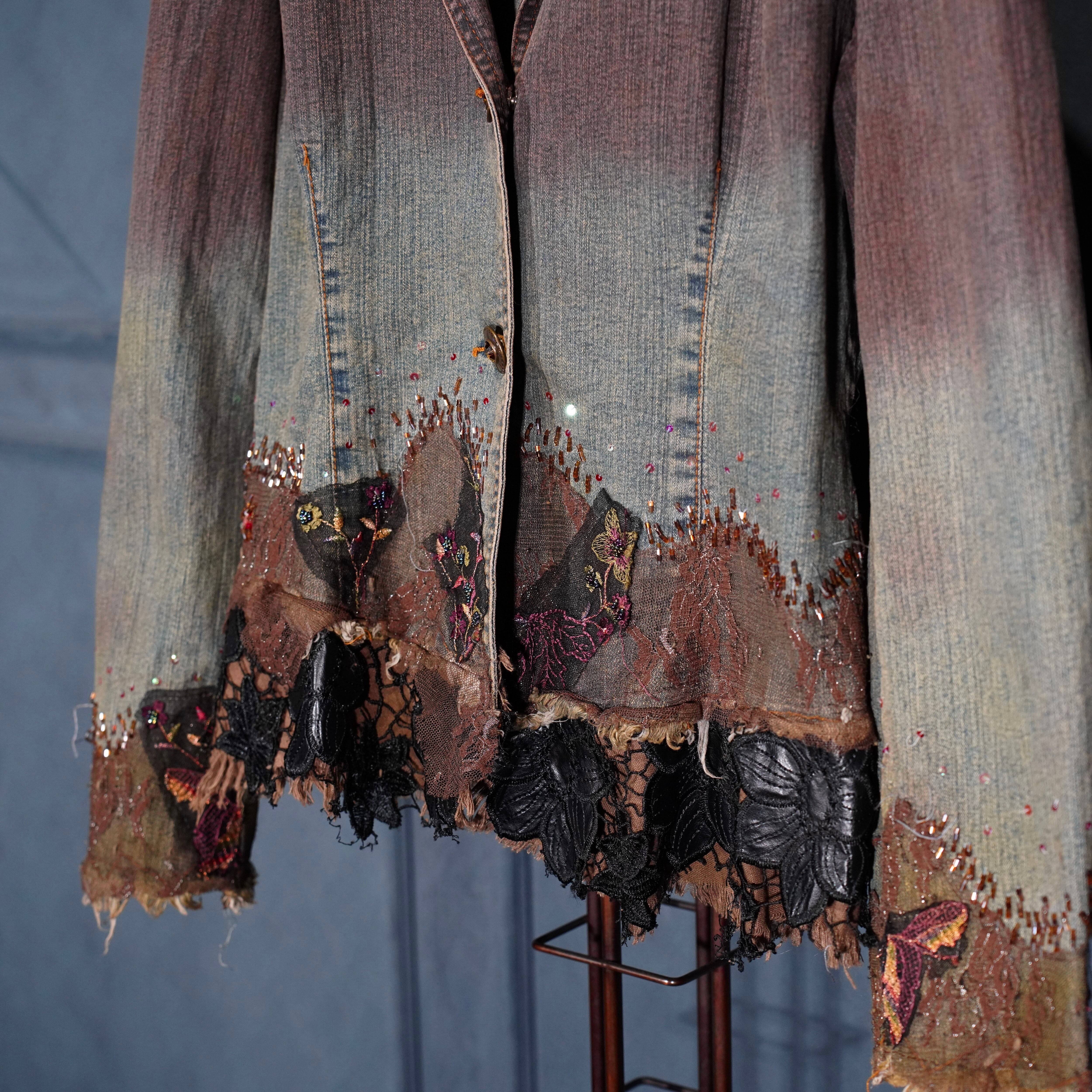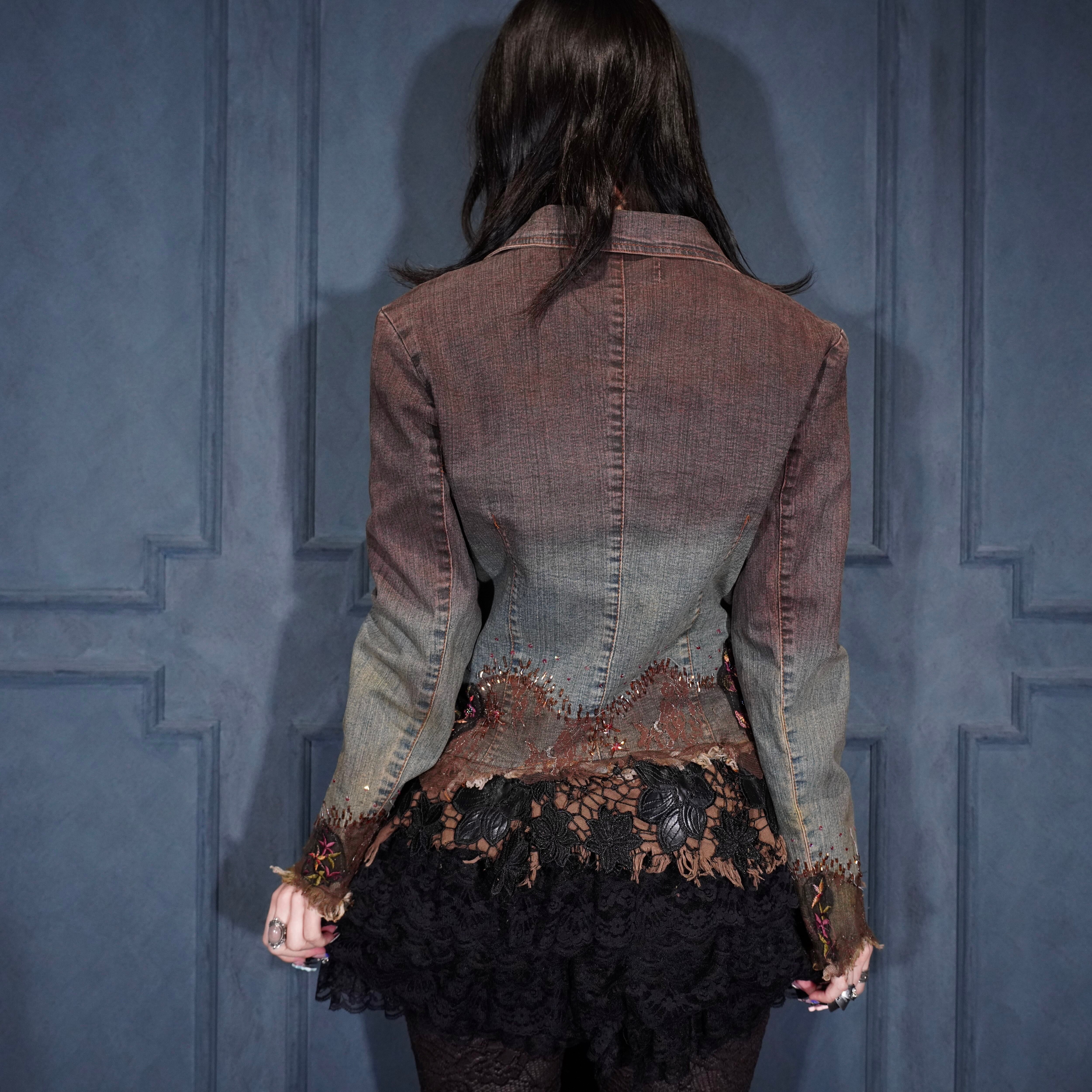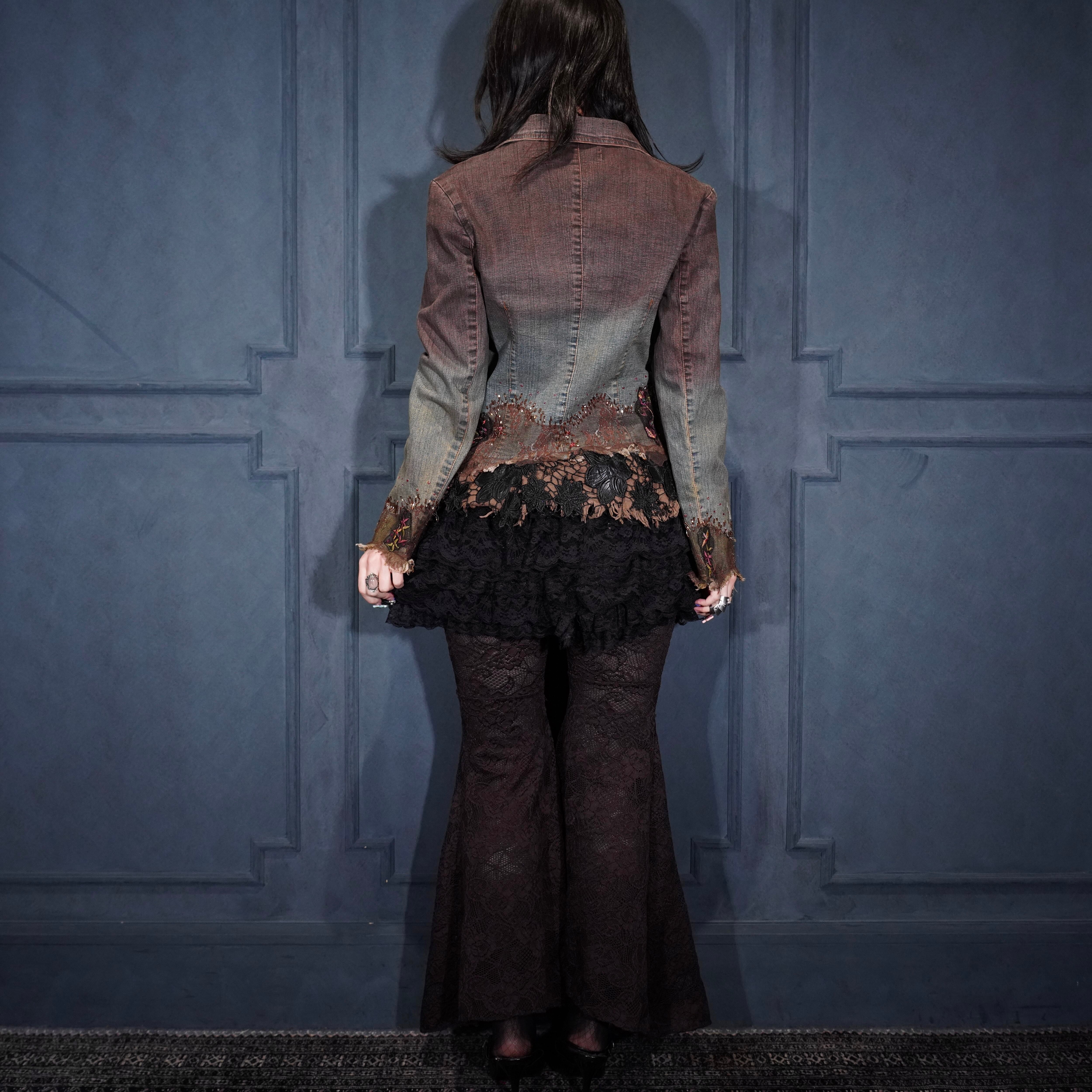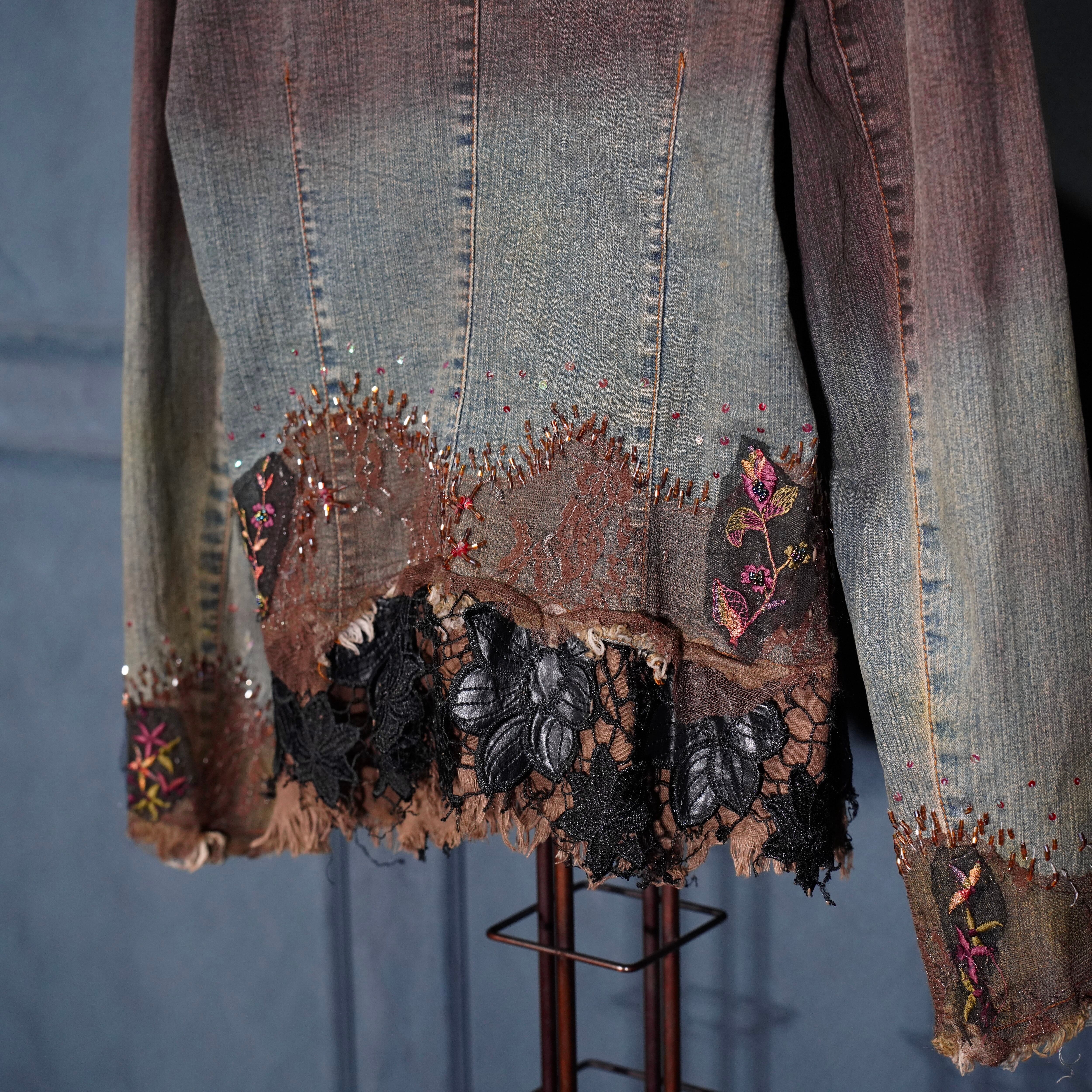 EU VINTAGE LUCKY FASHION LEATHER FLOWER LACE GRADATION DESIGN DENIM TAILORED JACKET/ヨーロッパ古着レザーお花レースグラデーションデザインデニムテーラードジャケット
