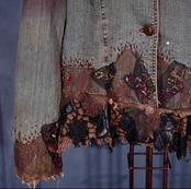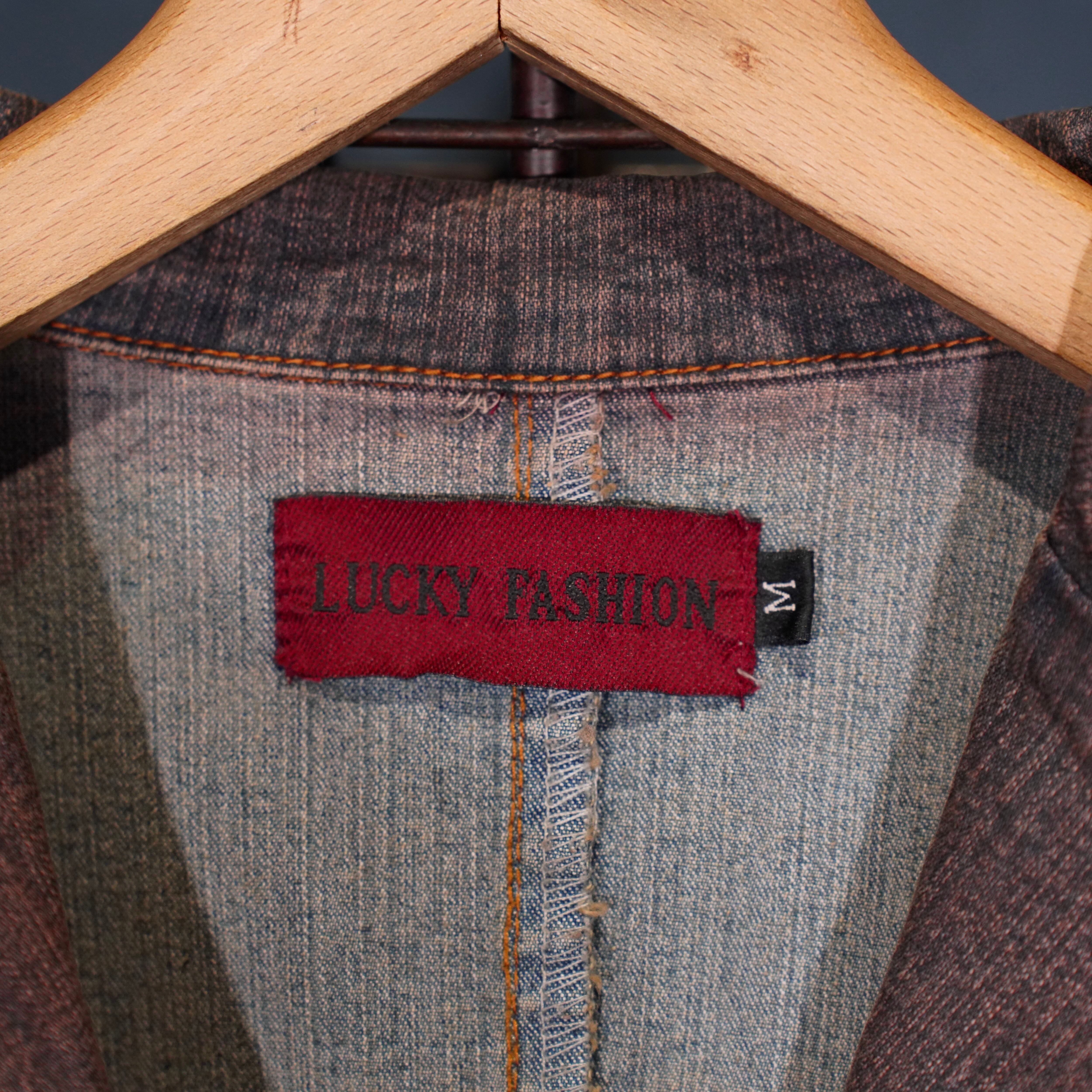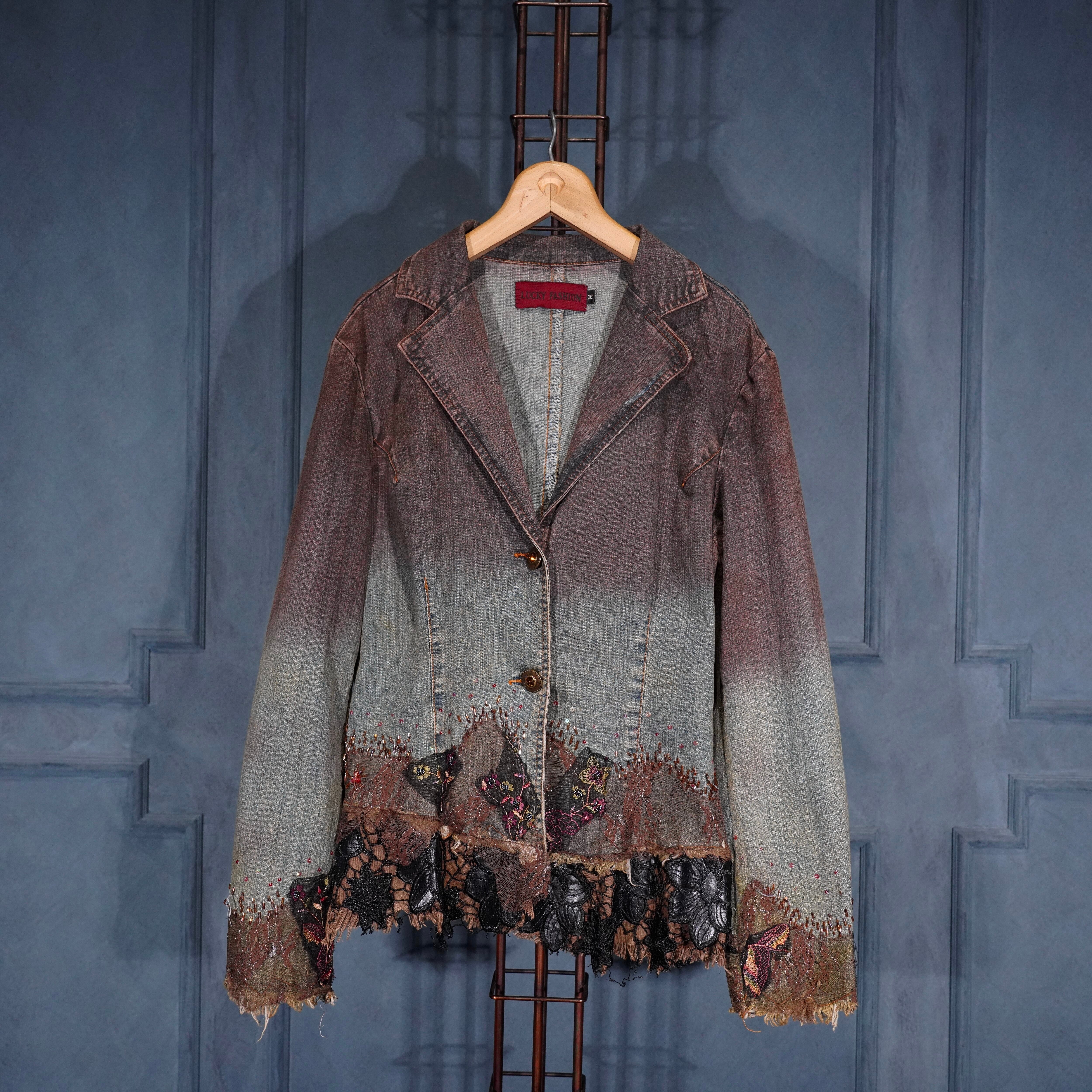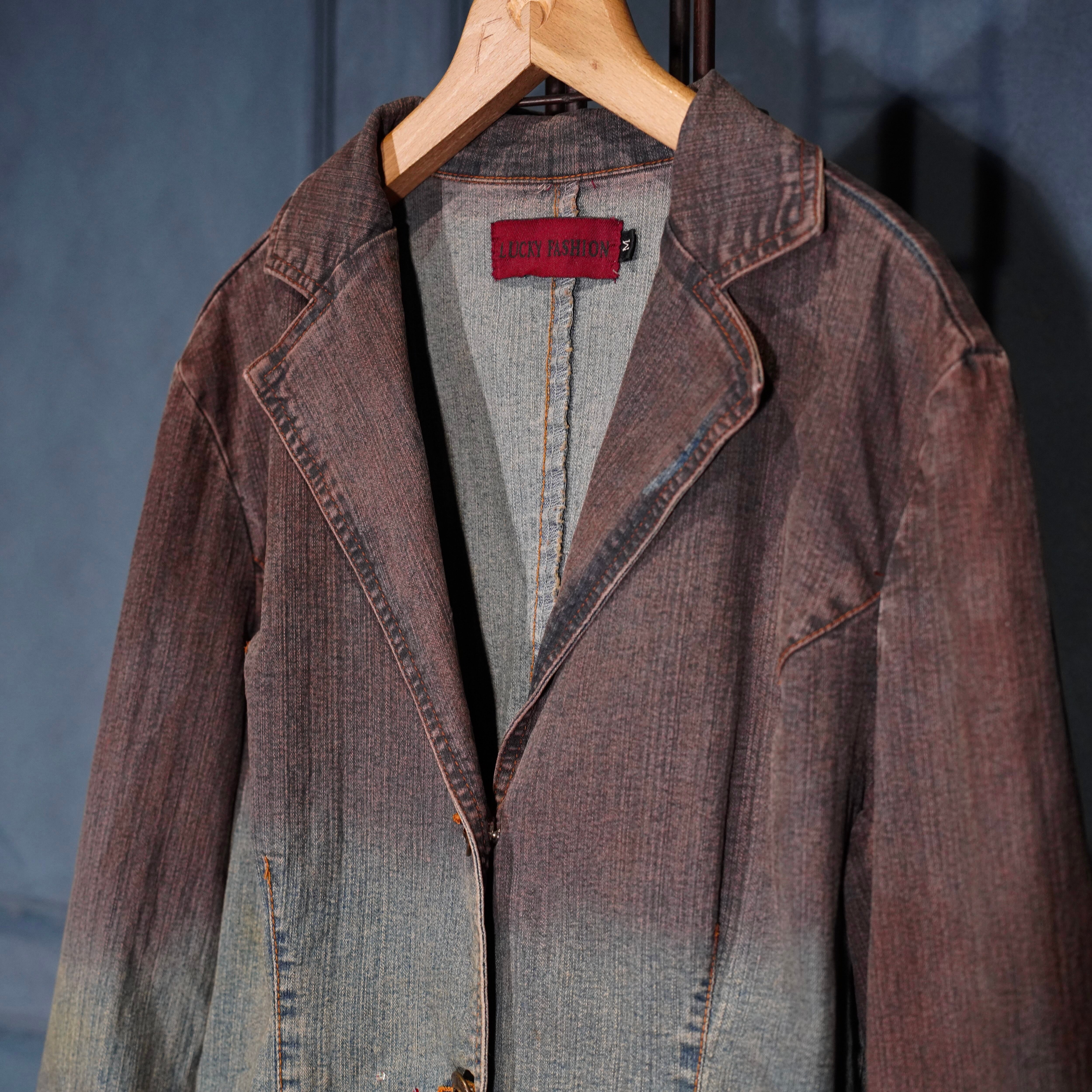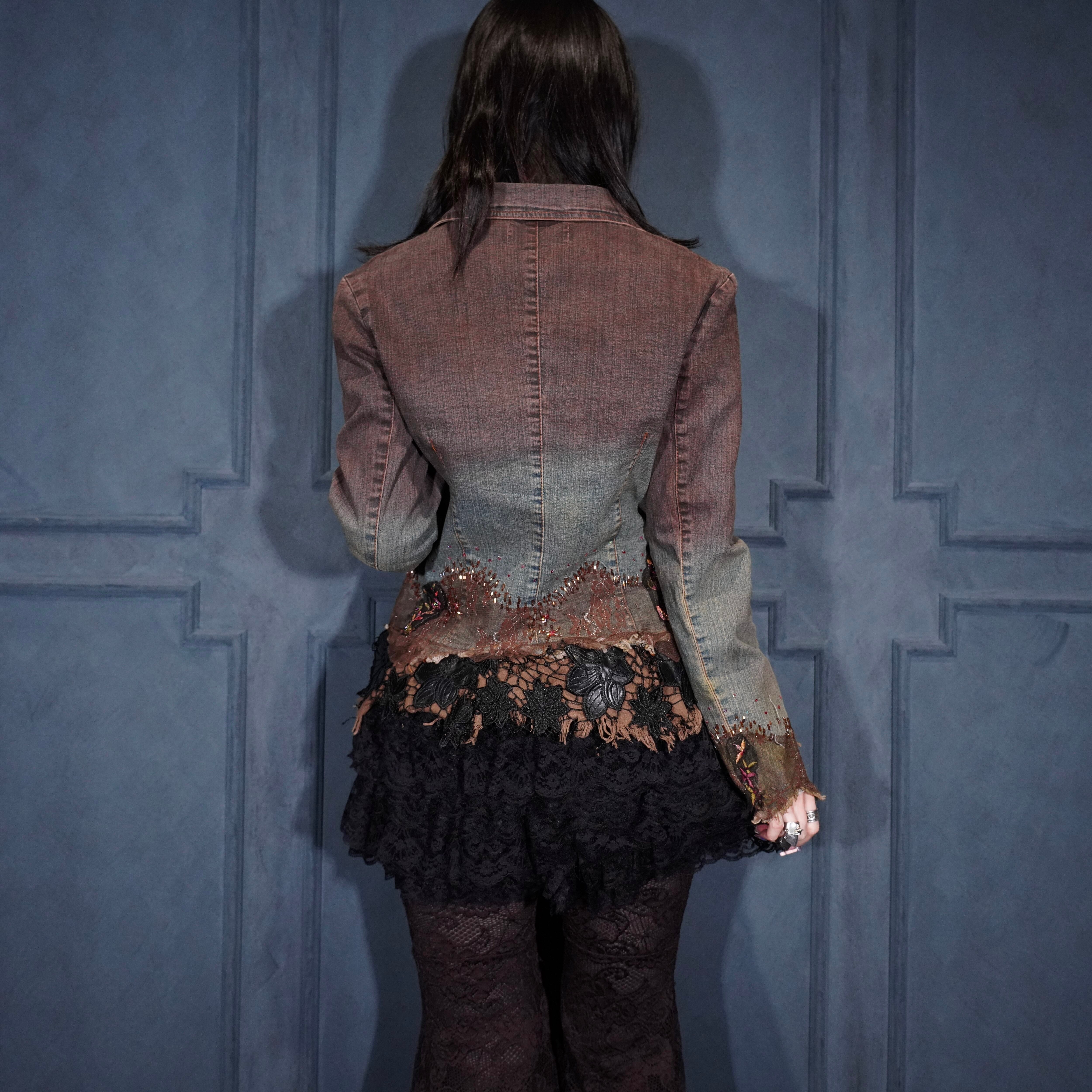 EU VINTAGE LUCKY FASHION LEATHER FLOWER LACE GRADATION DESIGN DENIM TAILORED JACKET/ヨーロッパ古着レザーお花レースグラデーションデザインデニムテーラードジャケット