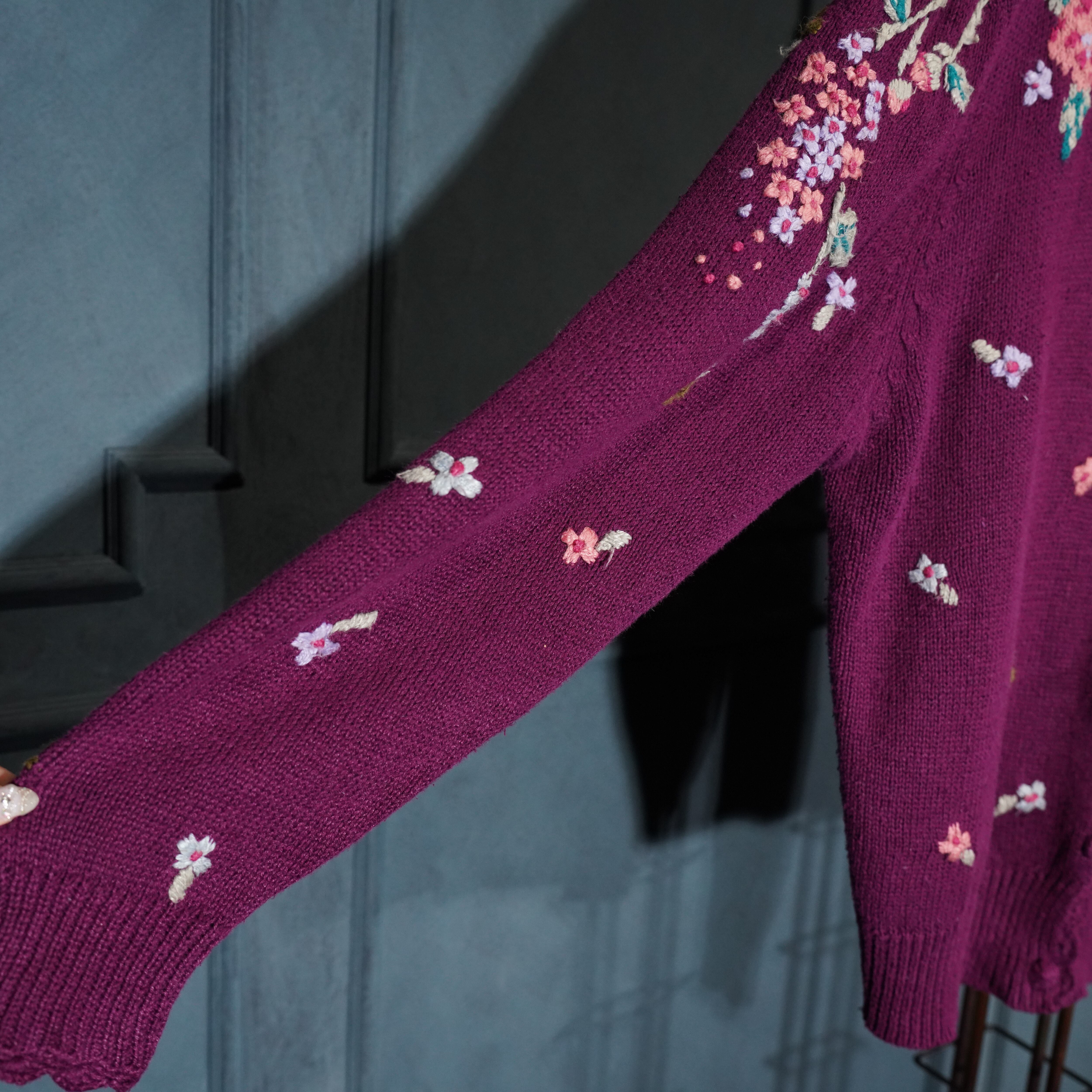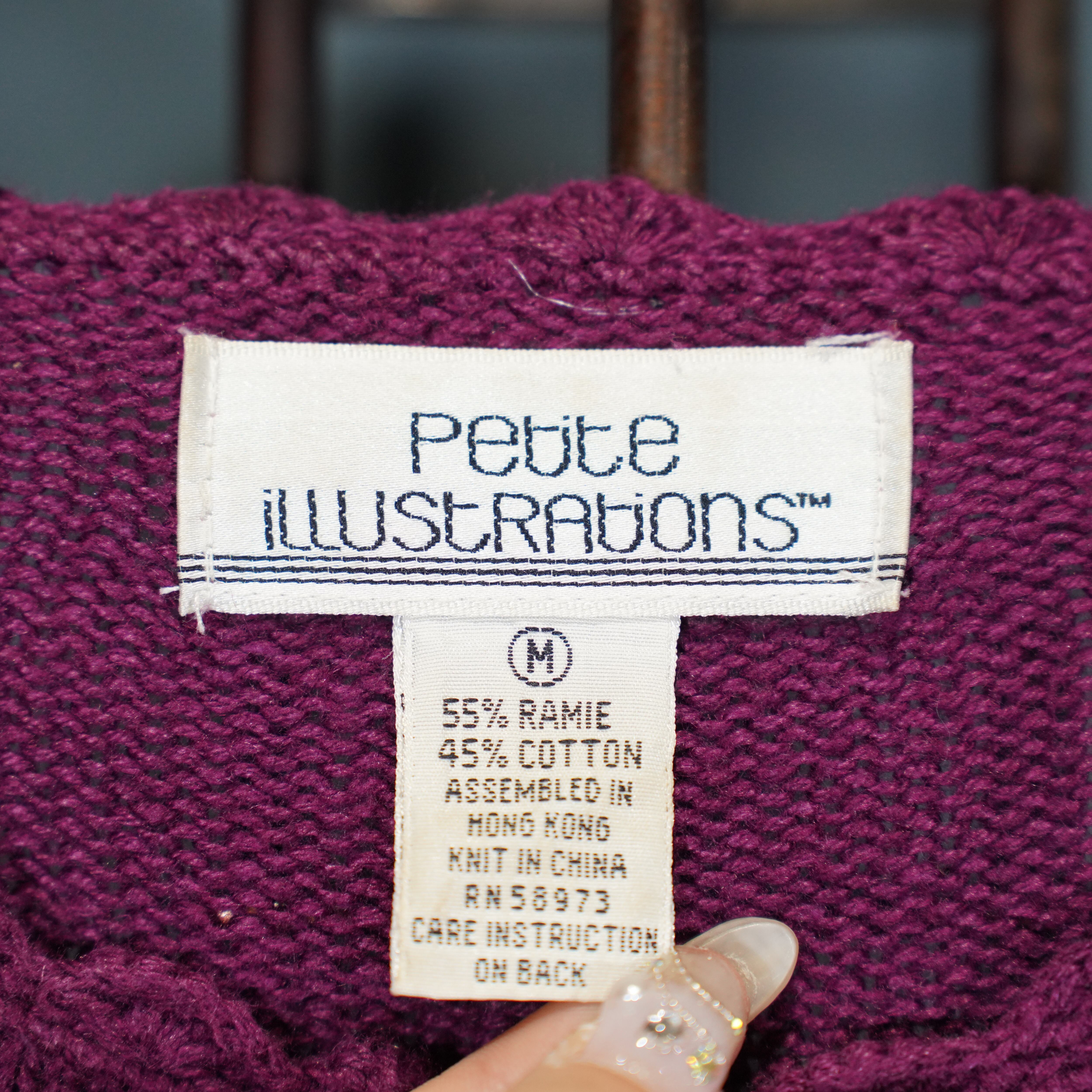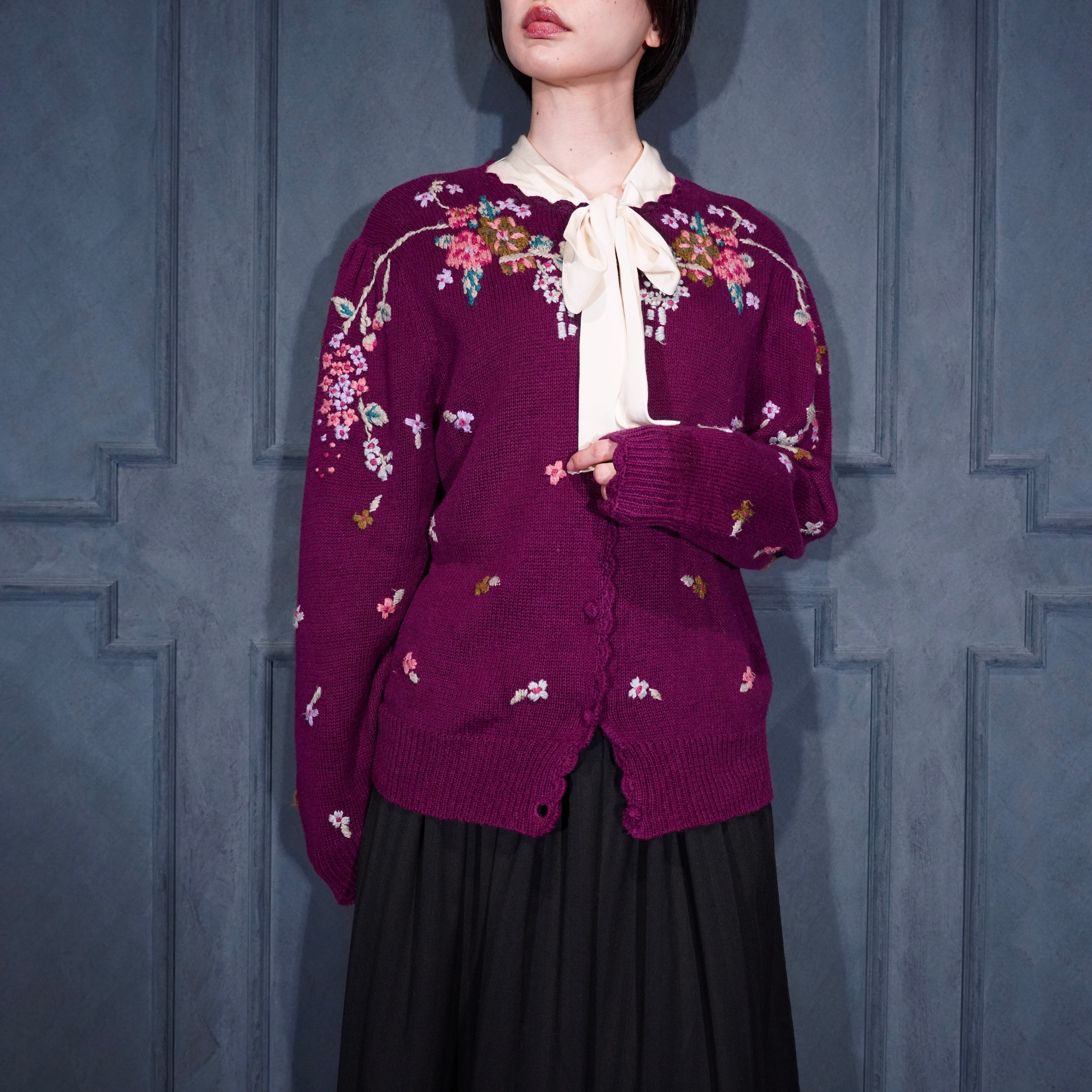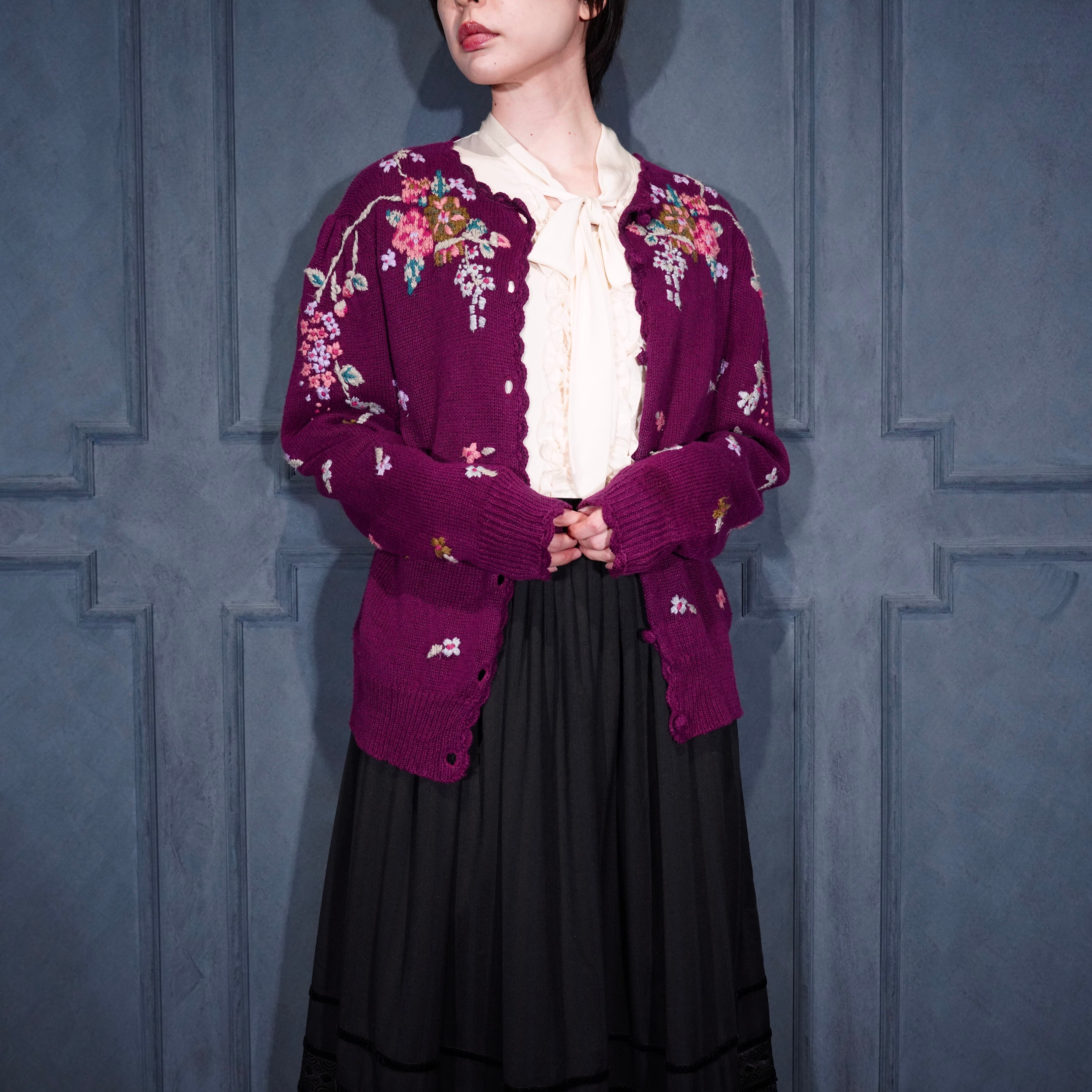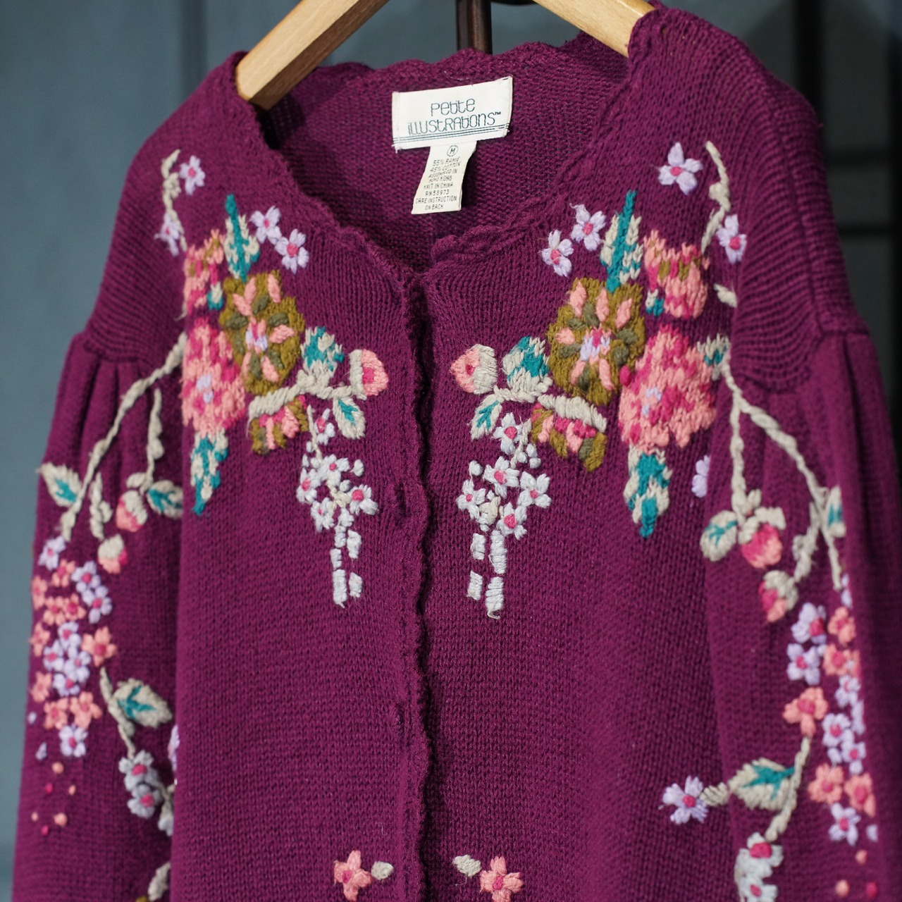 USA VINTAGE Petite iLLUStRAtions FLOWER EMBROIDERY SCALLOPED DESIGN COTTON RAMIE KNIT CARDIGAN/アメリカ古着お花刺繍スカラップデザインコットンラミーニットカーディガン