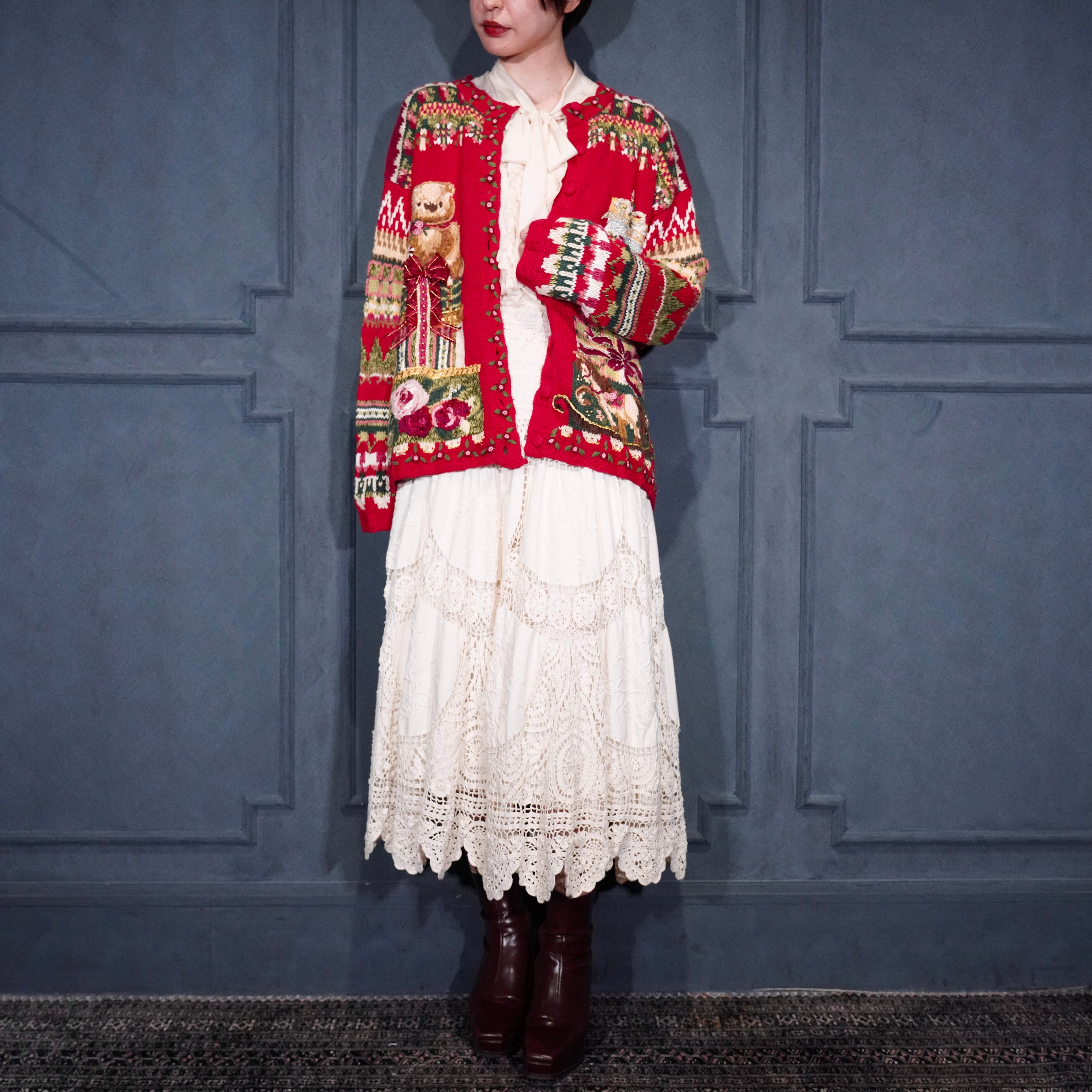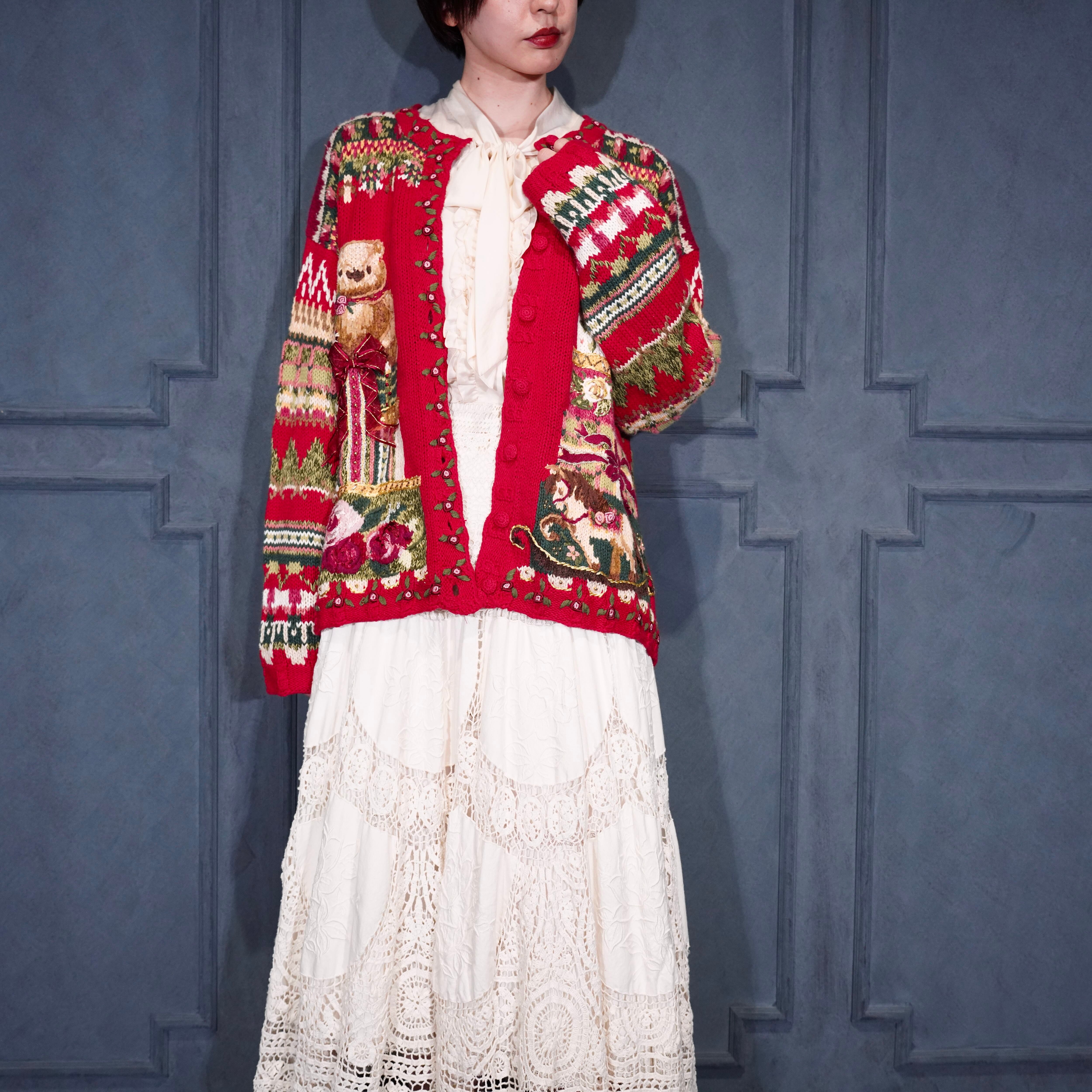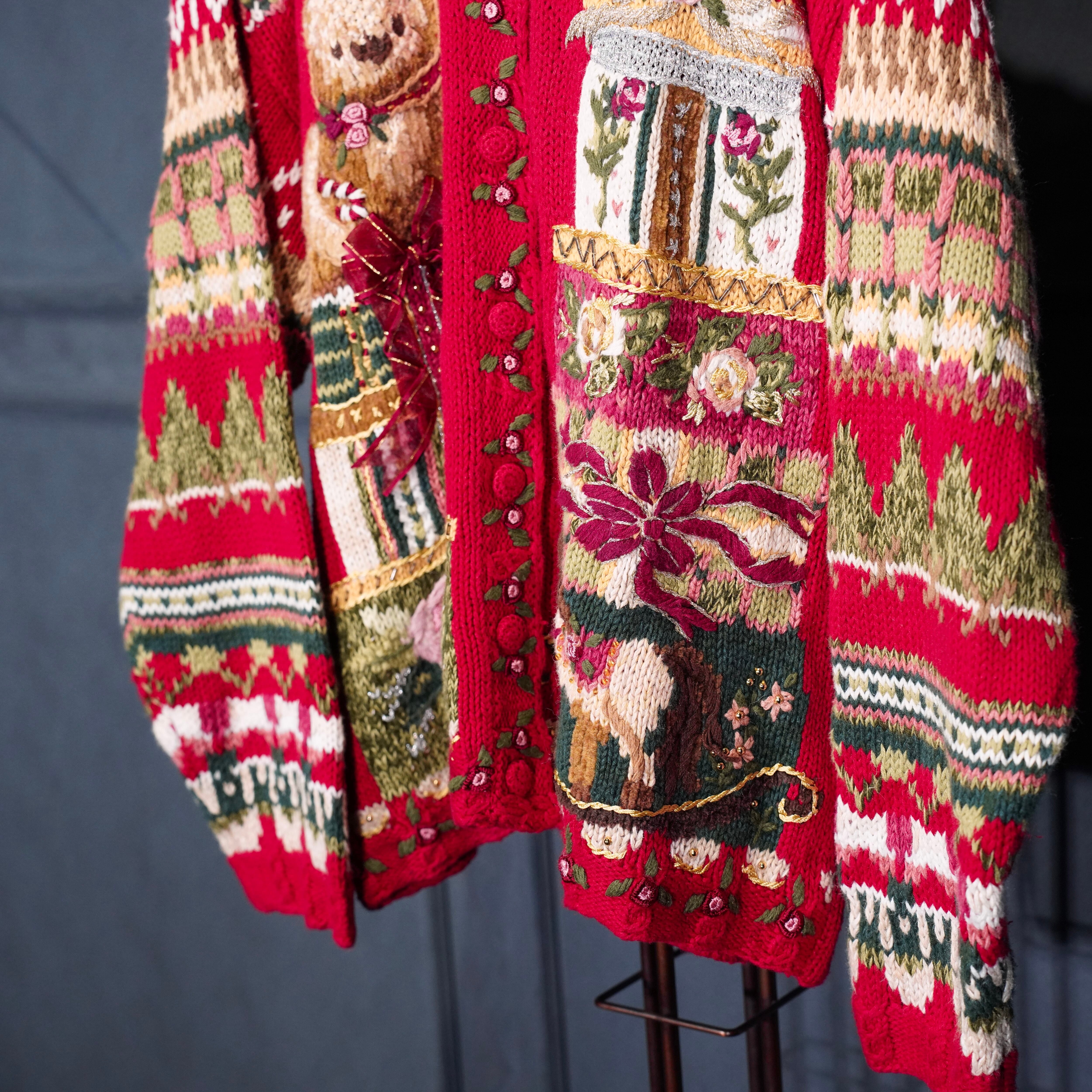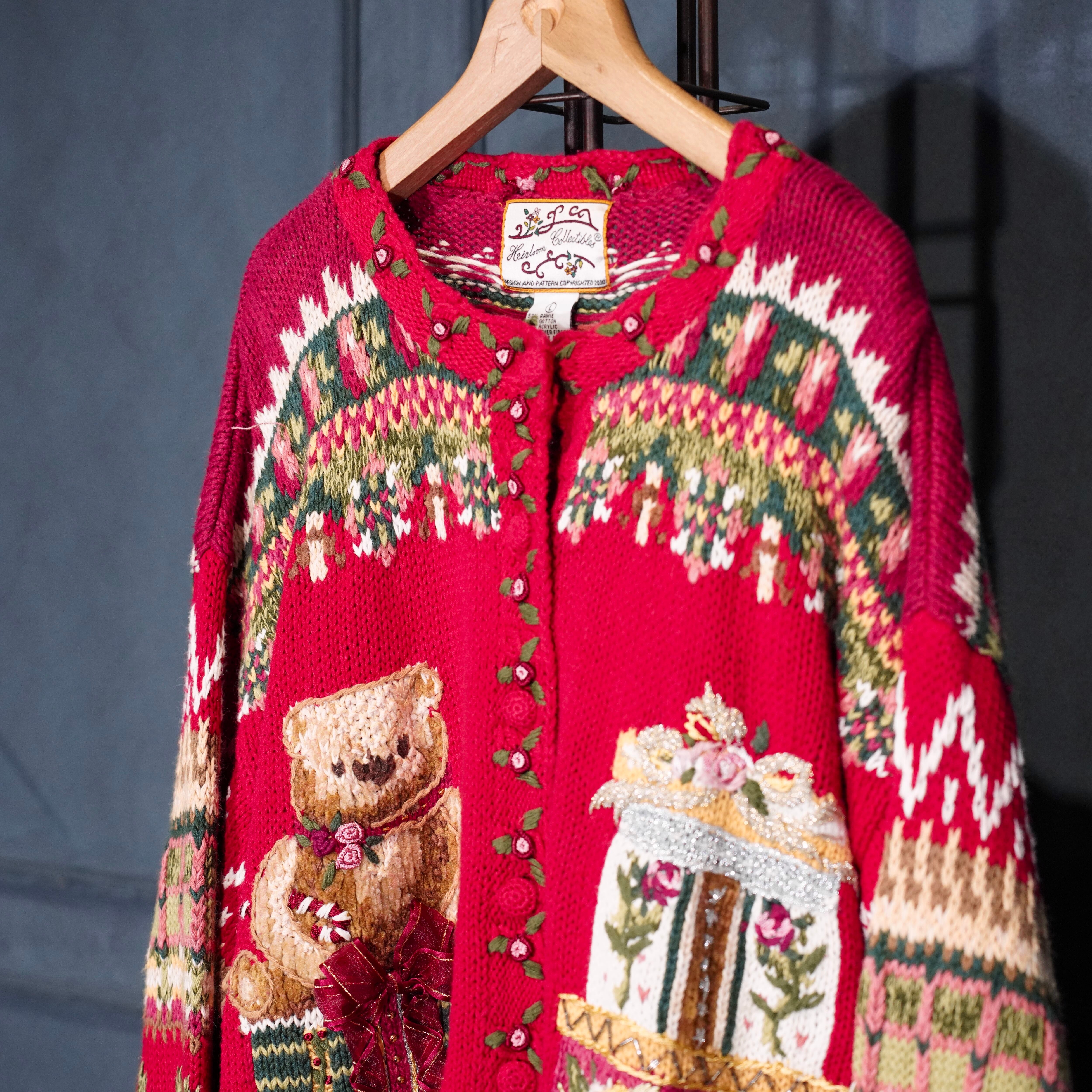 USA VINTAGE Heirloom Collectibles TEDDY BEAR PRESENT DESIGN COTTON RAMIE XMAS KNIT CARDIGAN/アメリカ古着テディベアプレゼントデザインコットンラミークリスマスニットカーディガン