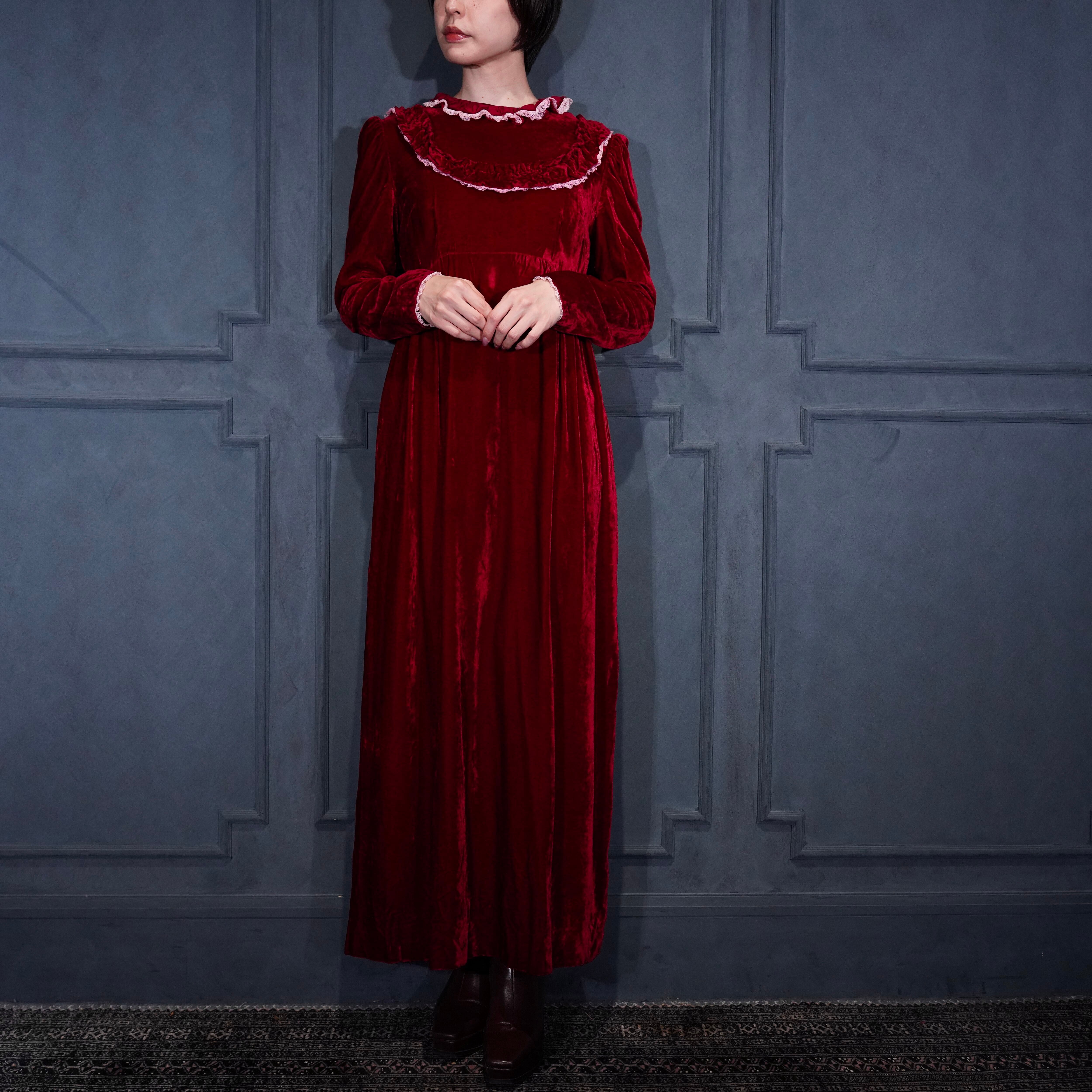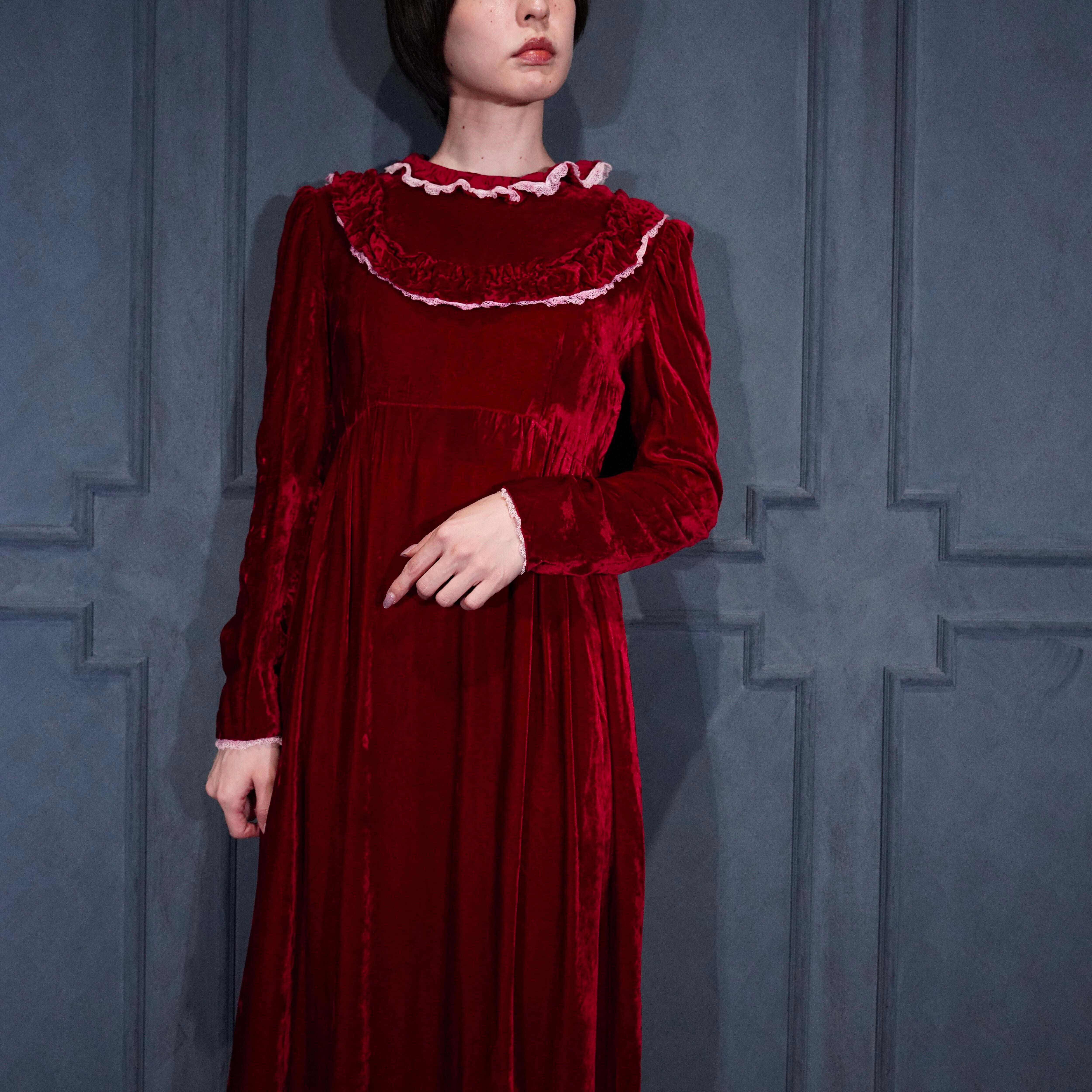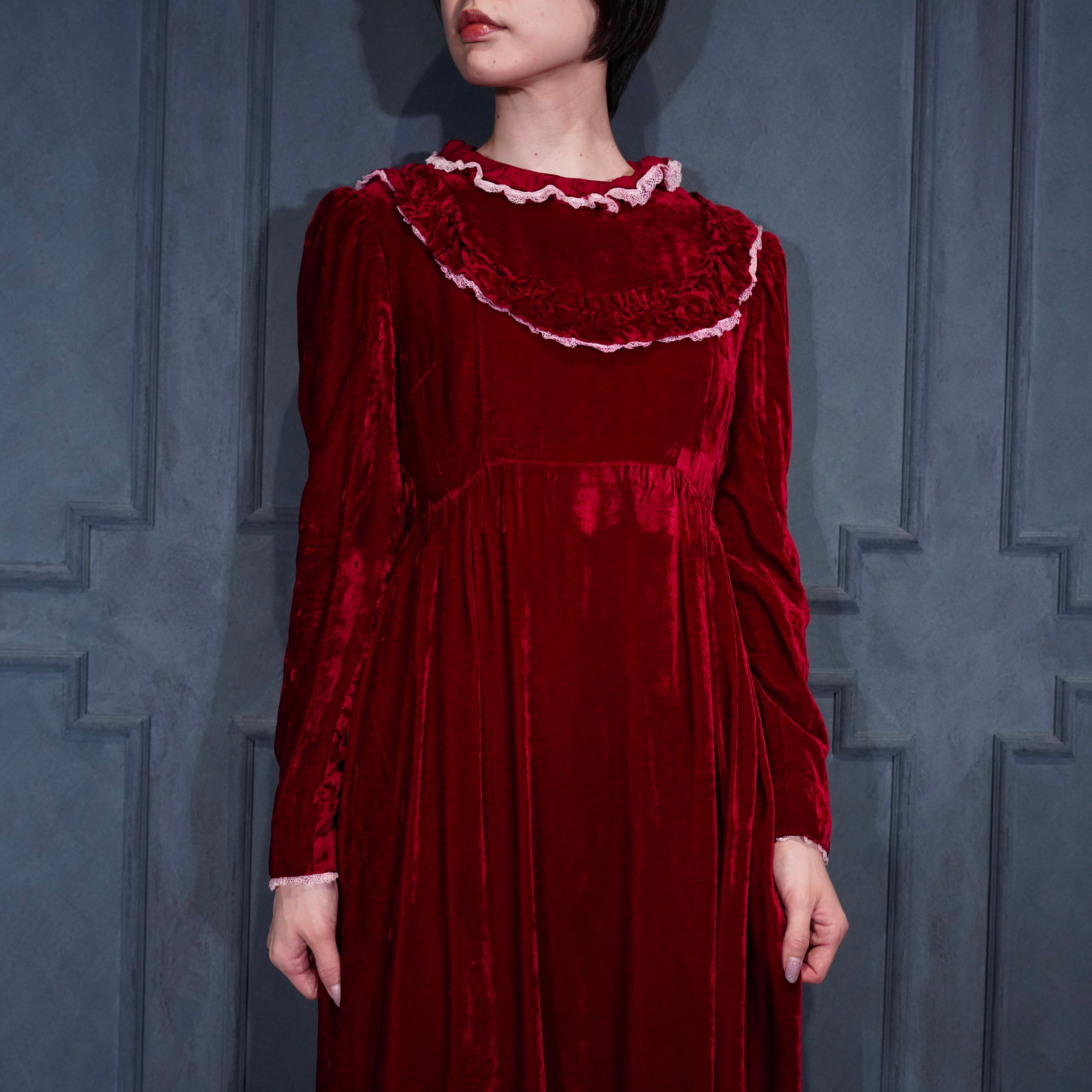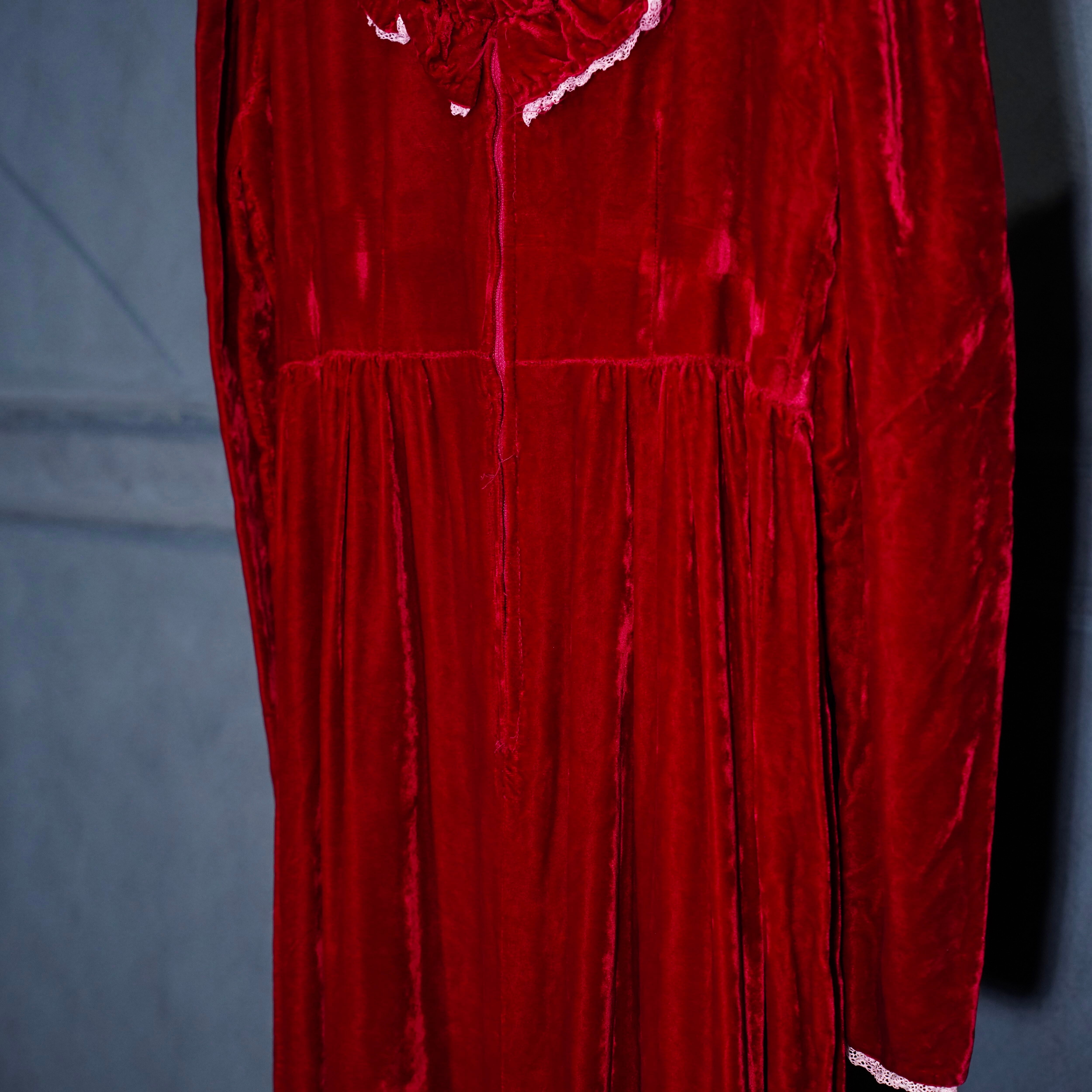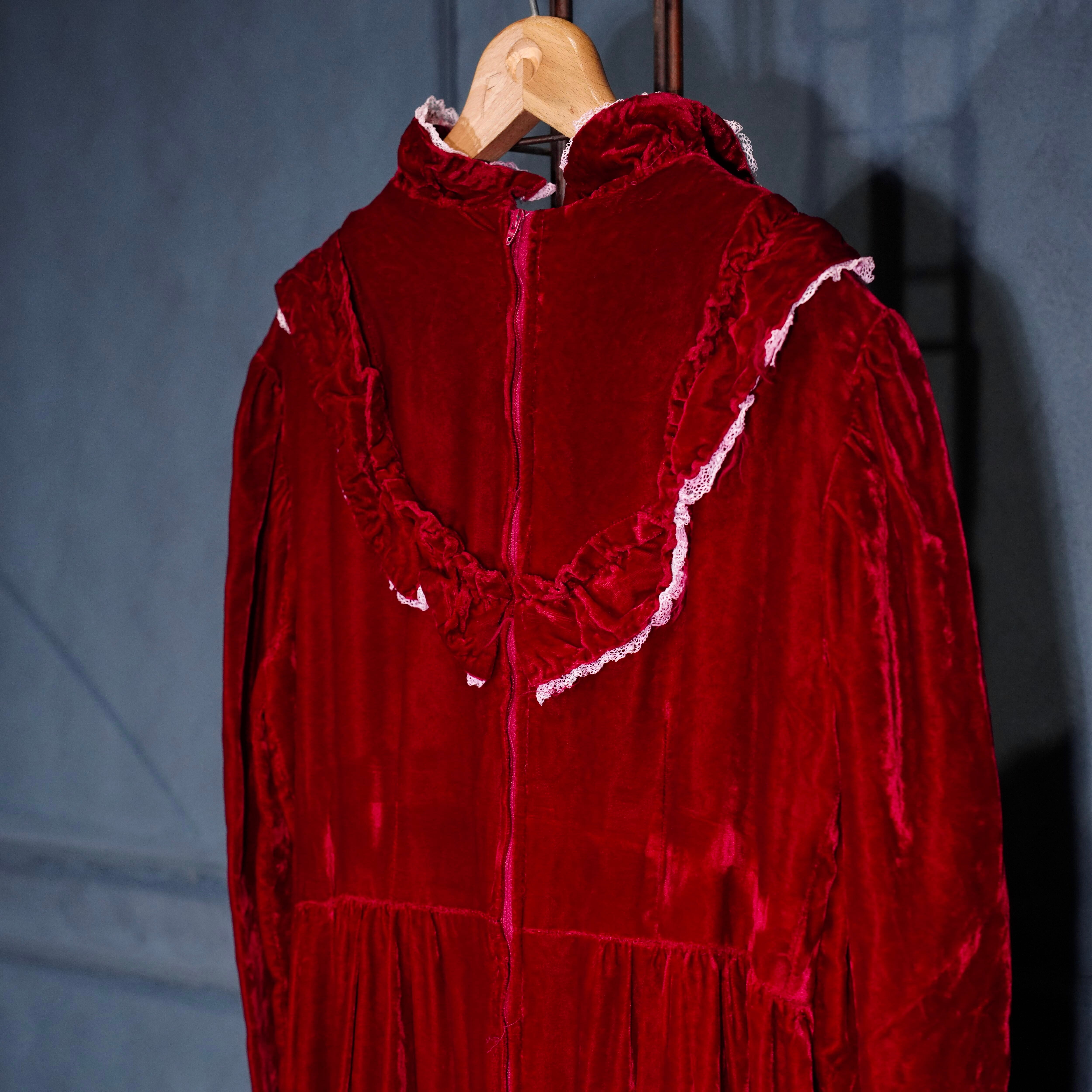 70’s USA VINTAGE RED COLOR LACE FRILL DESIGN VELOUR DRESS ONE PIECE/70年代アメリカ古着レッドカラーレースフリルデザインベロアドレスワンピース