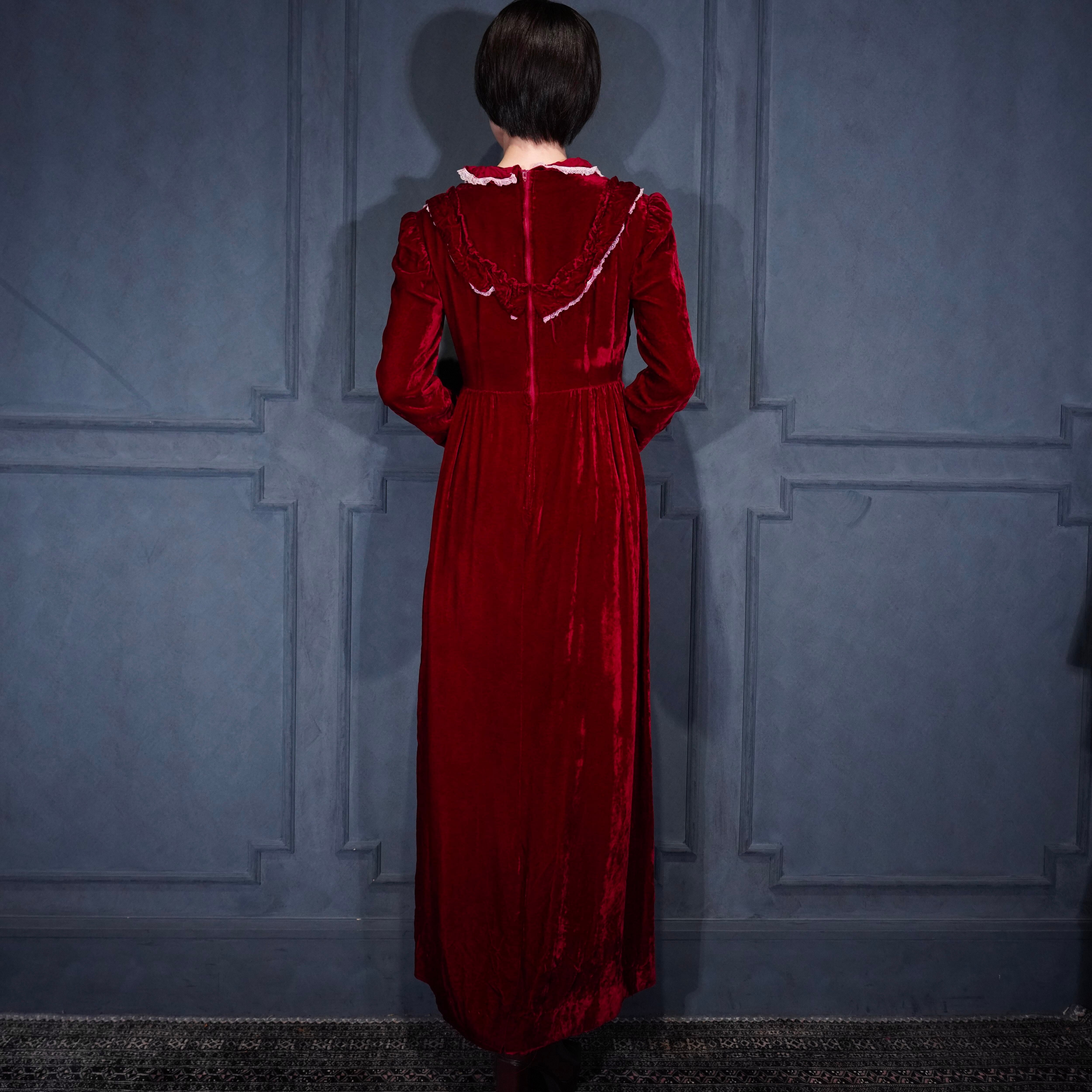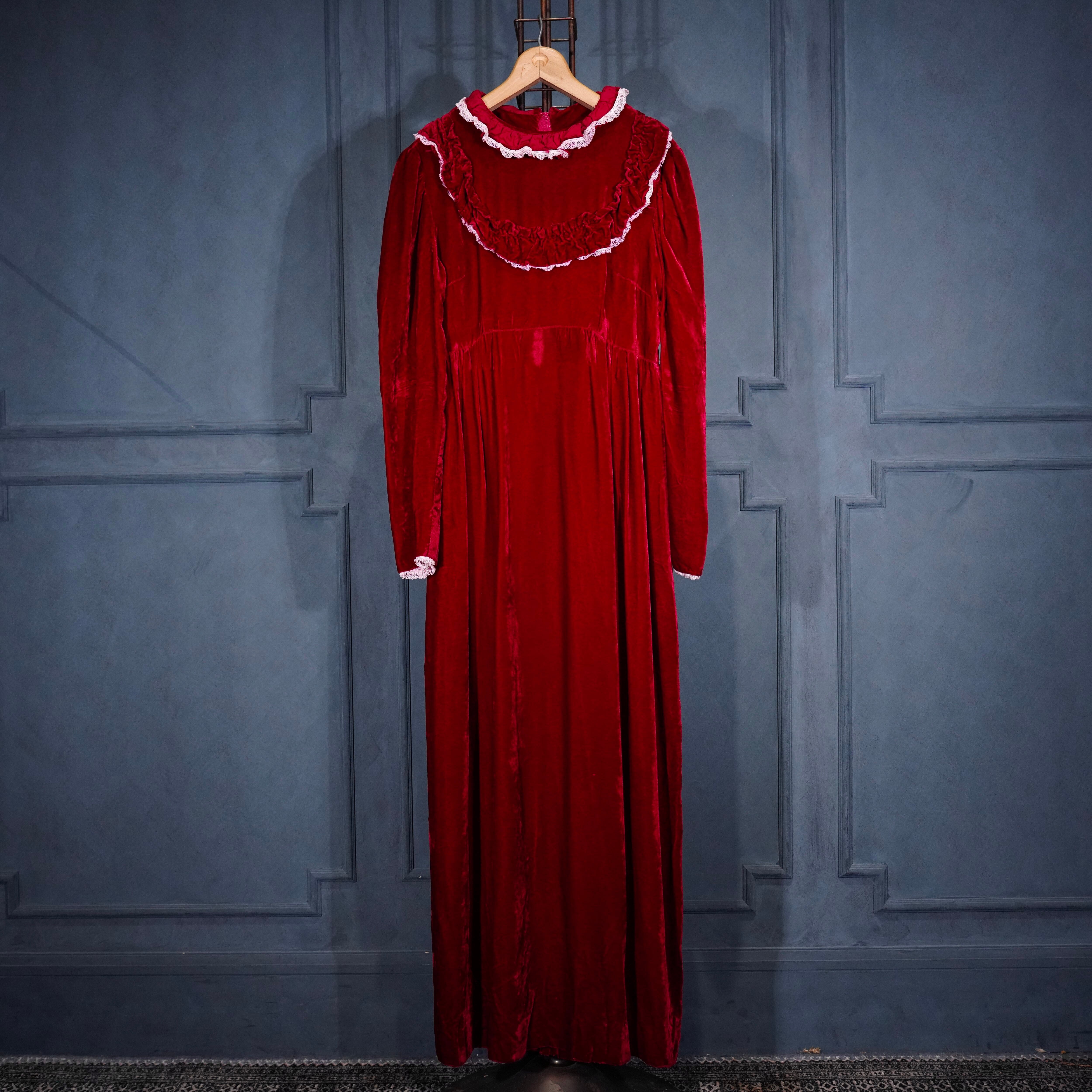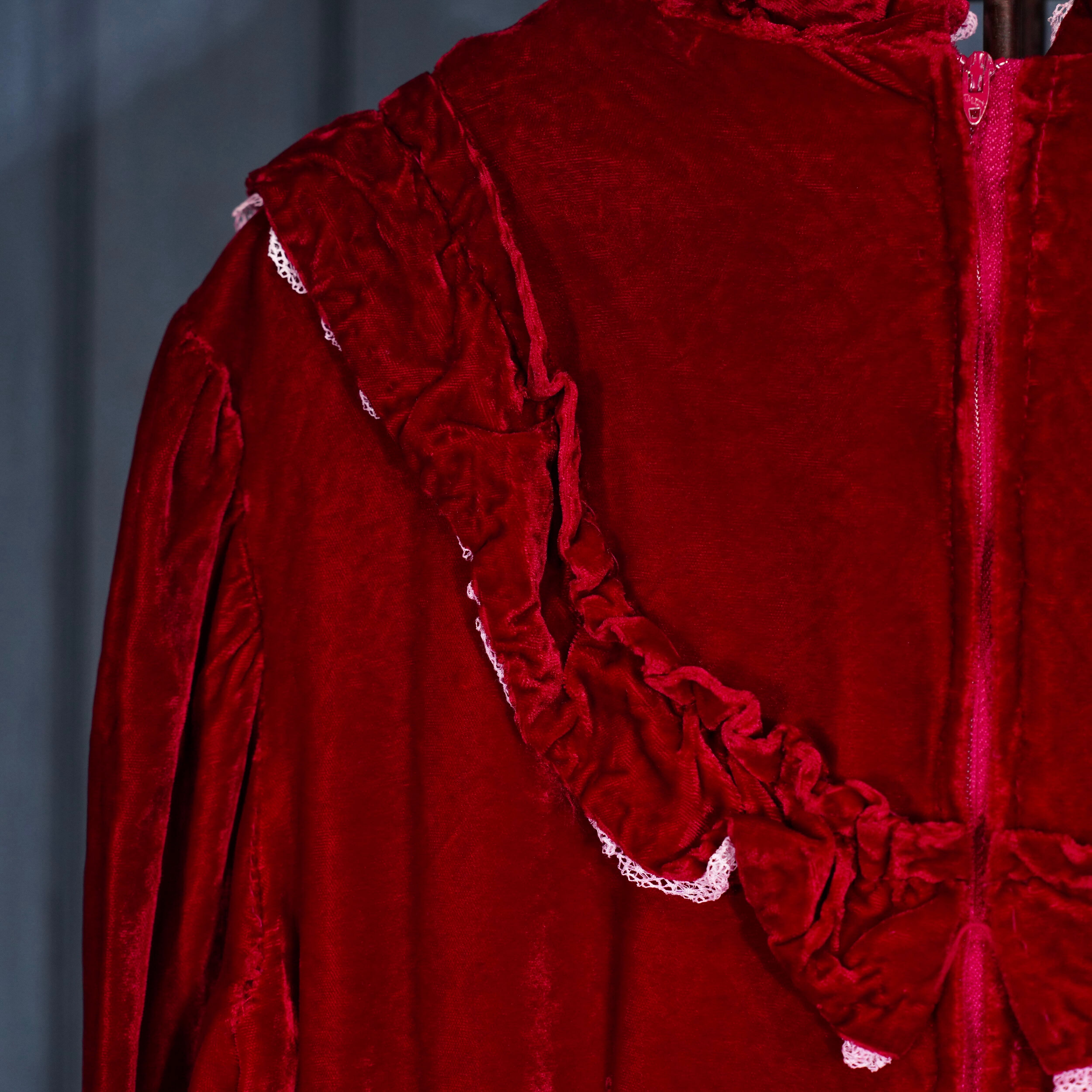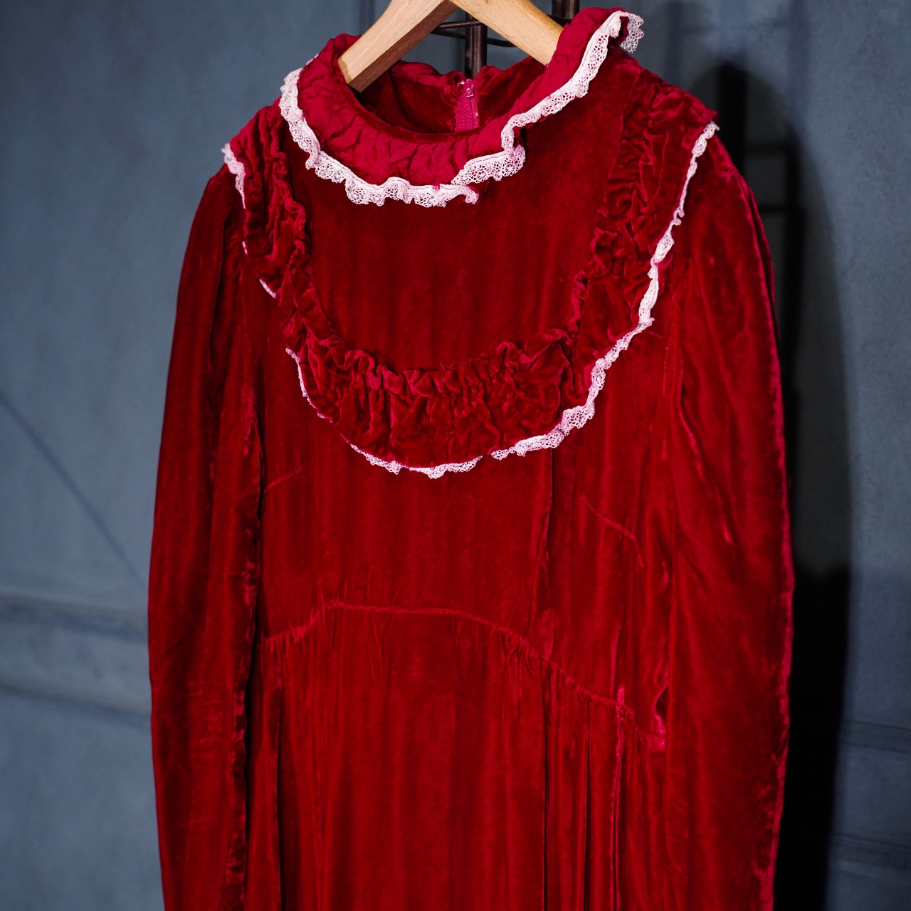 70’s USA VINTAGE RED COLOR LACE FRILL DESIGN VELOUR DRESS ONE PIECE/70年代アメリカ古着レッドカラーレースフリルデザインベロアドレスワンピース
