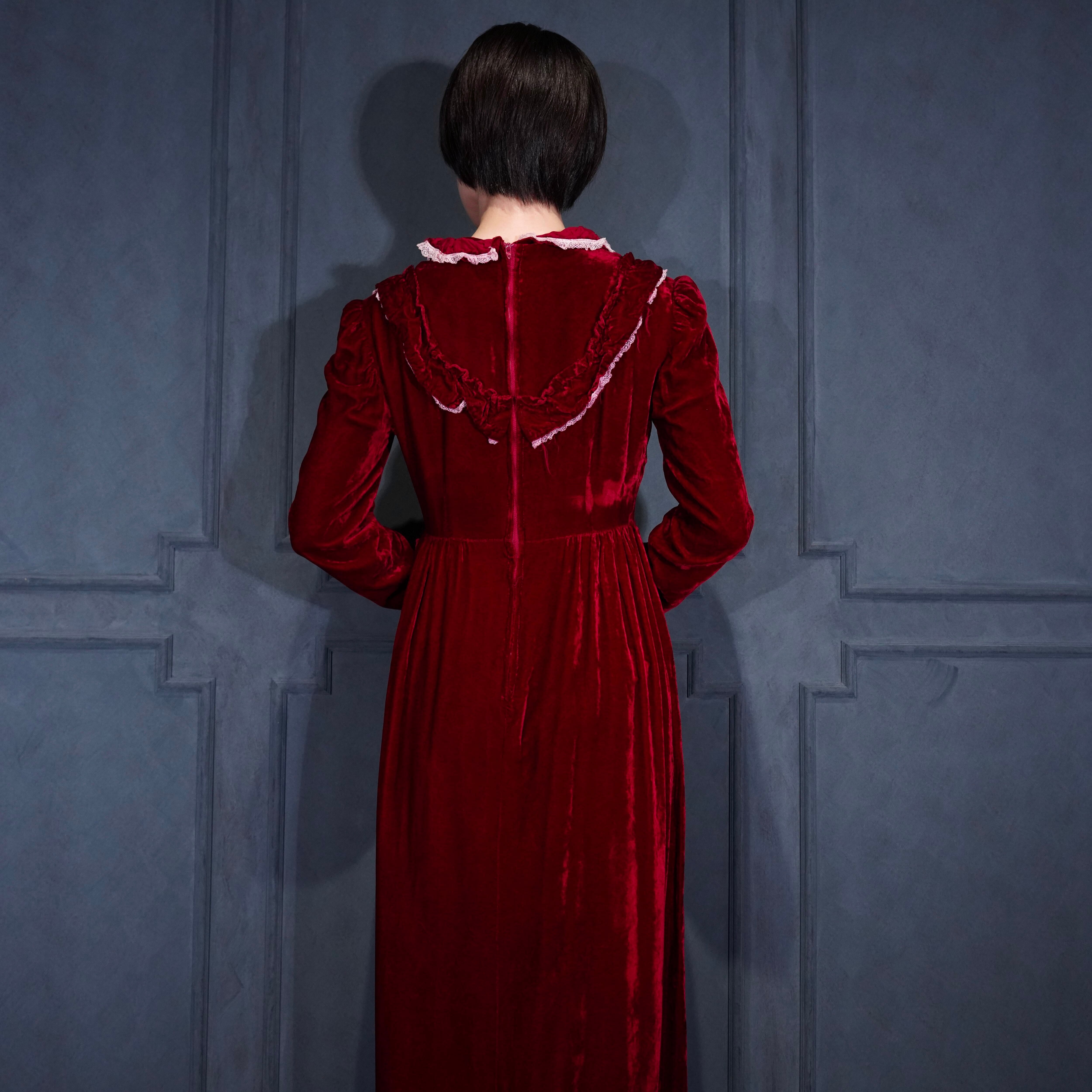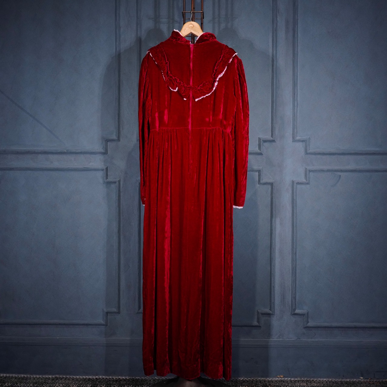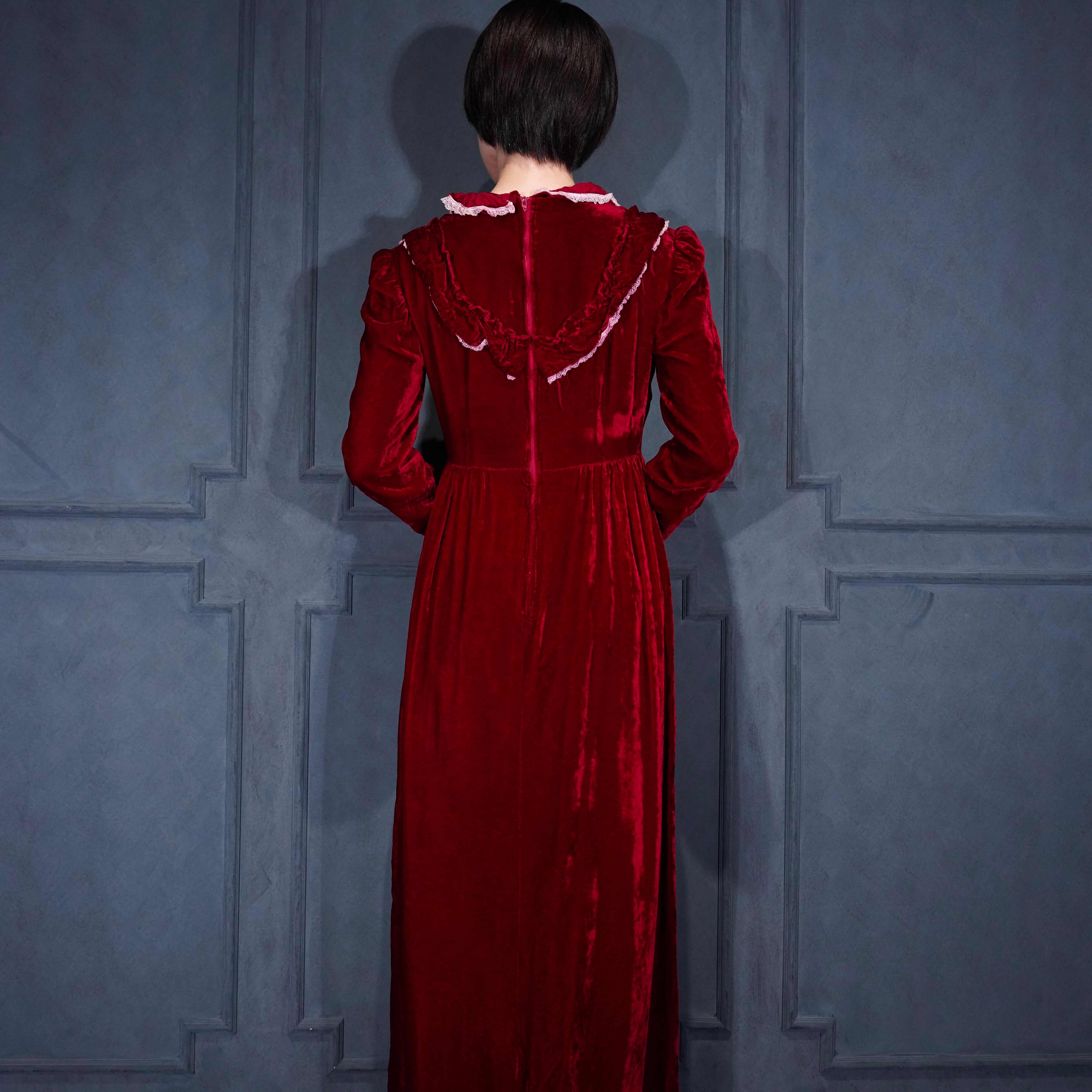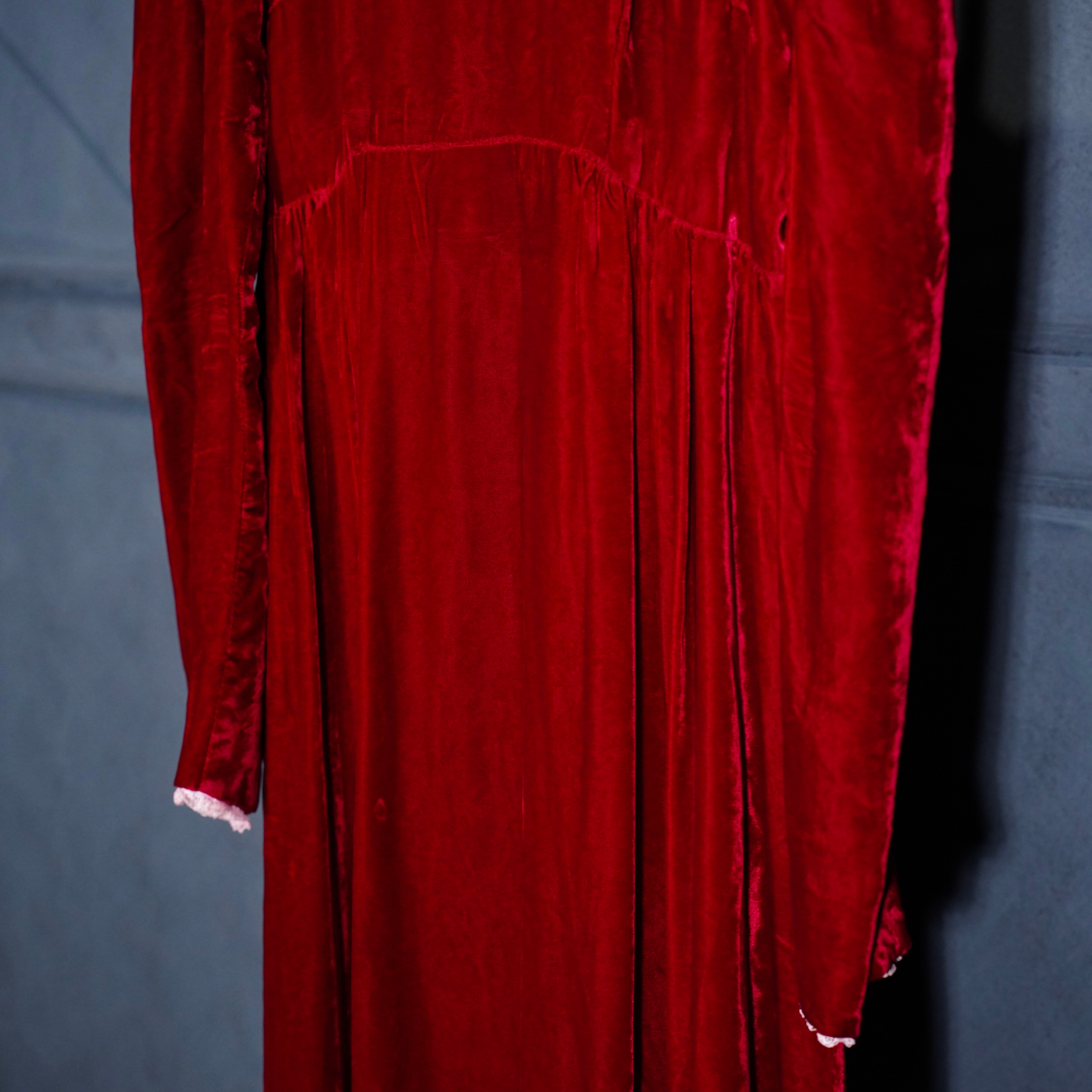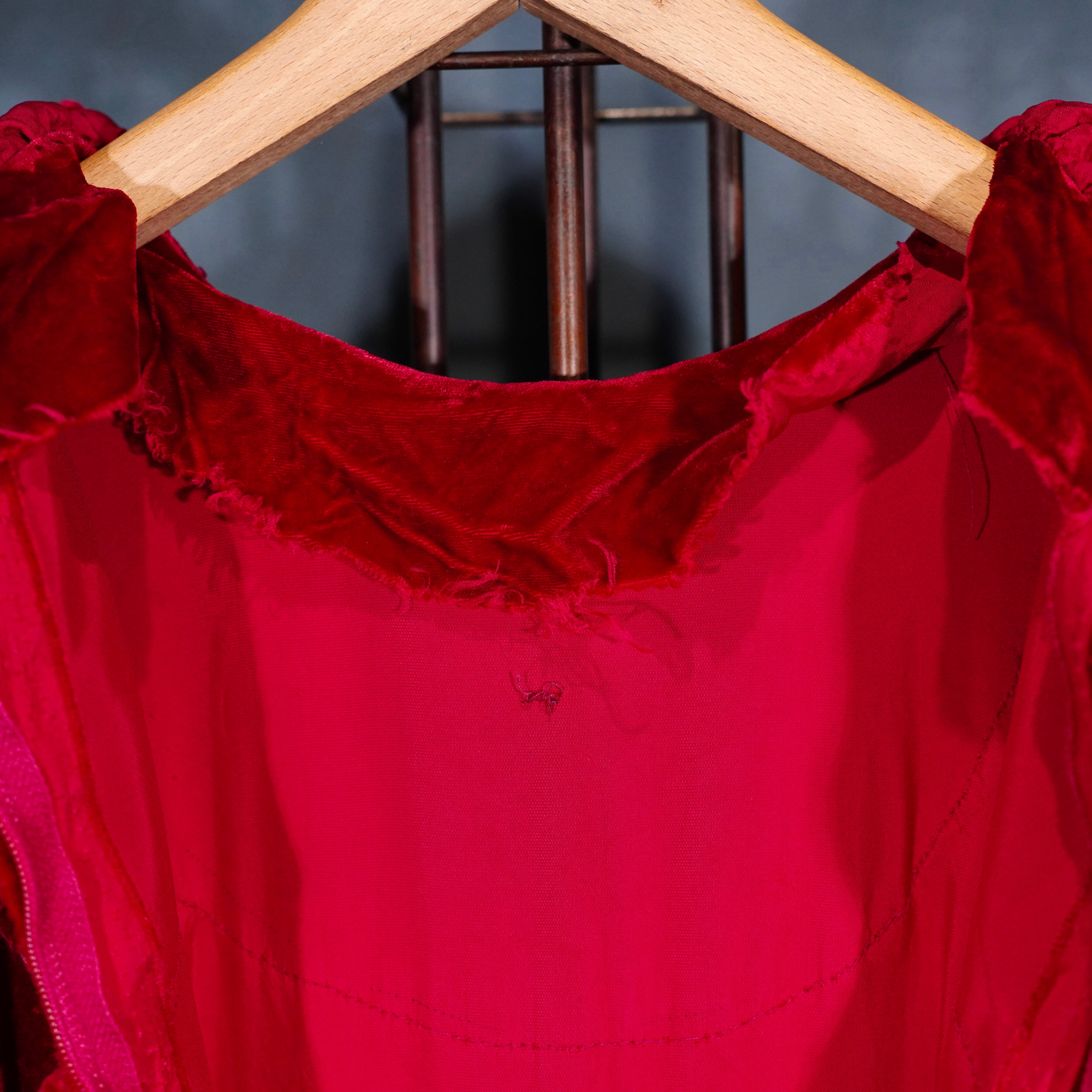 70’s USA VINTAGE RED COLOR LACE FRILL DESIGN VELOUR DRESS ONE PIECE/70年代アメリカ古着レッドカラーレースフリルデザインベロアドレスワンピース