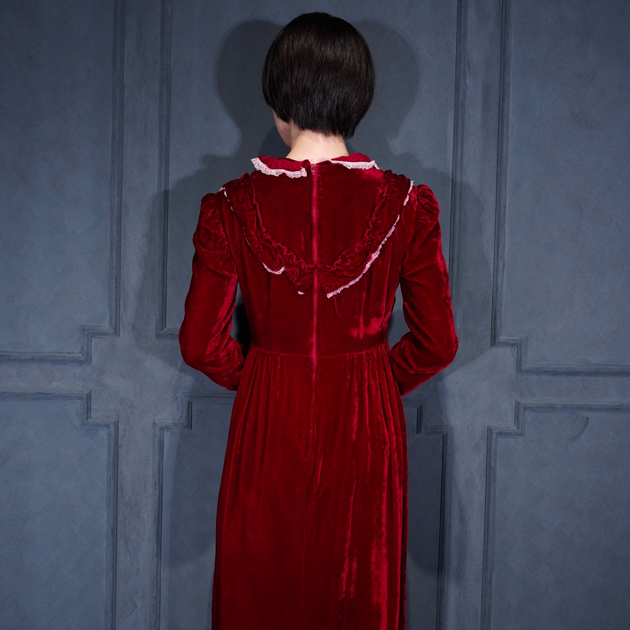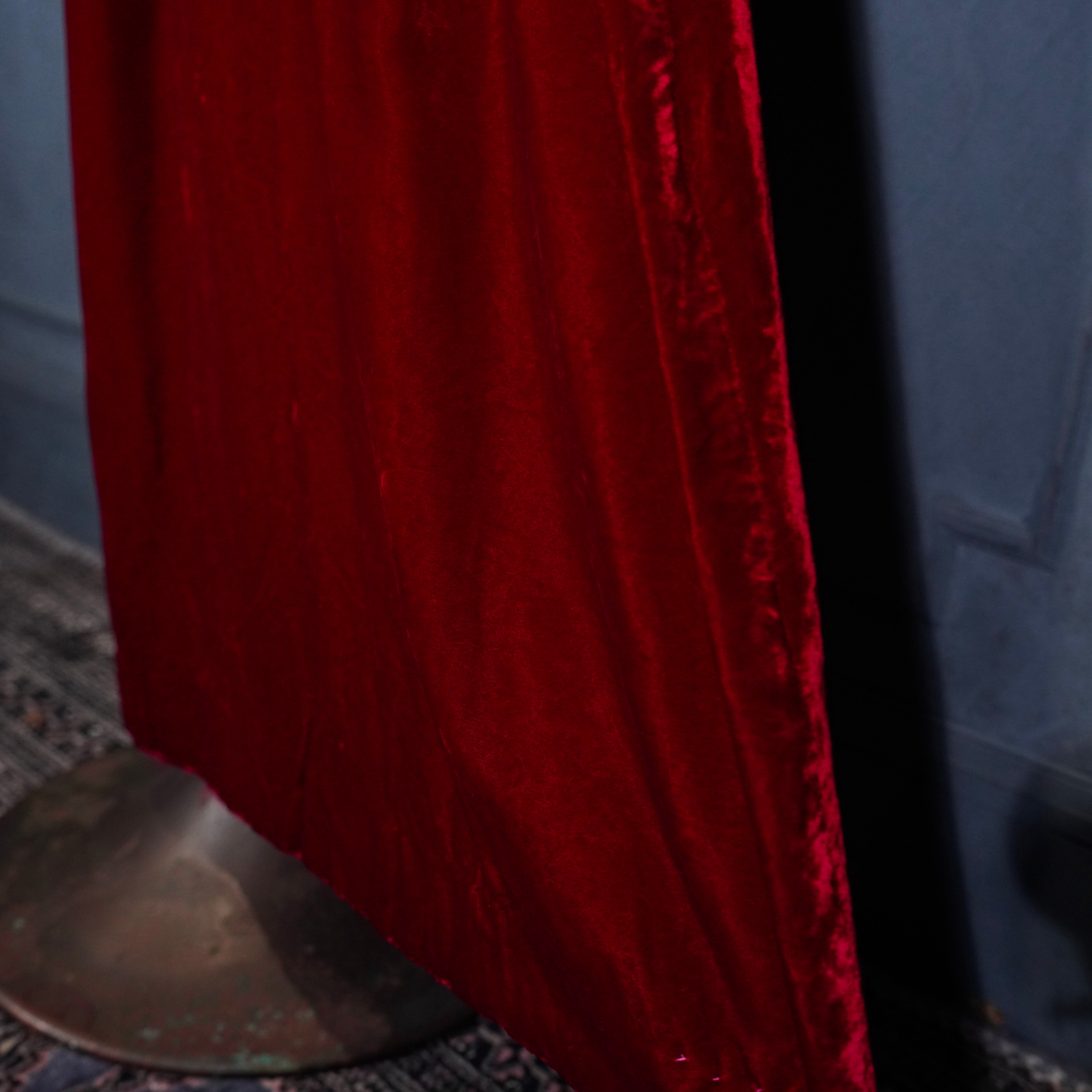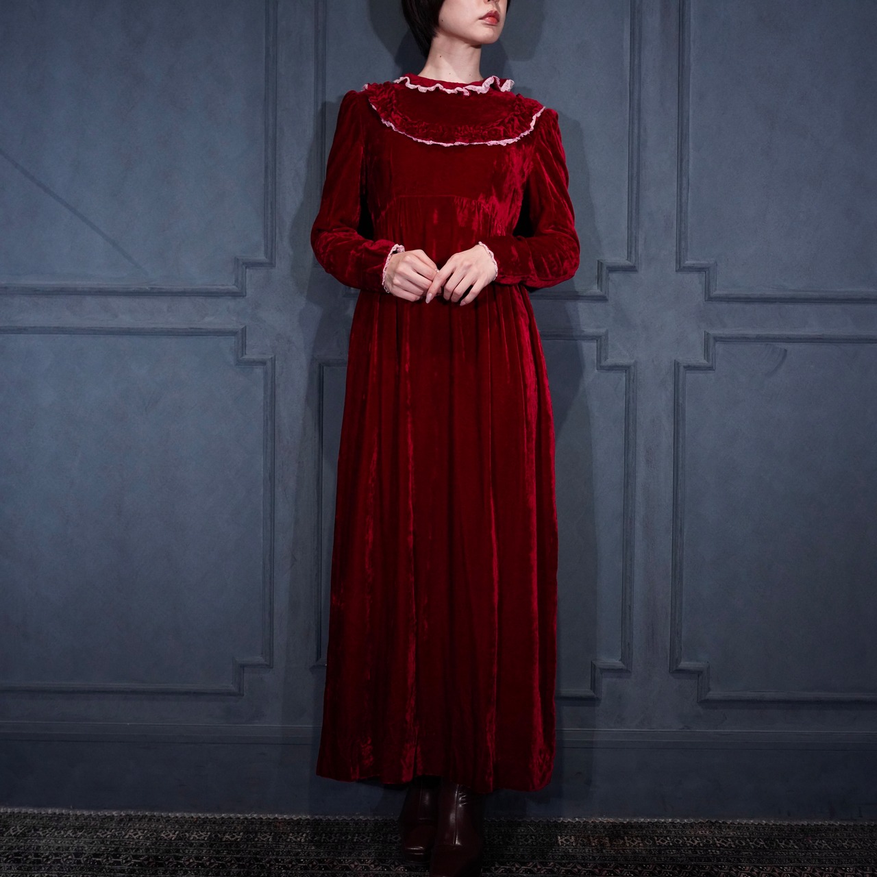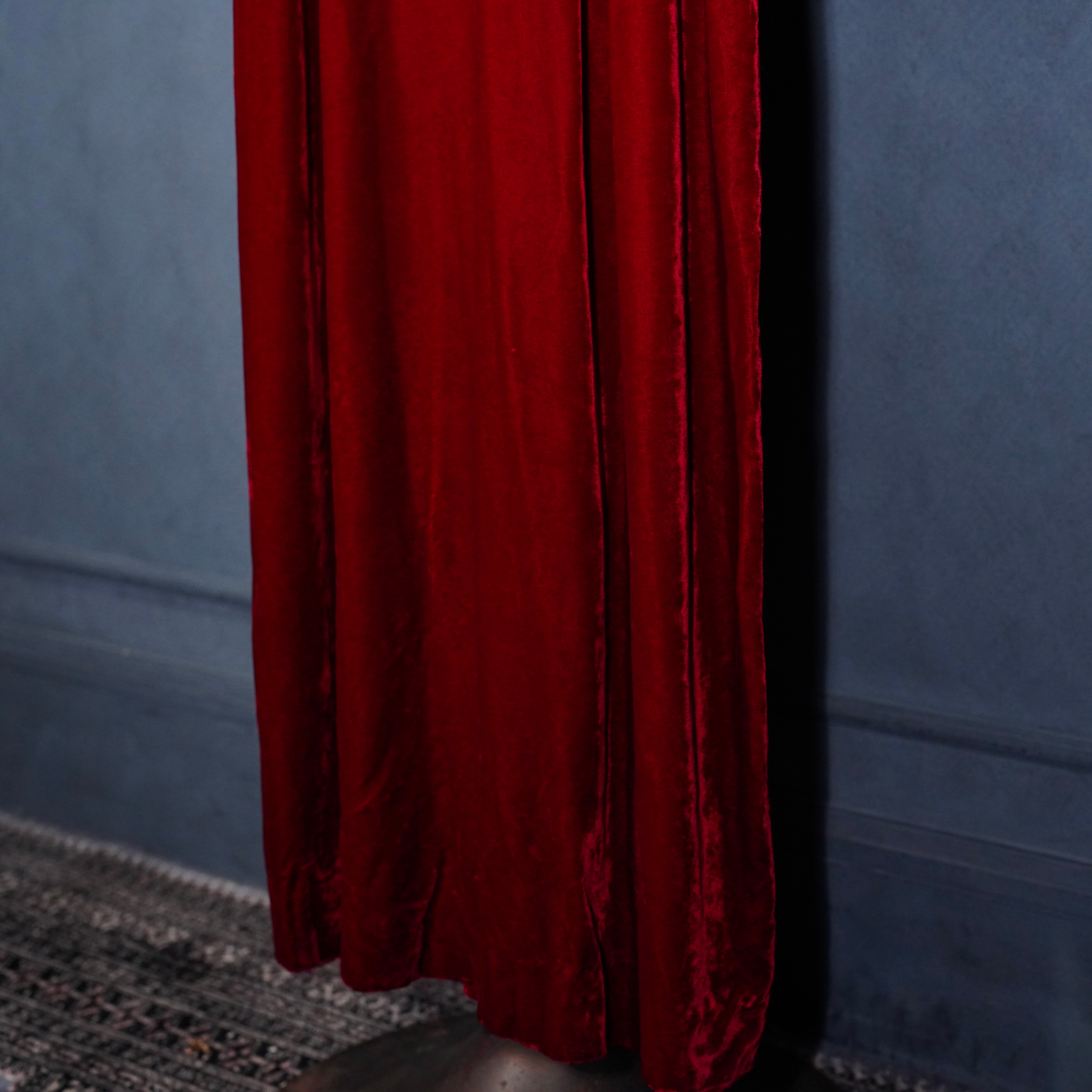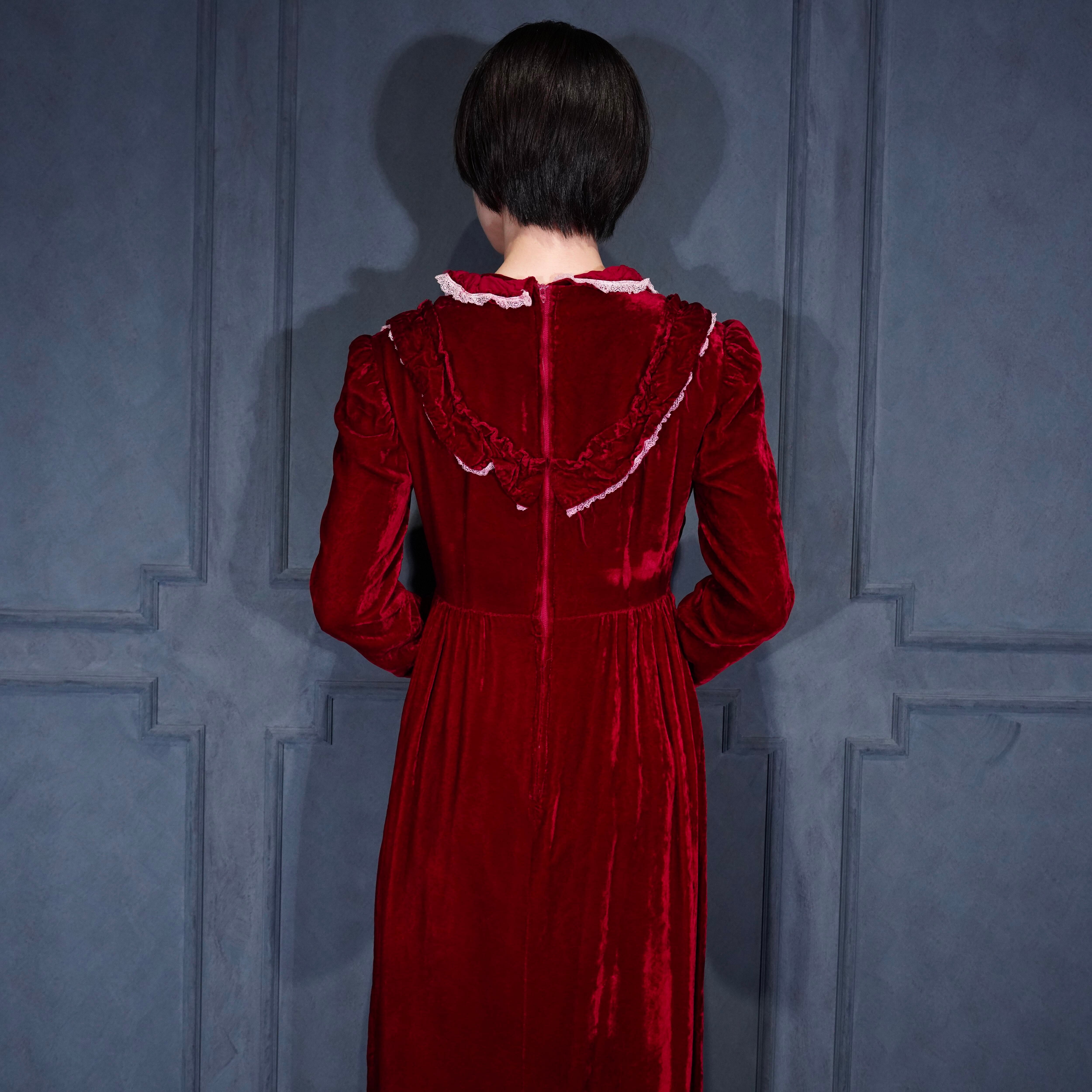 70’s USA VINTAGE RED COLOR LACE FRILL DESIGN VELOUR DRESS ONE PIECE/70年代アメリカ古着レッドカラーレースフリルデザインベロアドレスワンピース