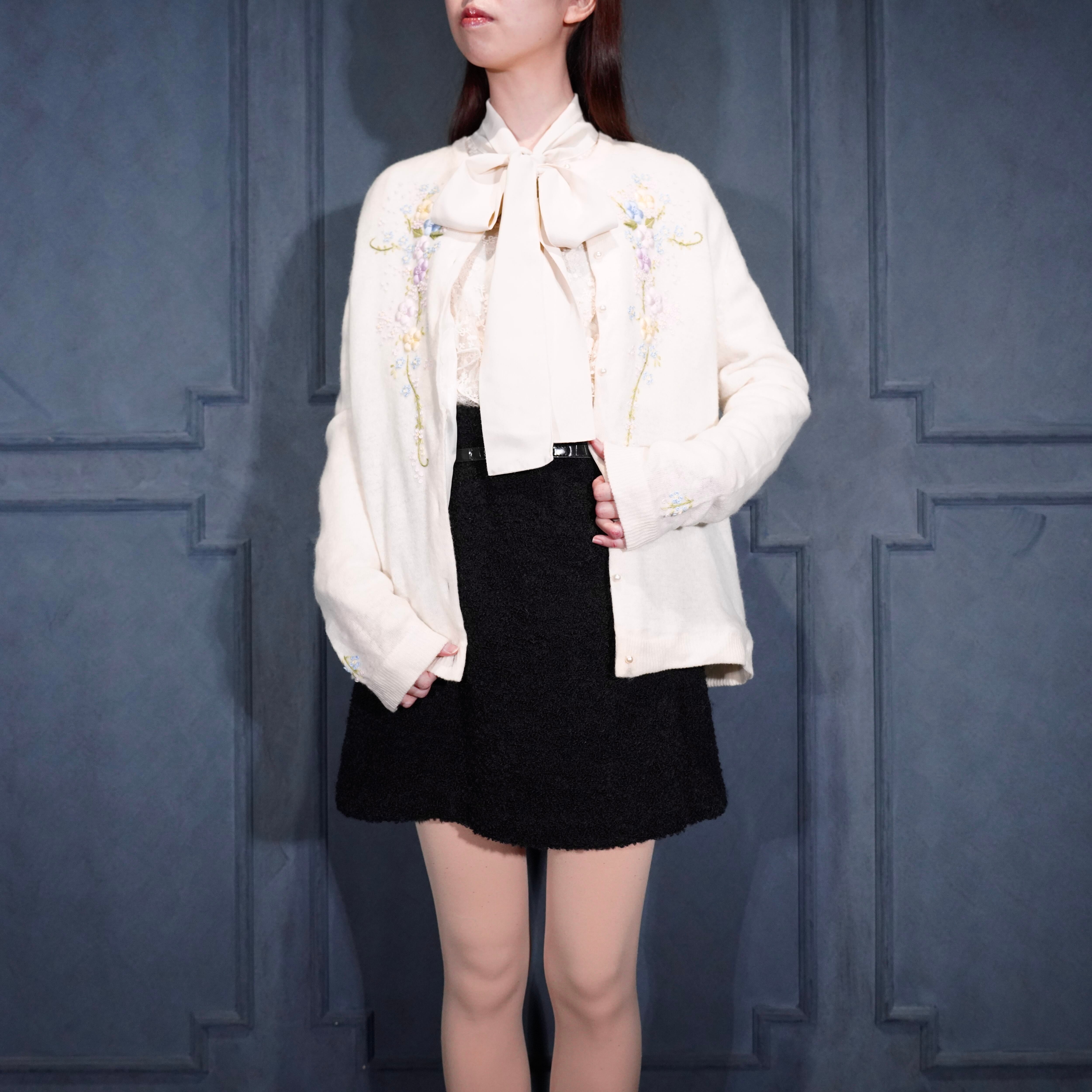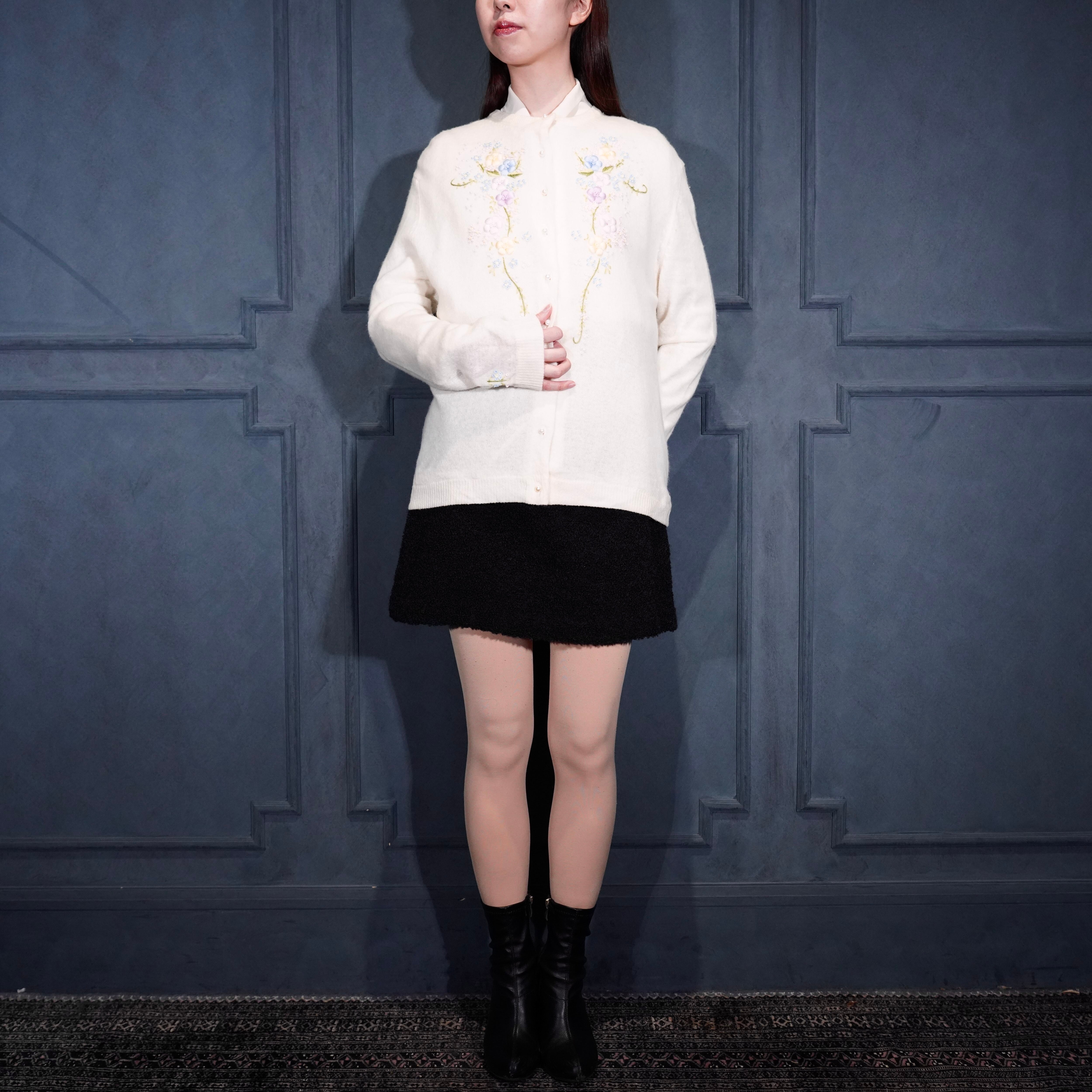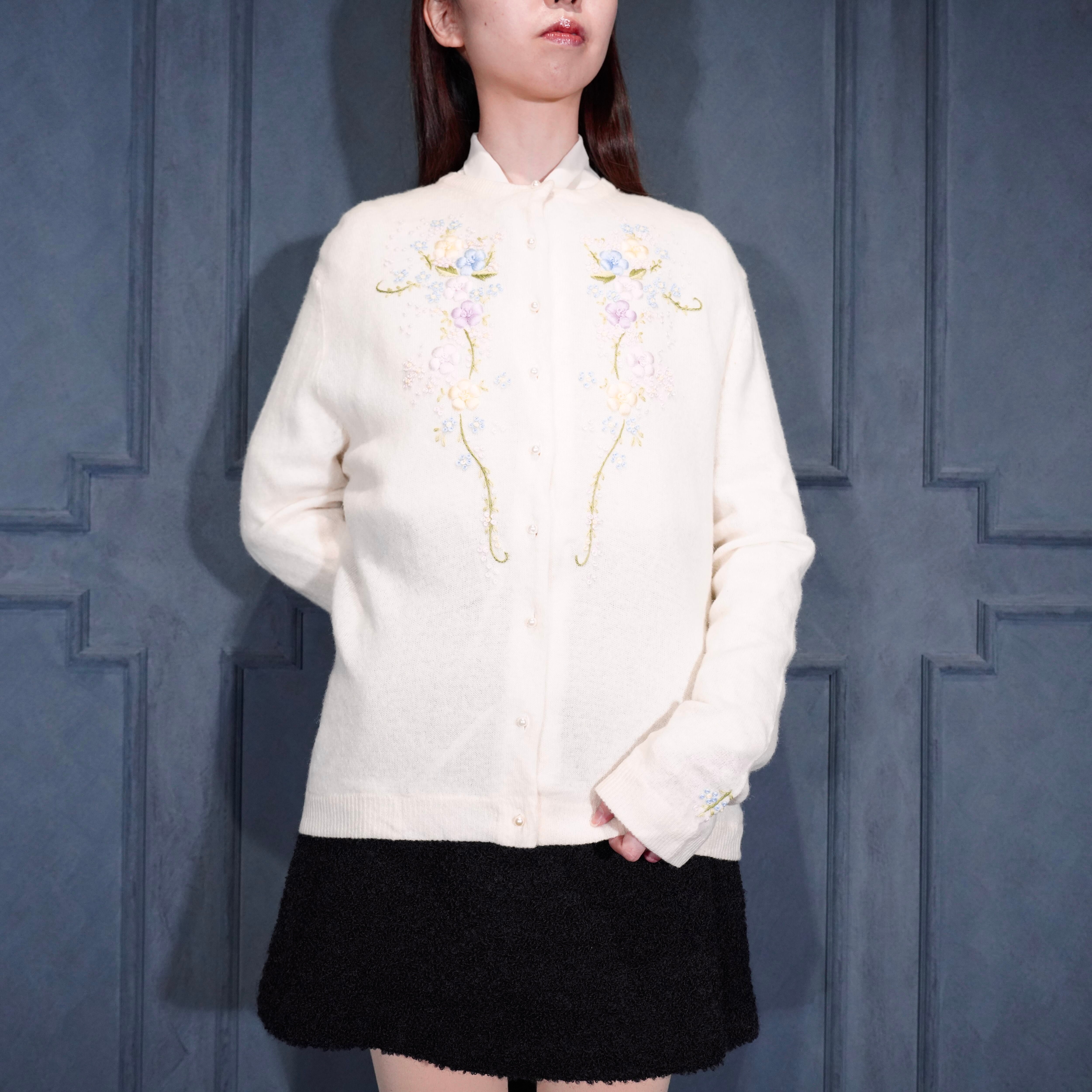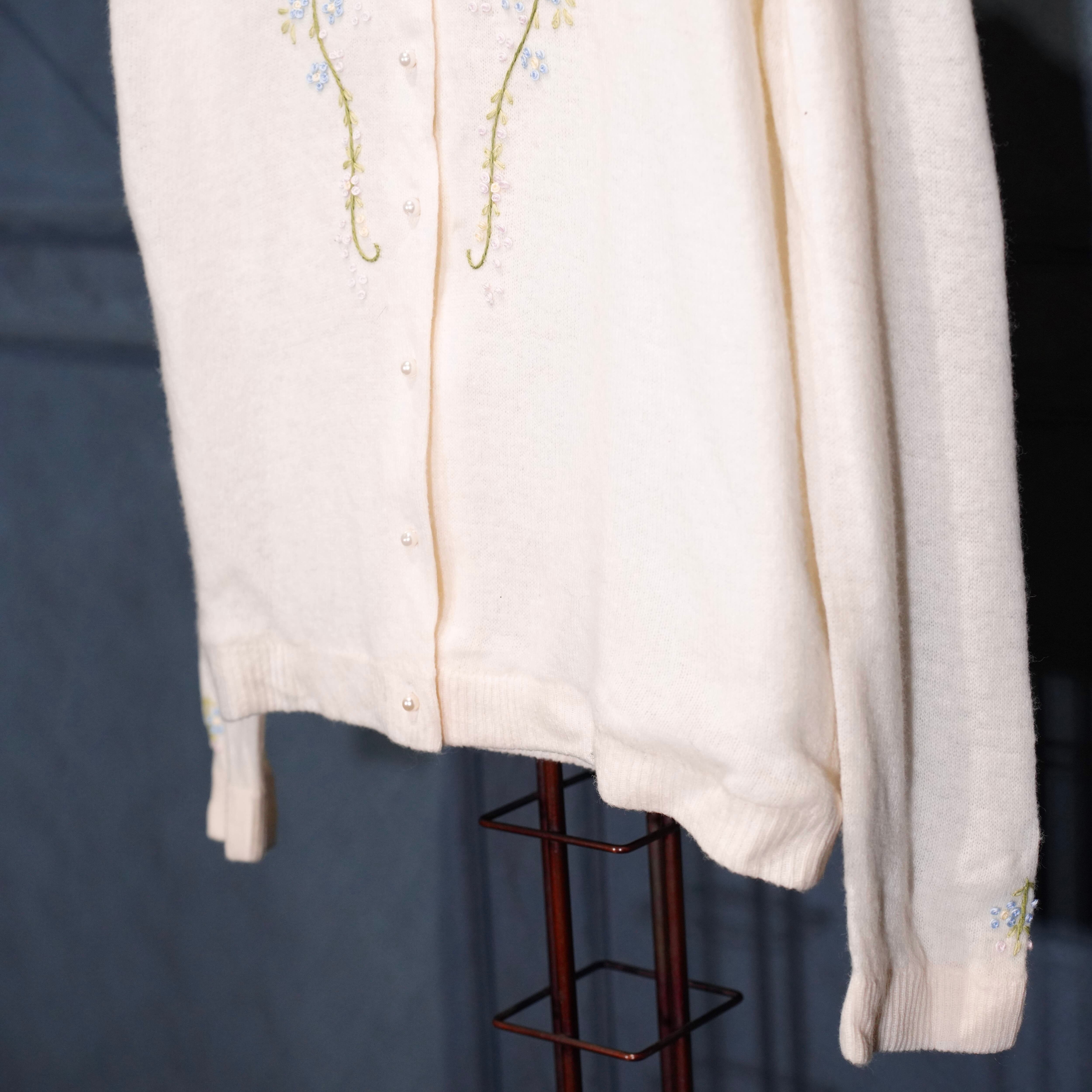 60’s〜70’s USA VINTAGE FLOWER EMBROIDERY PEARL BUTTON DESIGN WOOL KNIT CARDIGAN/60年代〜70年代アメリカ古着お花刺繍パールボタンデザインウールニットカーディガン