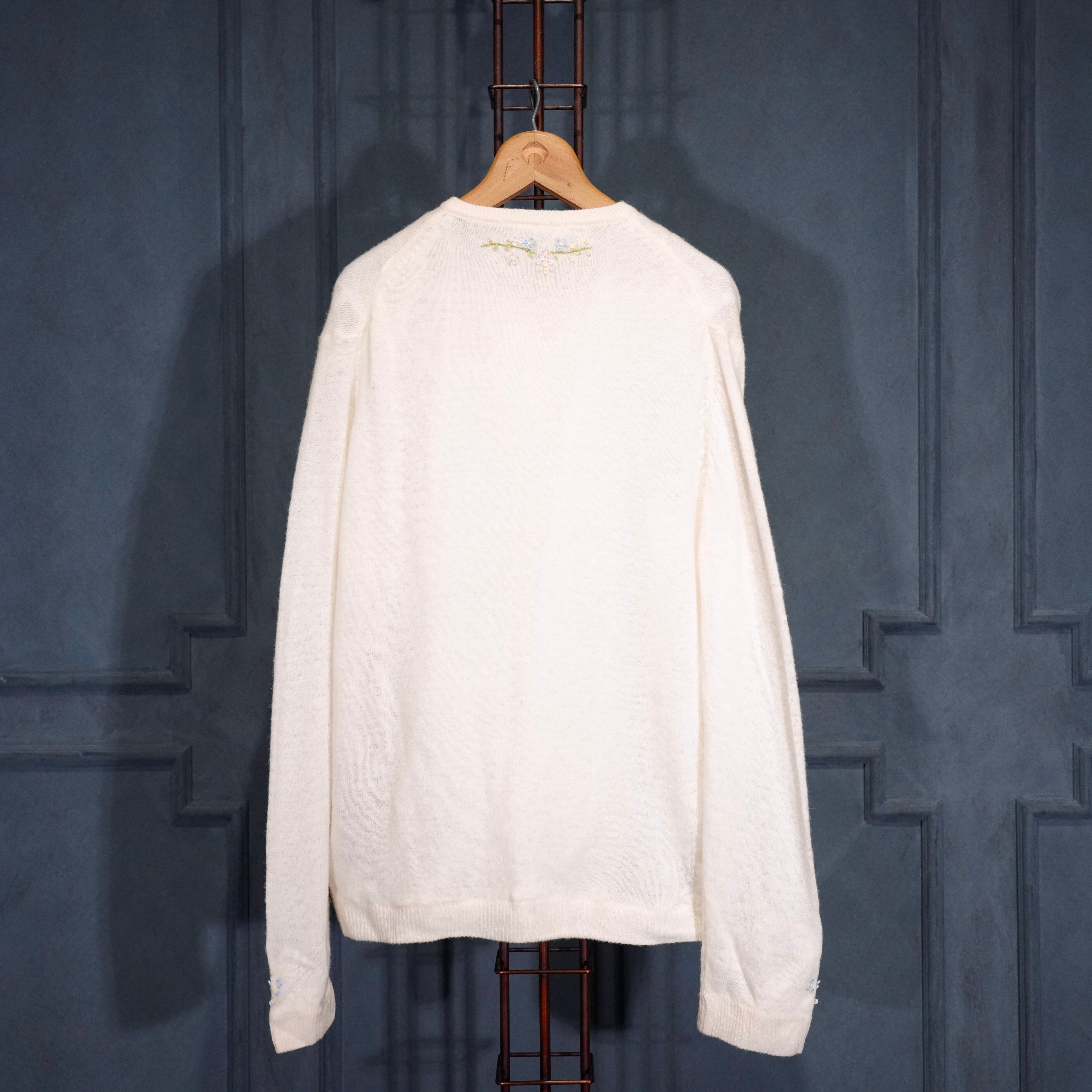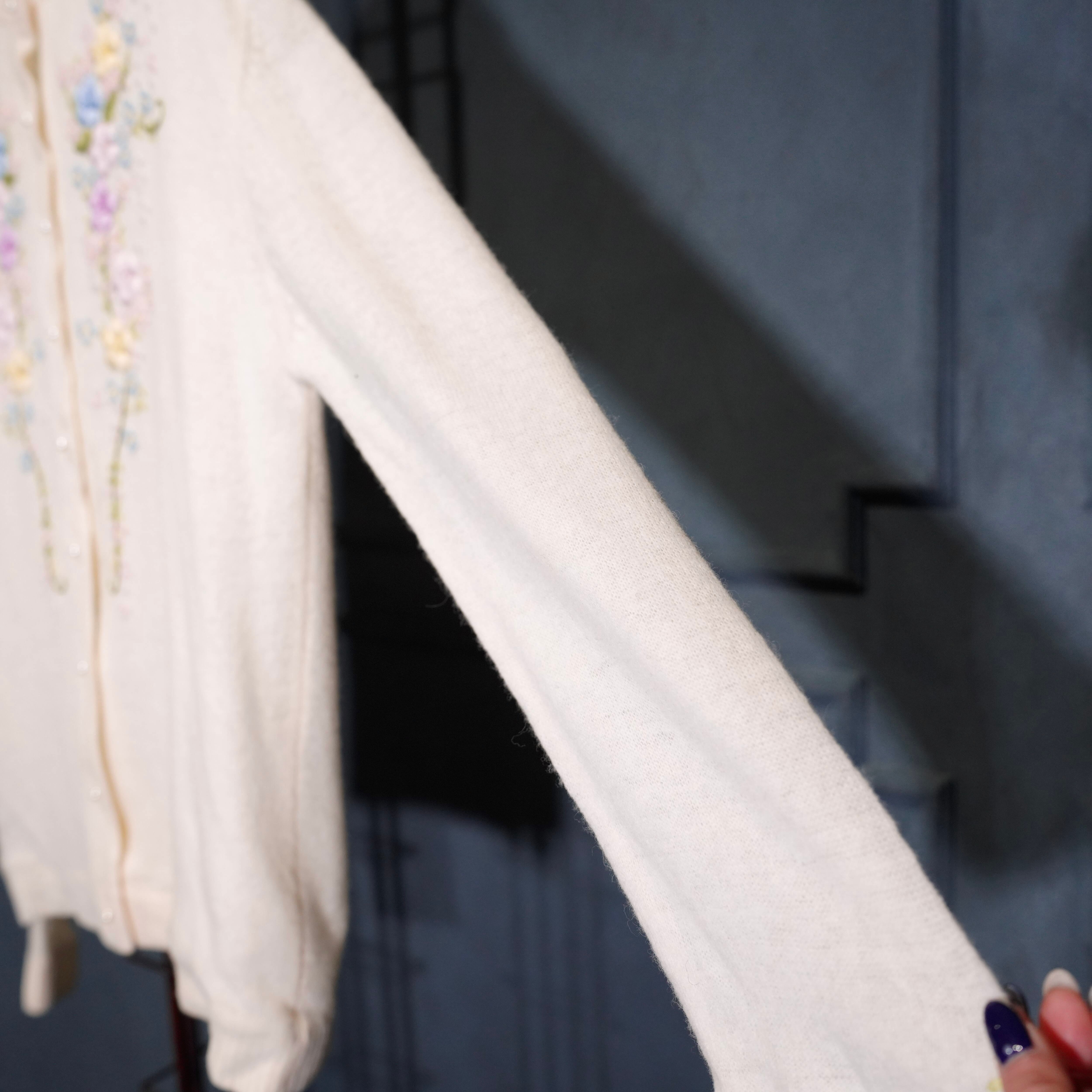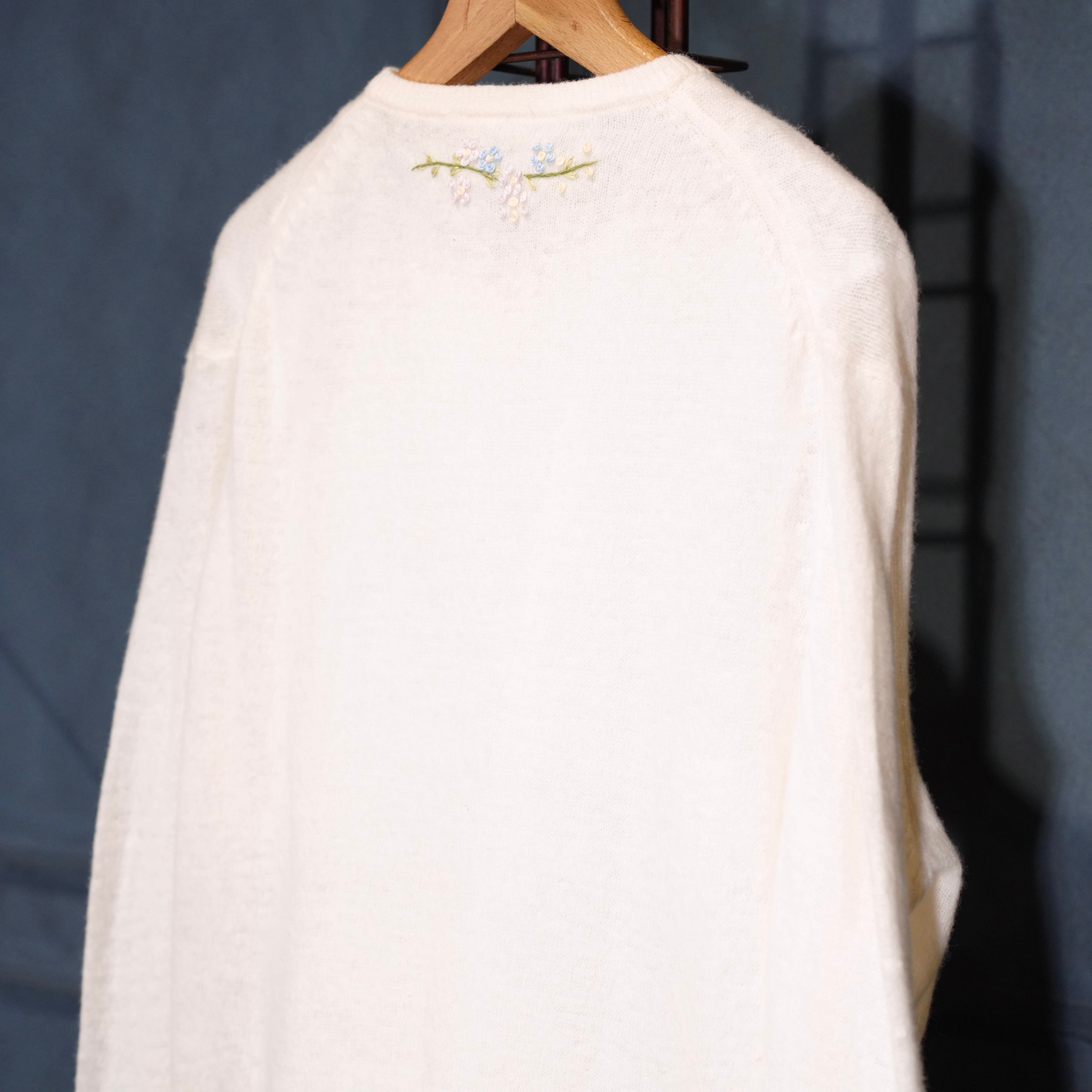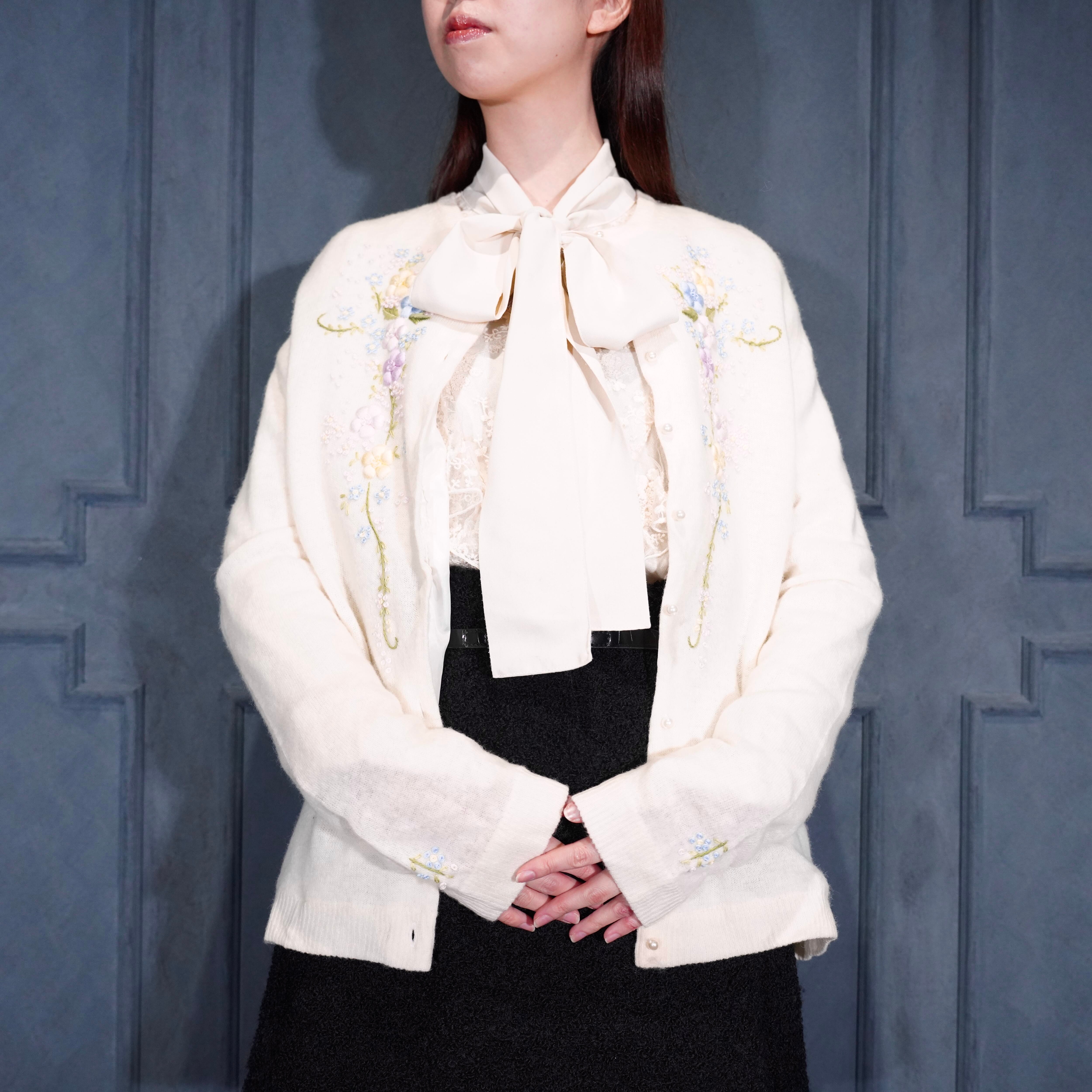 60’s〜70’s USA VINTAGE FLOWER EMBROIDERY PEARL BUTTON DESIGN WOOL KNIT CARDIGAN/60年代〜70年代アメリカ古着お花刺繍パールボタンデザインウールニットカーディガン