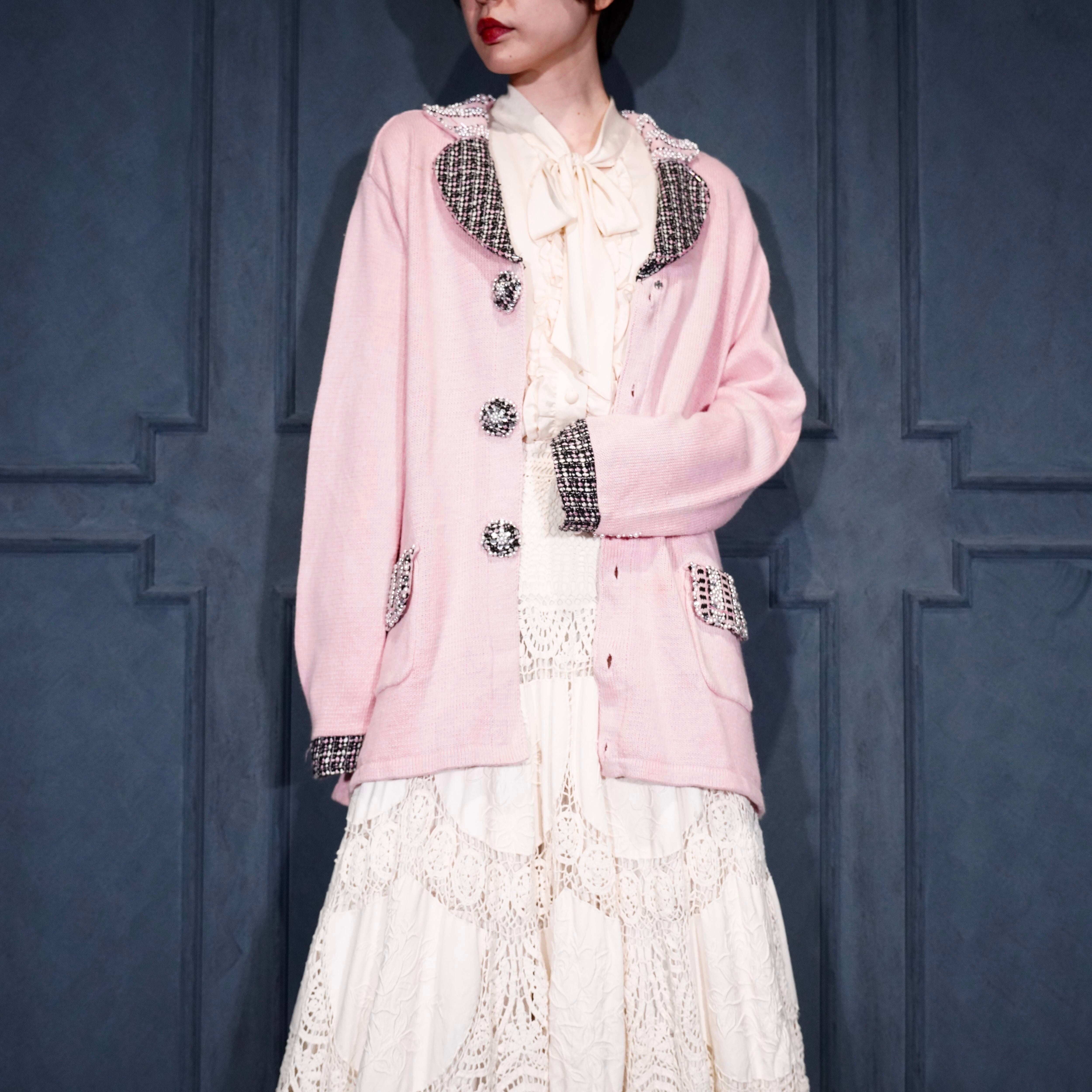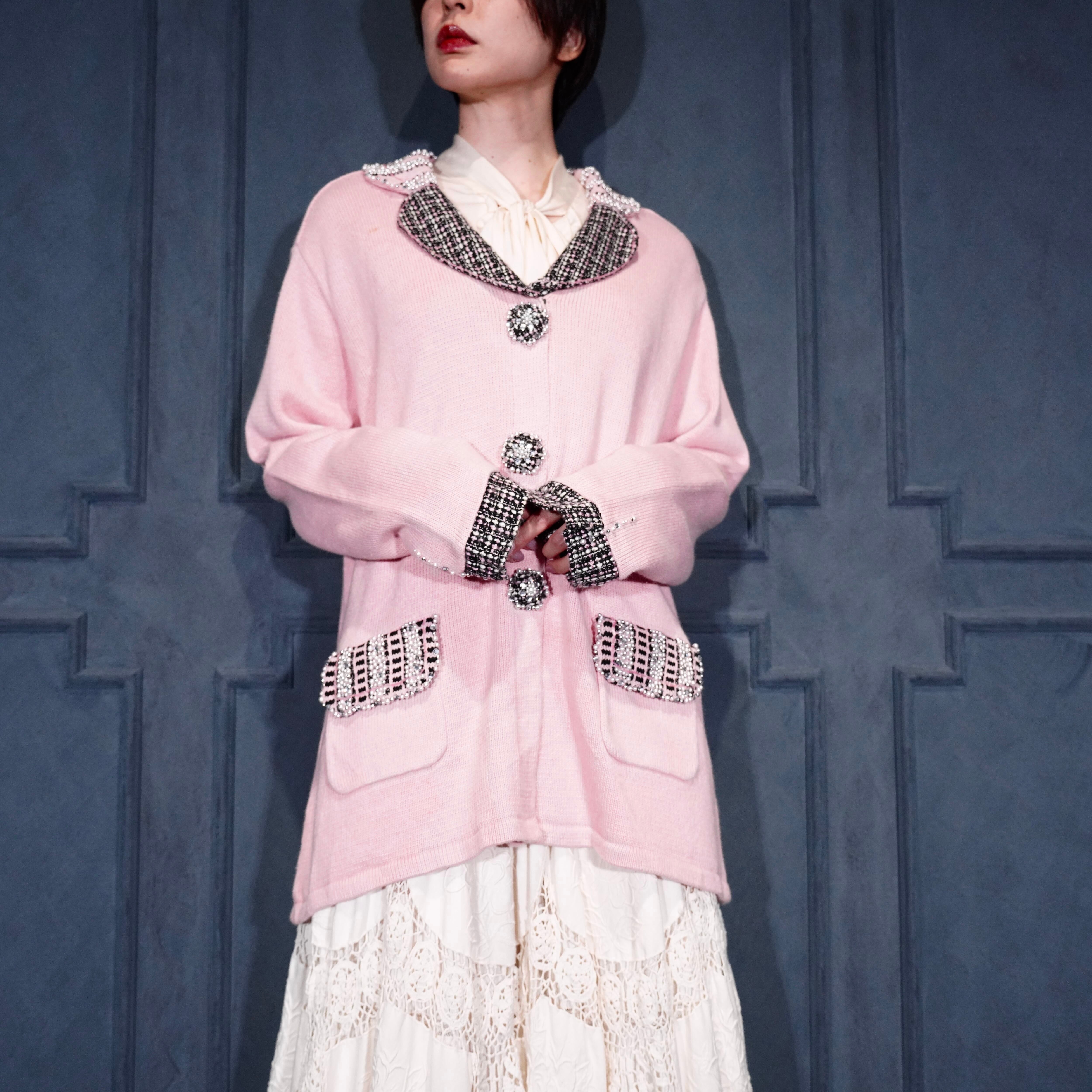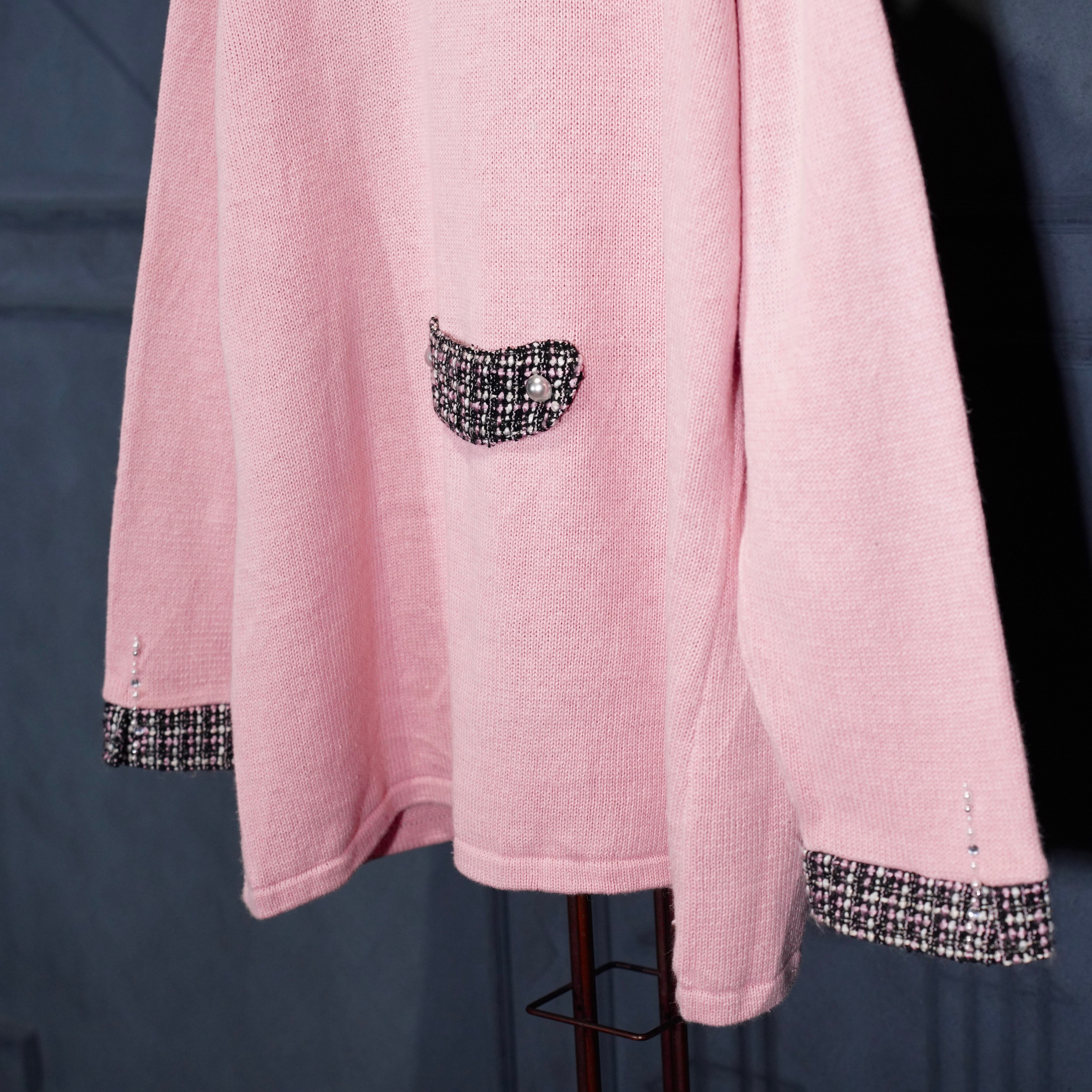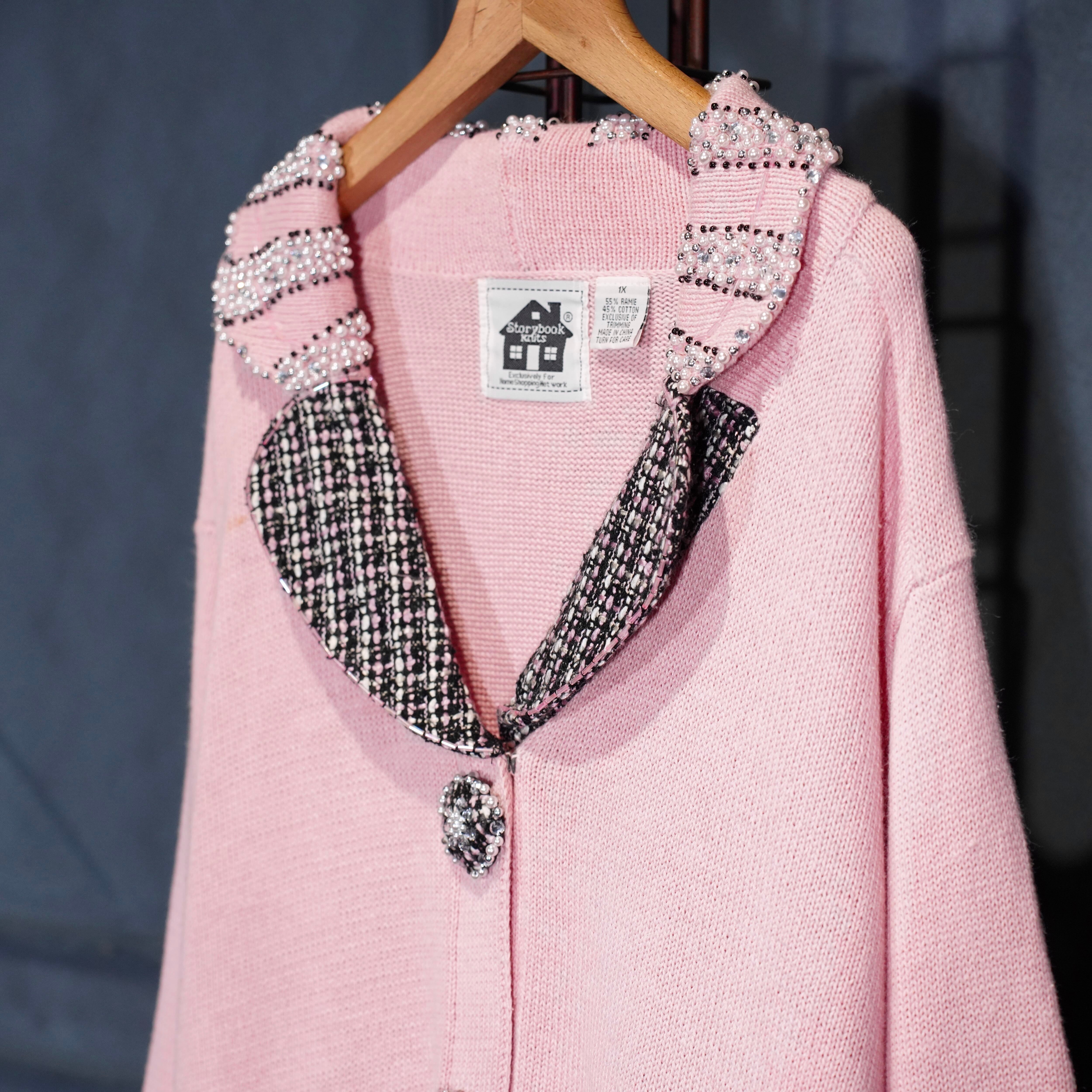 USA VINTAGE Storybook Knits TWEED COLLAR PEARL BEJOU DESIGN COTTON RAMIE KNIT JACKET/アメリカ古着ツイード襟パールビジューデザインコットンラミーニットジャケット(カーディガン)