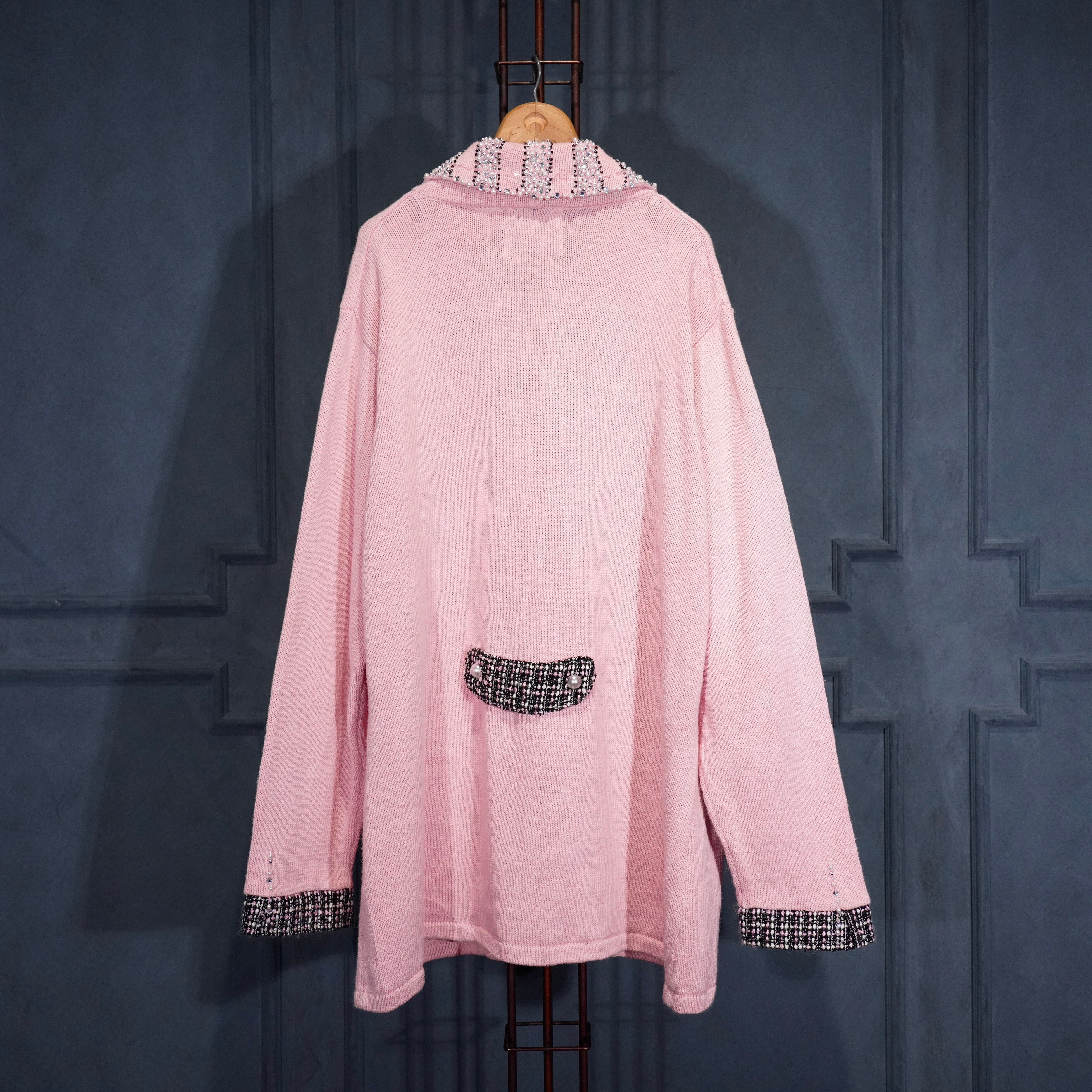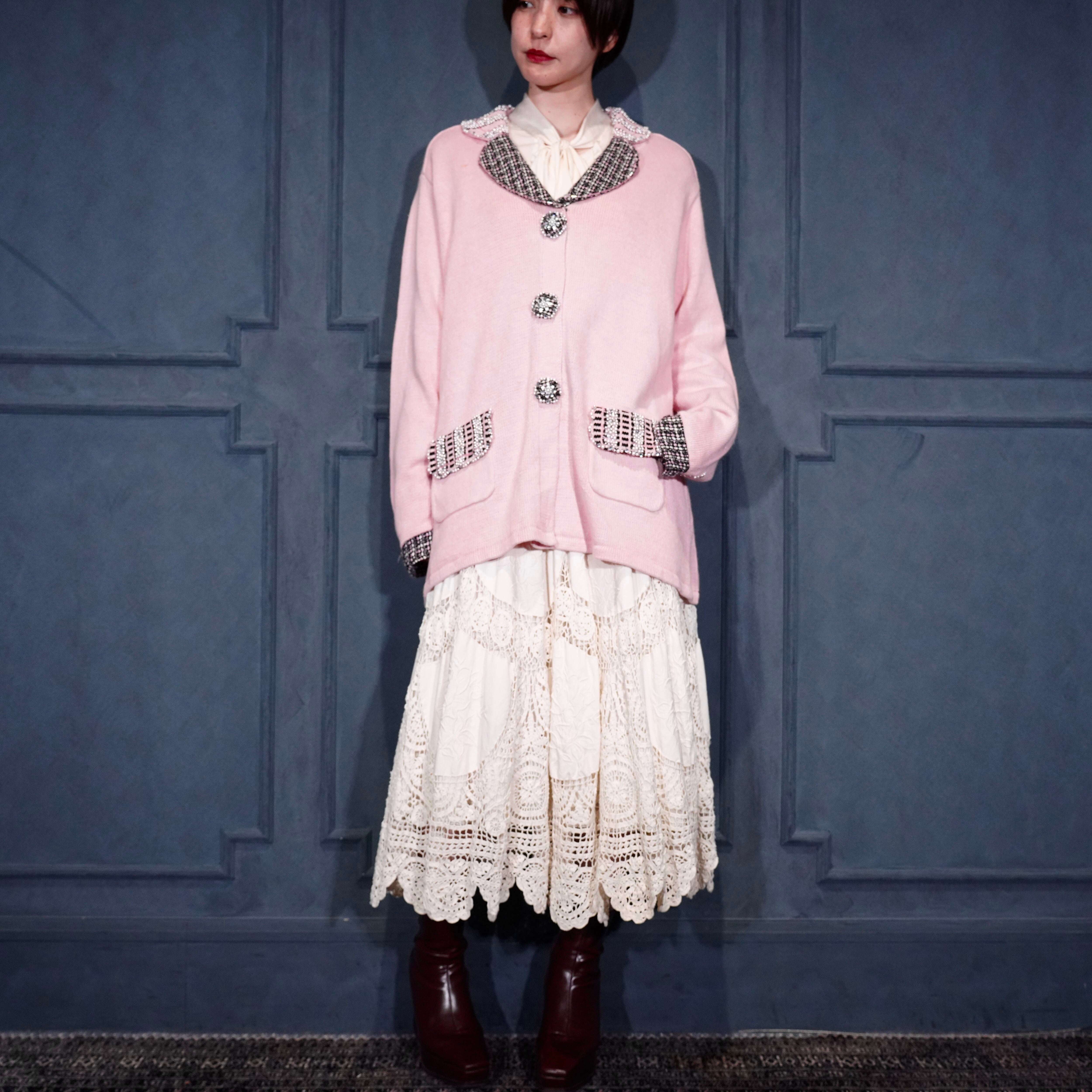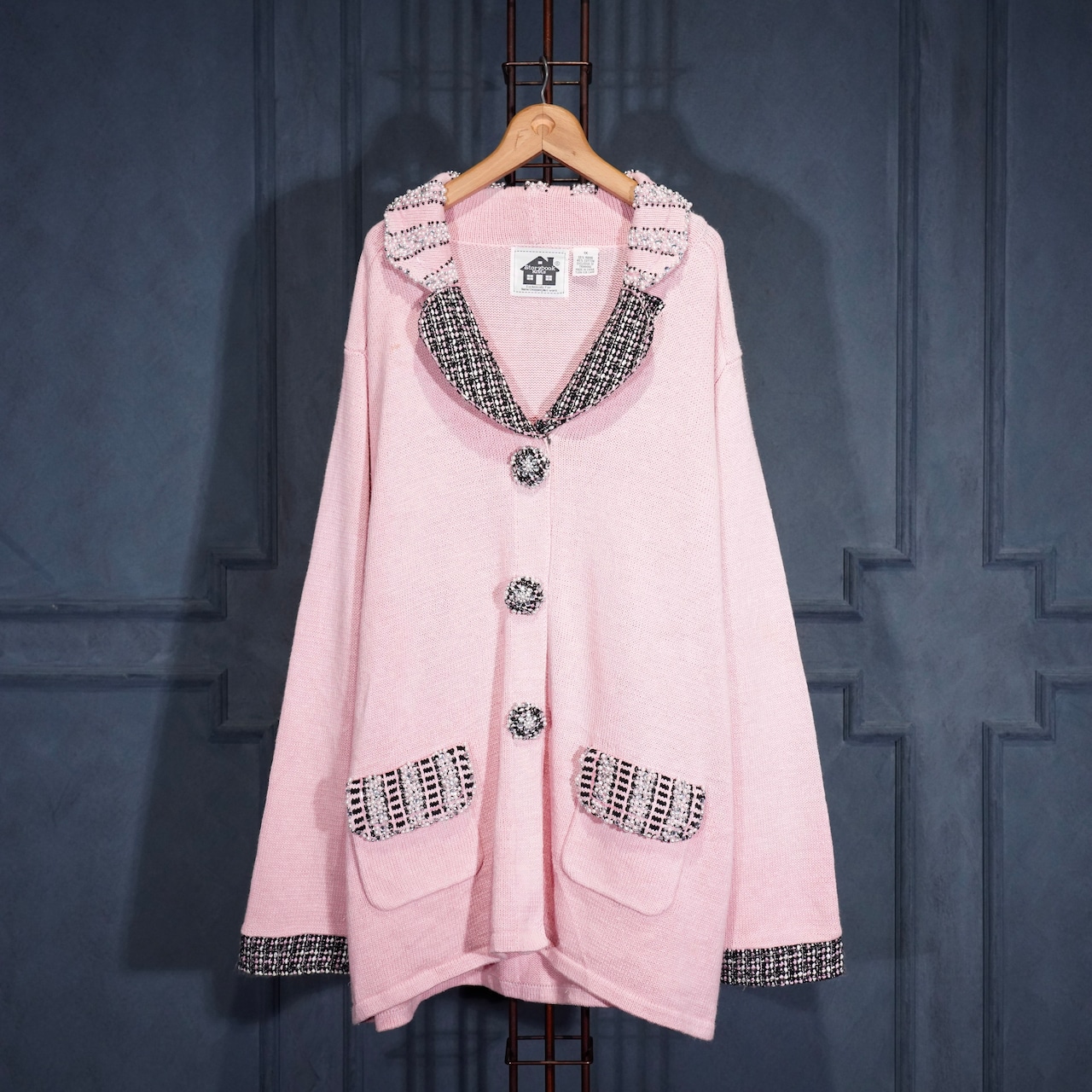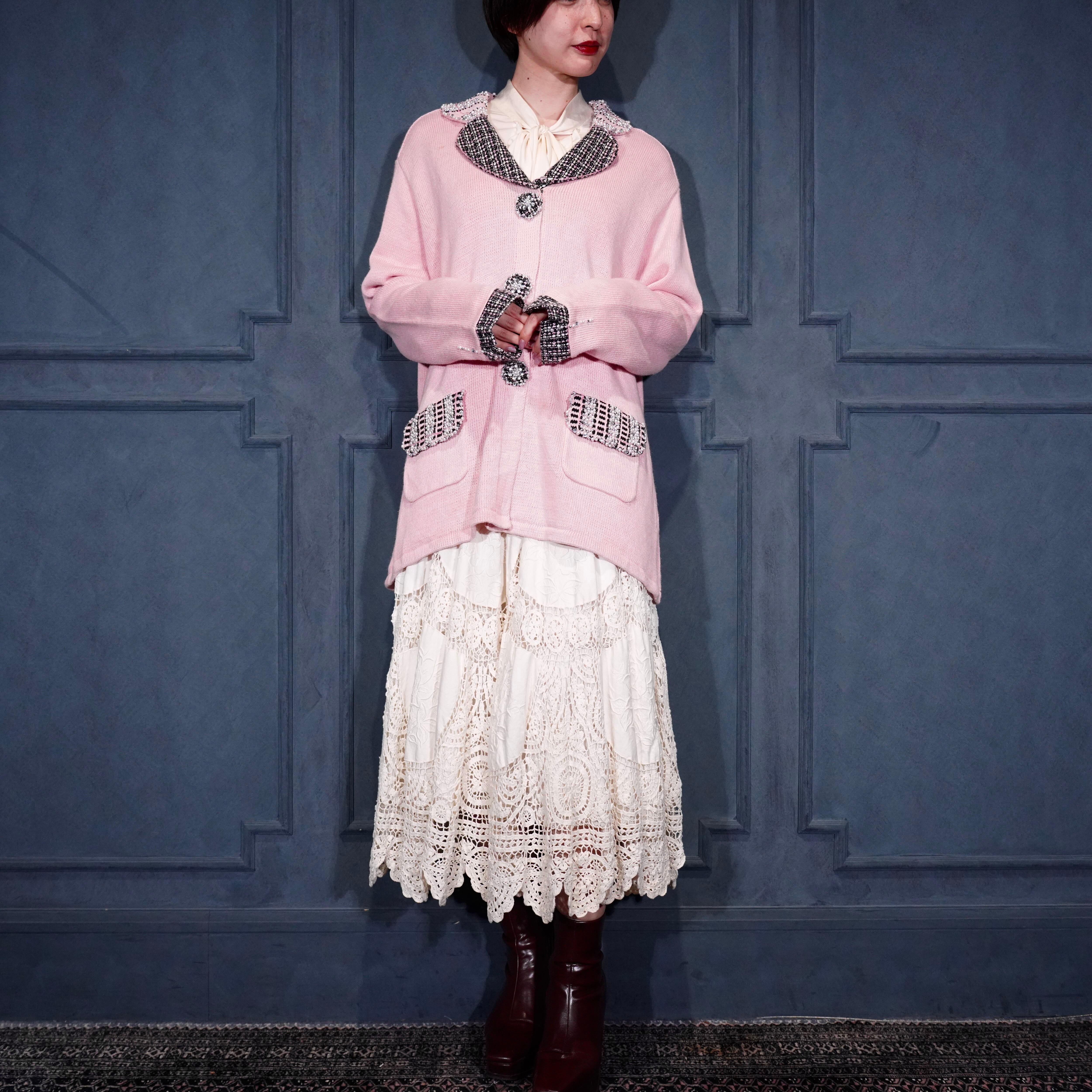 USA VINTAGE Storybook Knits TWEED COLLAR PEARL BEJOU DESIGN COTTON RAMIE KNIT JACKET/アメリカ古着ツイード襟パールビジューデザインコットンラミーニットジャケット(カーディガン)