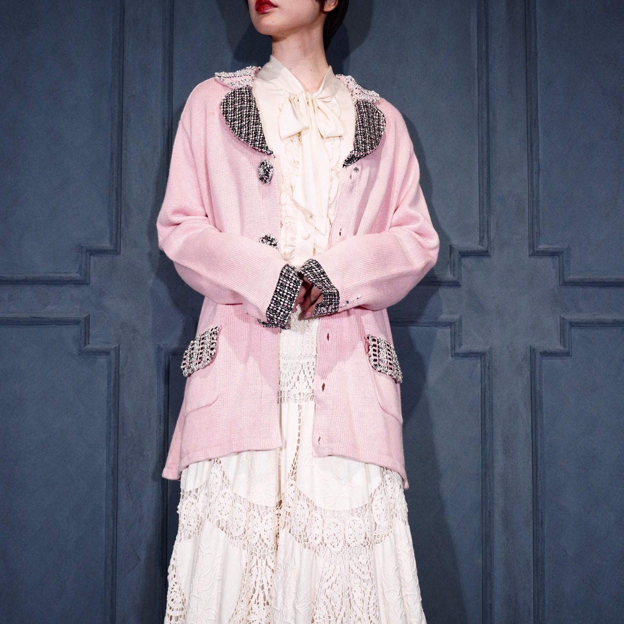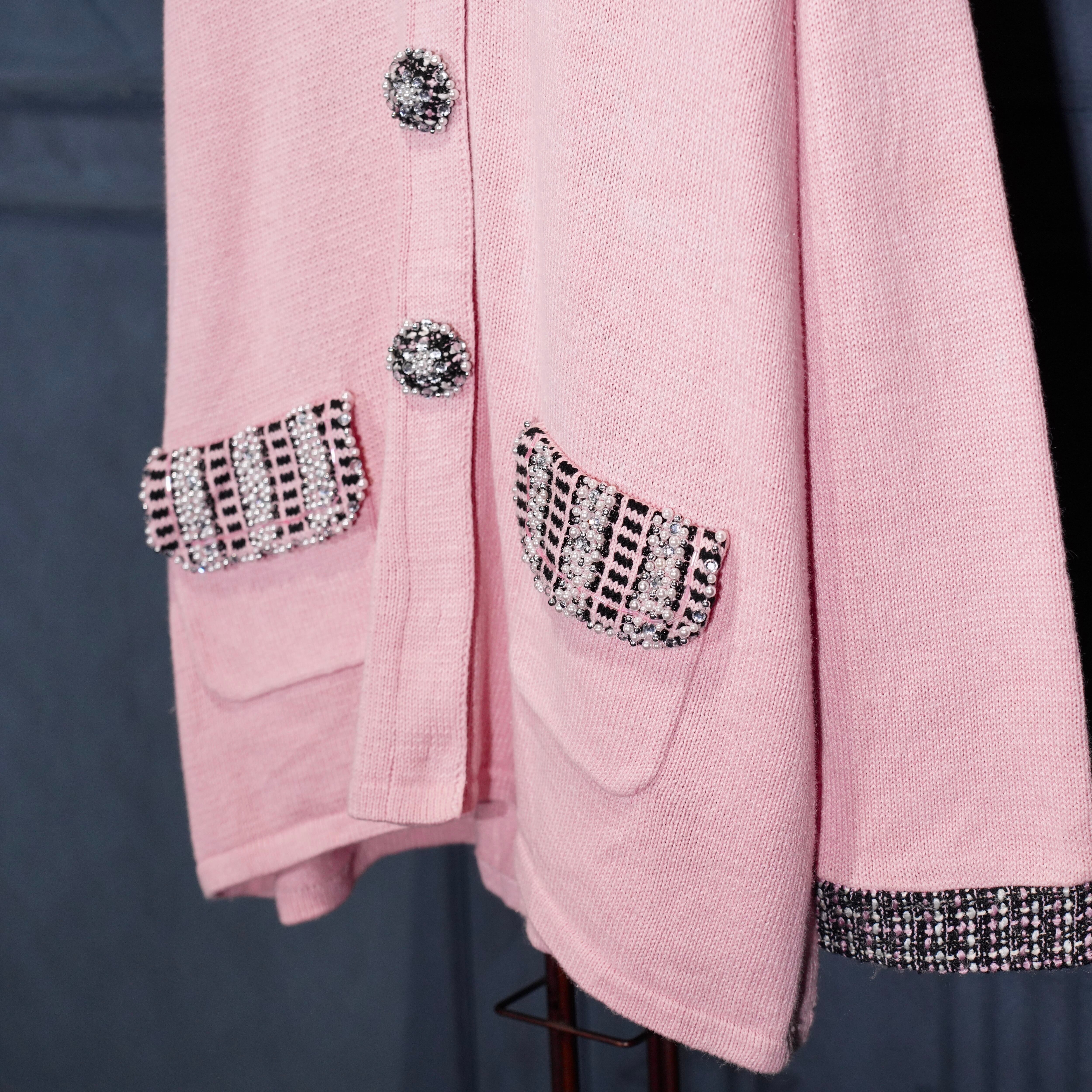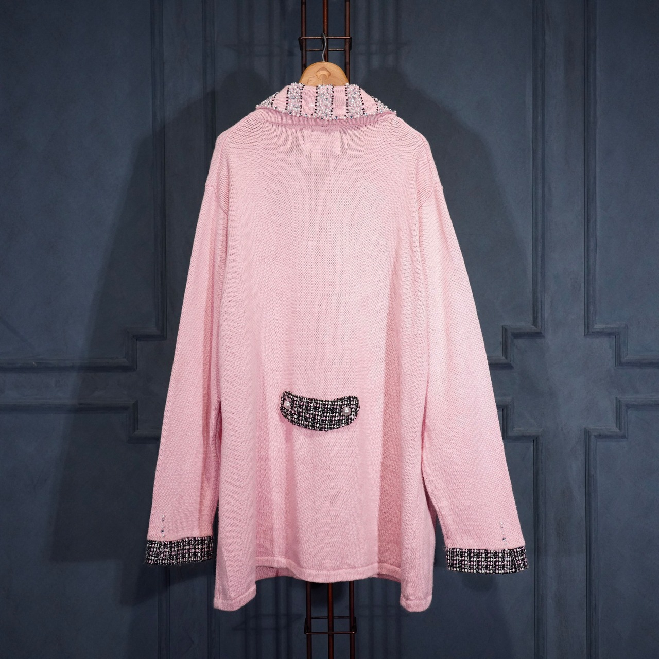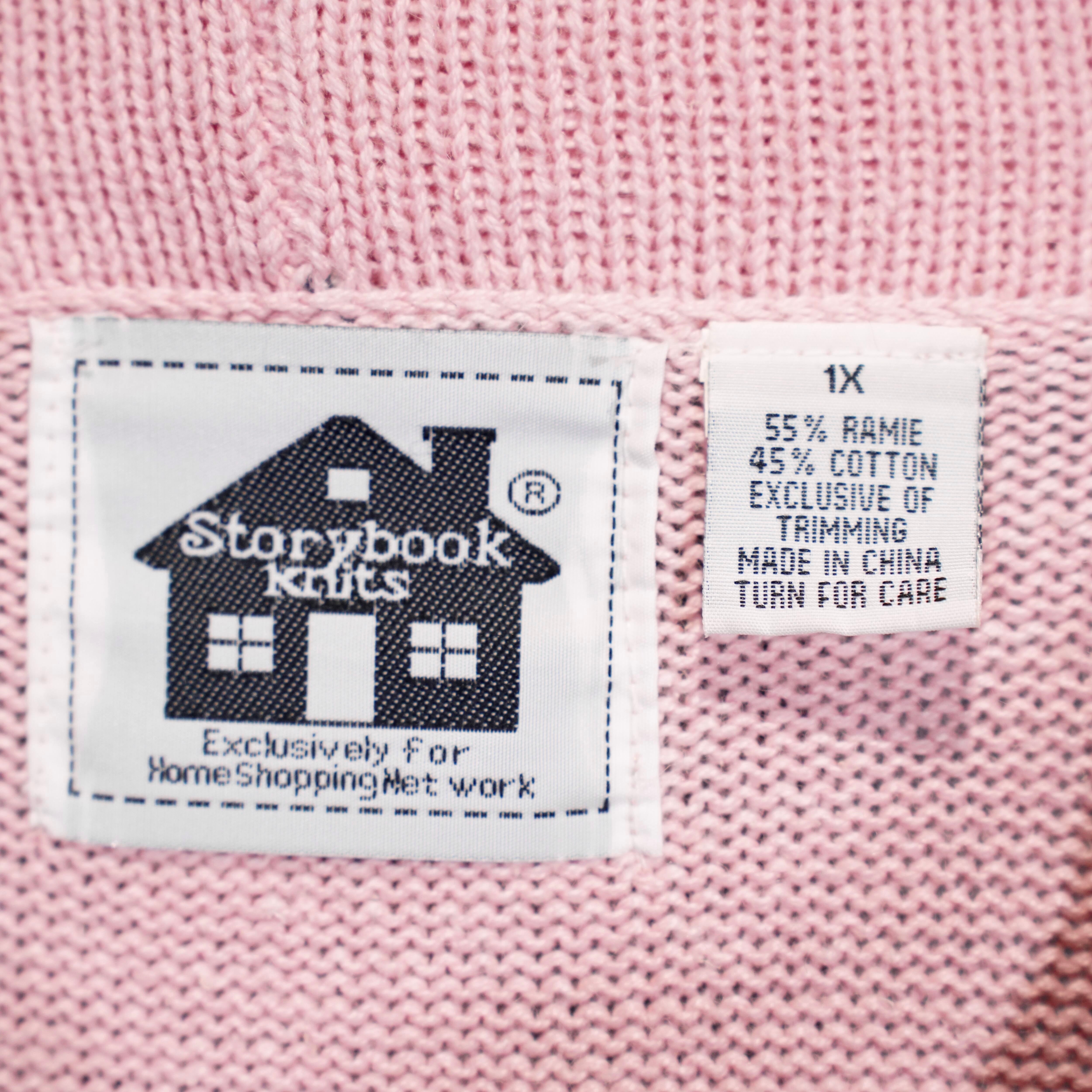 USA VINTAGE Storybook Knits TWEED COLLAR PEARL BEJOU DESIGN COTTON RAMIE KNIT JACKET/アメリカ古着ツイード襟パールビジューデザインコットンラミーニットジャケット(カーディガン)