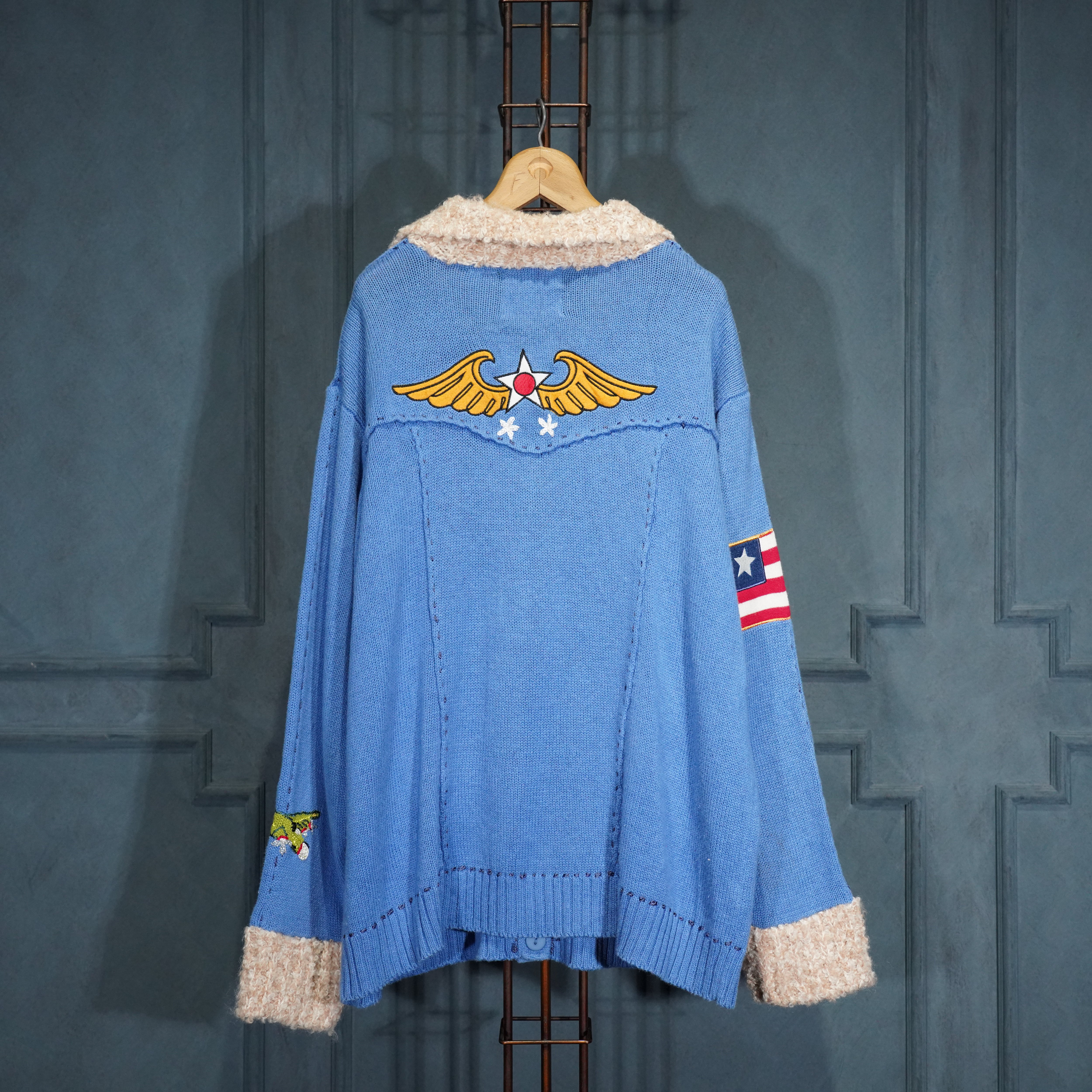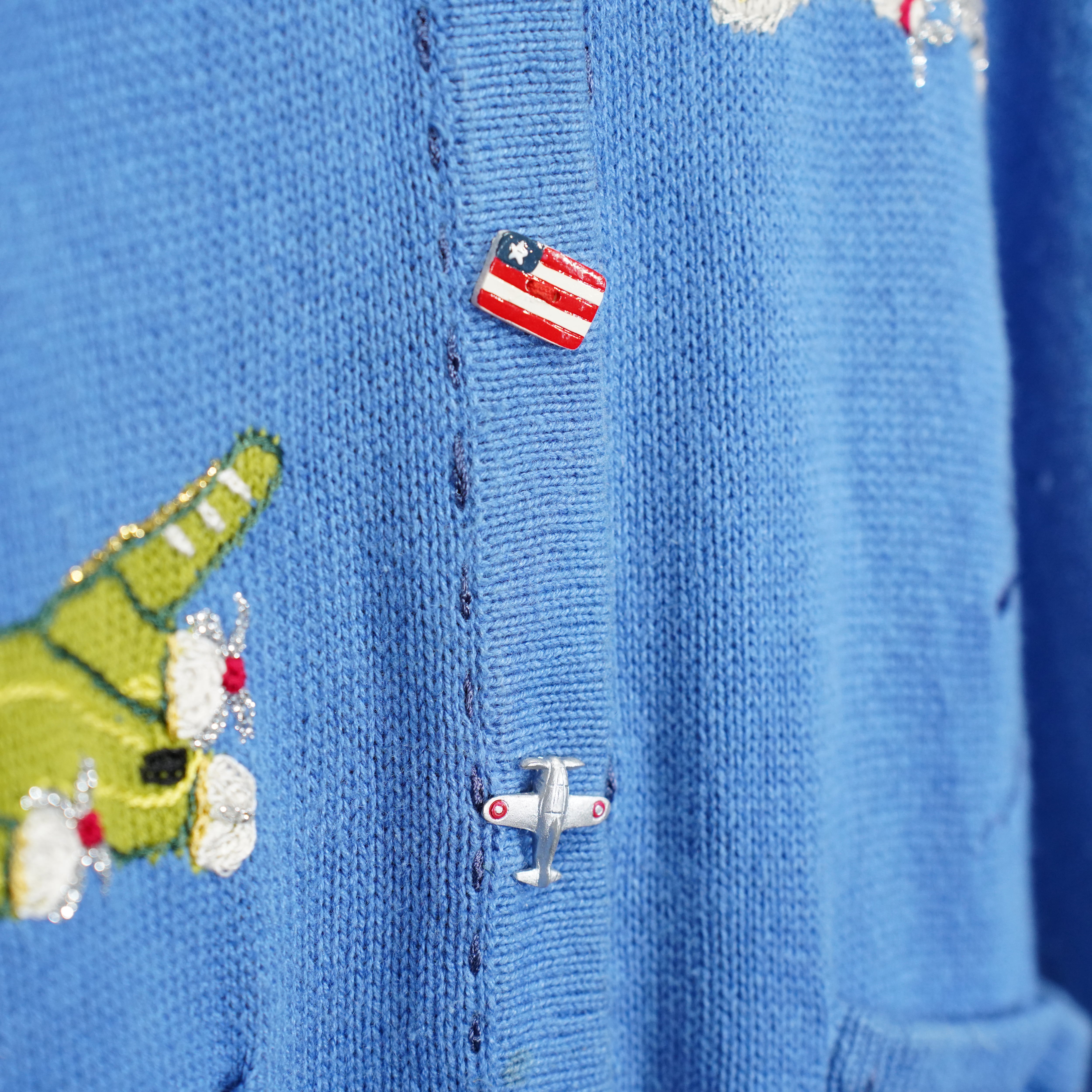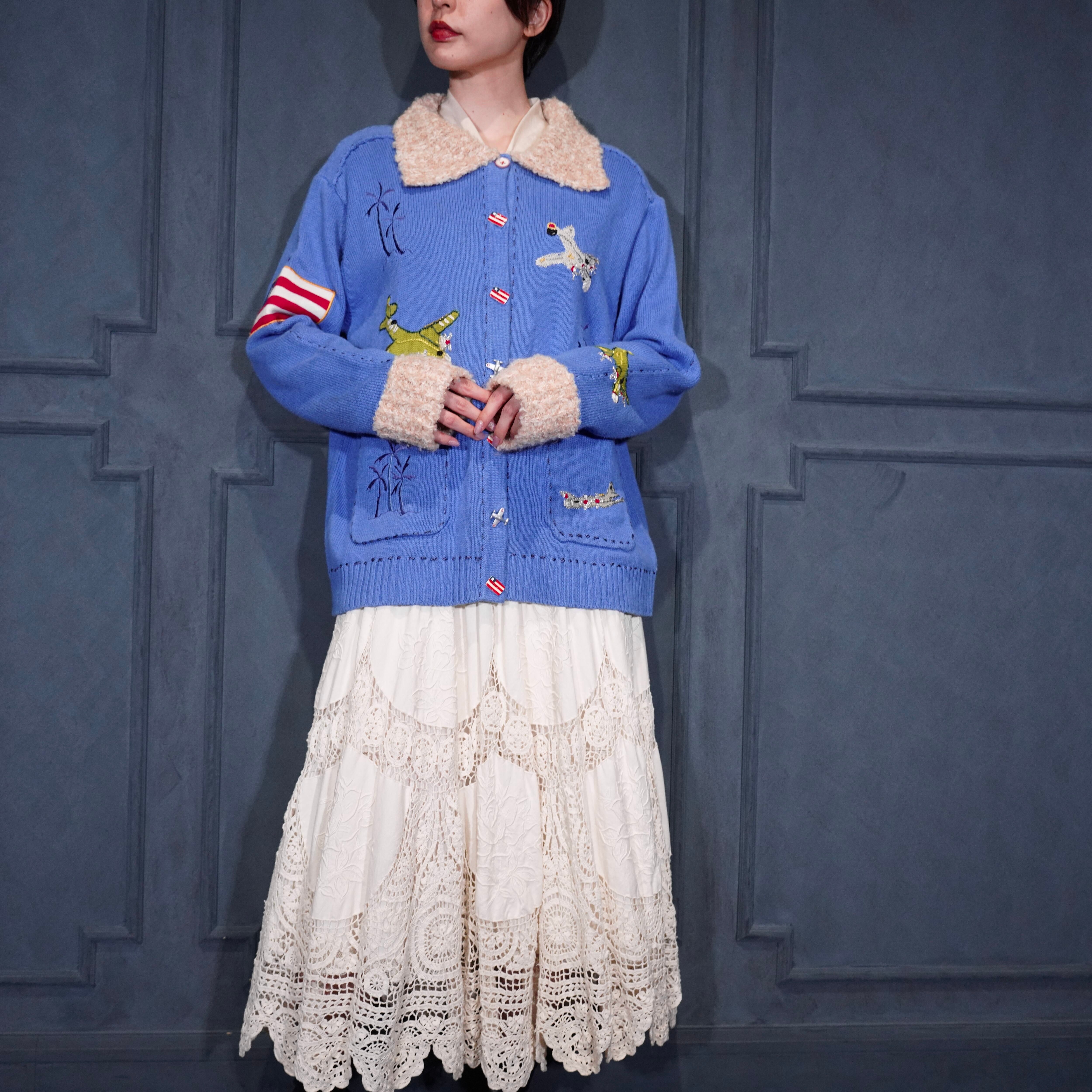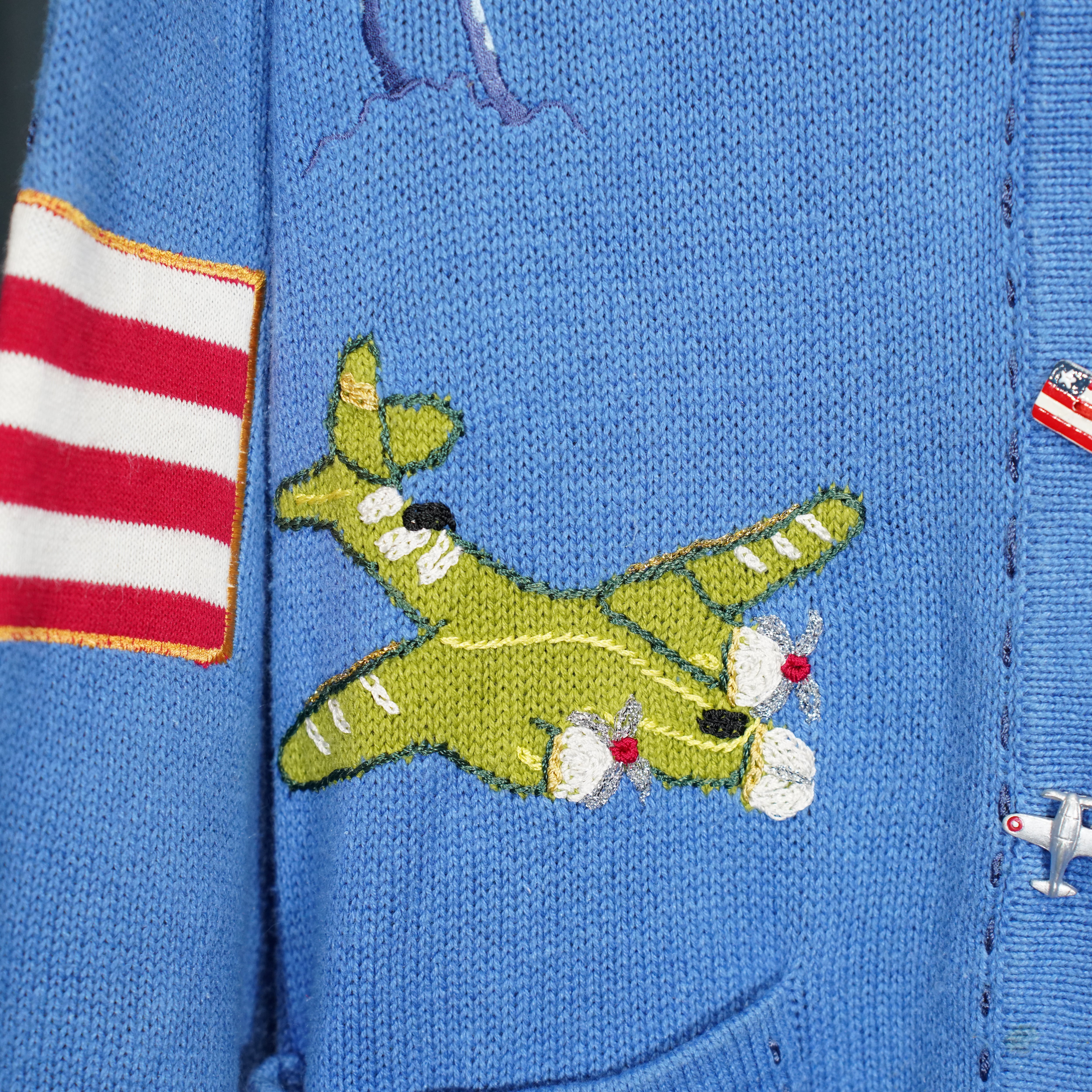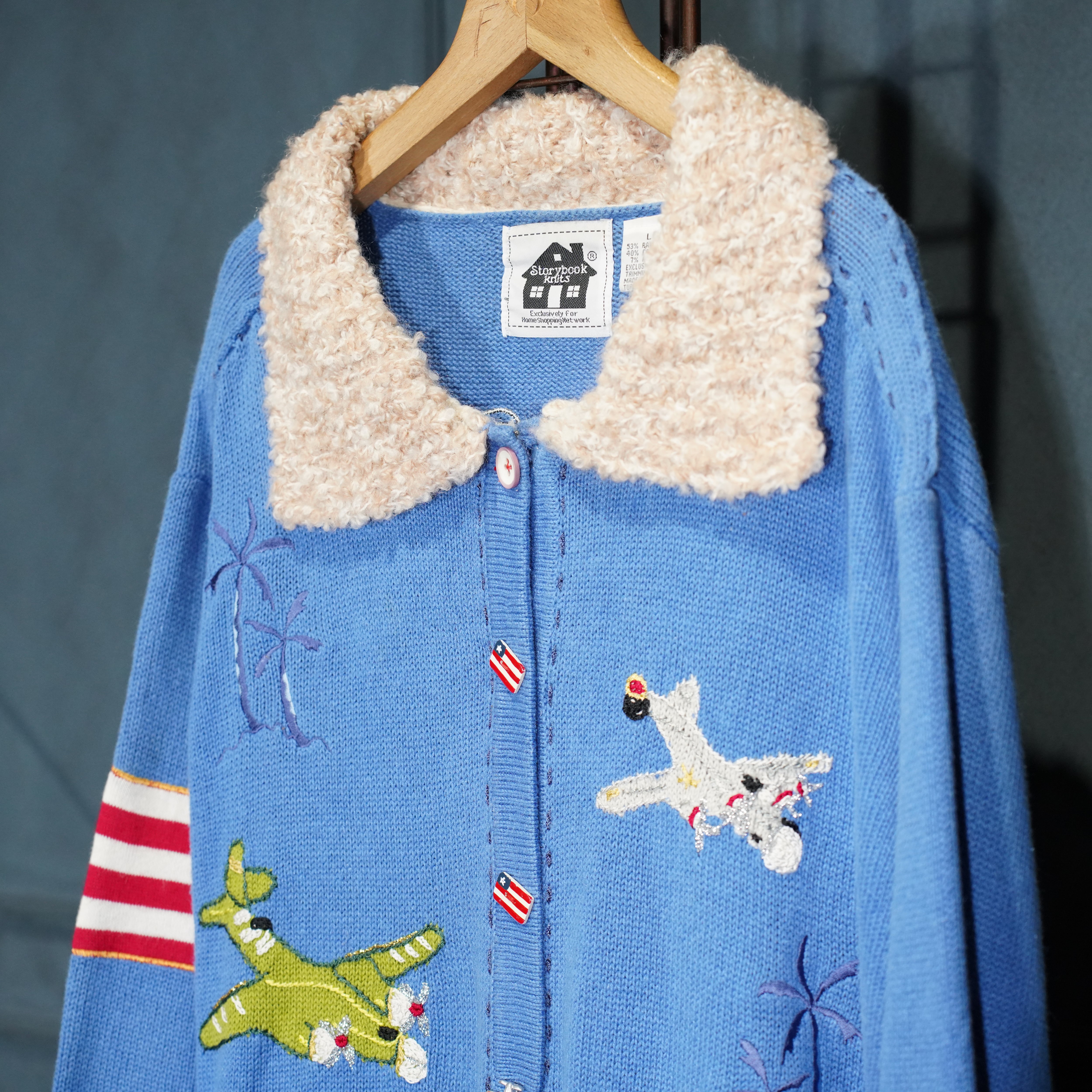 USA VINTAGE Storybook Knits WOOL COLLAR NATIONAL FLAG FIGHTER JET EMBROIDERY DESIGN COTTON RAMIE KNIT JACKET/アメリカ古着ウール襟国旗と戦闘機刺繍デザインコットンラミーニットジャケット(カーディガン)