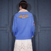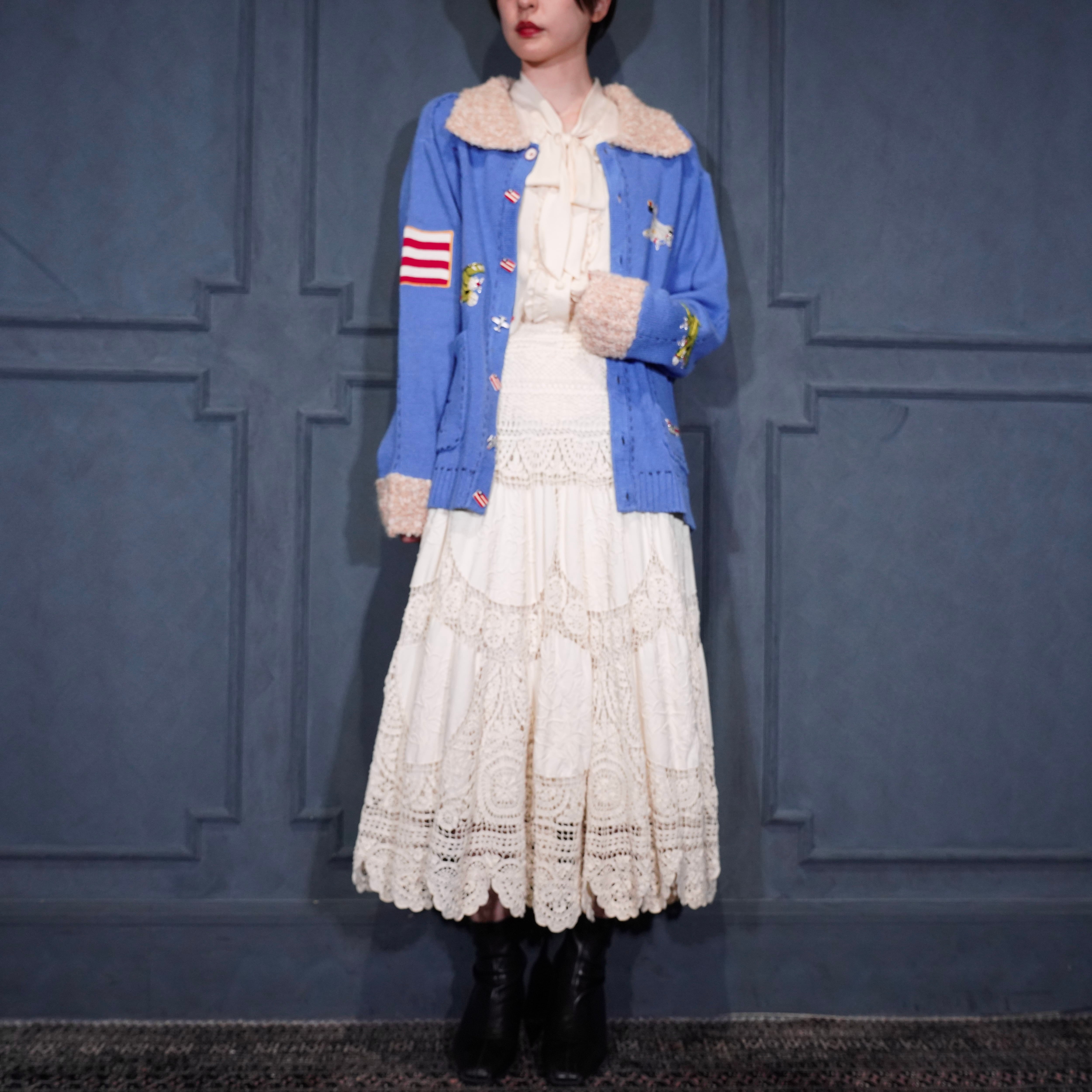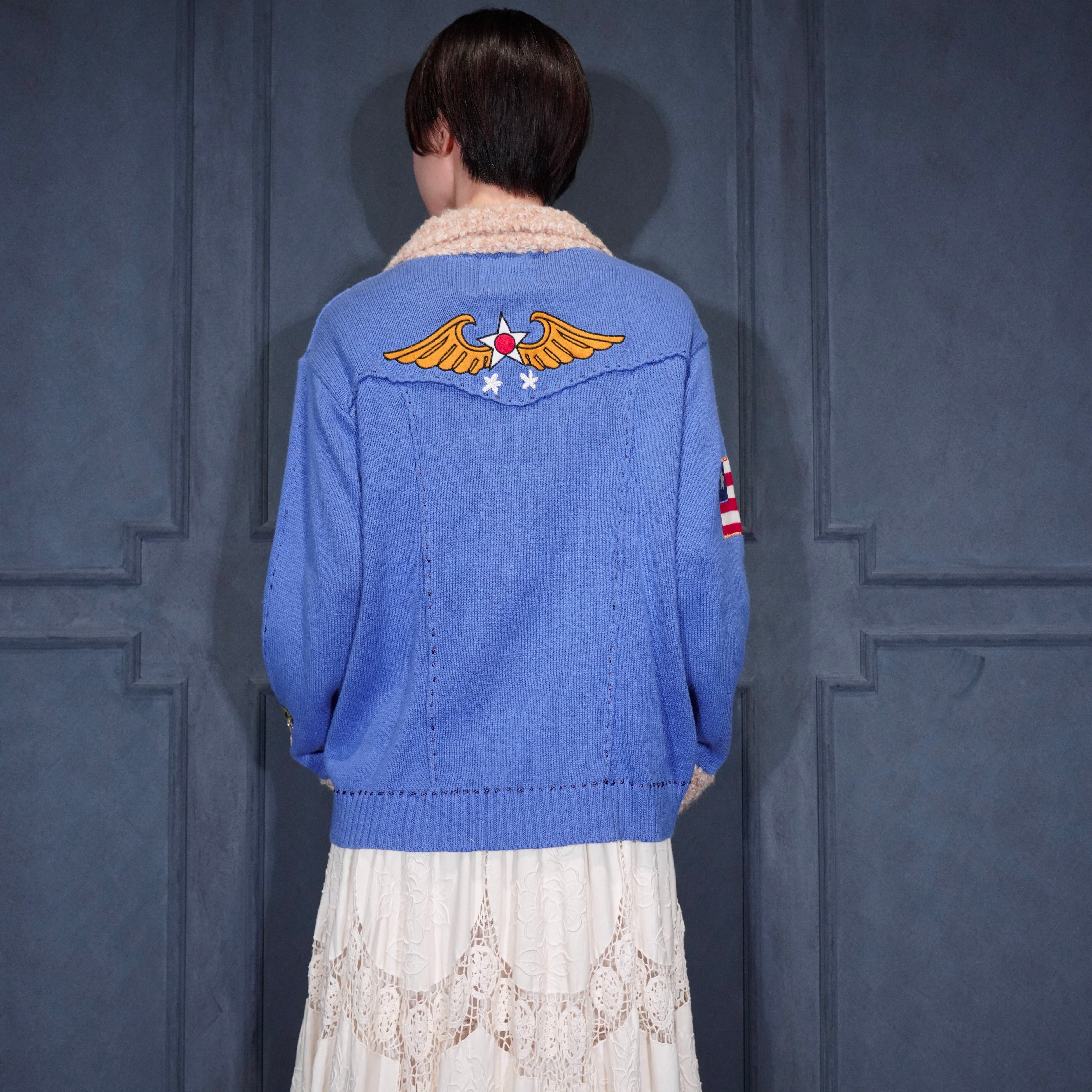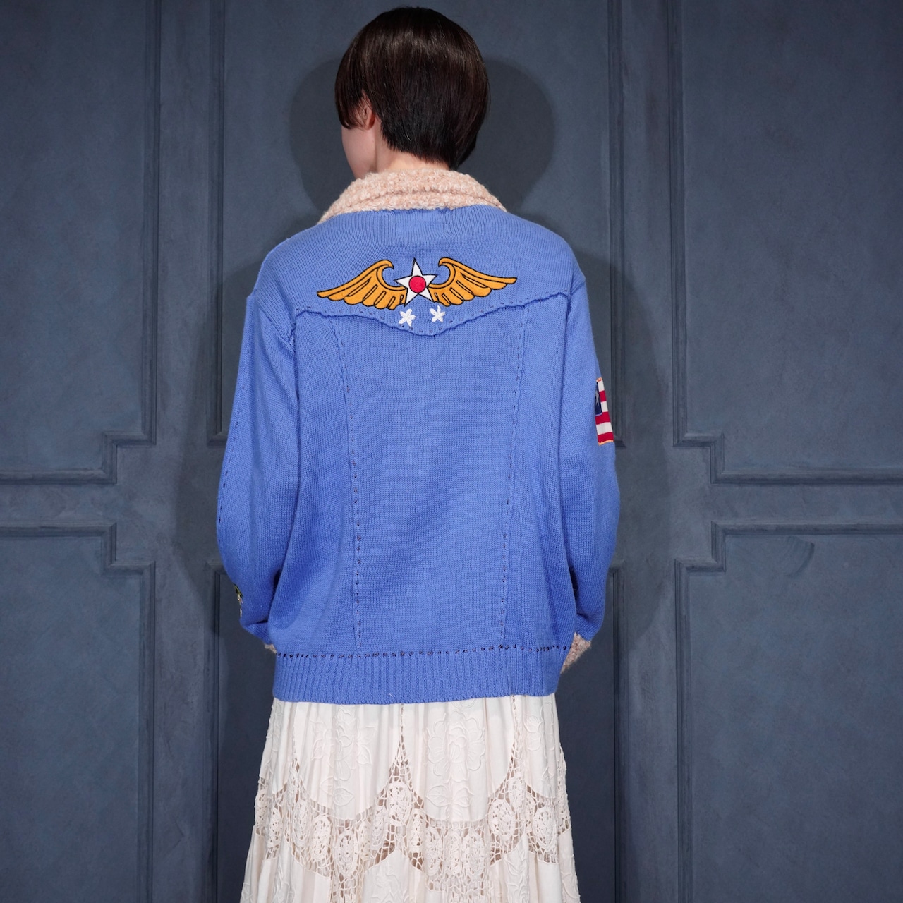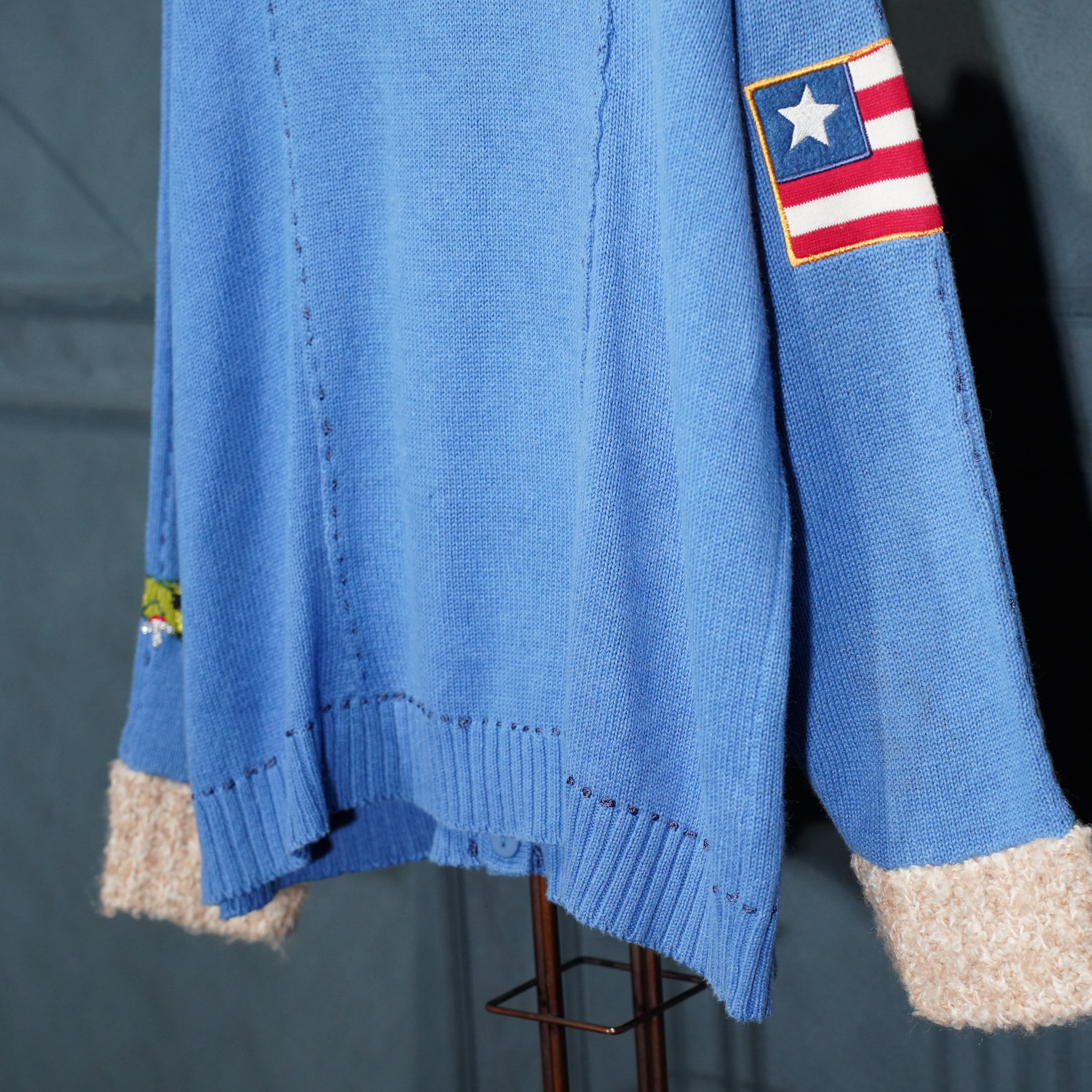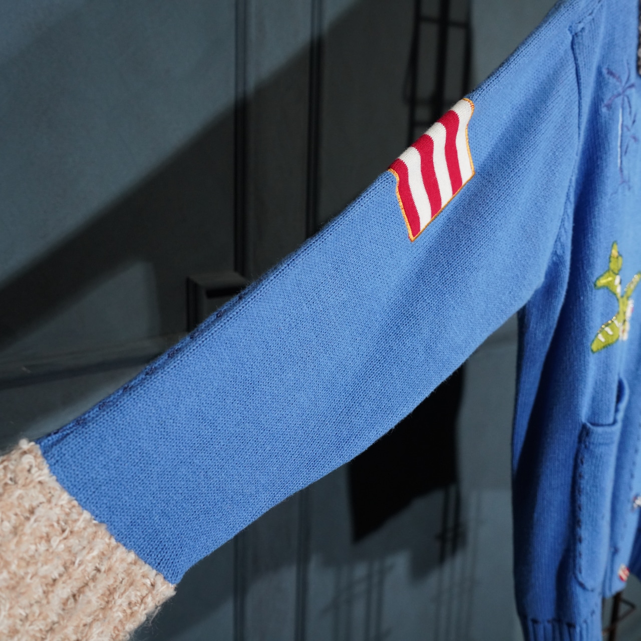 USA VINTAGE Storybook Knits WOOL COLLAR NATIONAL FLAG FIGHTER JET EMBROIDERY DESIGN COTTON RAMIE KNIT JACKET/アメリカ古着ウール襟国旗と戦闘機刺繍デザインコットンラミーニットジャケット(カーディガン)