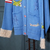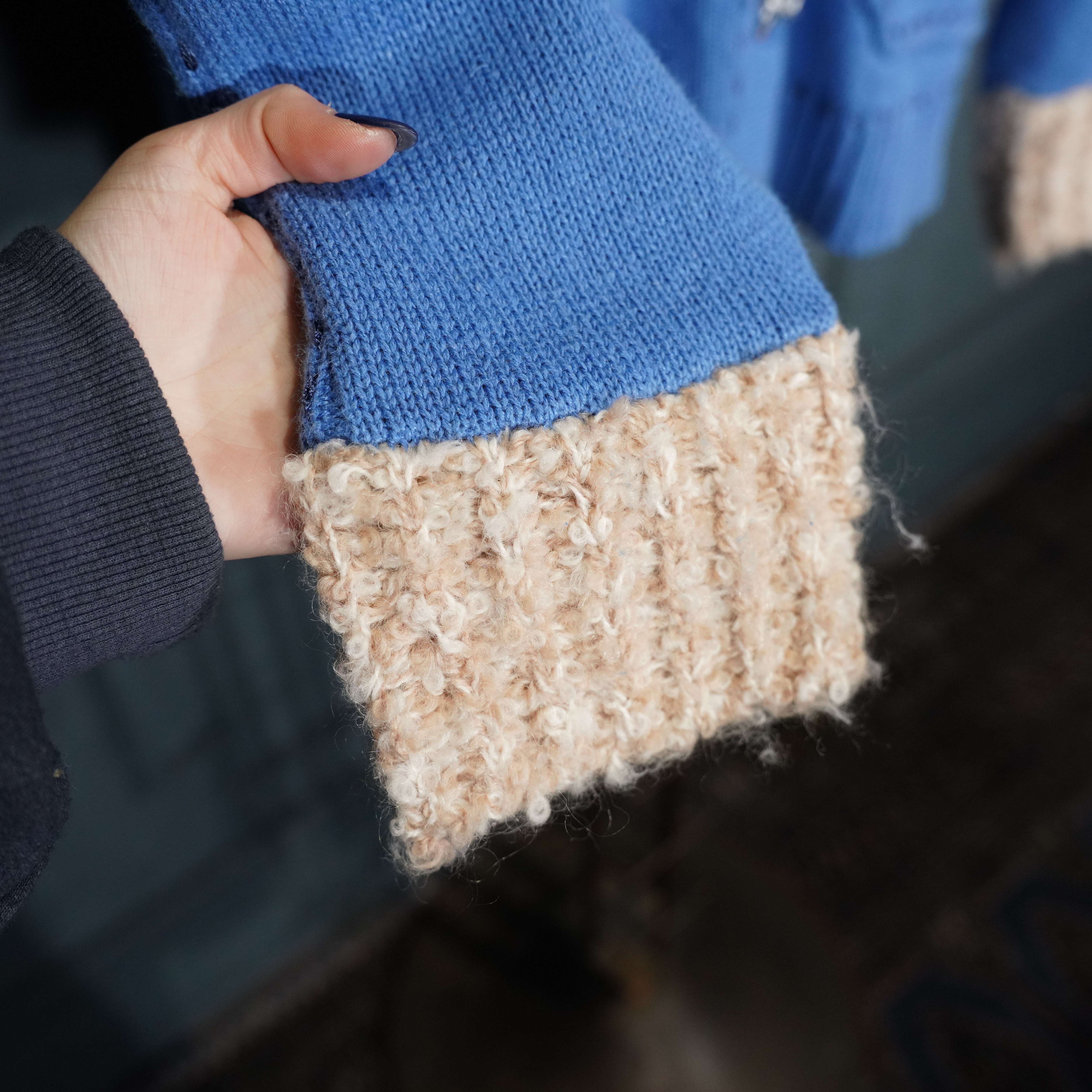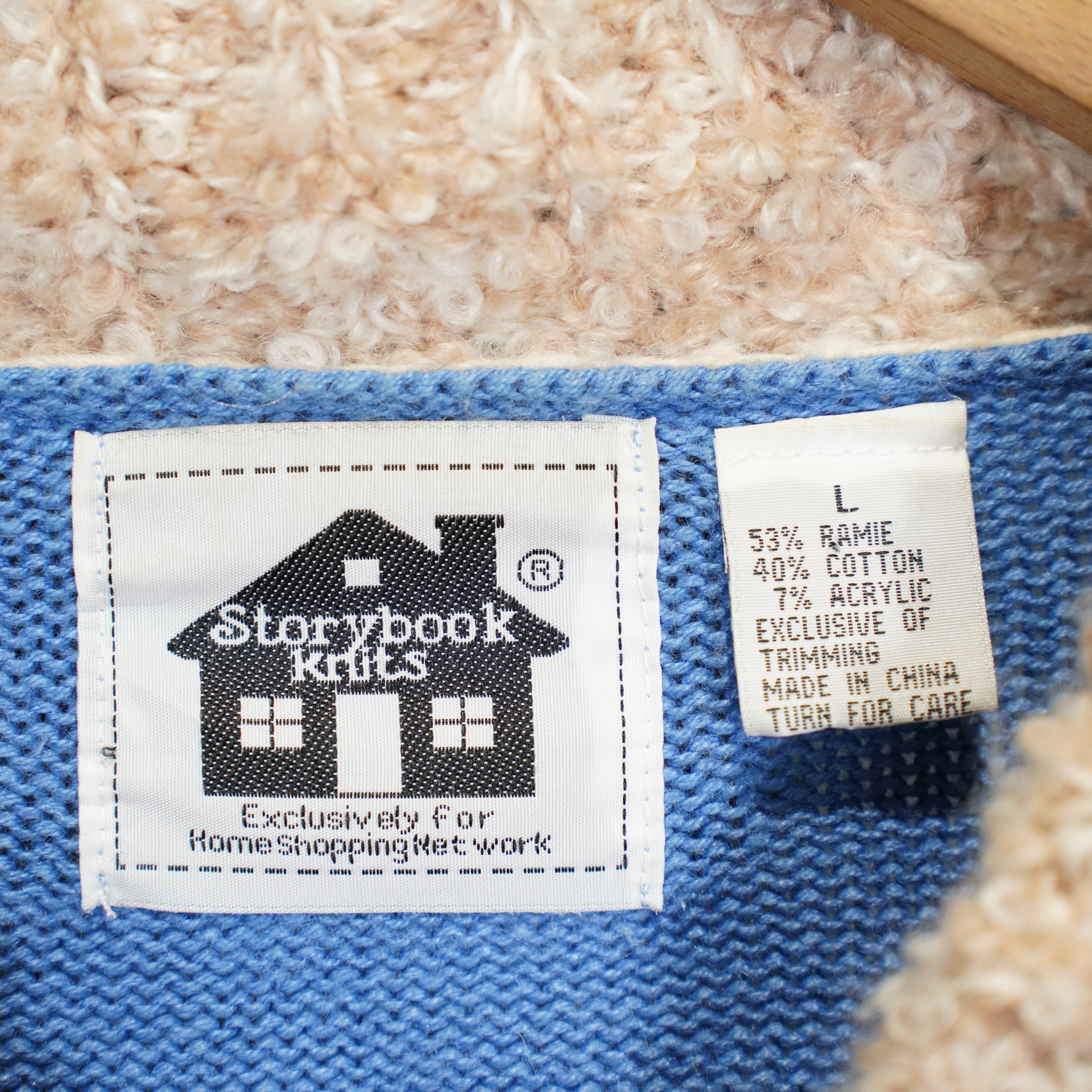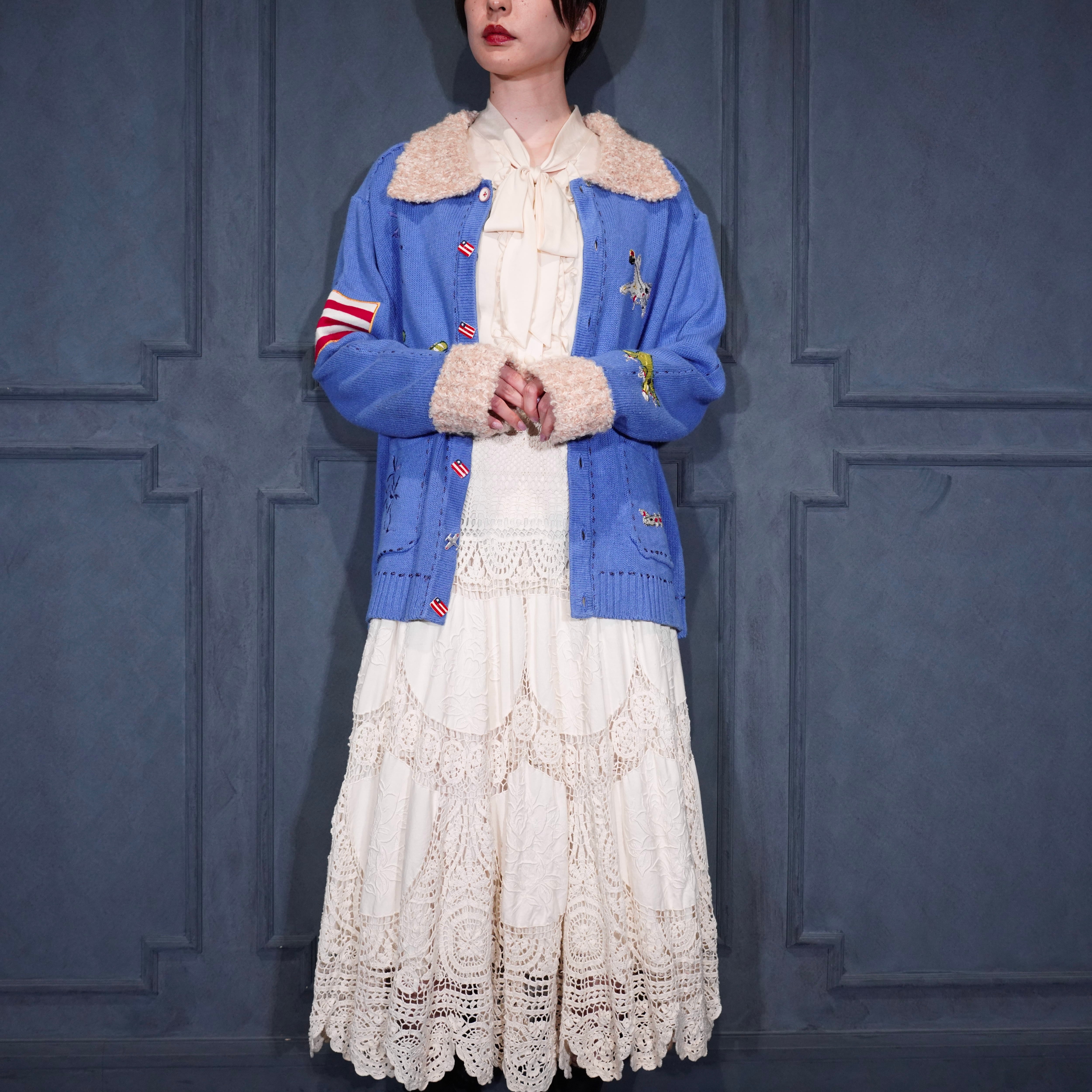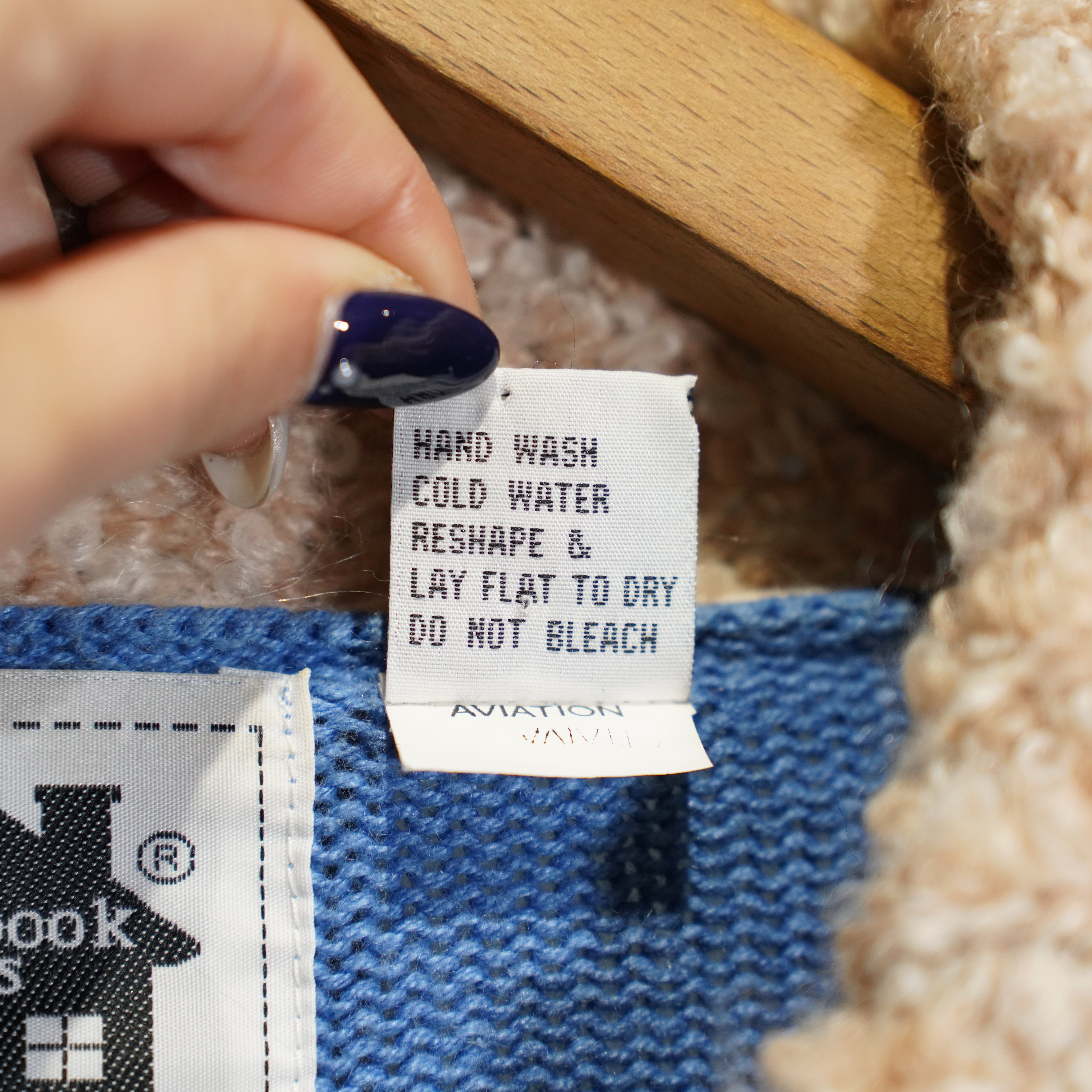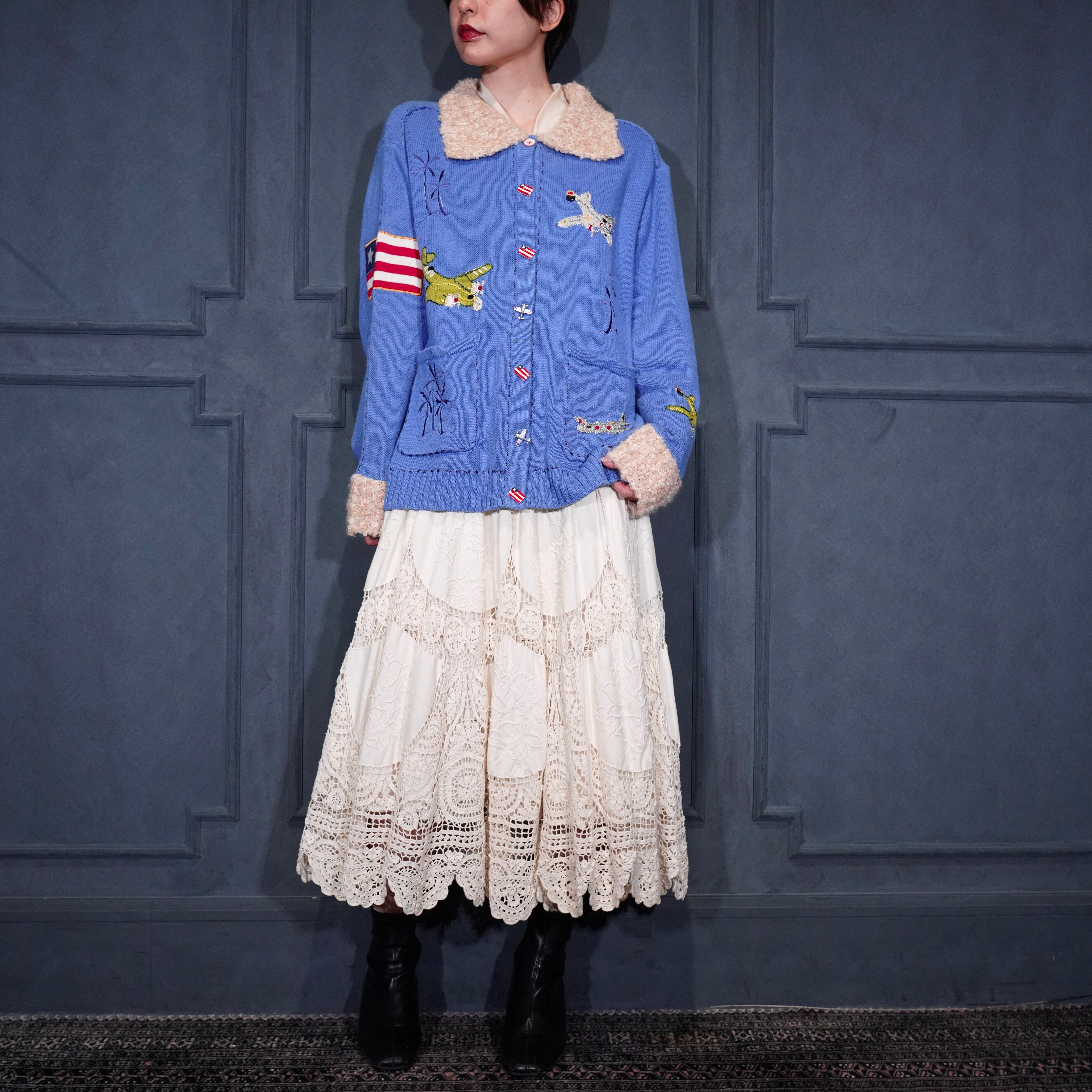 USA VINTAGE Storybook Knits WOOL COLLAR NATIONAL FLAG FIGHTER JET EMBROIDERY DESIGN COTTON RAMIE KNIT JACKET/アメリカ古着ウール襟国旗と戦闘機刺繍デザインコットンラミーニットジャケット(カーディガン)