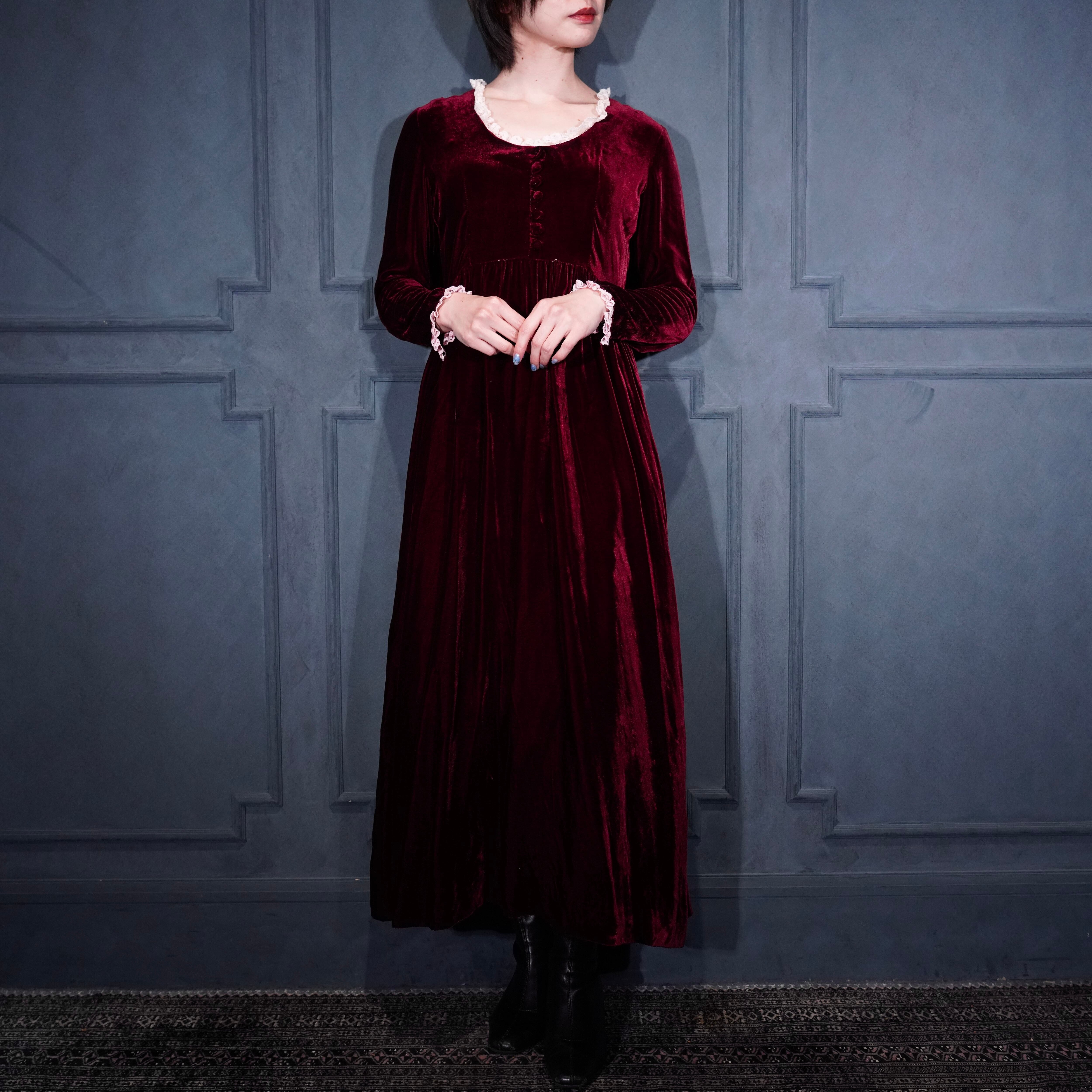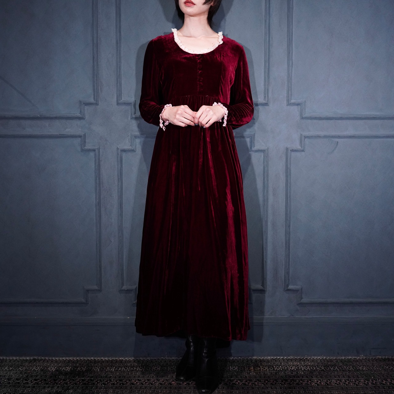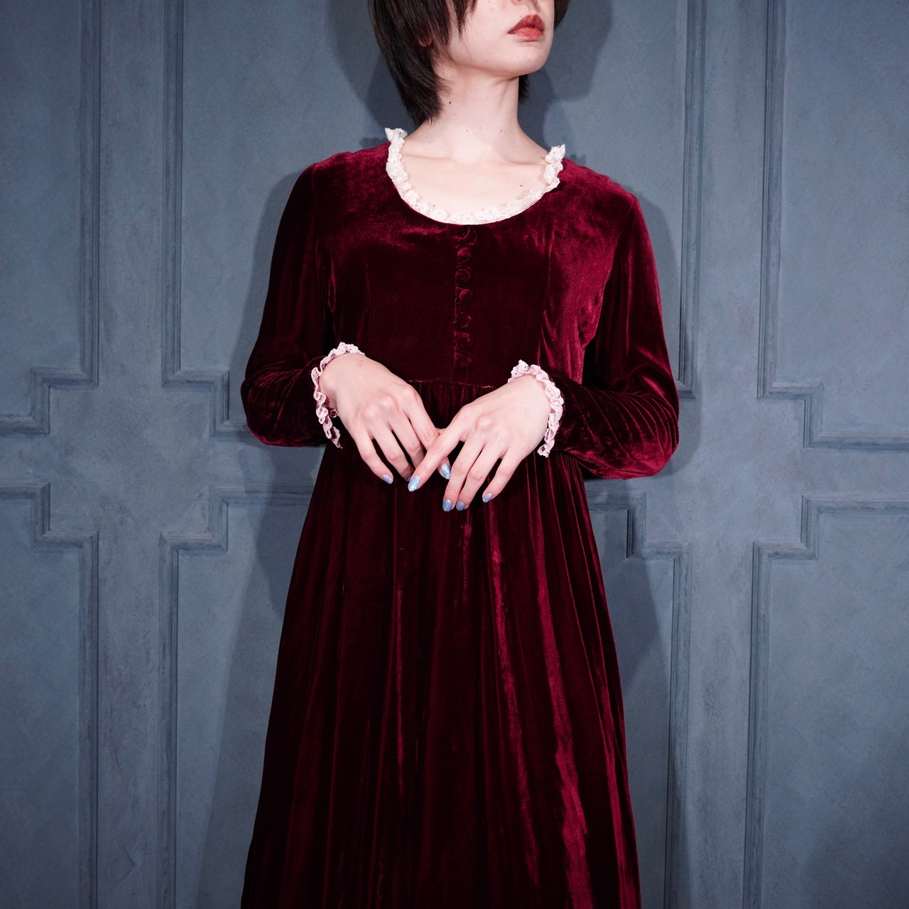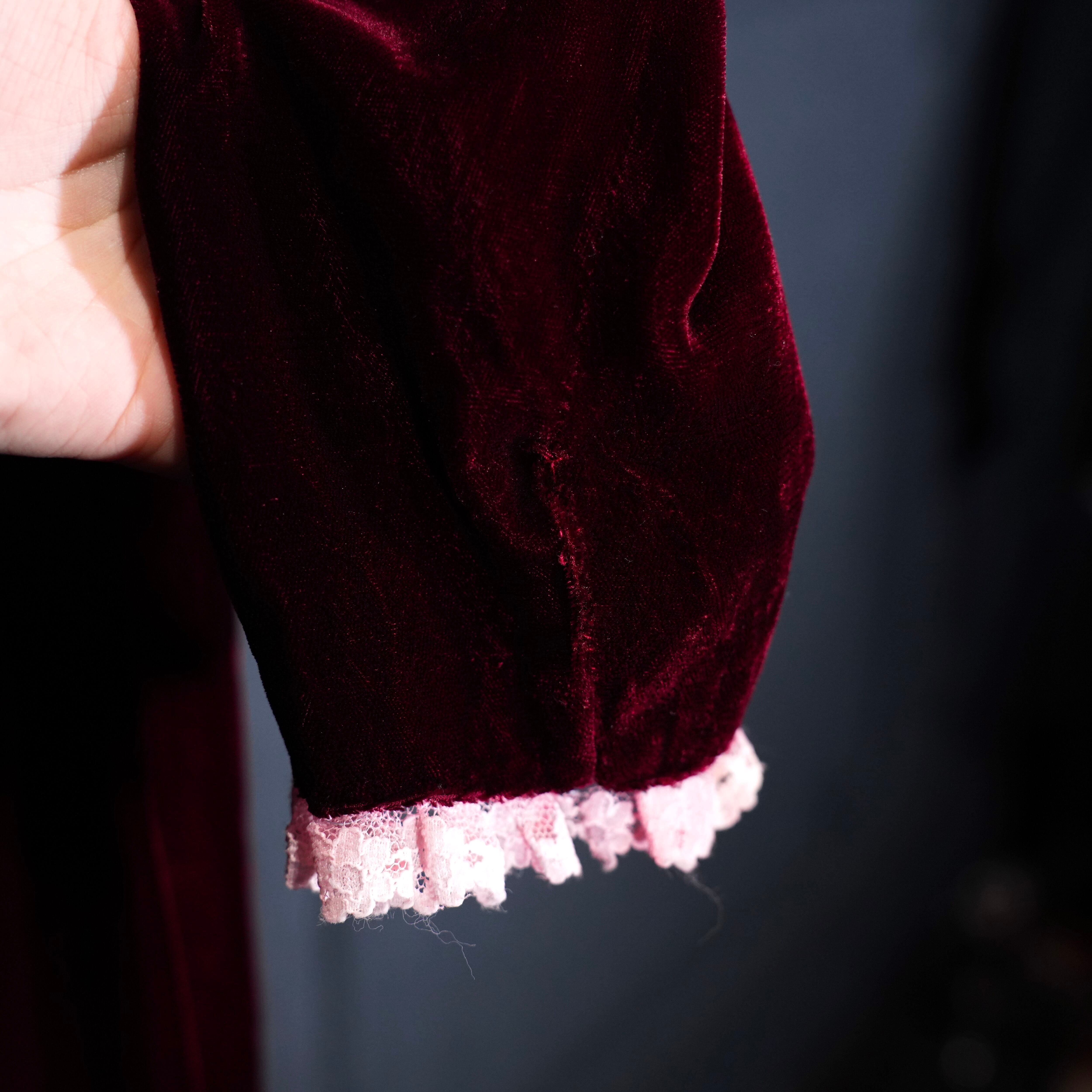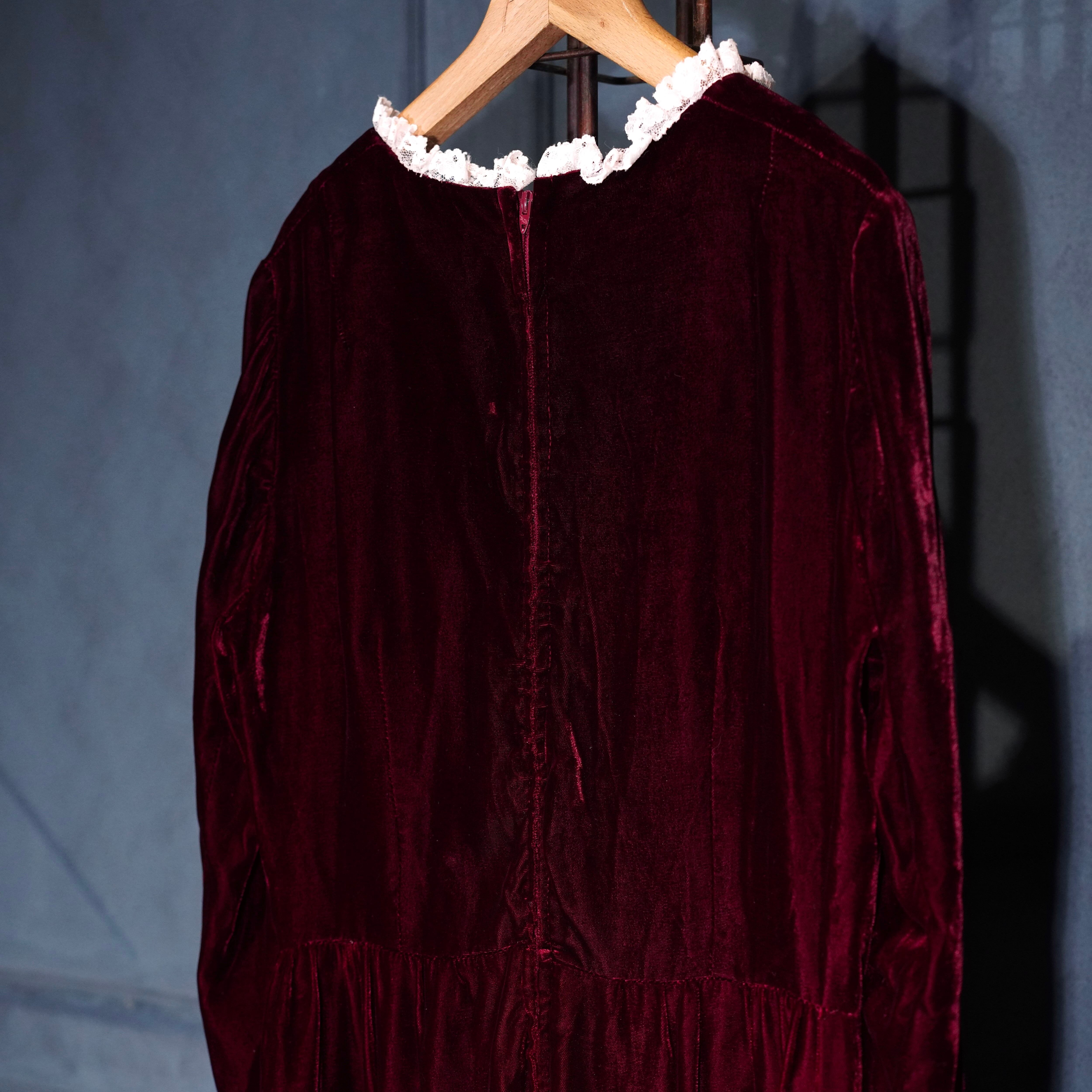 70's USA VINTAGE LACE DESIGN RED COLOR VELOUR DRESS ONE PIECE/70年代アメリカ古着レースデザインレッドカラーベロアドレスワンピース