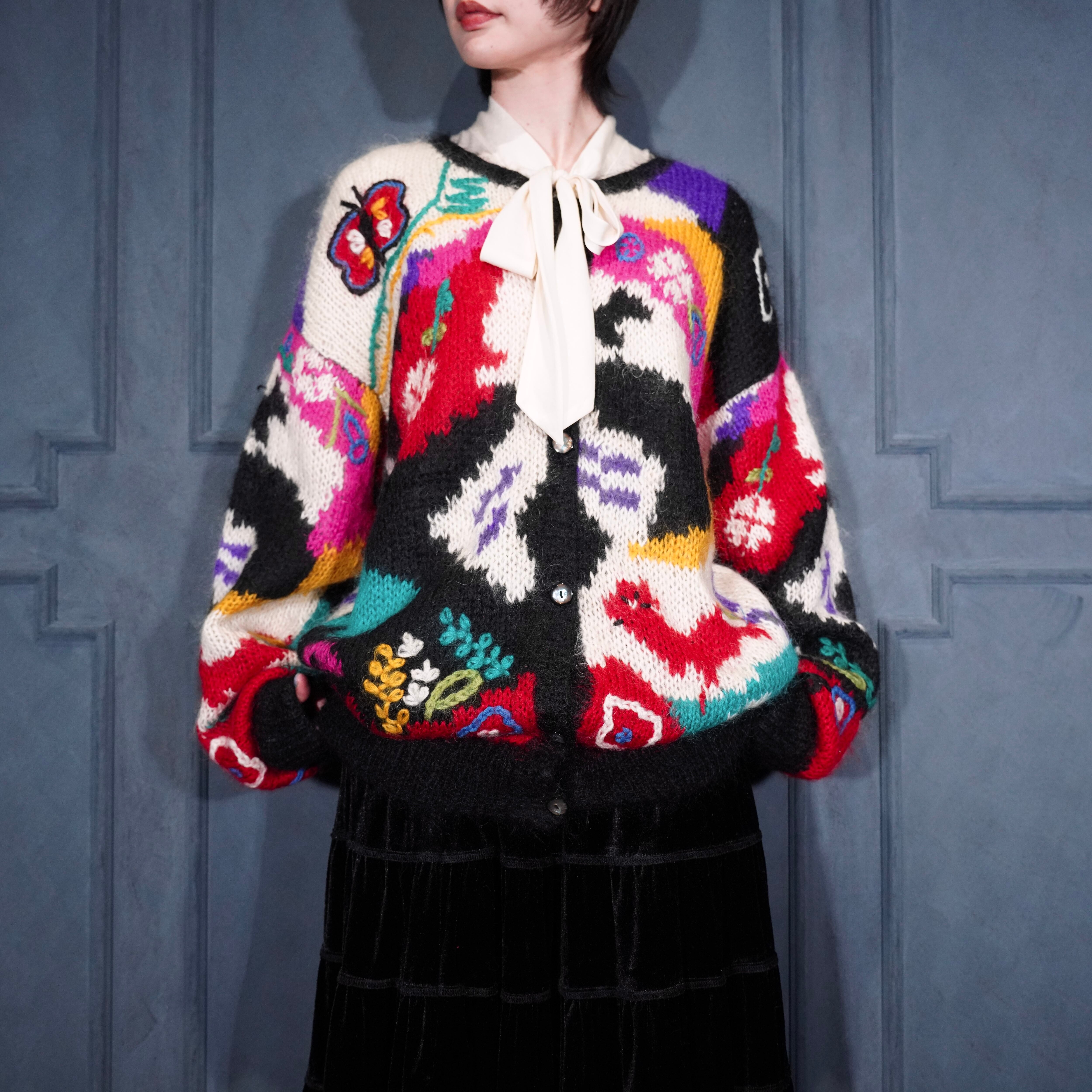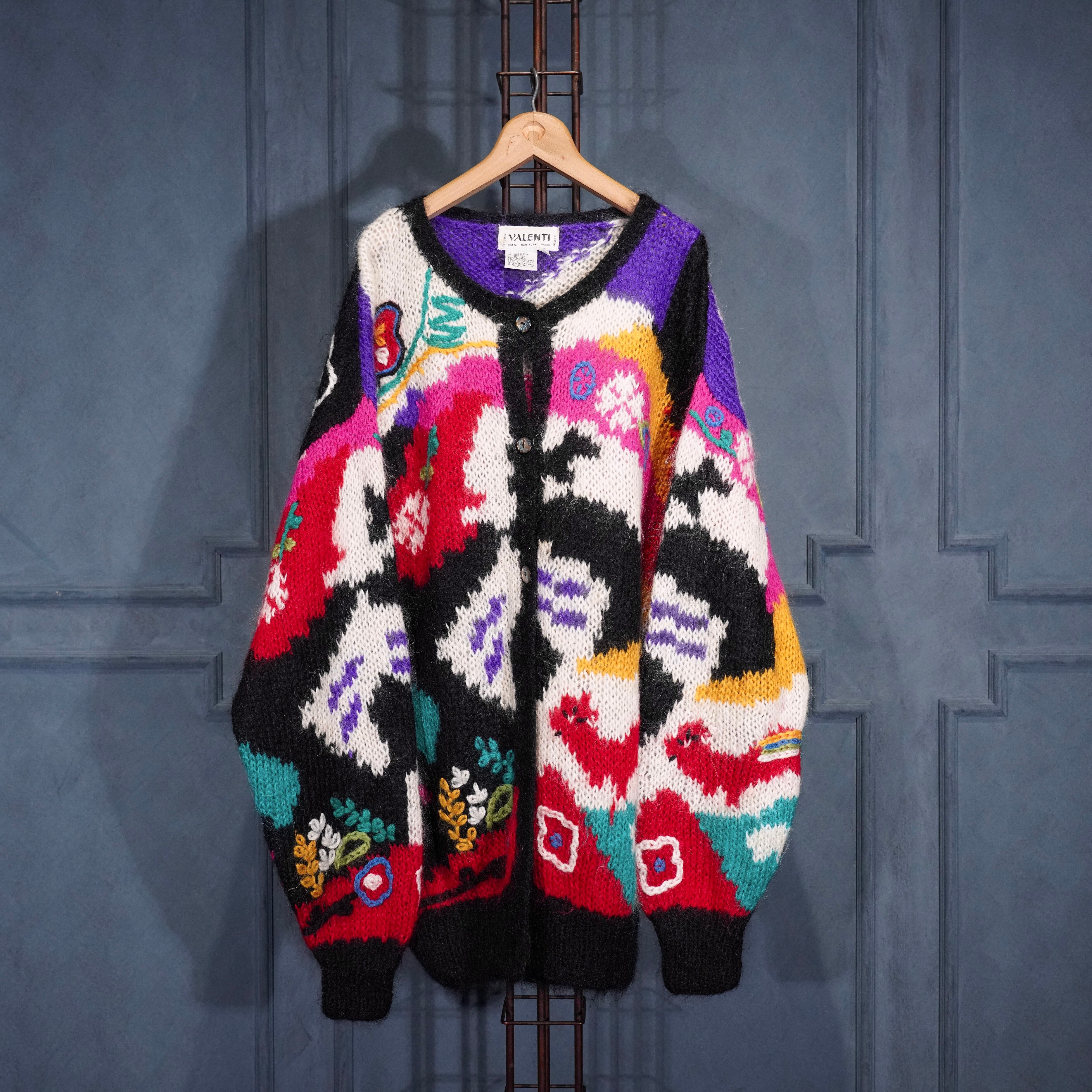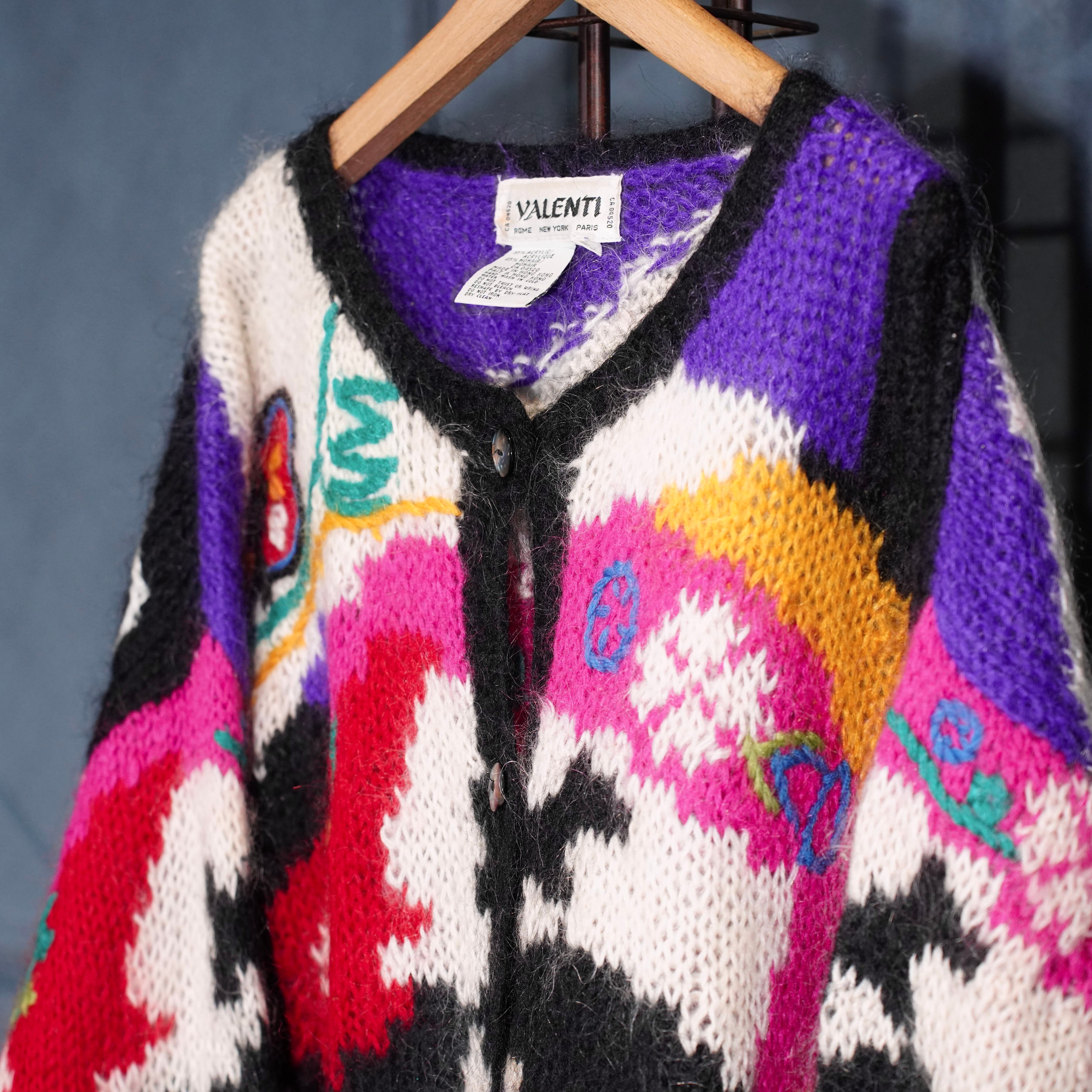 USA VINTAGE VALENTI EMBROIDERY PATTERNED DESIGN MOHAIR KNIT CARDIGAN/アメリカ古着刺繍柄デザインモヘアニットカーディガン