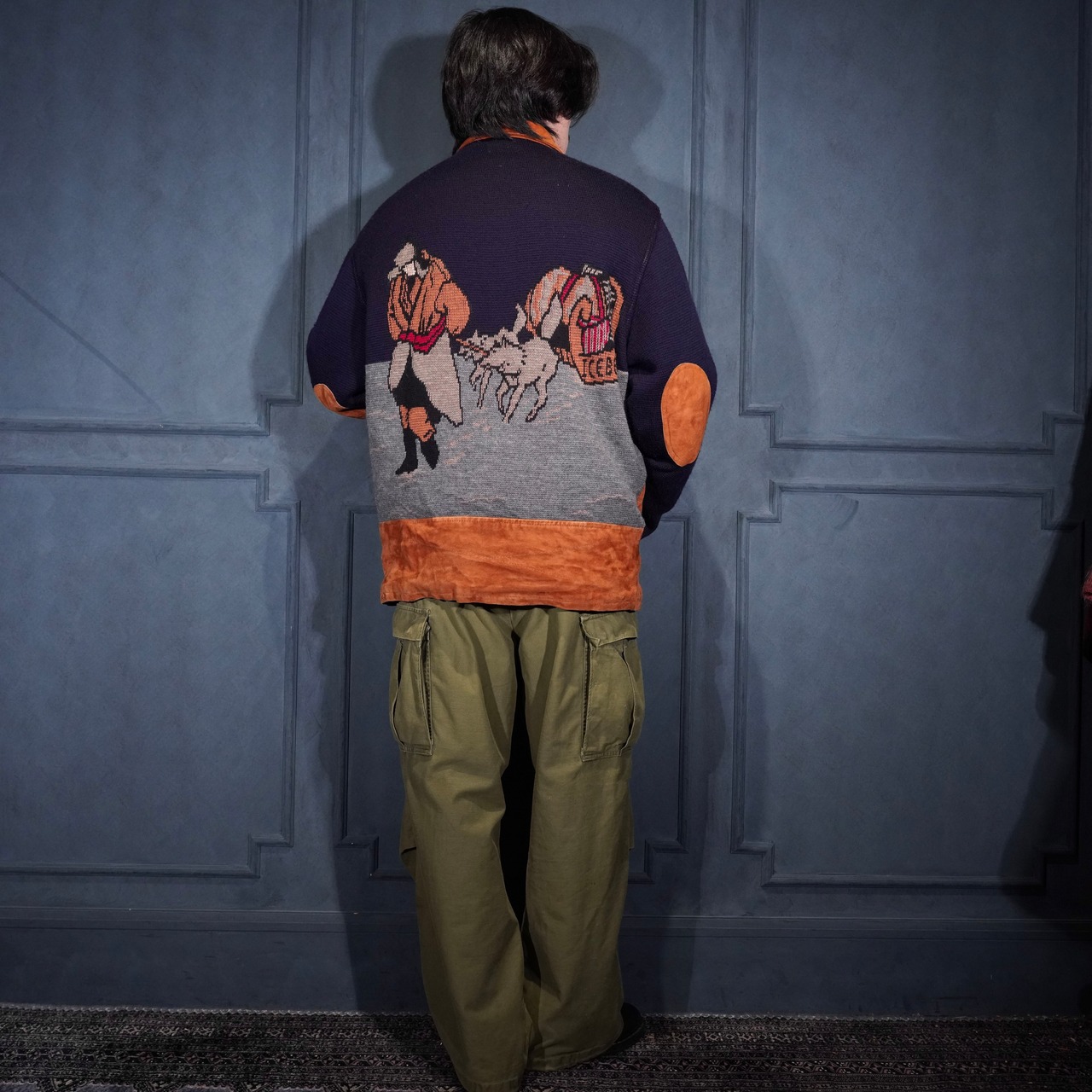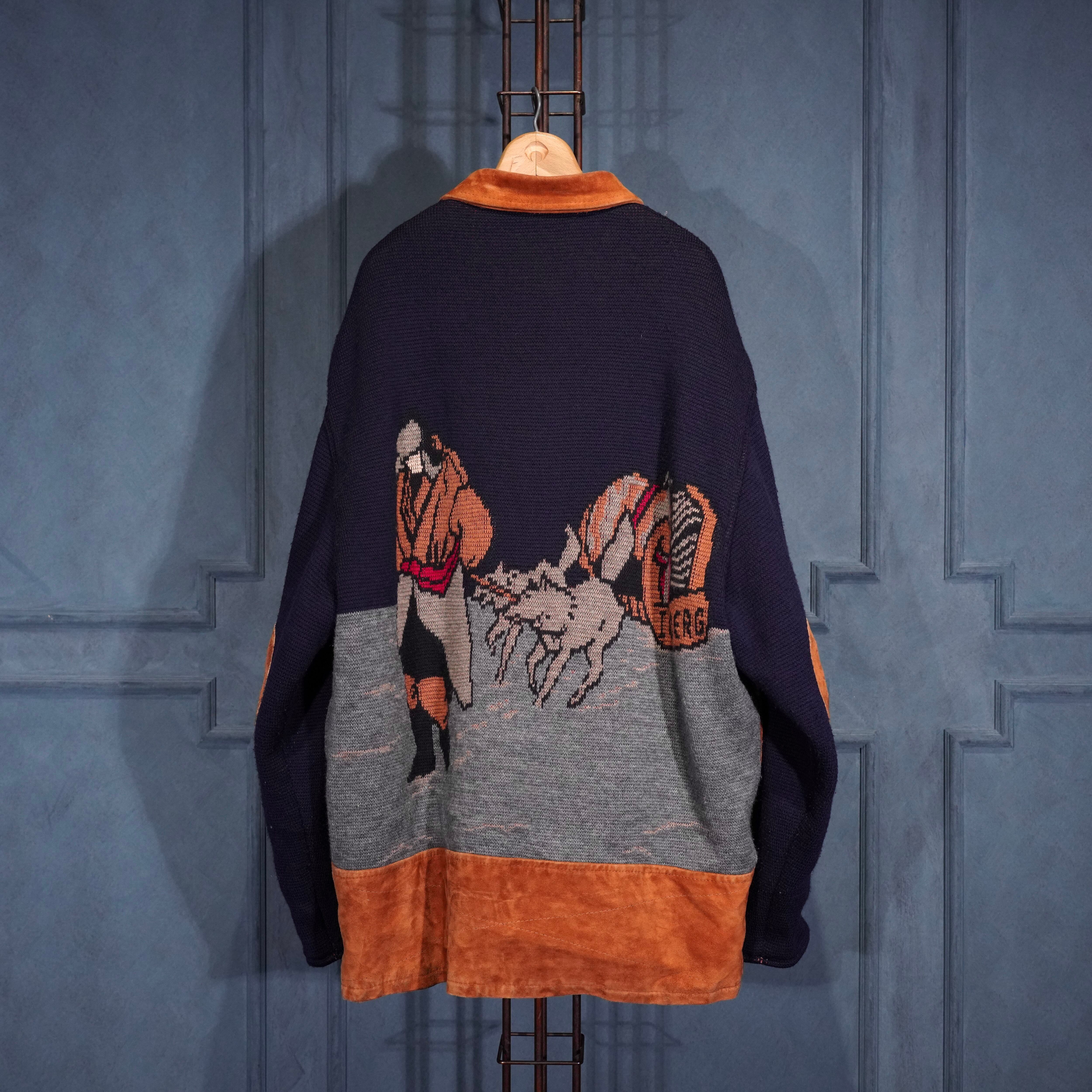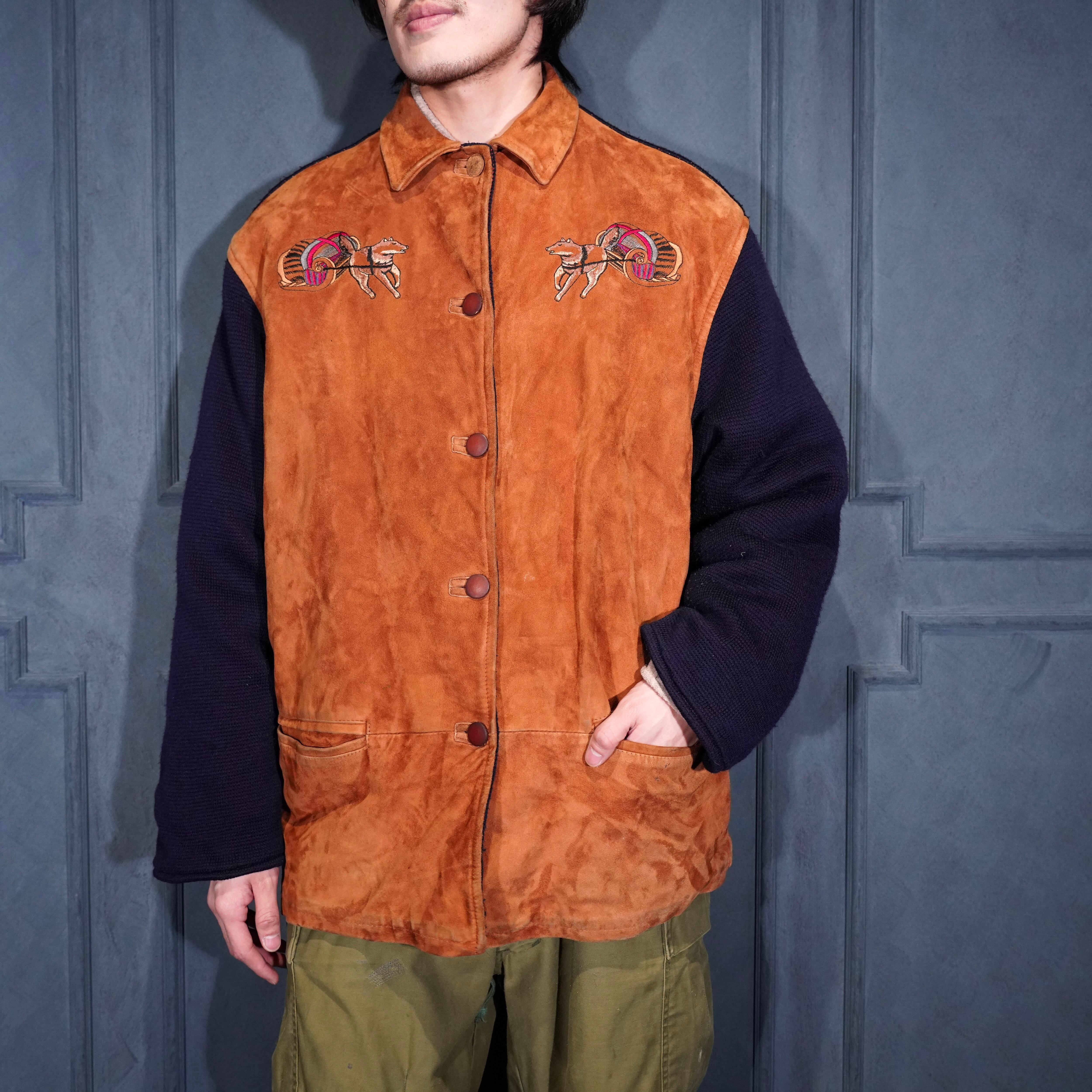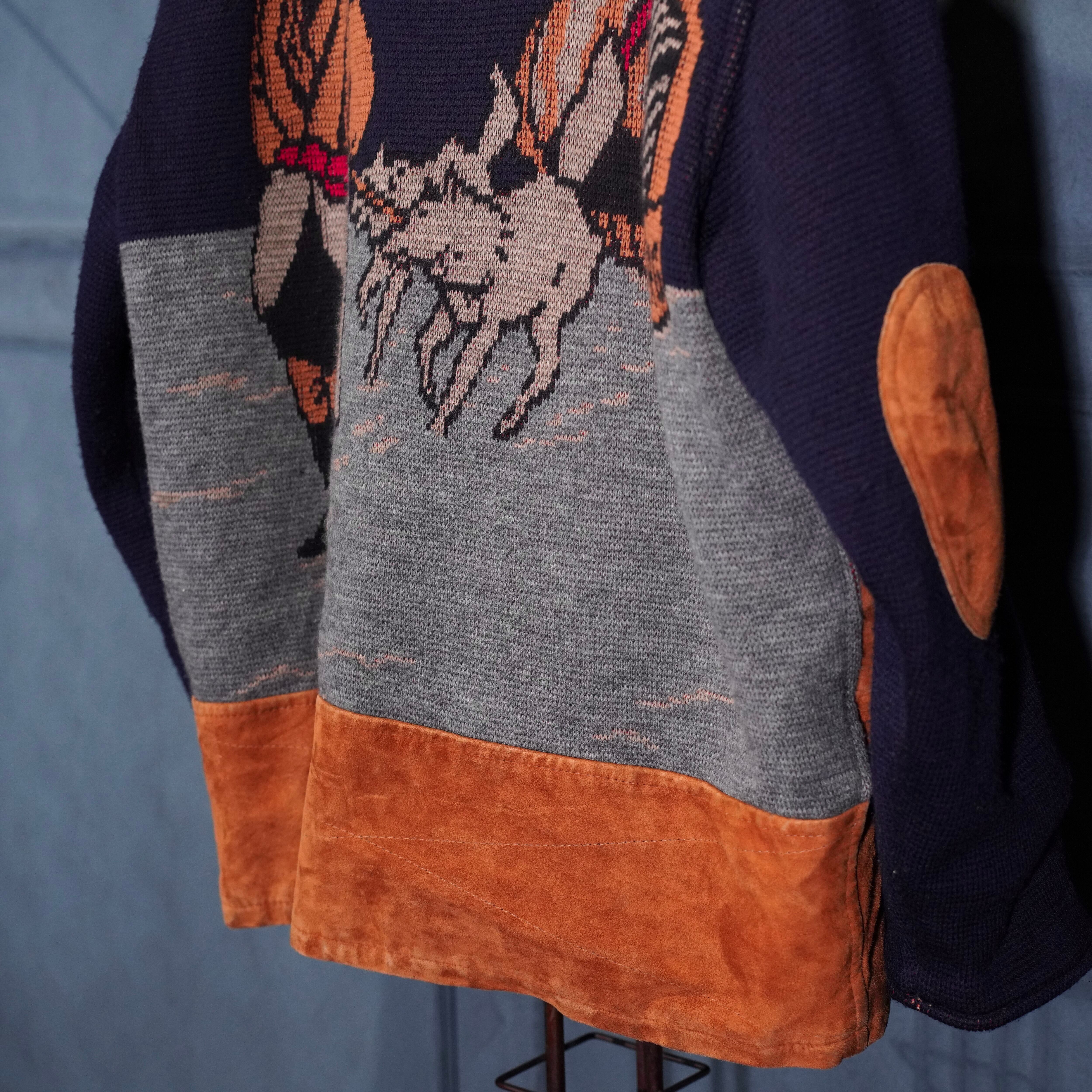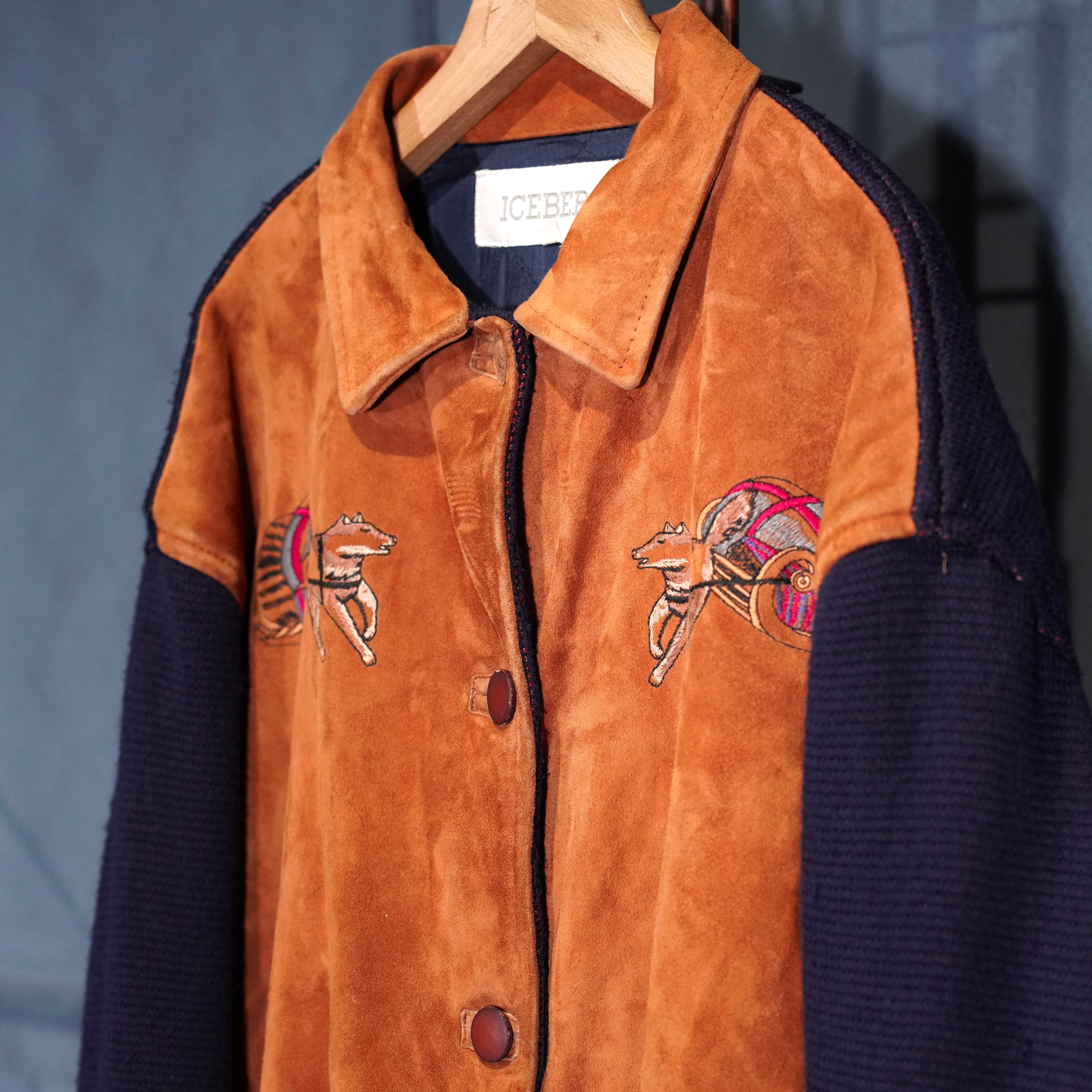 EU VINTAGE ICEBERG WOLF EMBROIDERY KNIT SWITCHED DESIGN LEATHER JACKET MADE IN ITALY/ヨーロッパ古着アイスバーグオオカミデザインニット切替レザージャケット