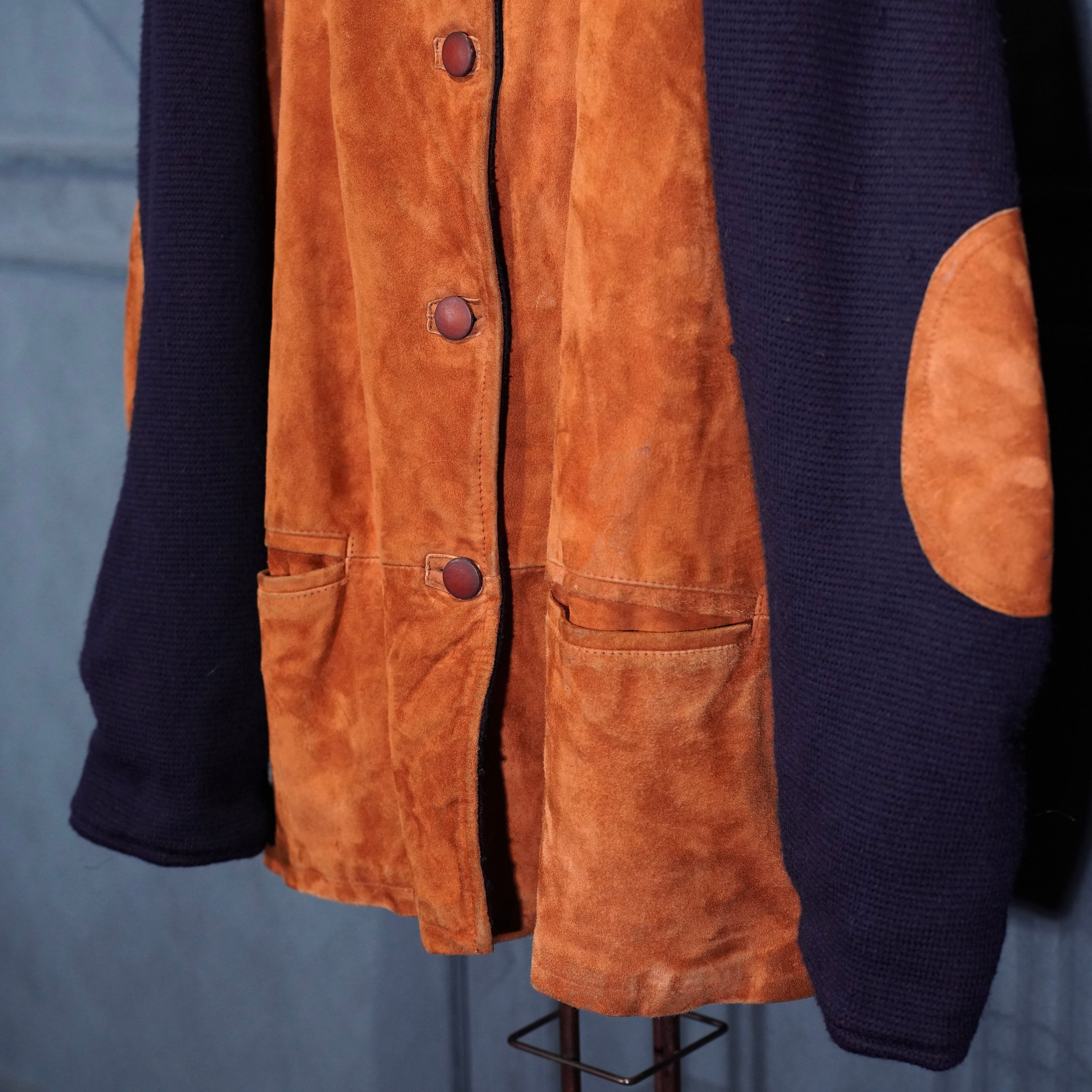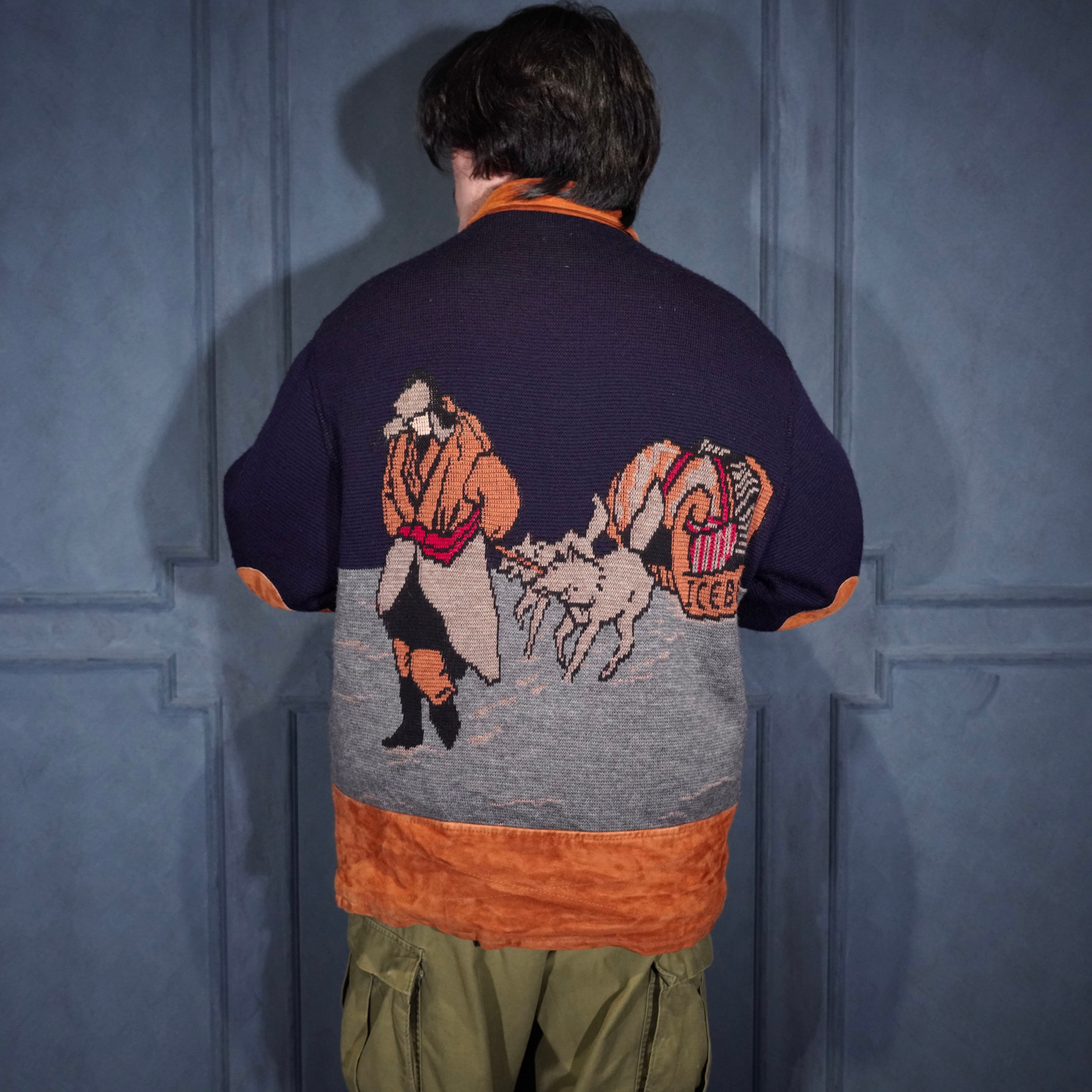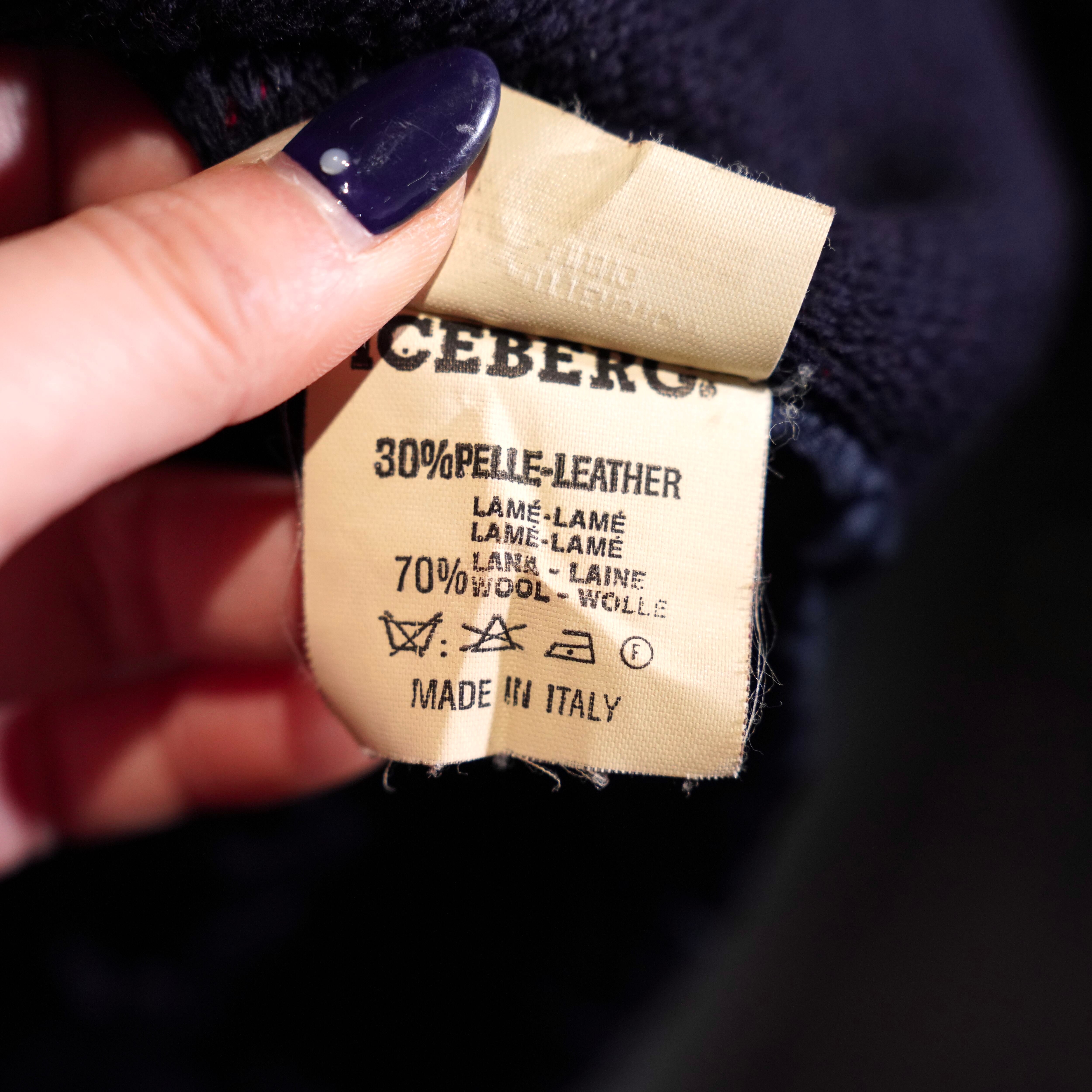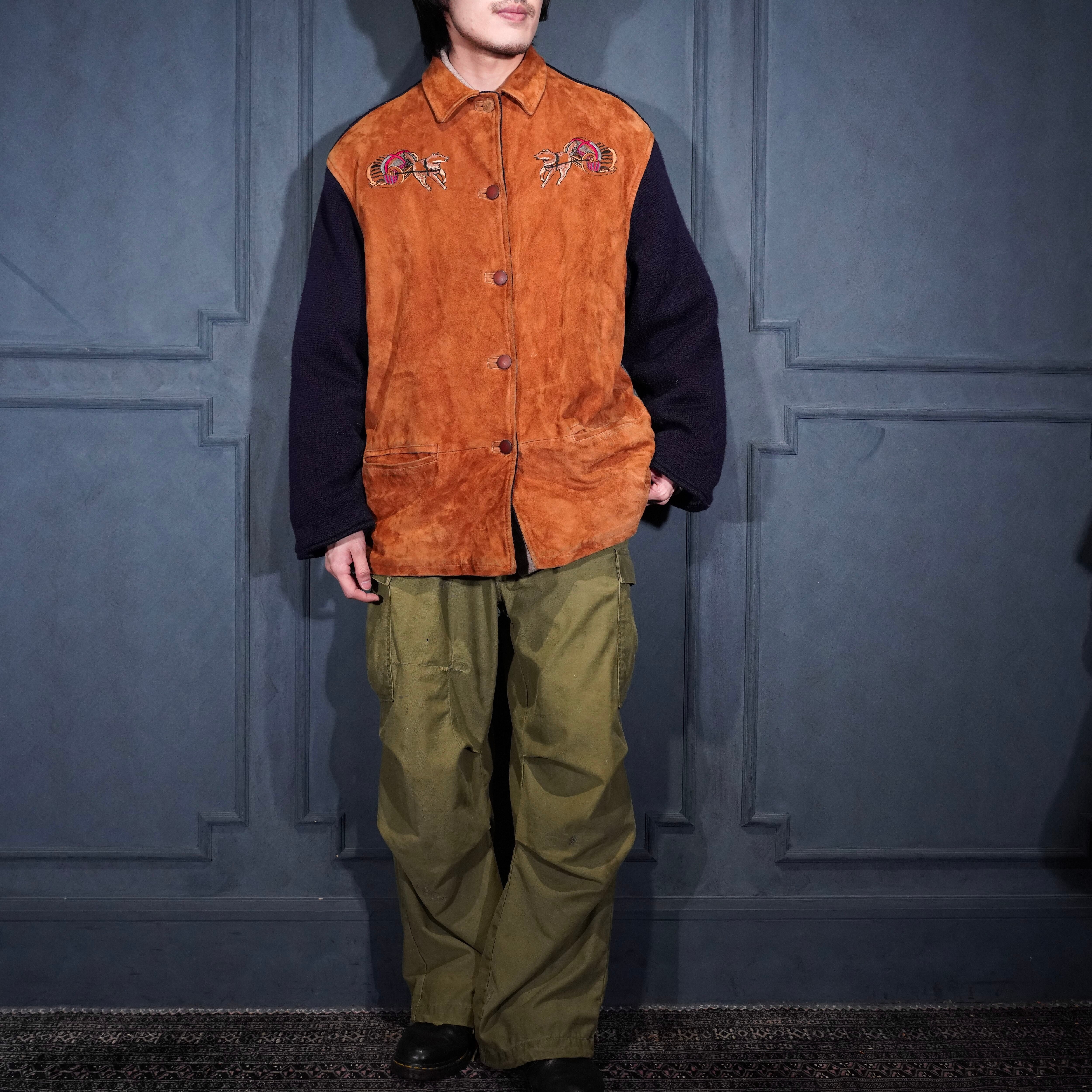 EU VINTAGE ICEBERG WOLF EMBROIDERY KNIT SWITCHED DESIGN LEATHER JACKET MADE IN ITALY/ヨーロッパ古着アイスバーグオオカミデザインニット切替レザージャケット