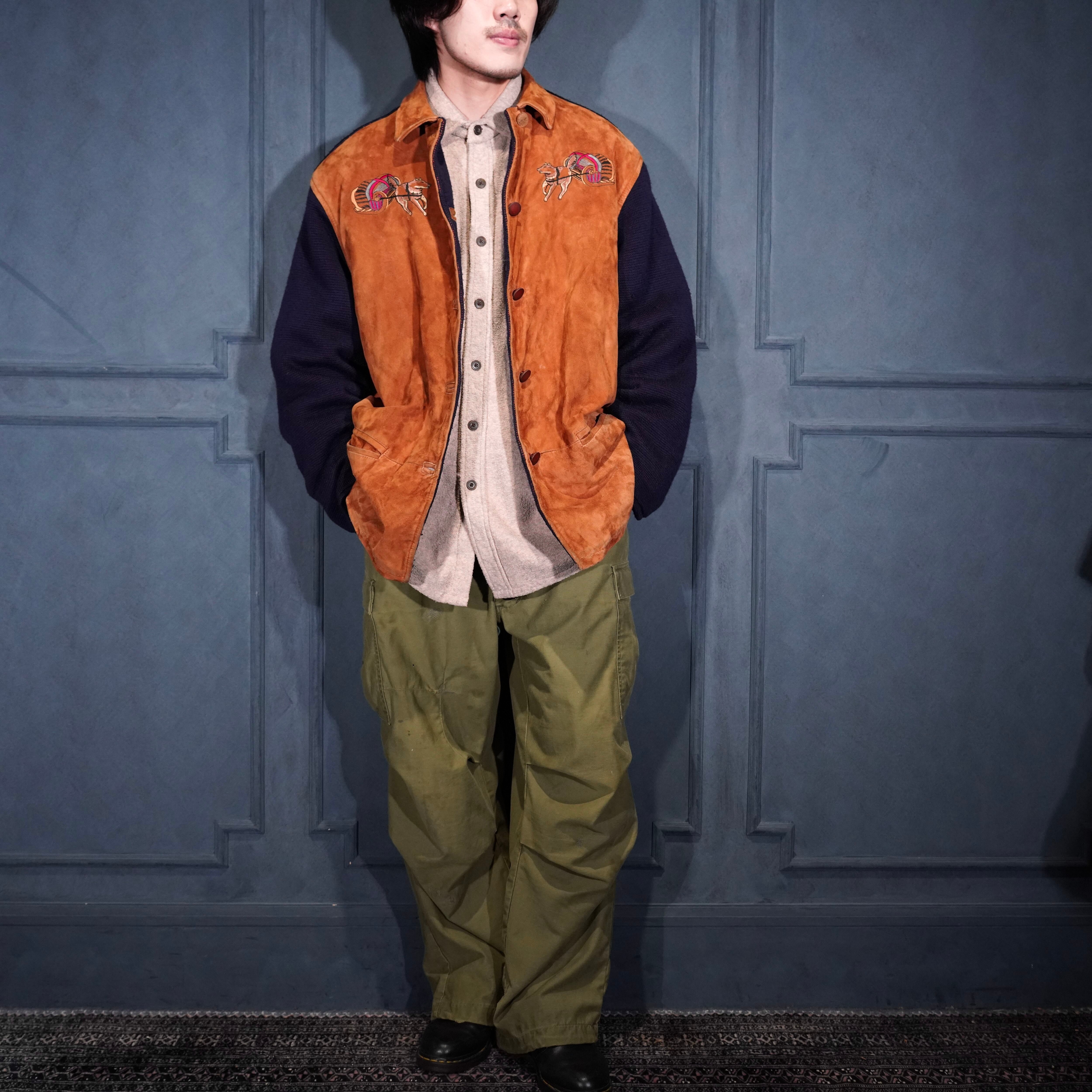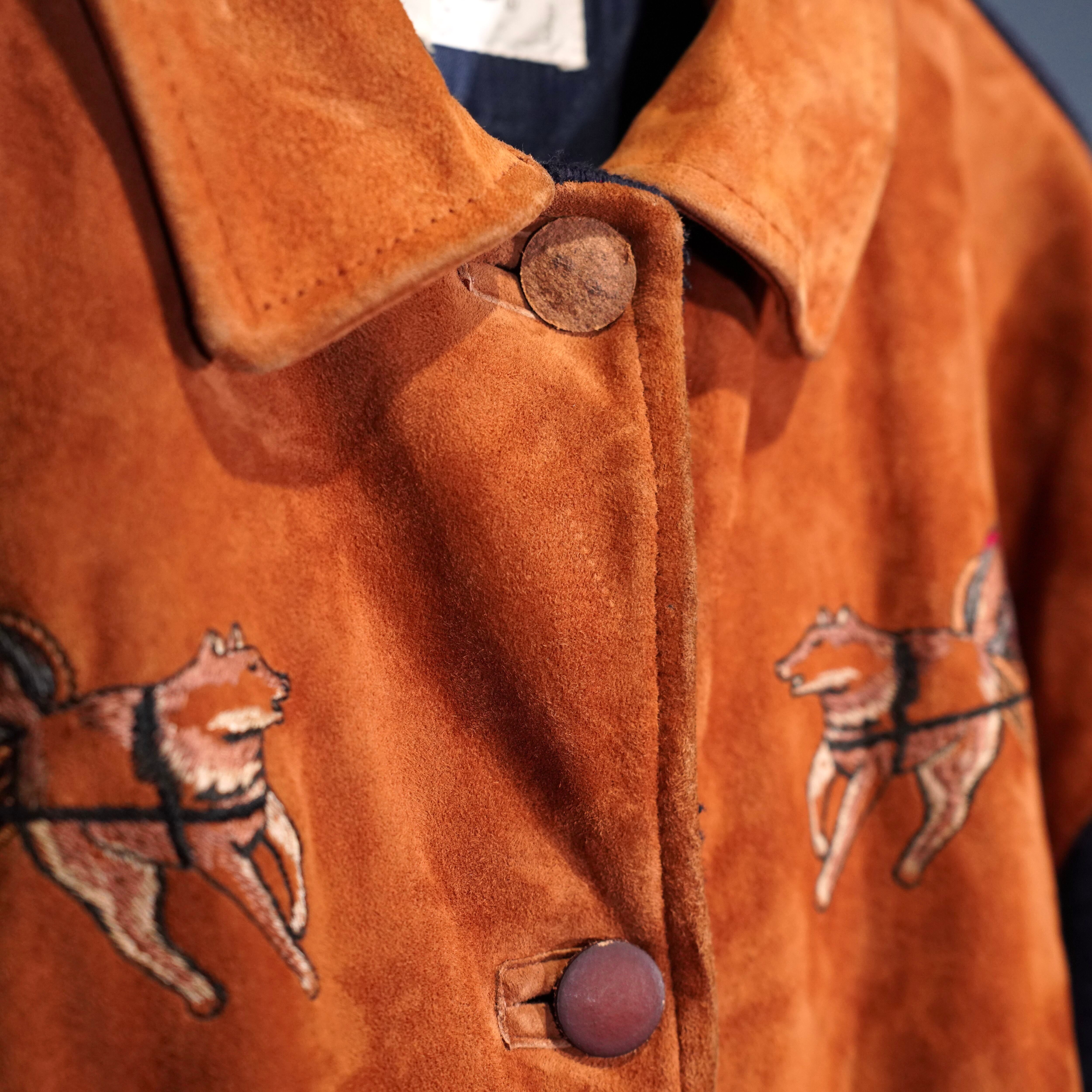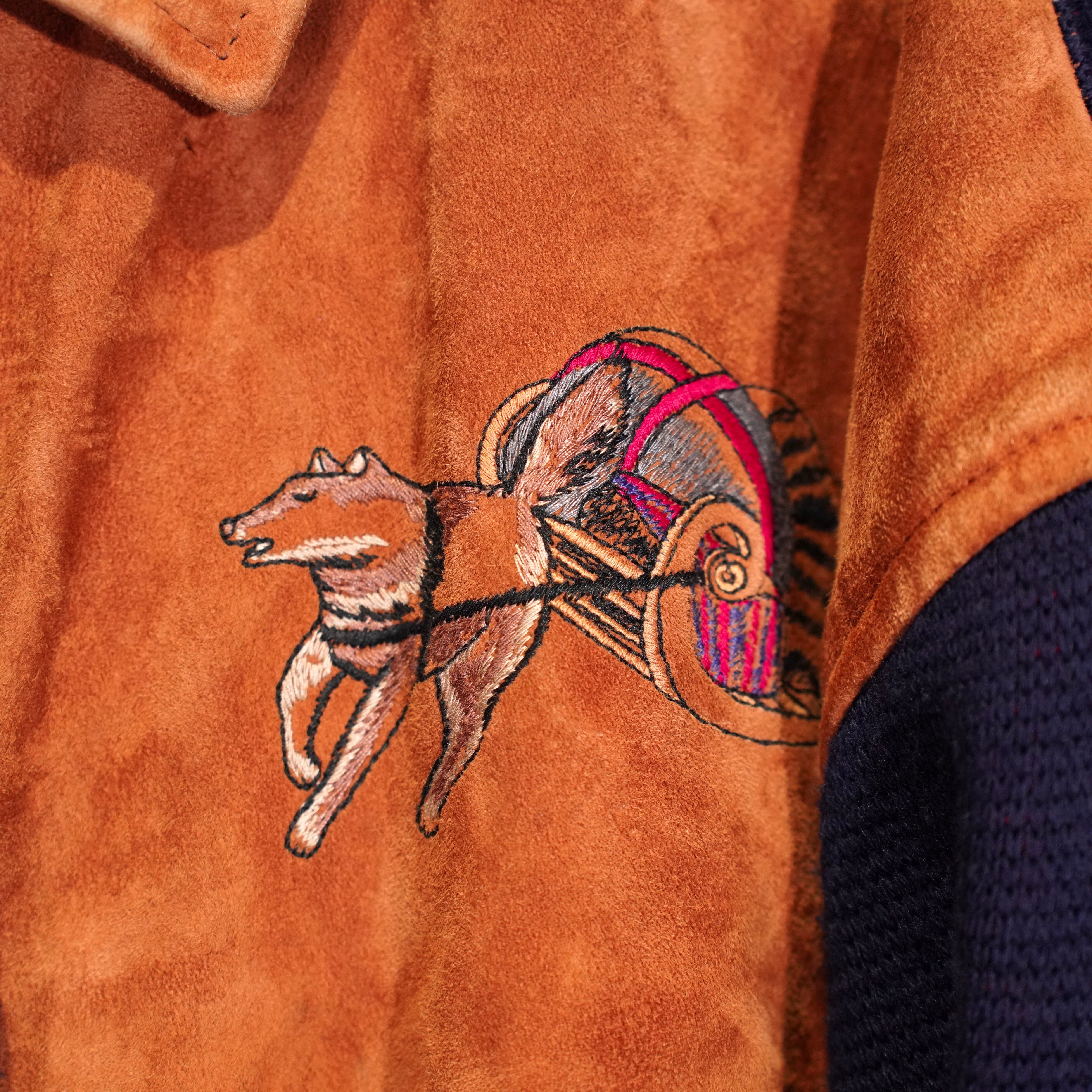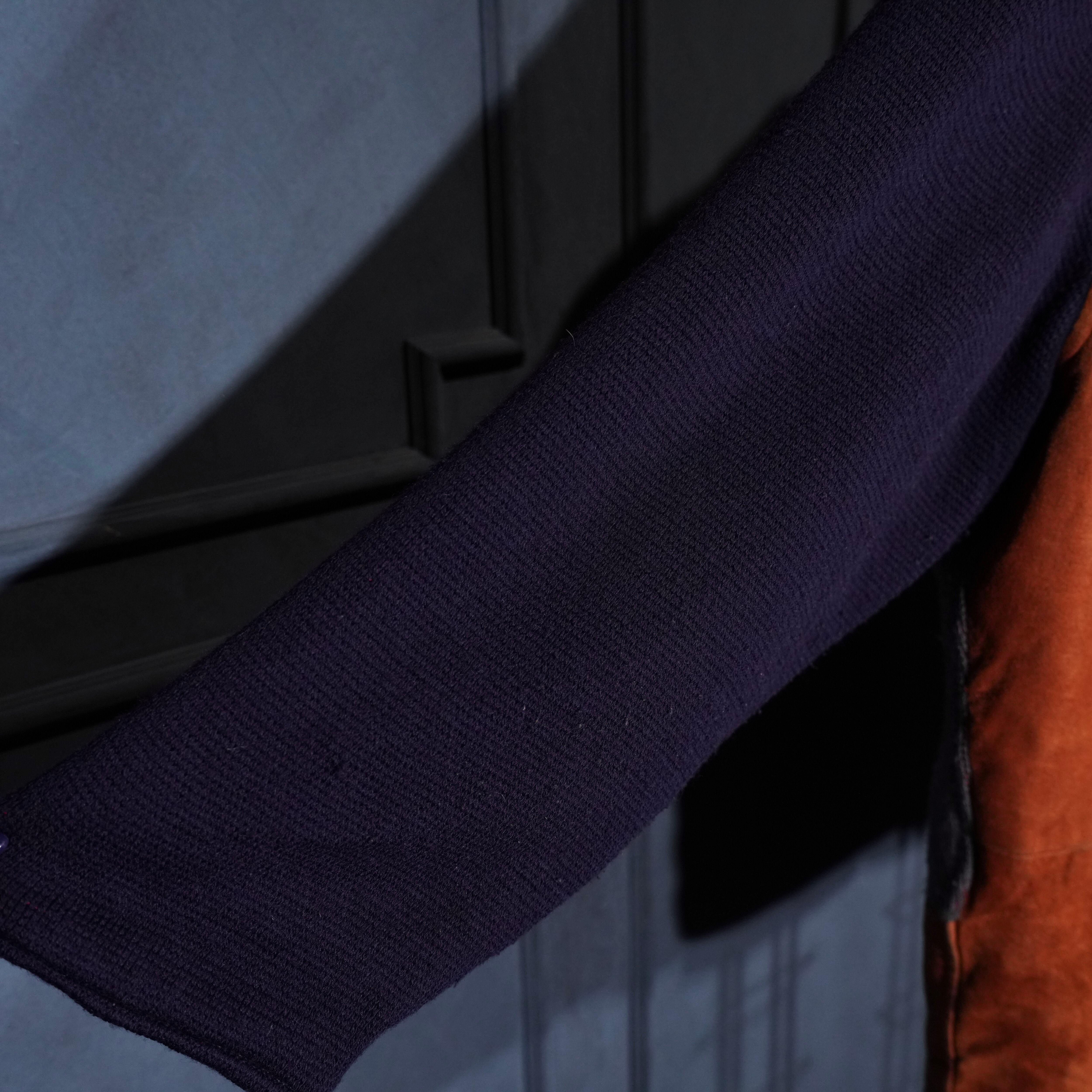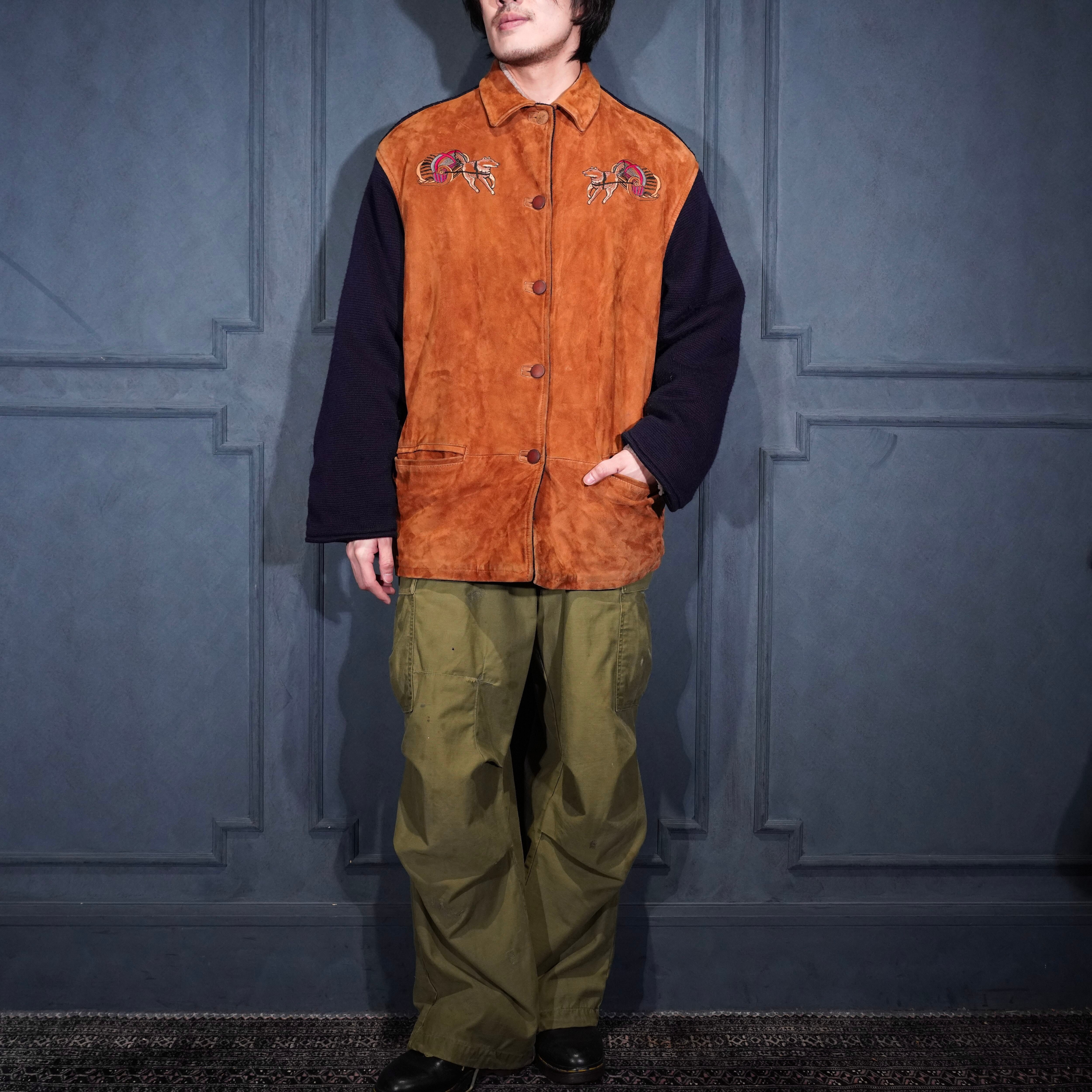 EU VINTAGE ICEBERG WOLF EMBROIDERY KNIT SWITCHED DESIGN LEATHER JACKET MADE IN ITALY/ヨーロッパ古着アイスバーグオオカミデザインニット切替レザージャケット