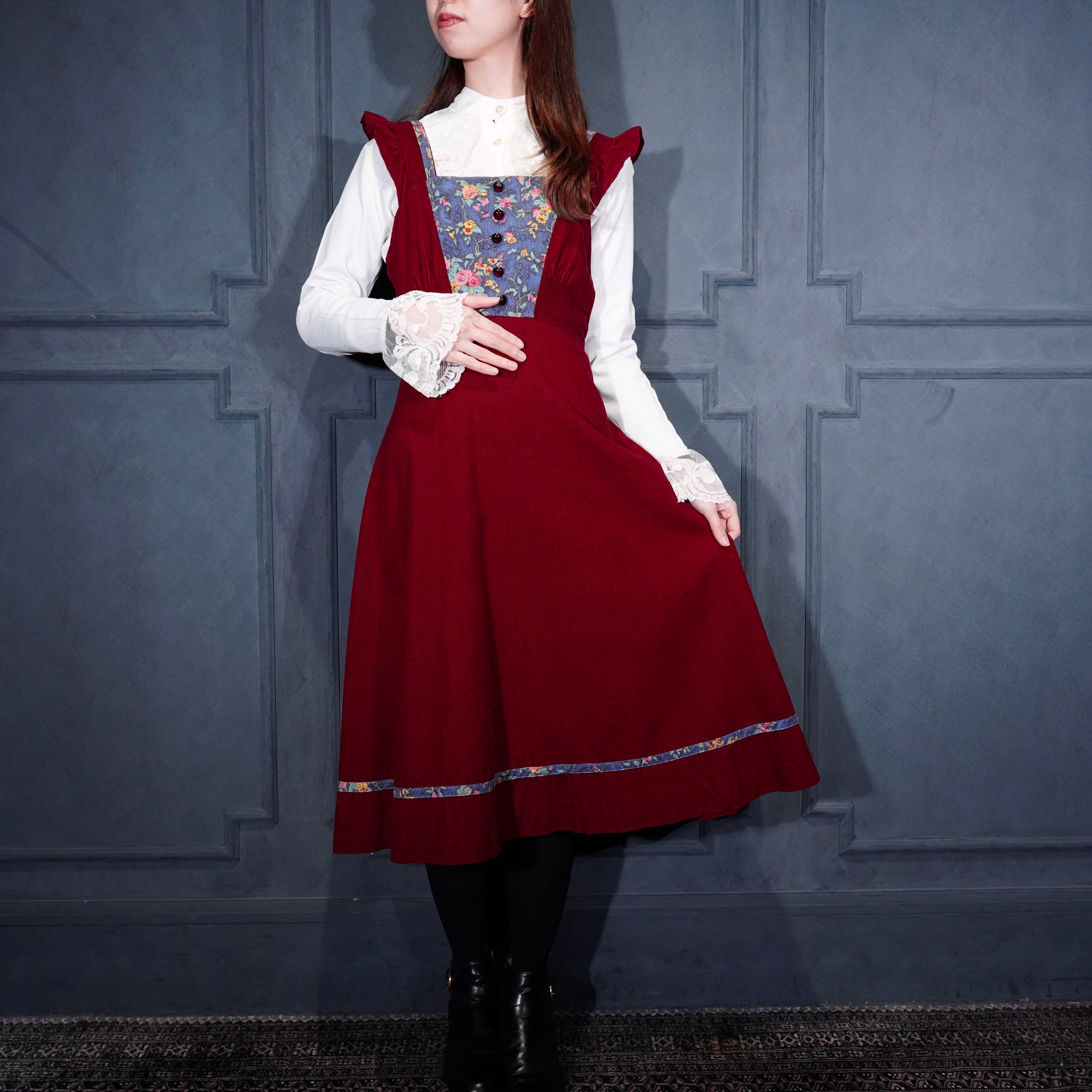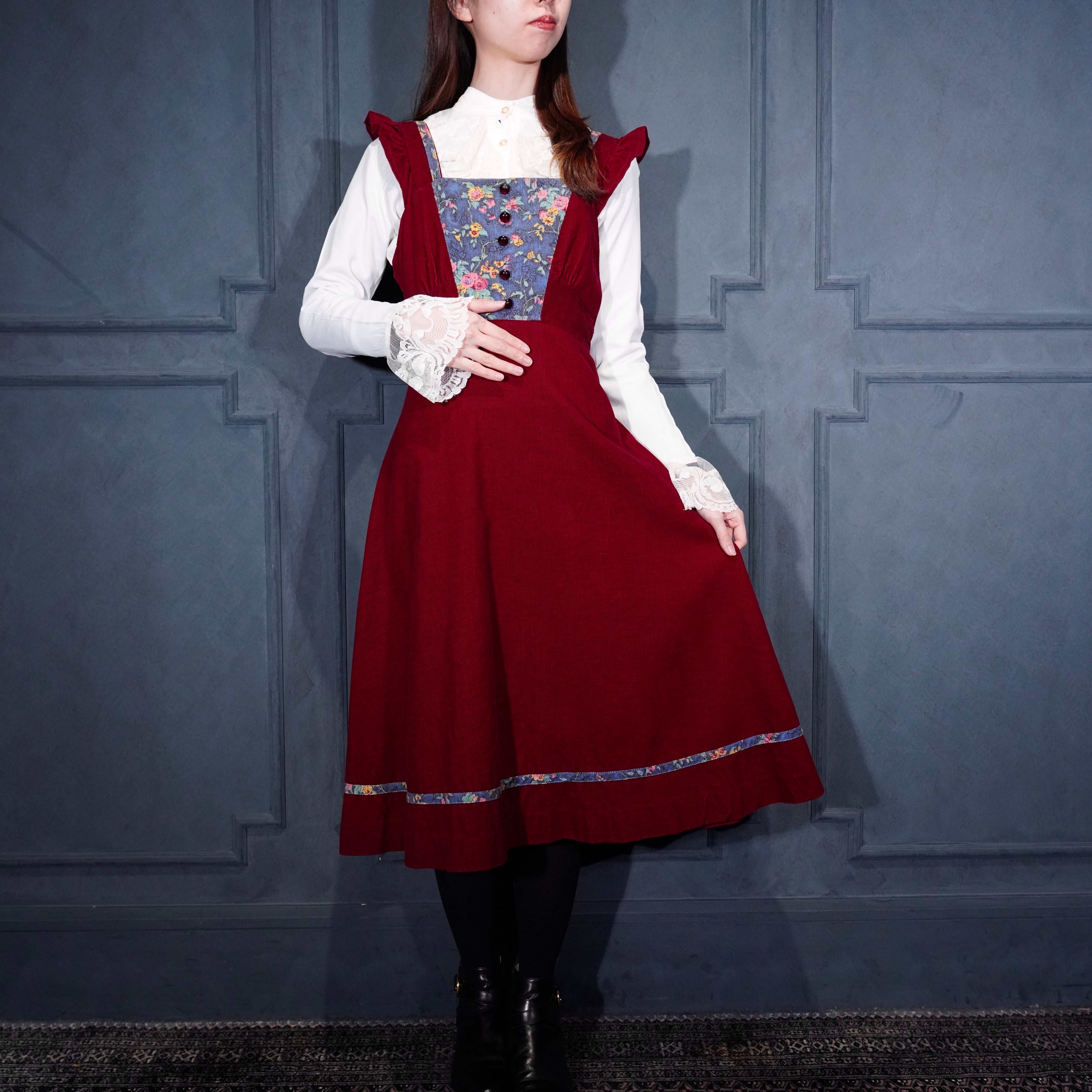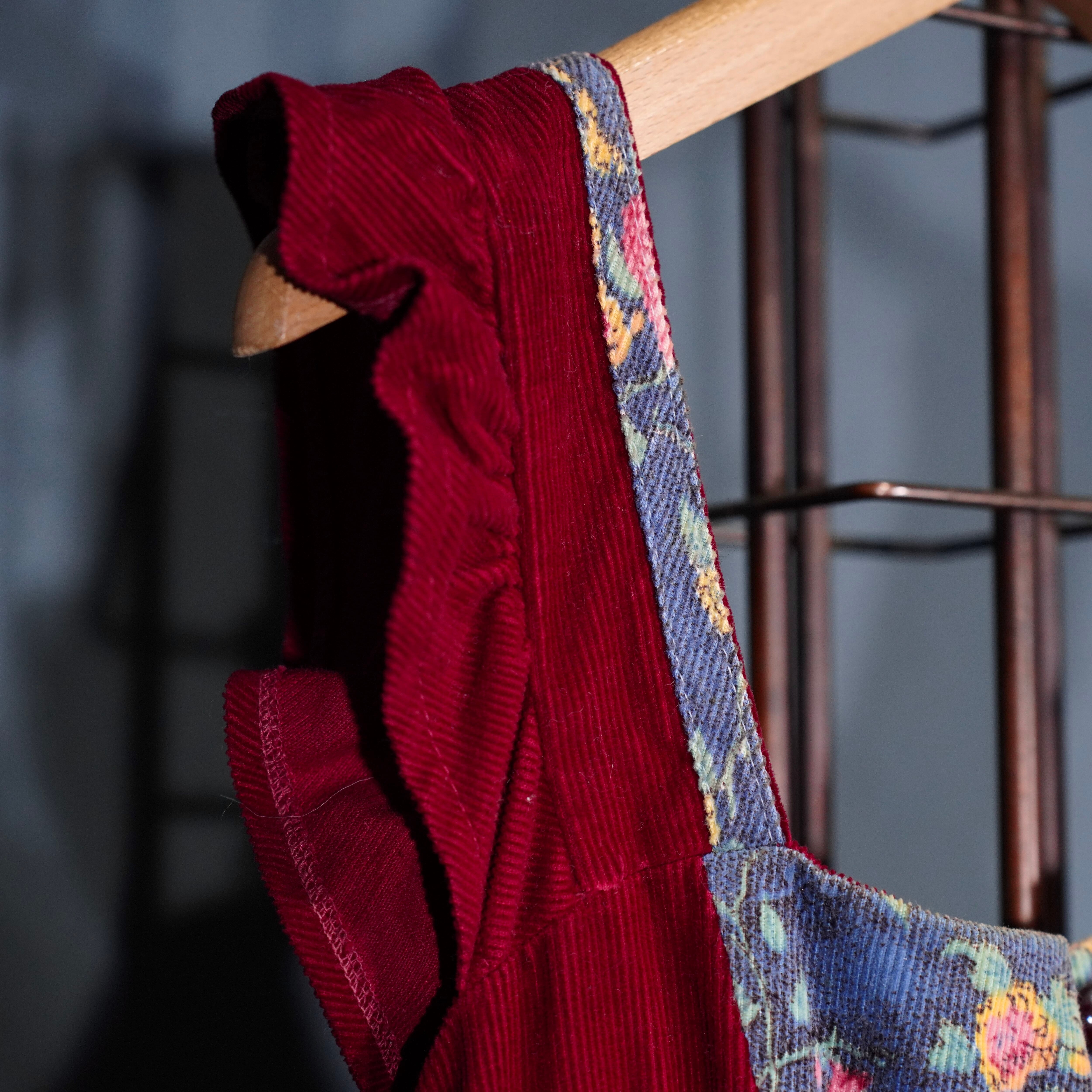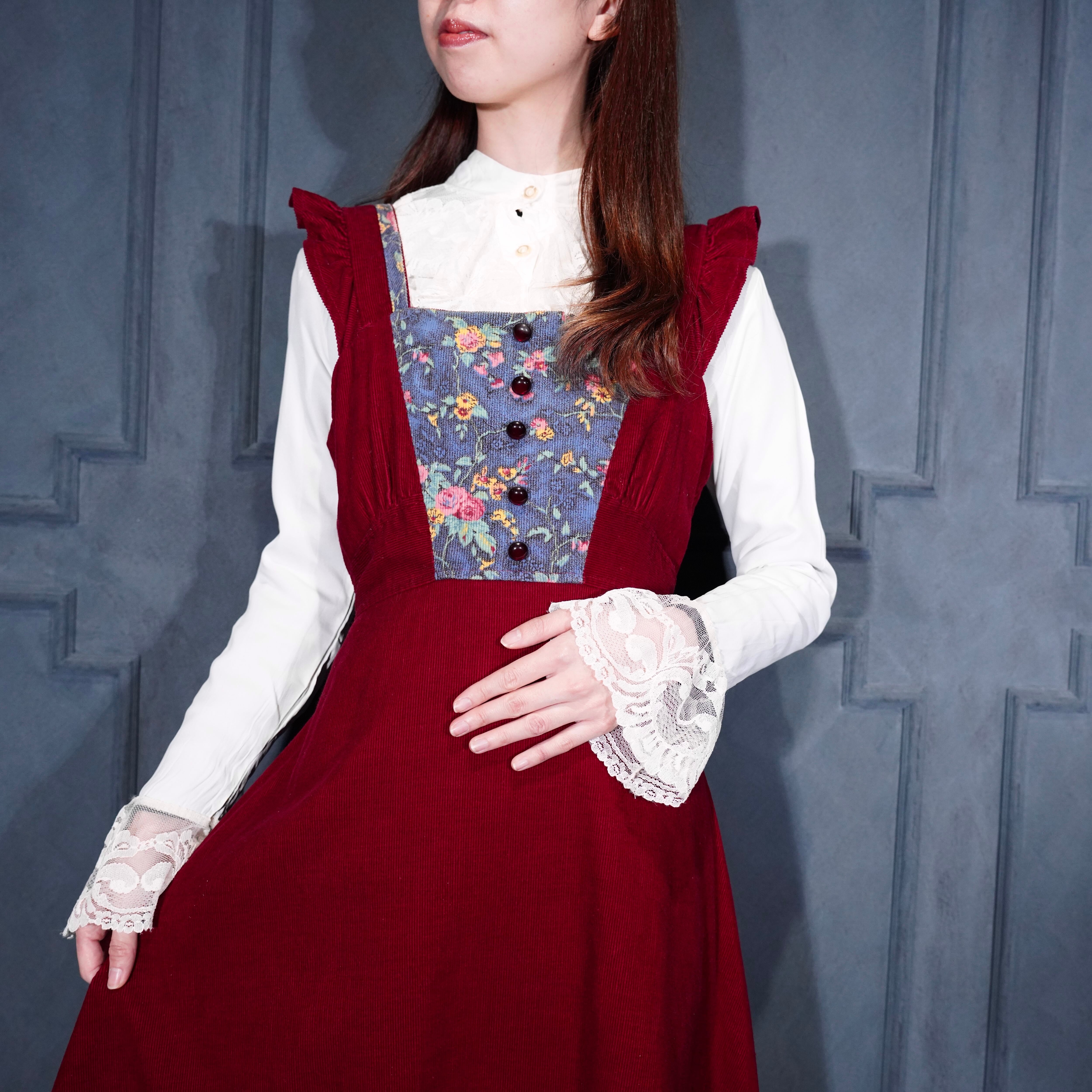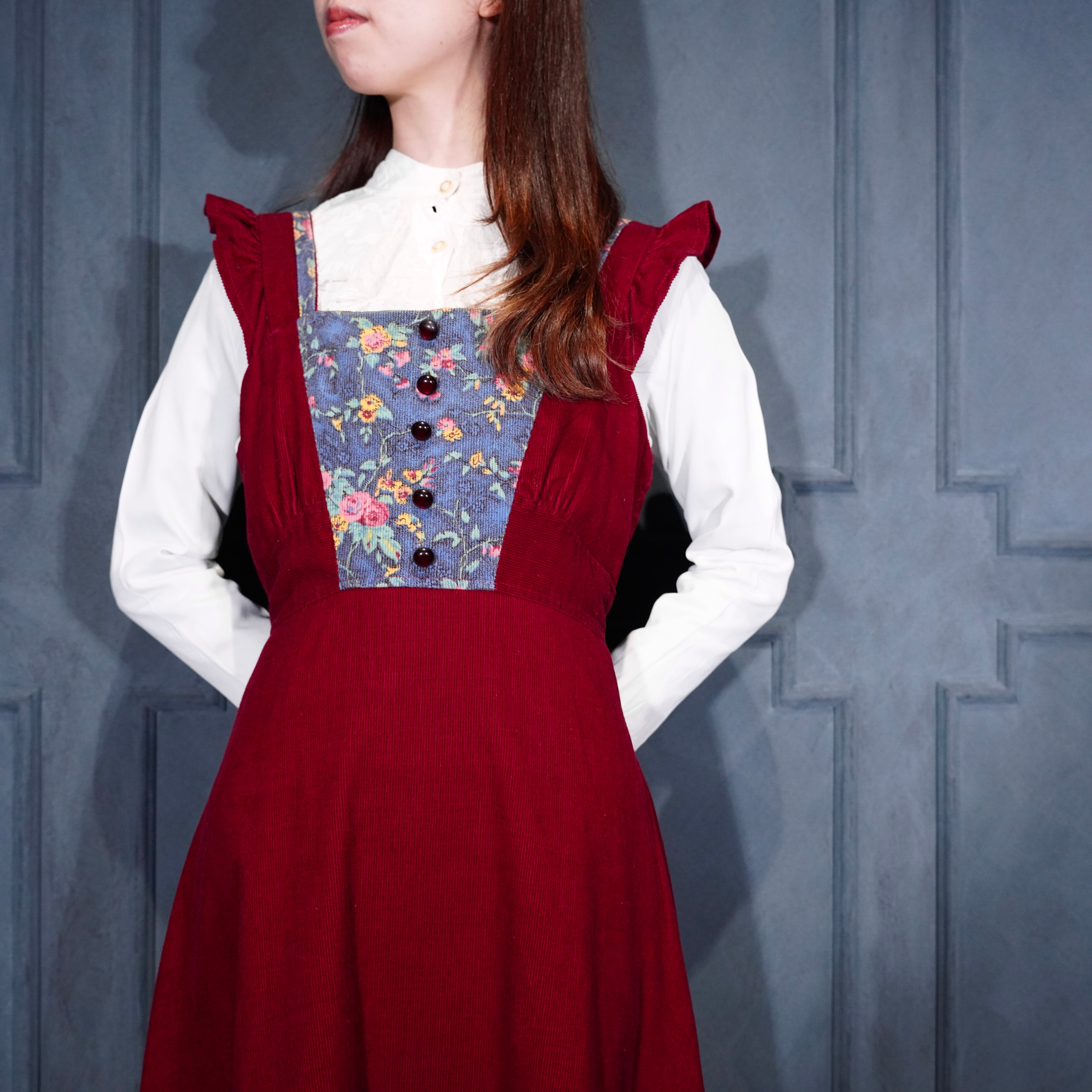 70’s USA VINTAGE Sears FLOWER PATTERNED SWITCHED BACK RIBBON FRILL DESIGN CORDULOY NO SLEEVE ONE PIECE/70年代アメリカ古着シアーズお花柄切り替えバックリボンフリルデザインコーデュロイワンピース