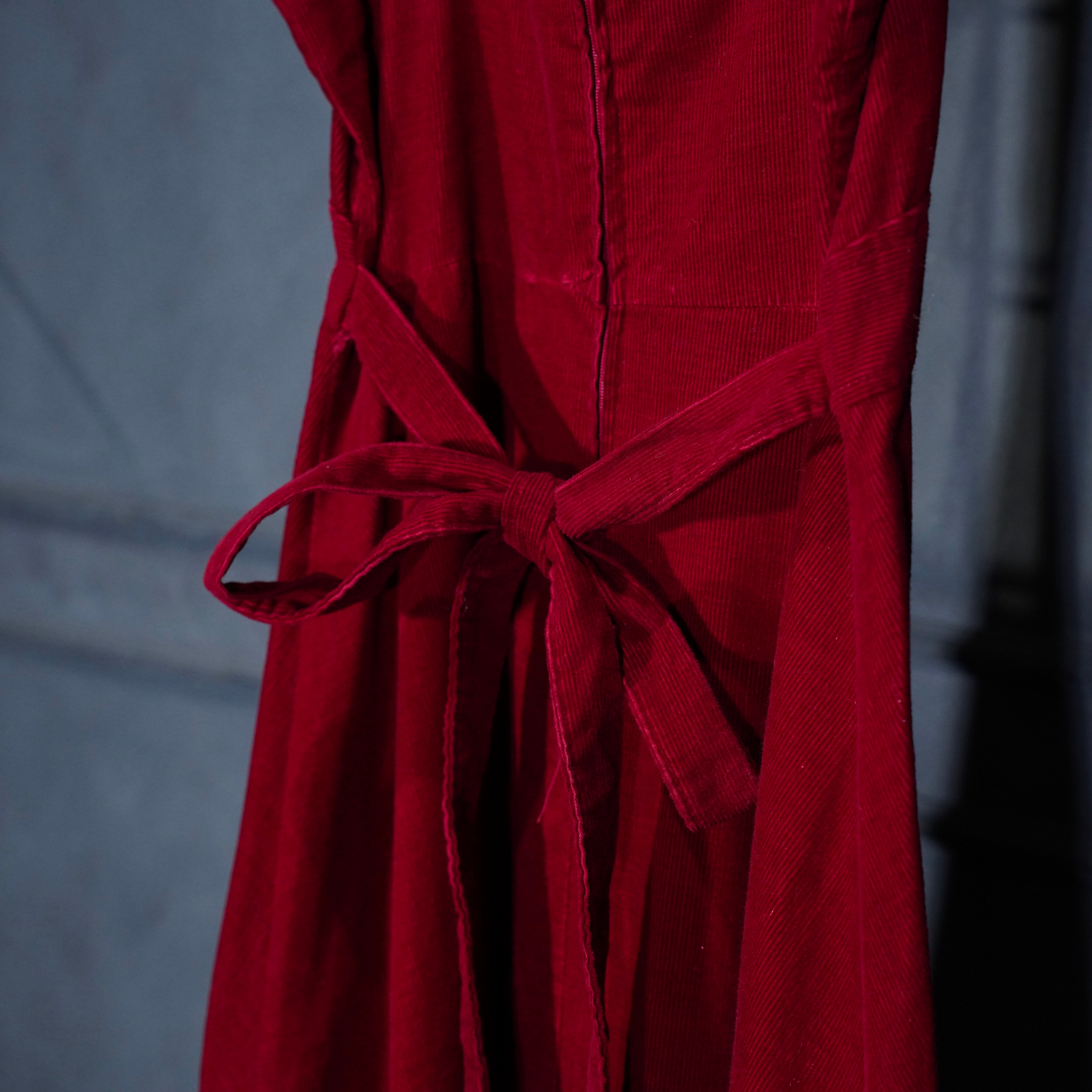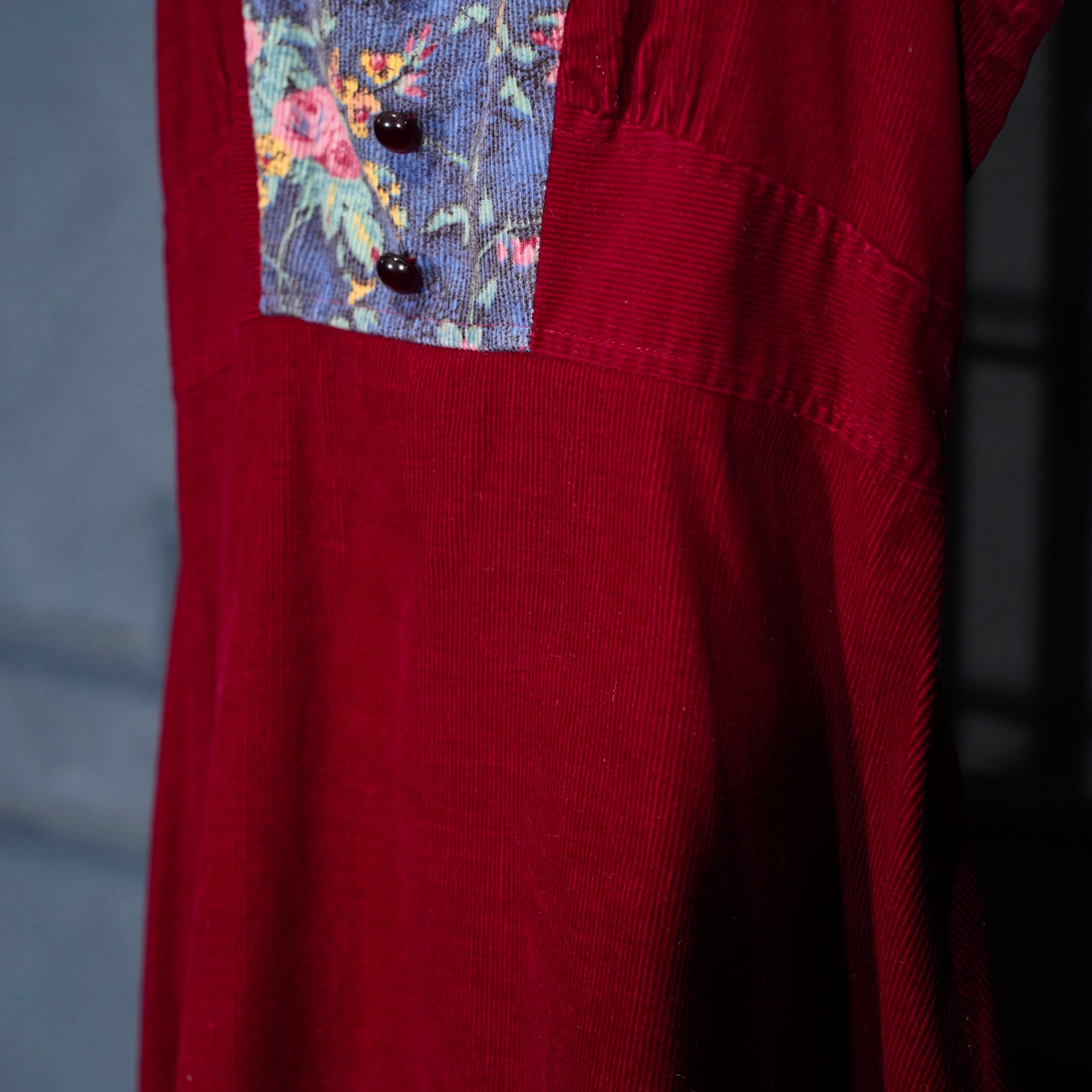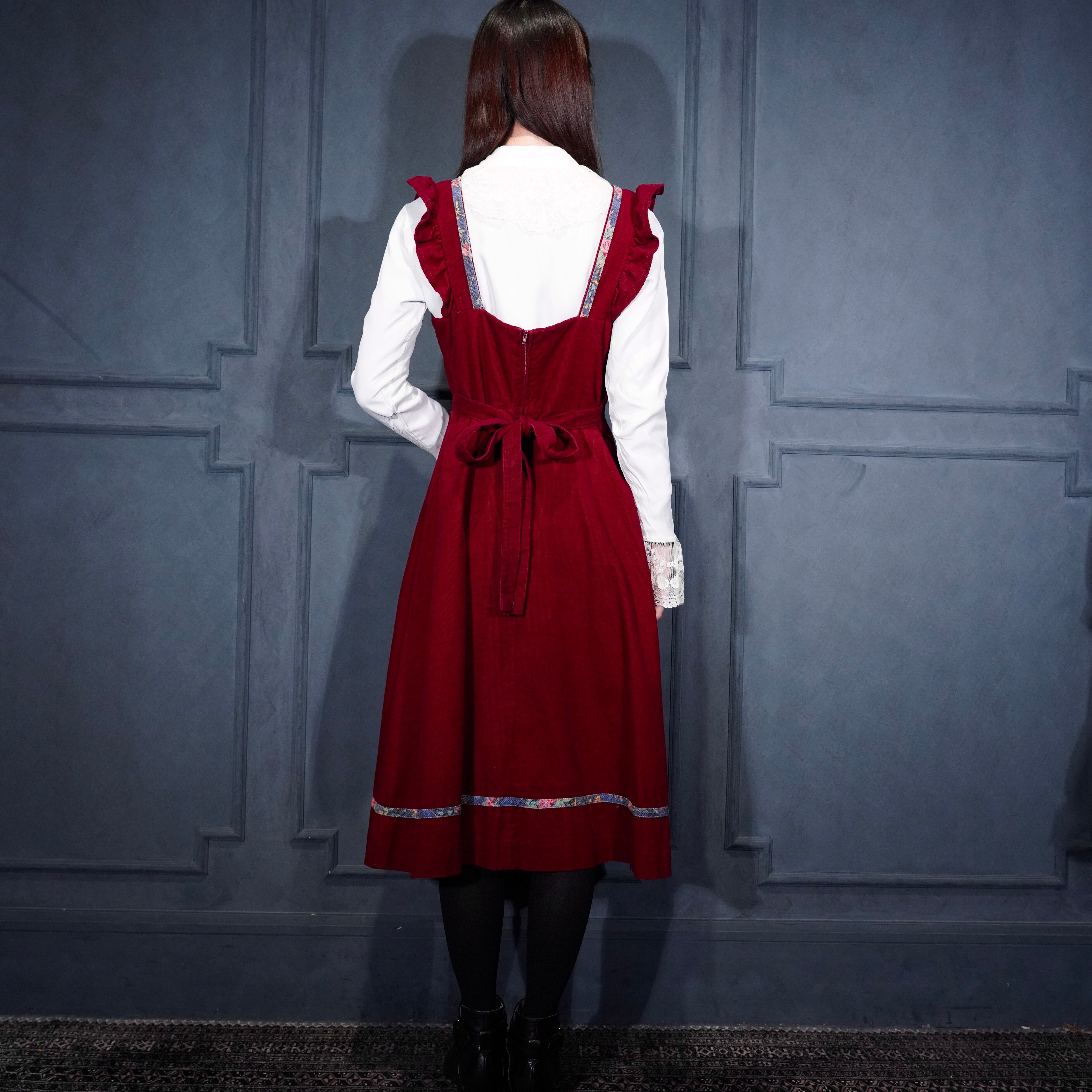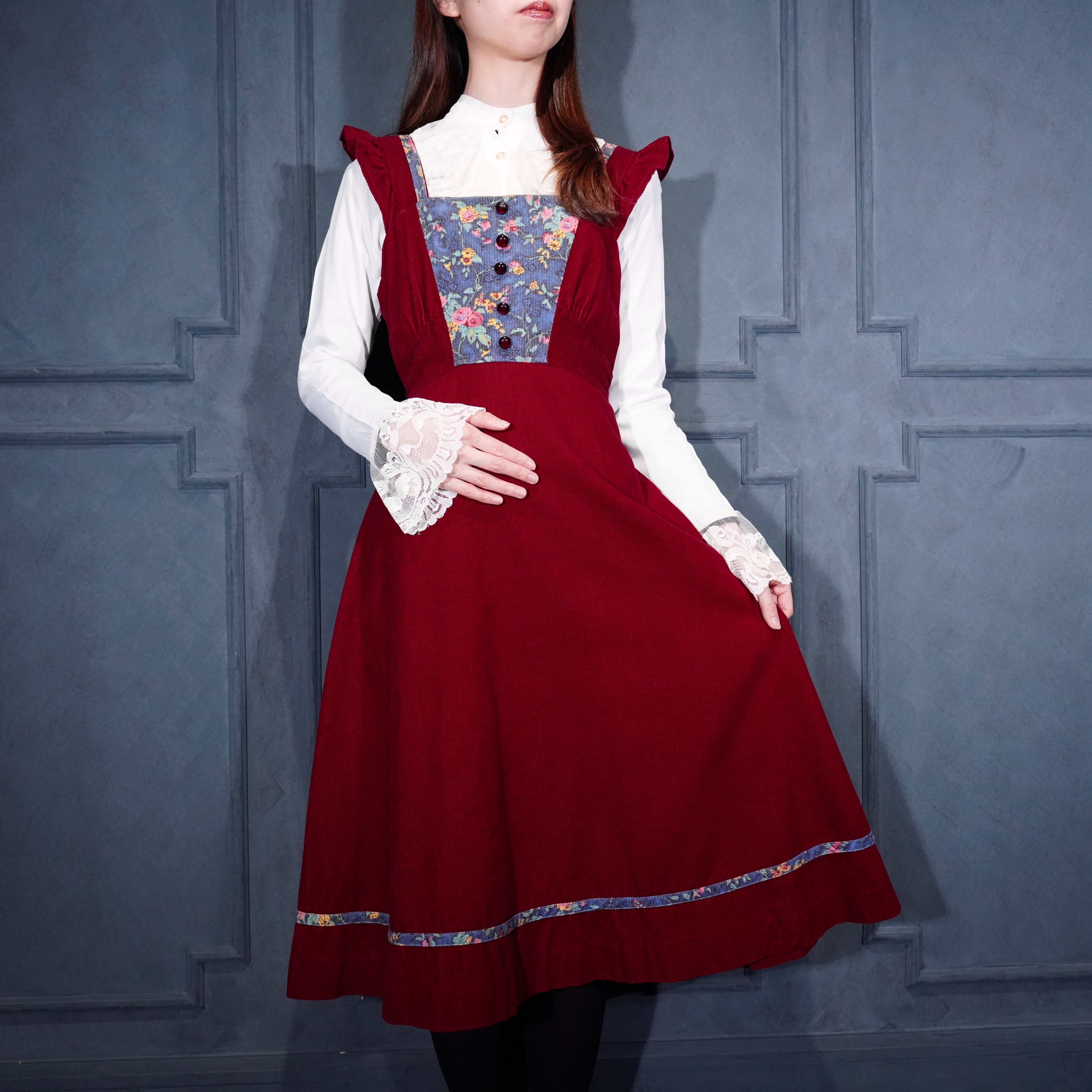 70’s USA VINTAGE Sears FLOWER PATTERNED SWITCHED BACK RIBBON FRILL DESIGN CORDULOY NO SLEEVE ONE PIECE/70年代アメリカ古着シアーズお花柄切り替えバックリボンフリルデザインコーデュロイワンピース