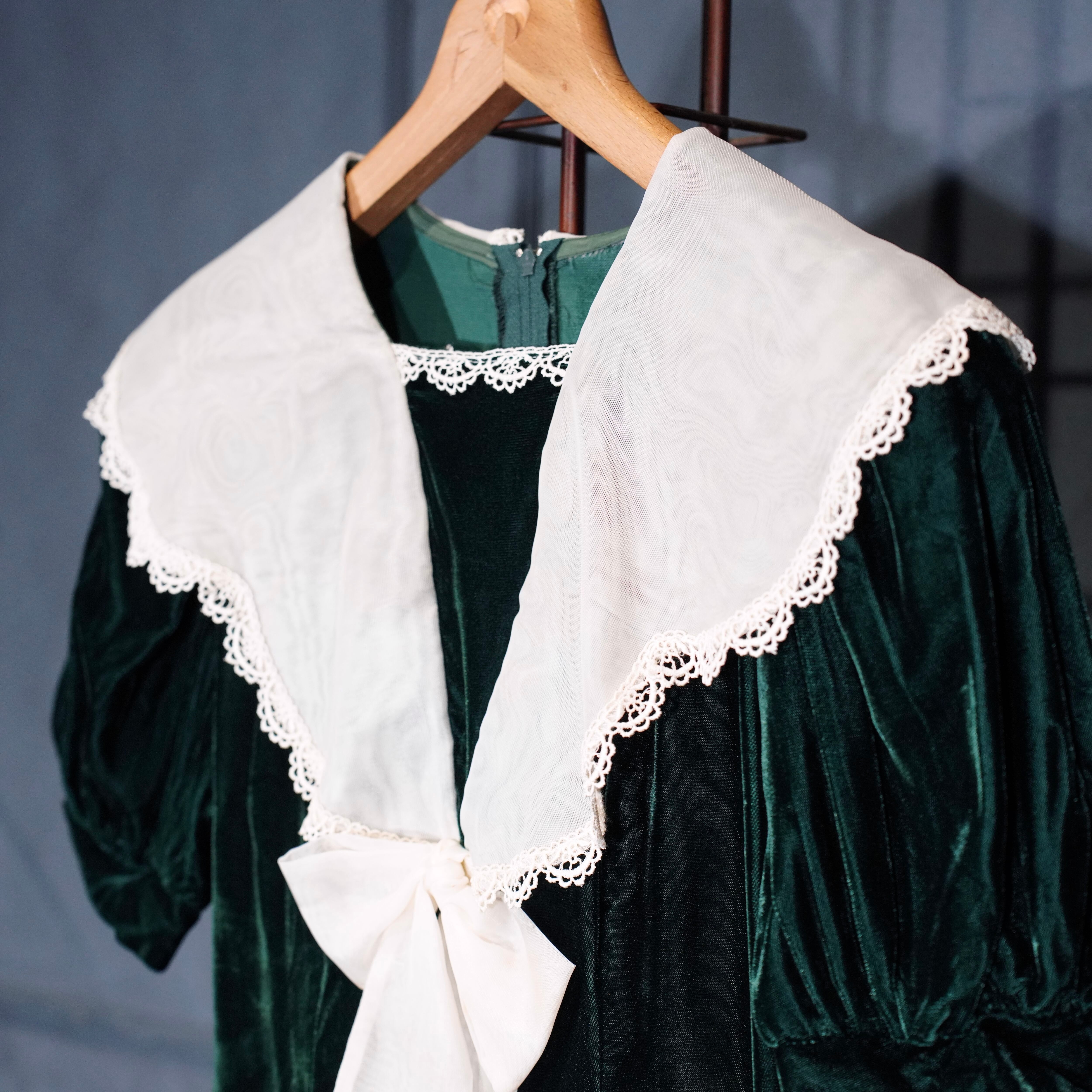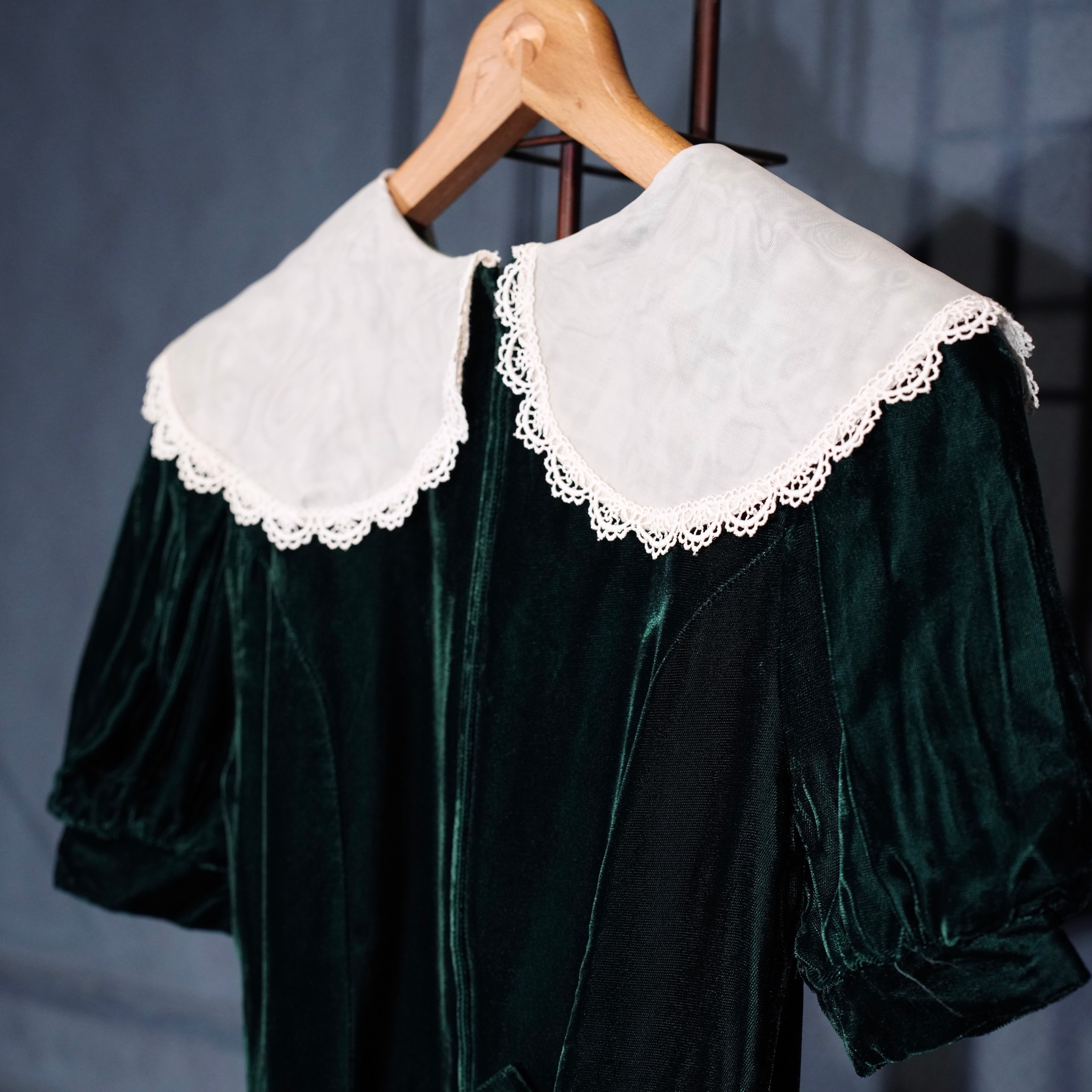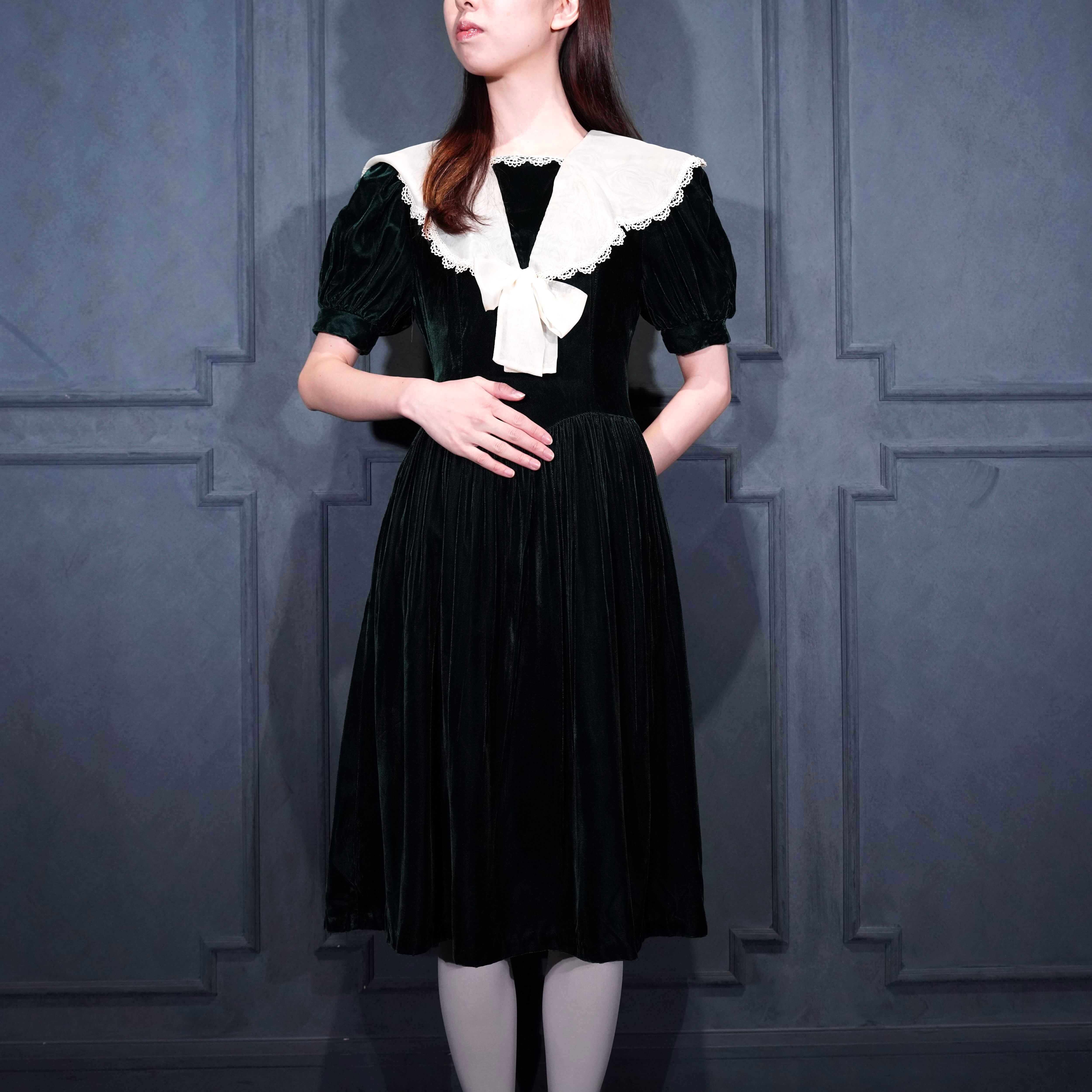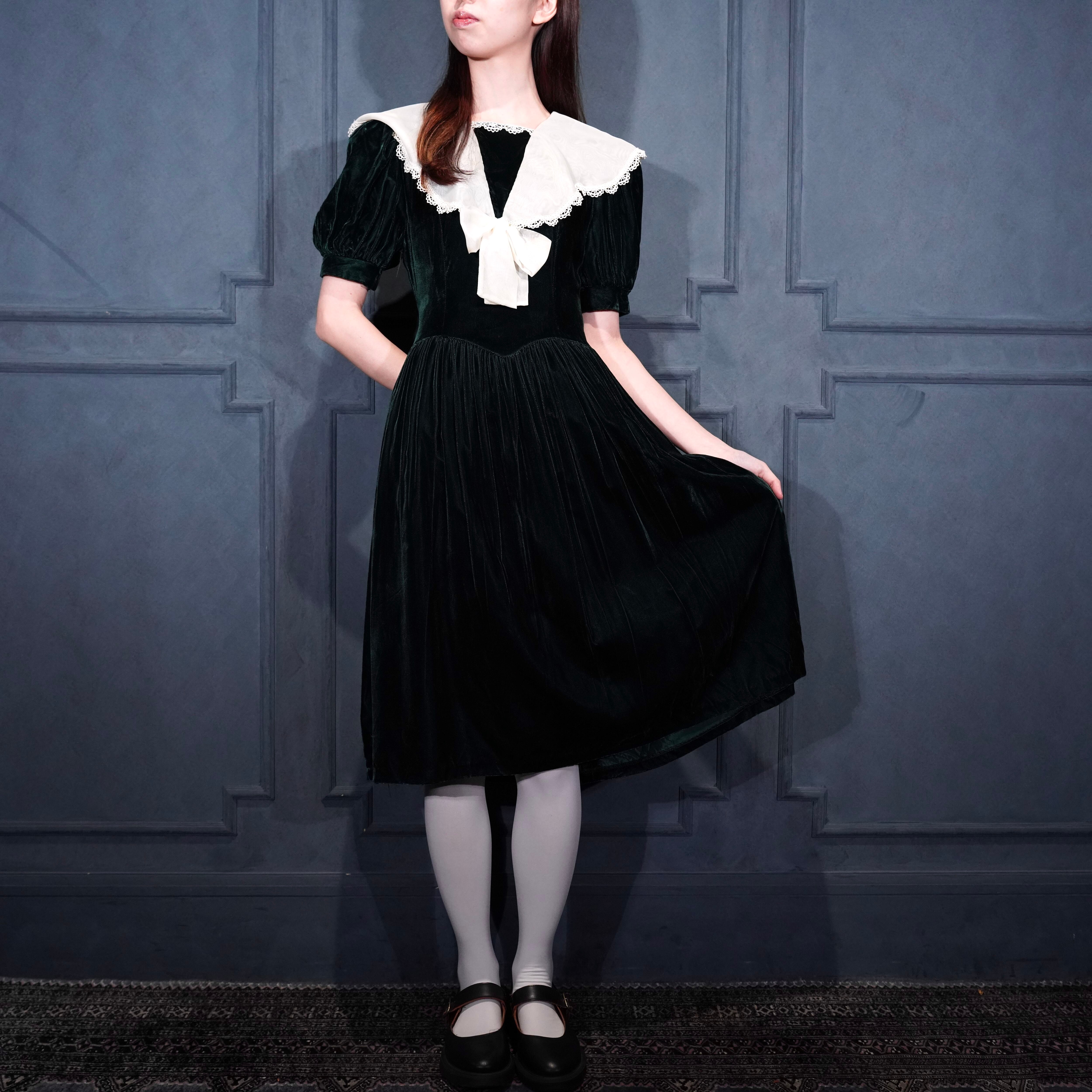 *SPECIAL ITEM* GUNNE SAX By JESSICA McCLINTOCK LACE BIG COLLAR RIBBON DESIGN VELOUR ONE PIECE/アメリカ古着ガニーサックスレースビッグカラーリボンデザインベロアワンピース