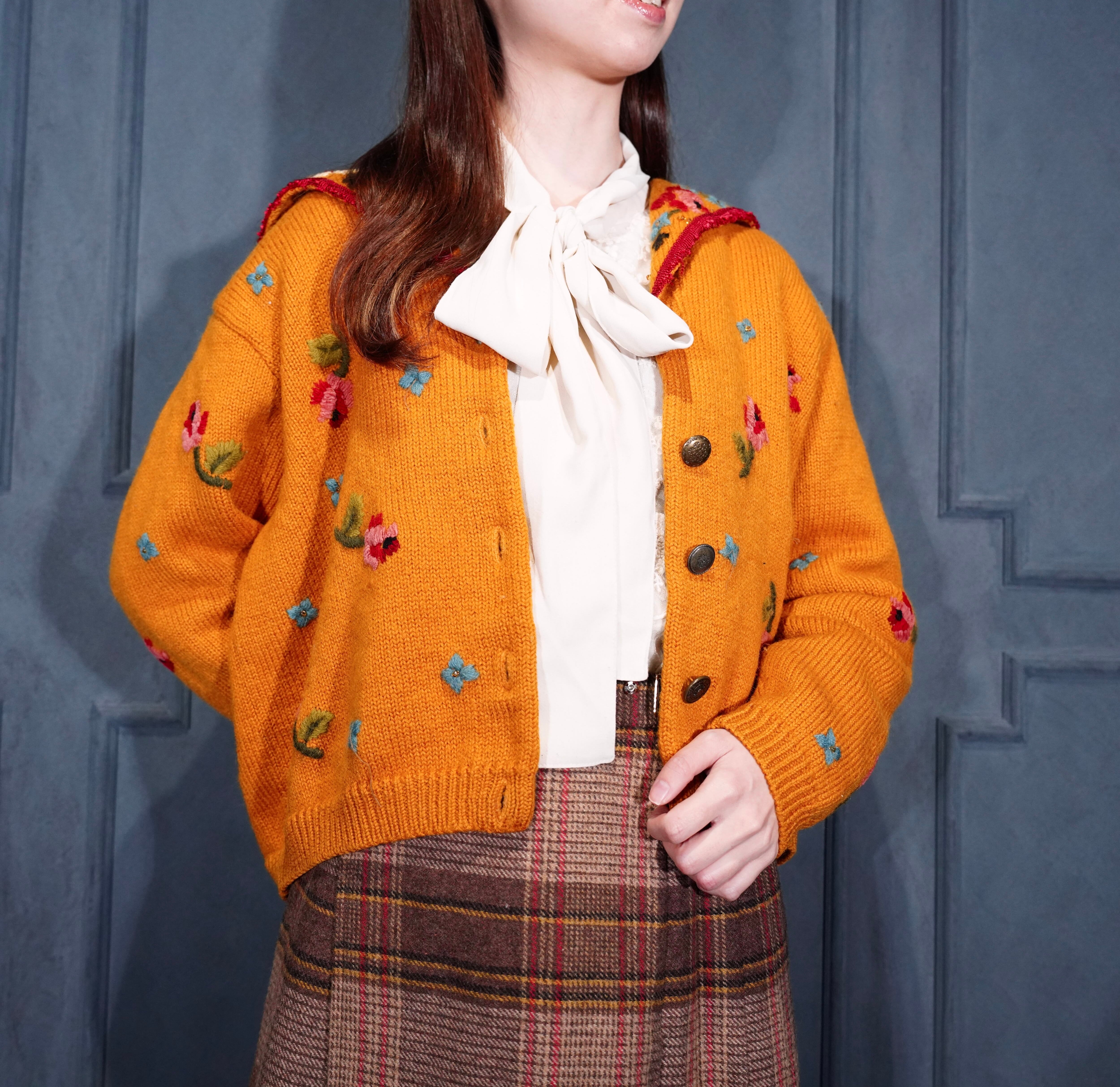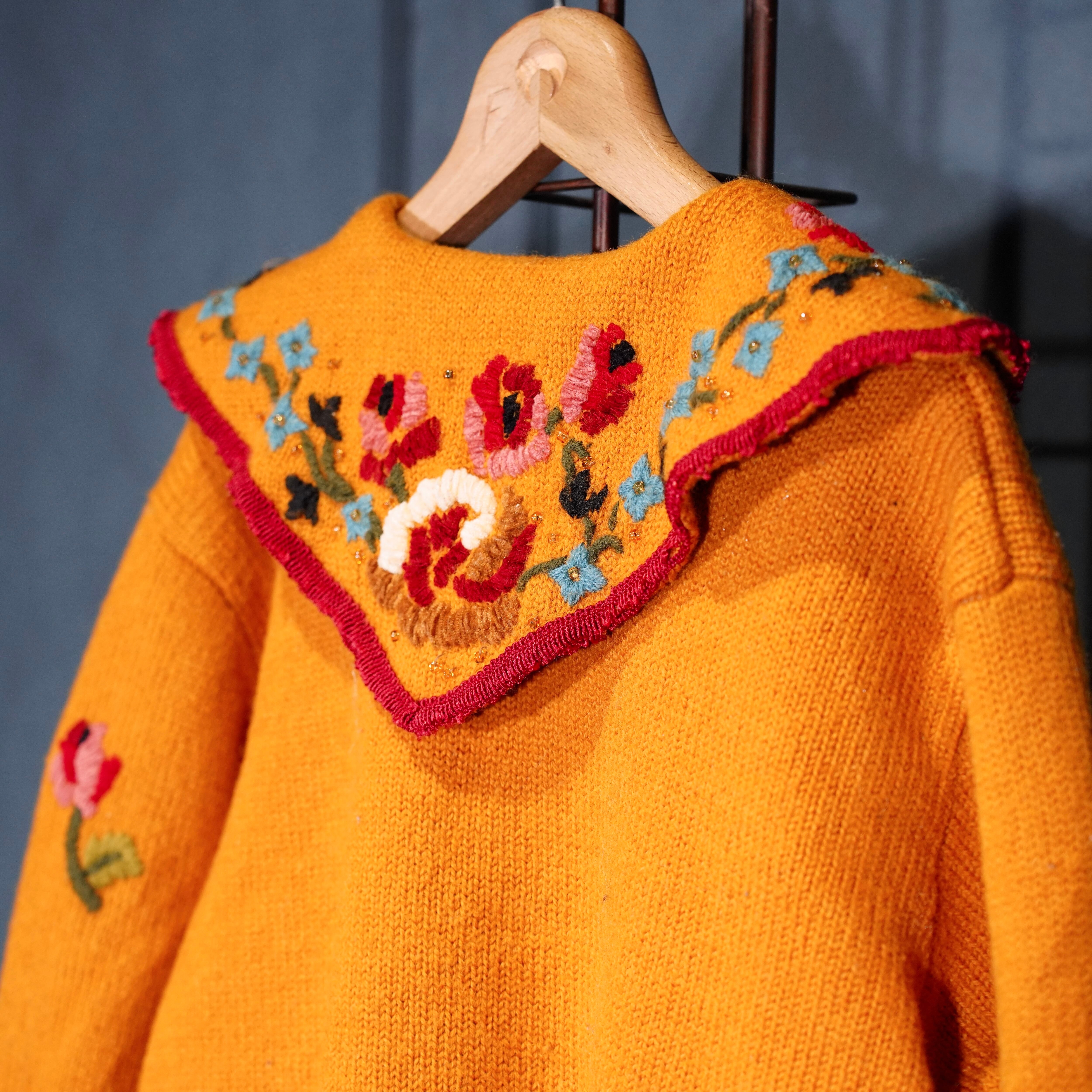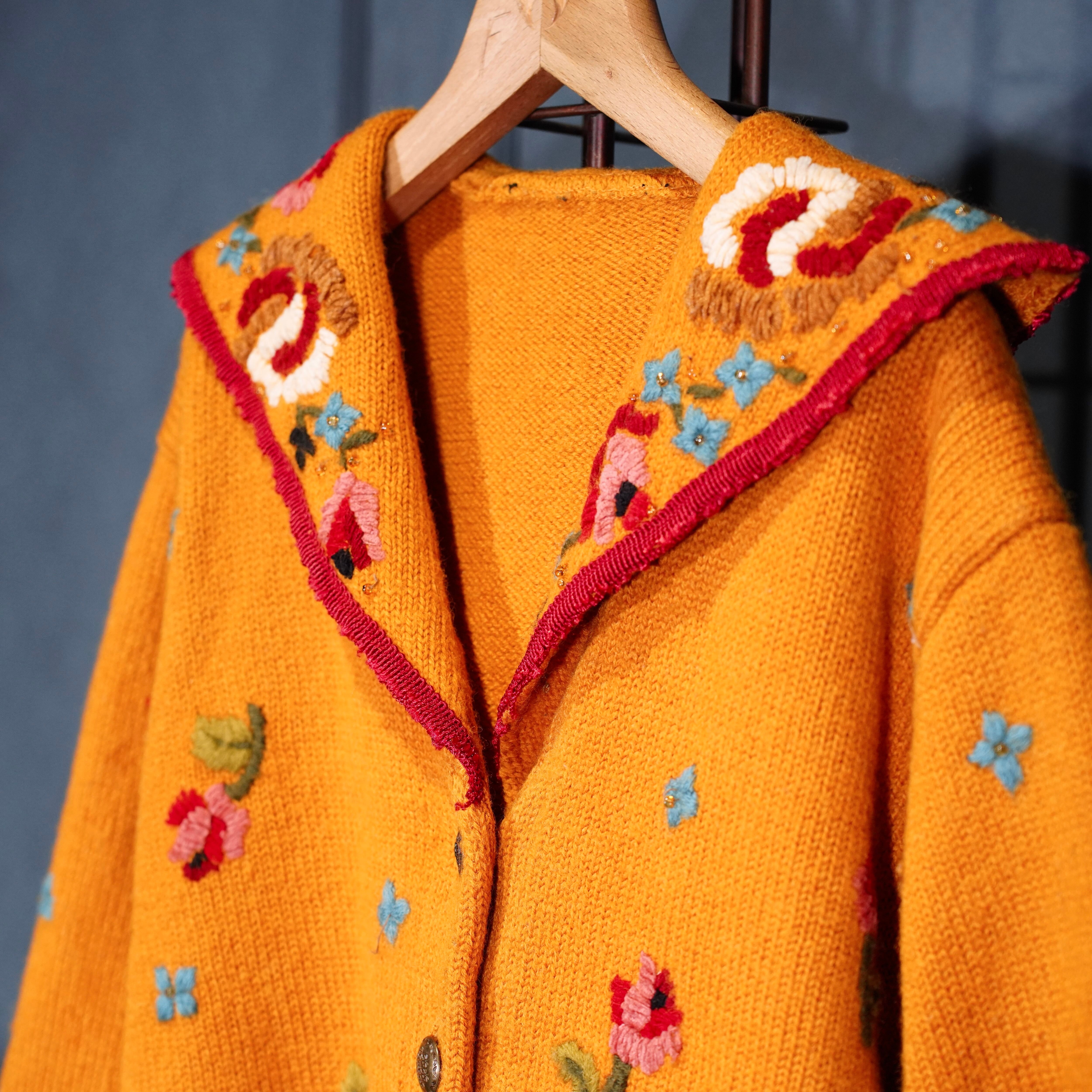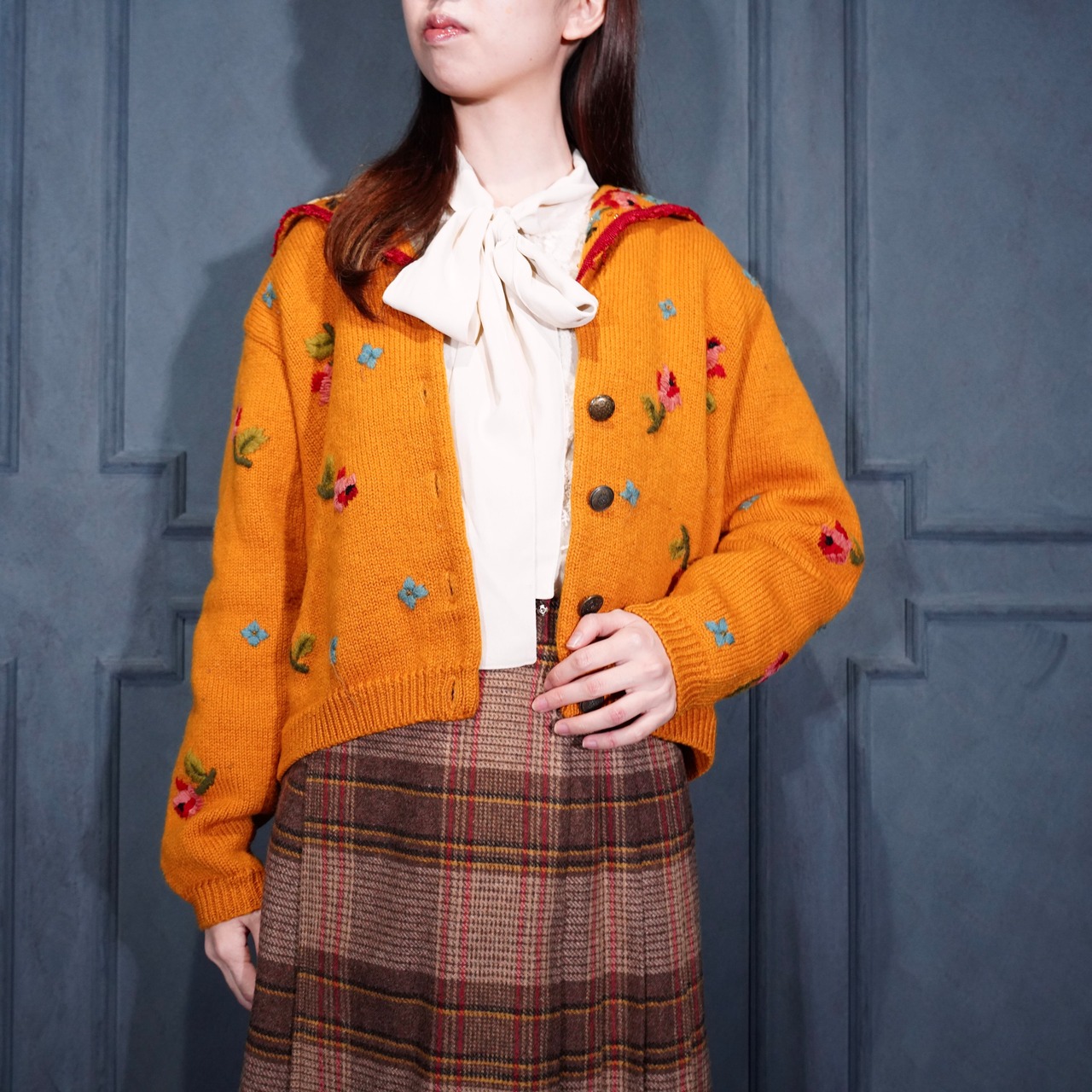 60's USA VINTAGE FLOWER EMBROIDERY DESIGN SAILER COLLAR DESIGN KNIT CARDIGAN/60年代アメリカ古着お花刺繍セーラーカラーデザインニットカーディガン