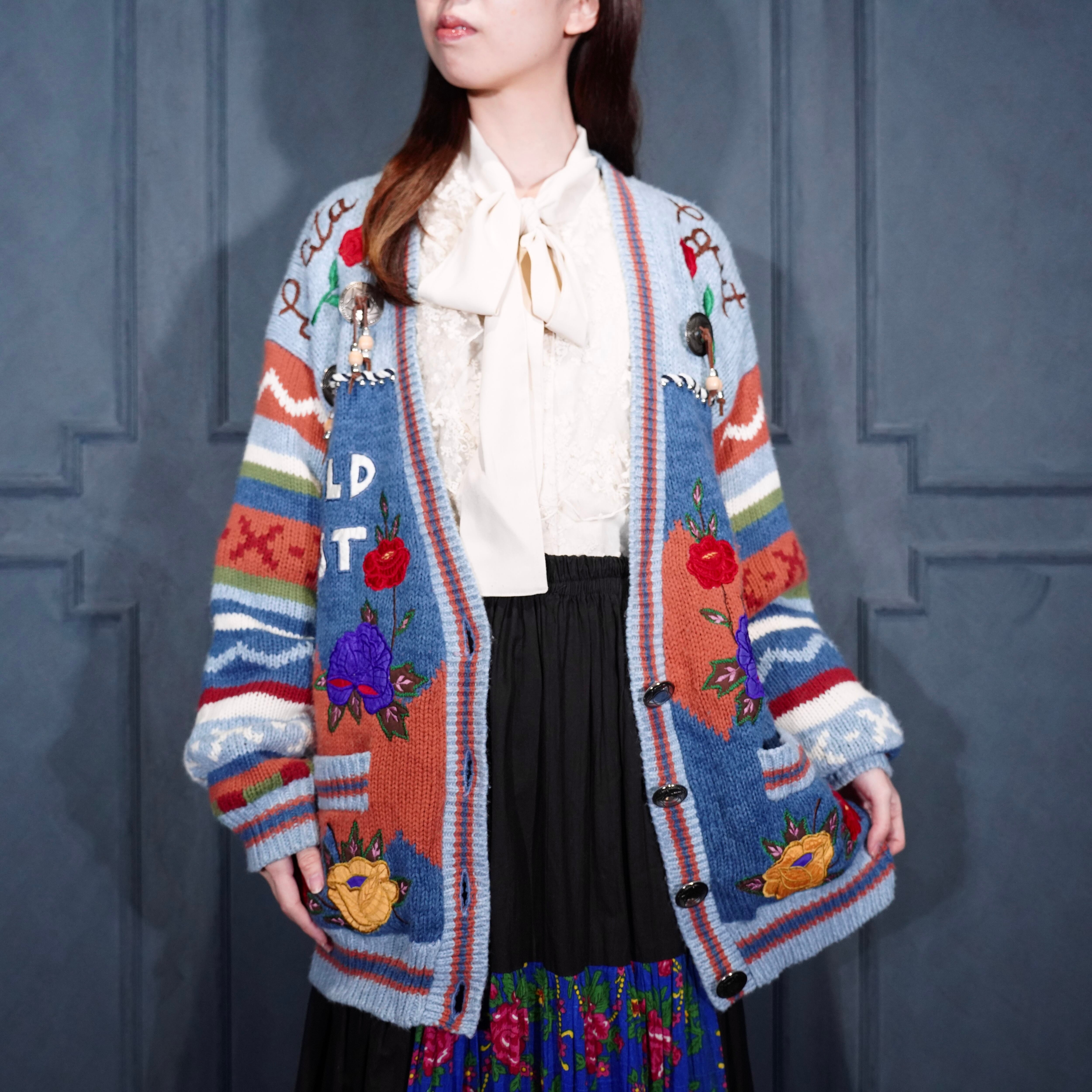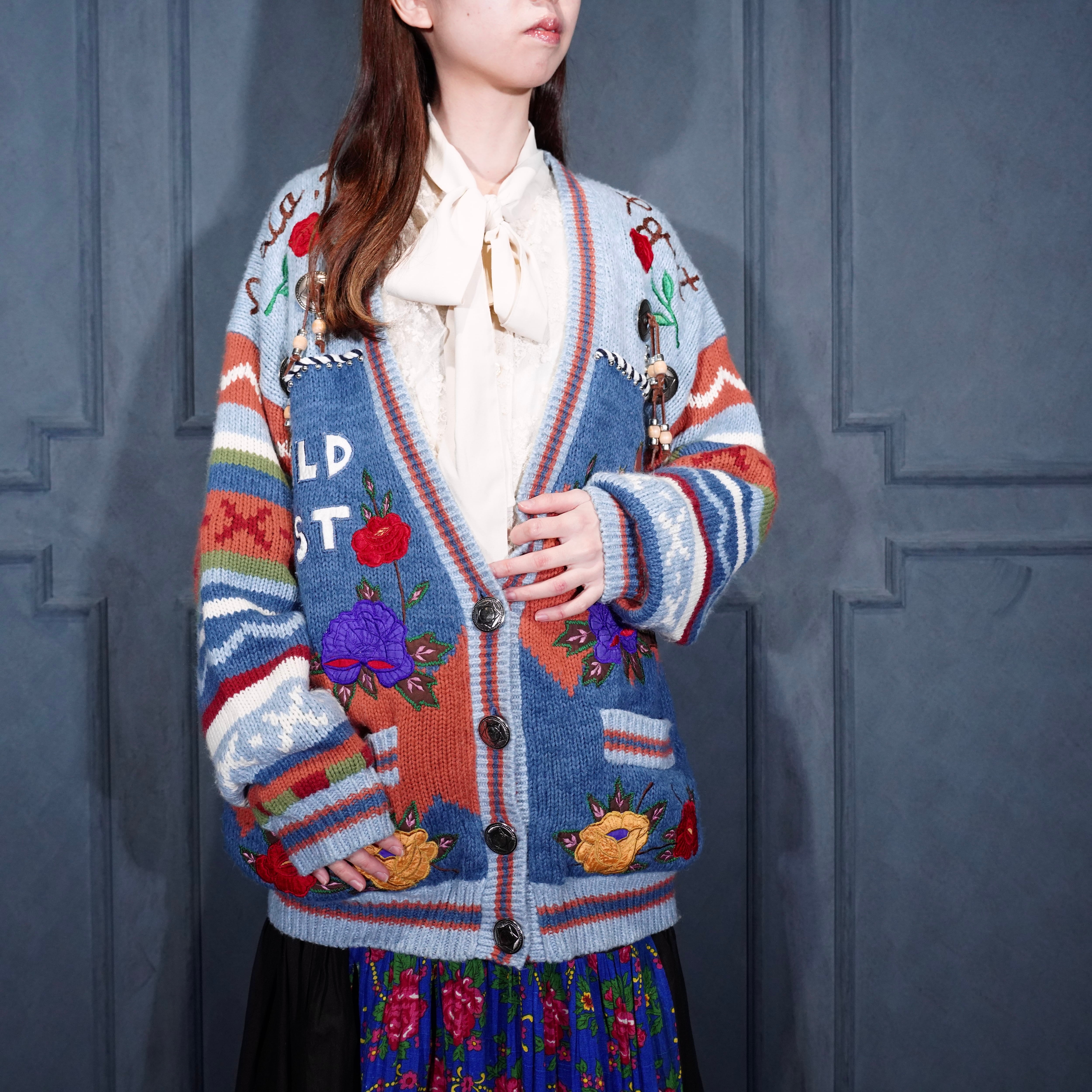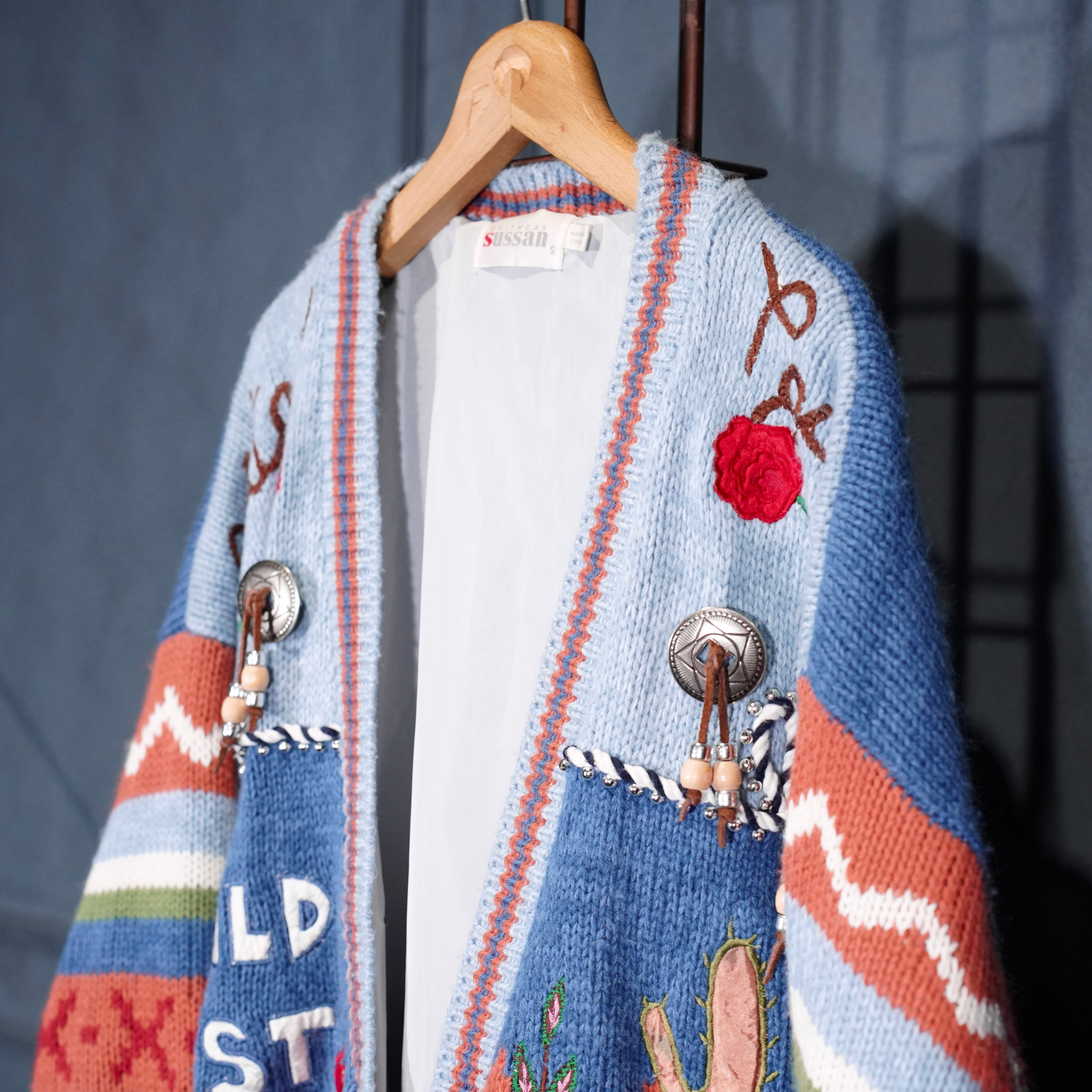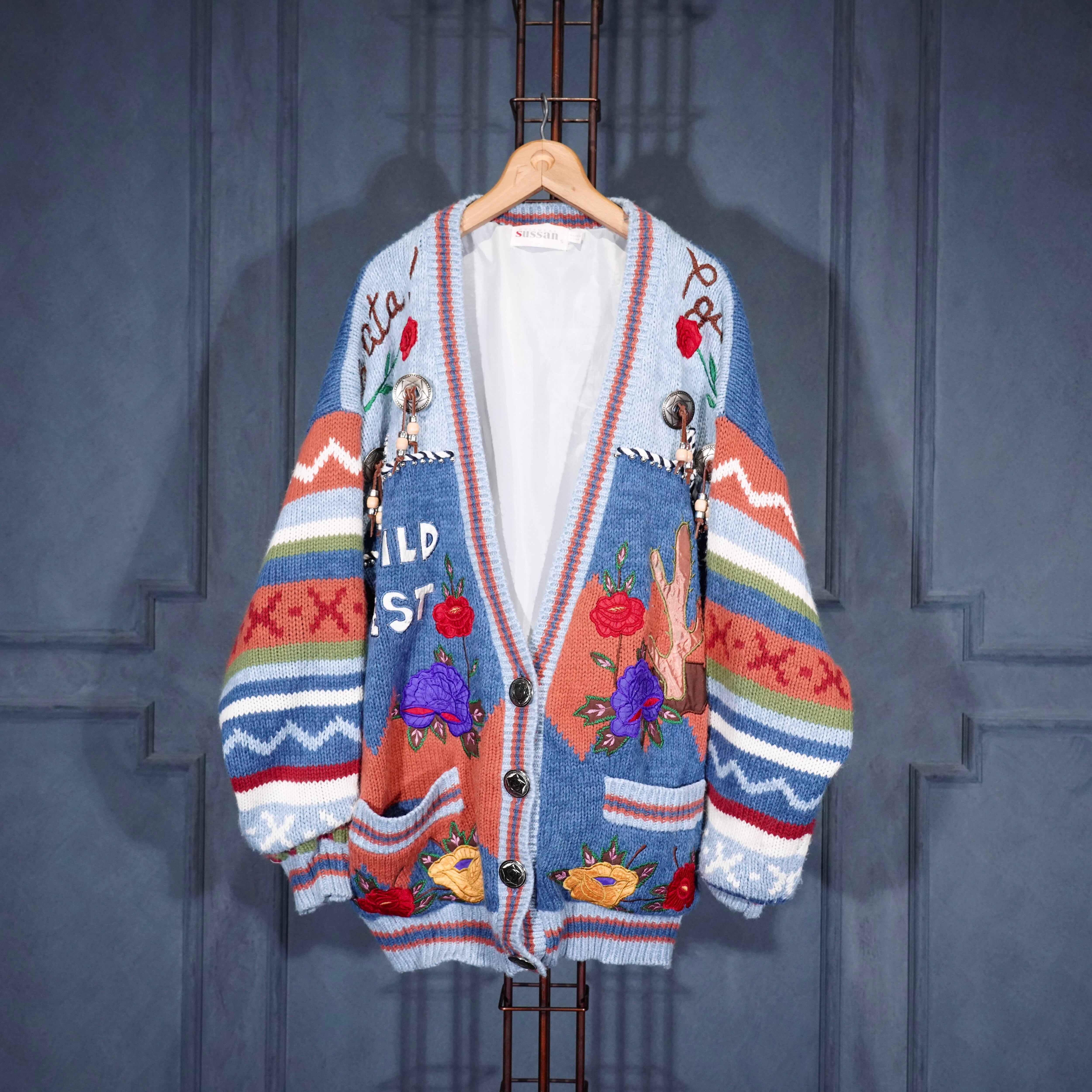 USA VINTAGE sussan KNITWEAR CONCHO BUTTON FLOWER EMBROIDERY DESIGN KNIT CARDIGAN/アメリカ古着コンチョボタンお花刺繍デザインニットカーディガン