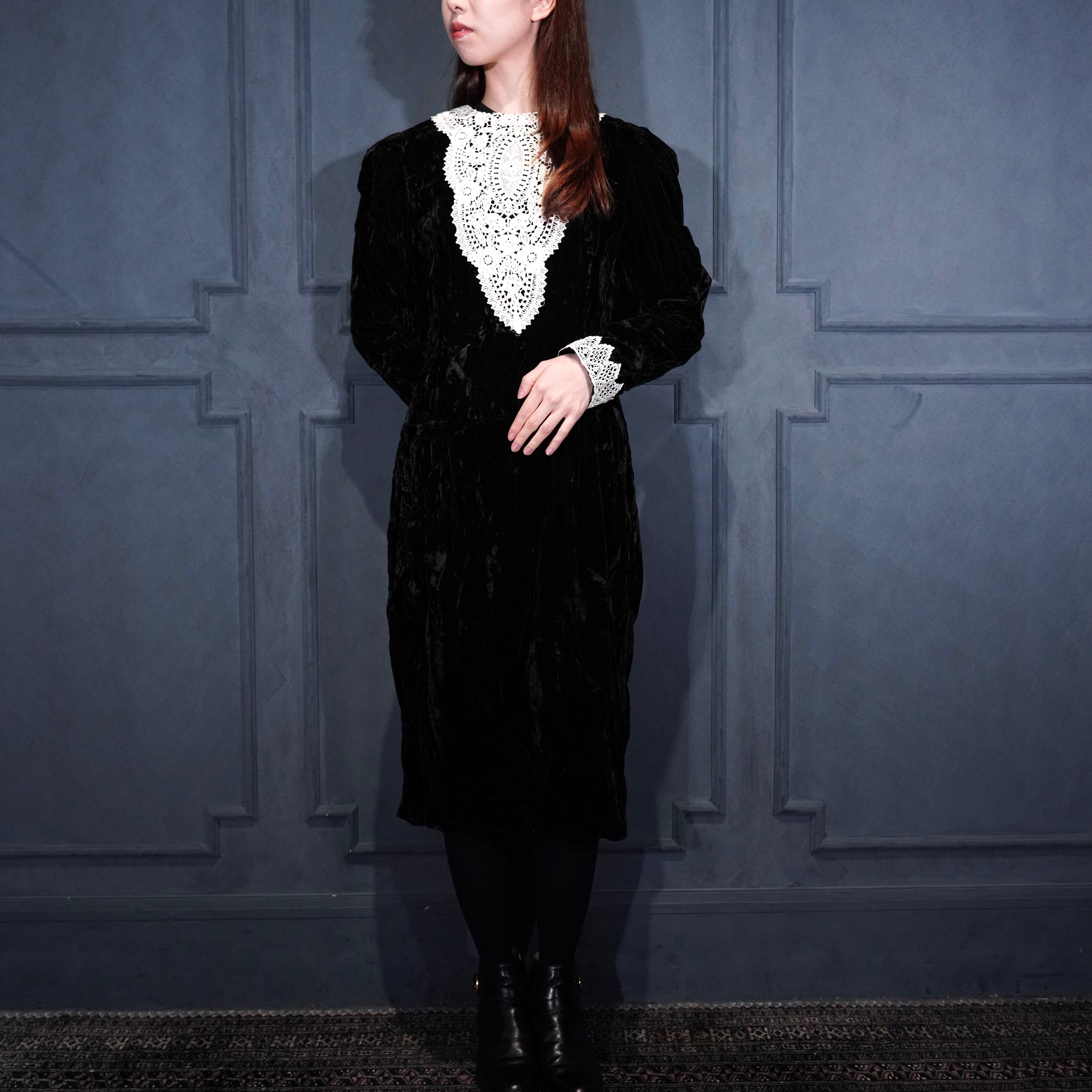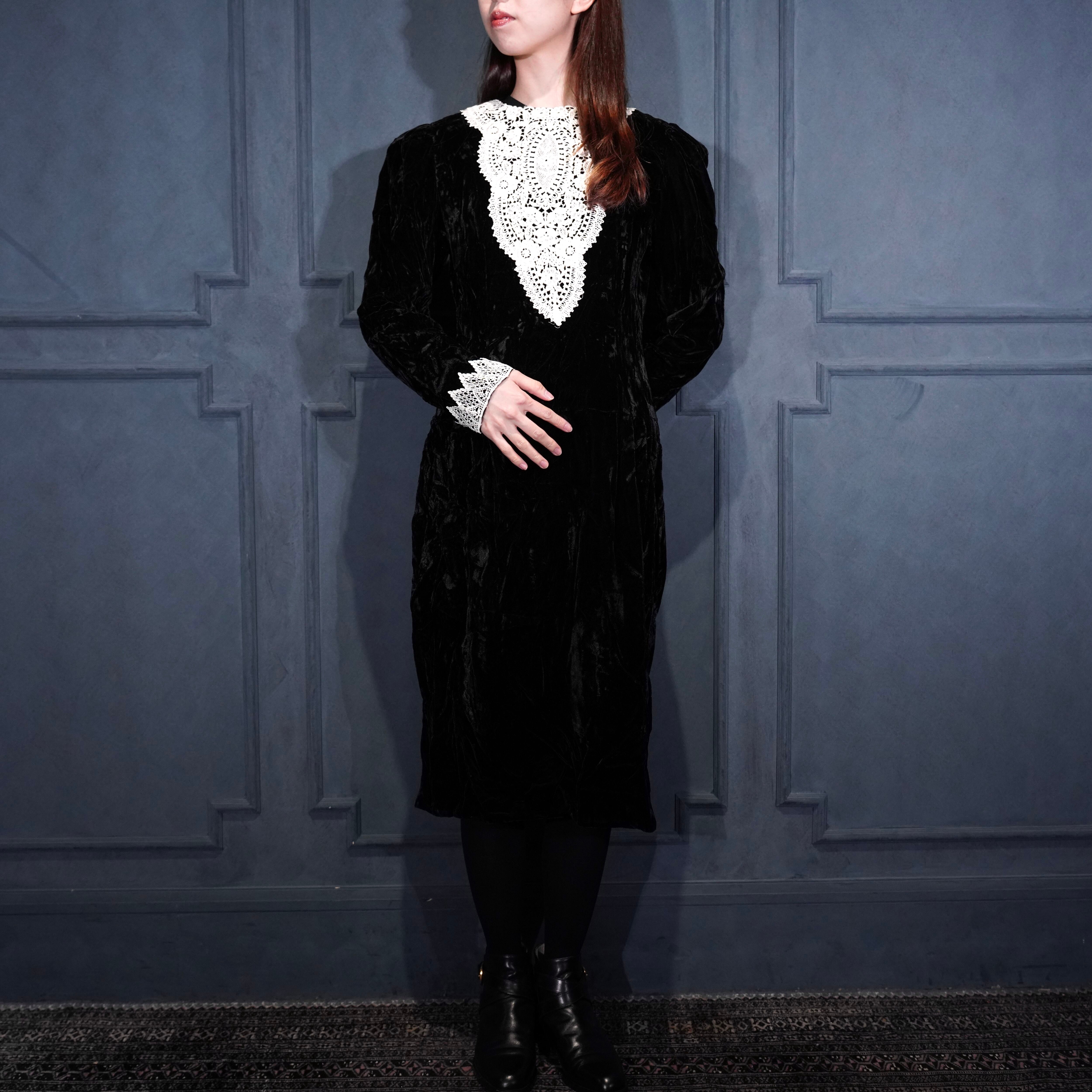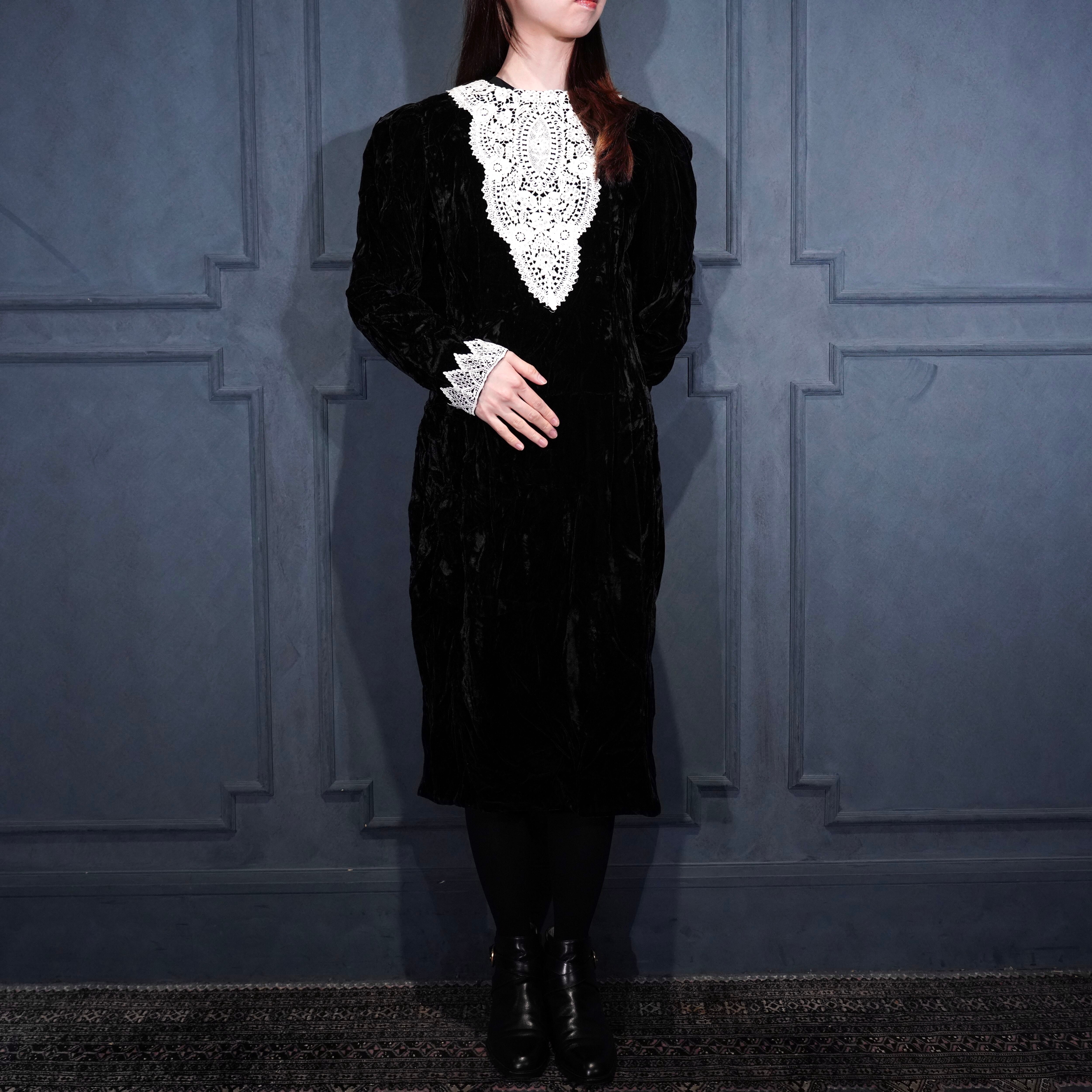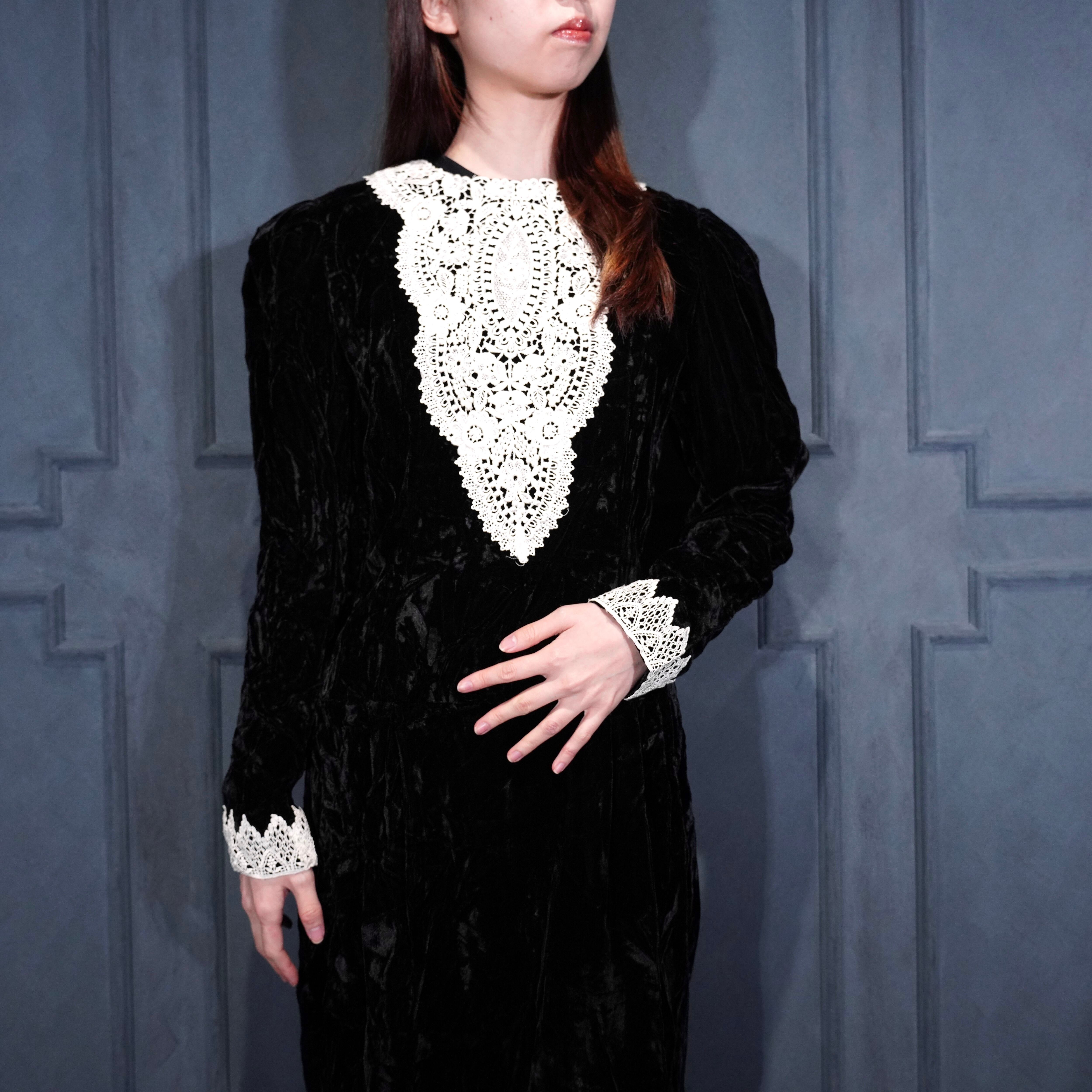 70's USA VINTAGE LACE DESIGN VELOUR DRESS ONE PIECE/70年代アメリカ古着レースデザインドレスワンピース