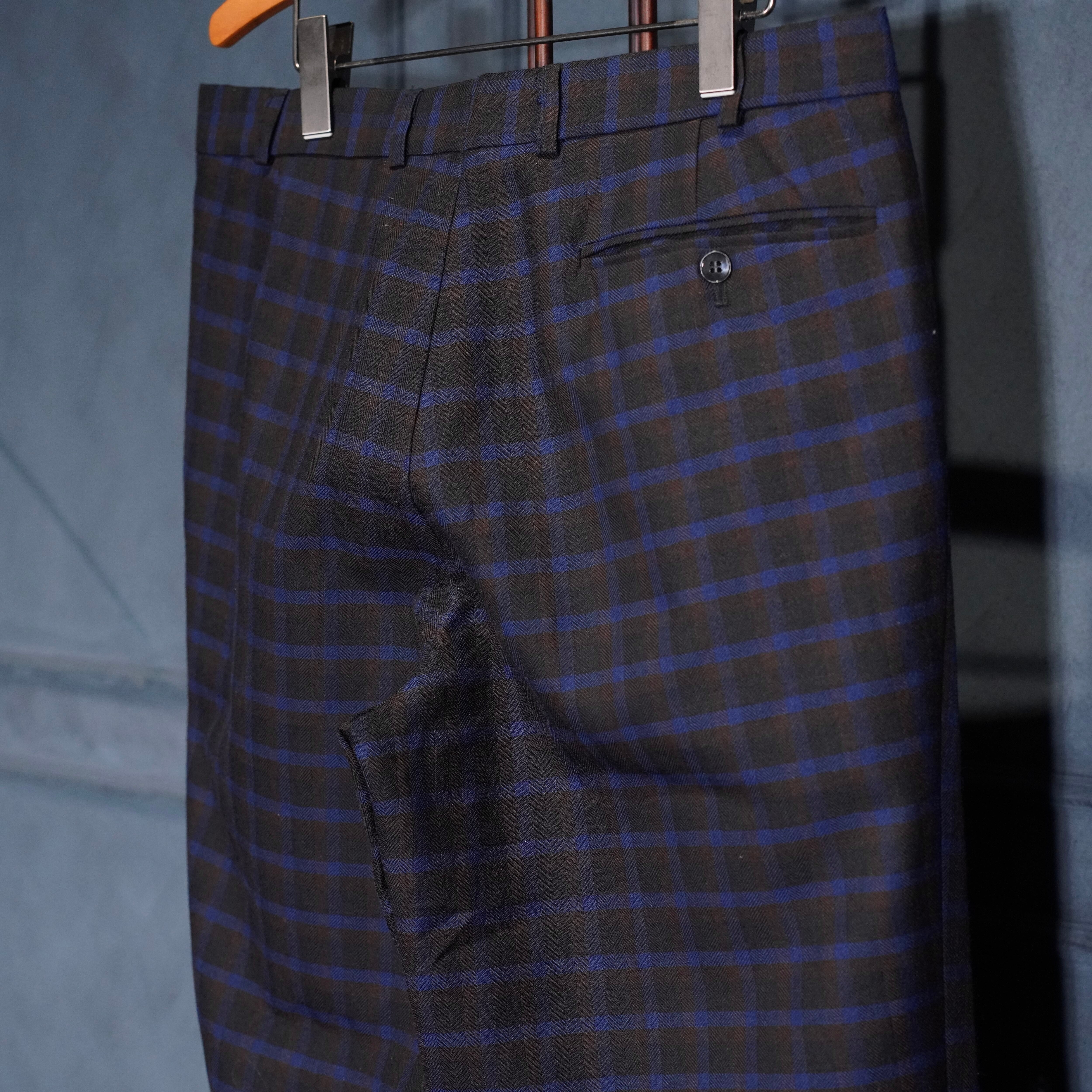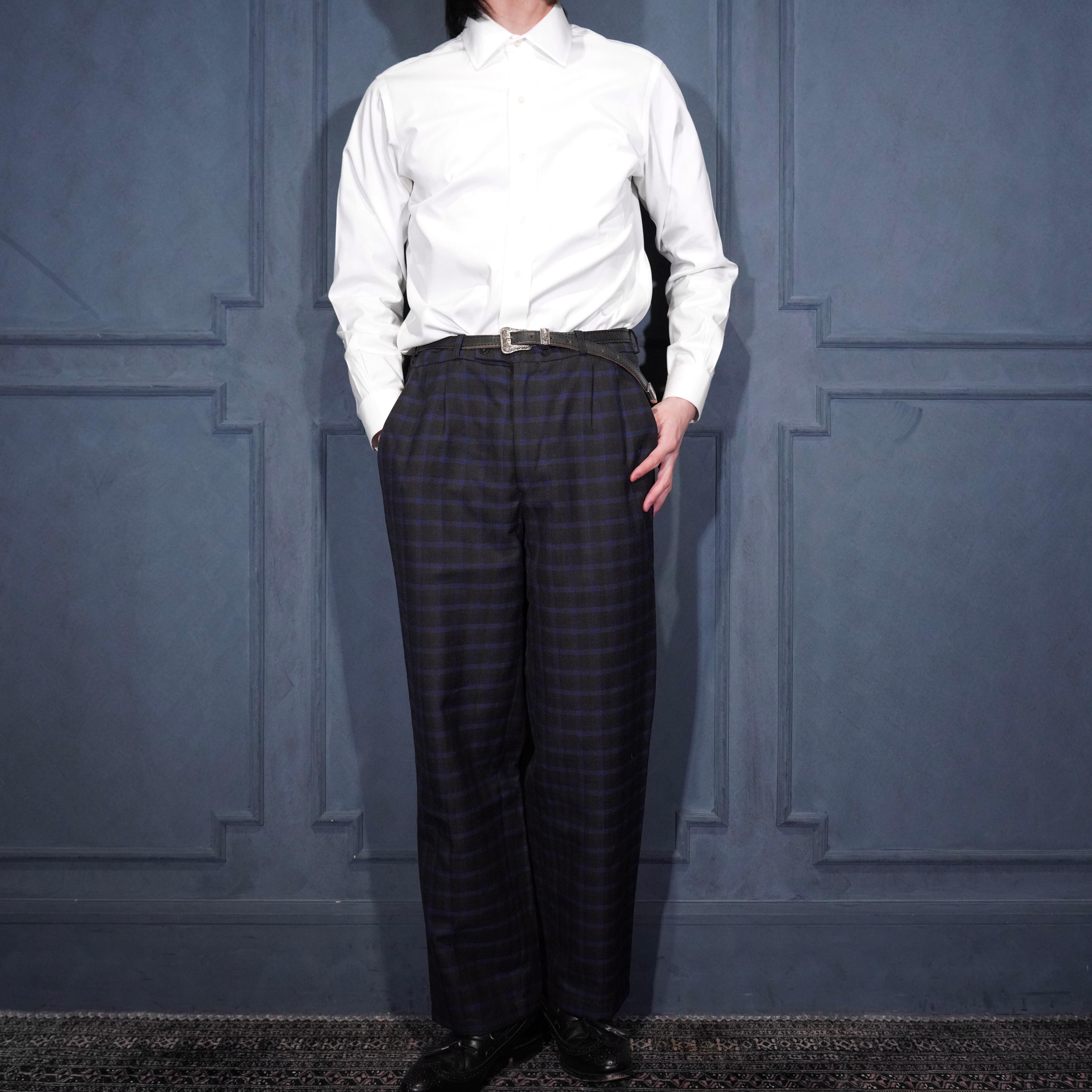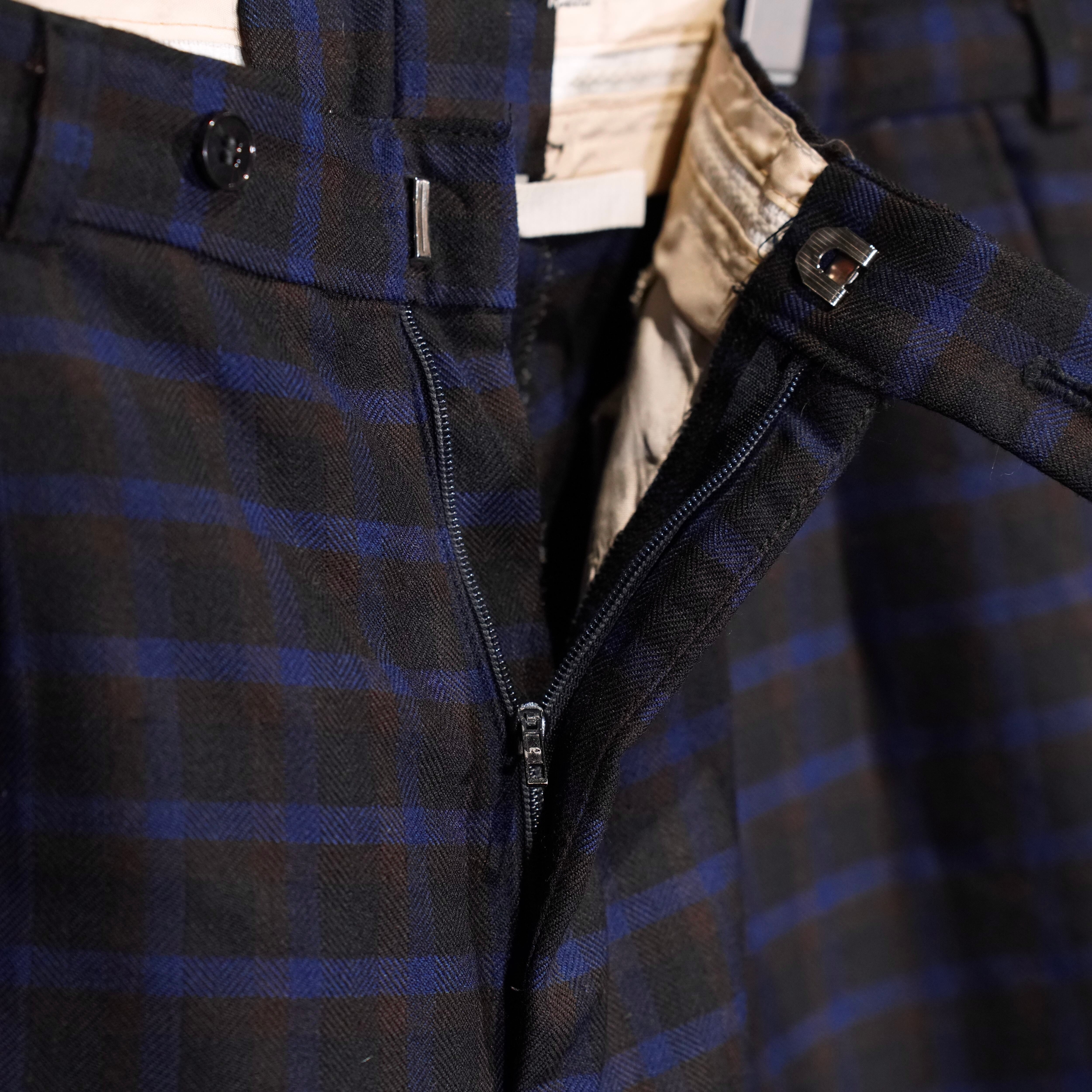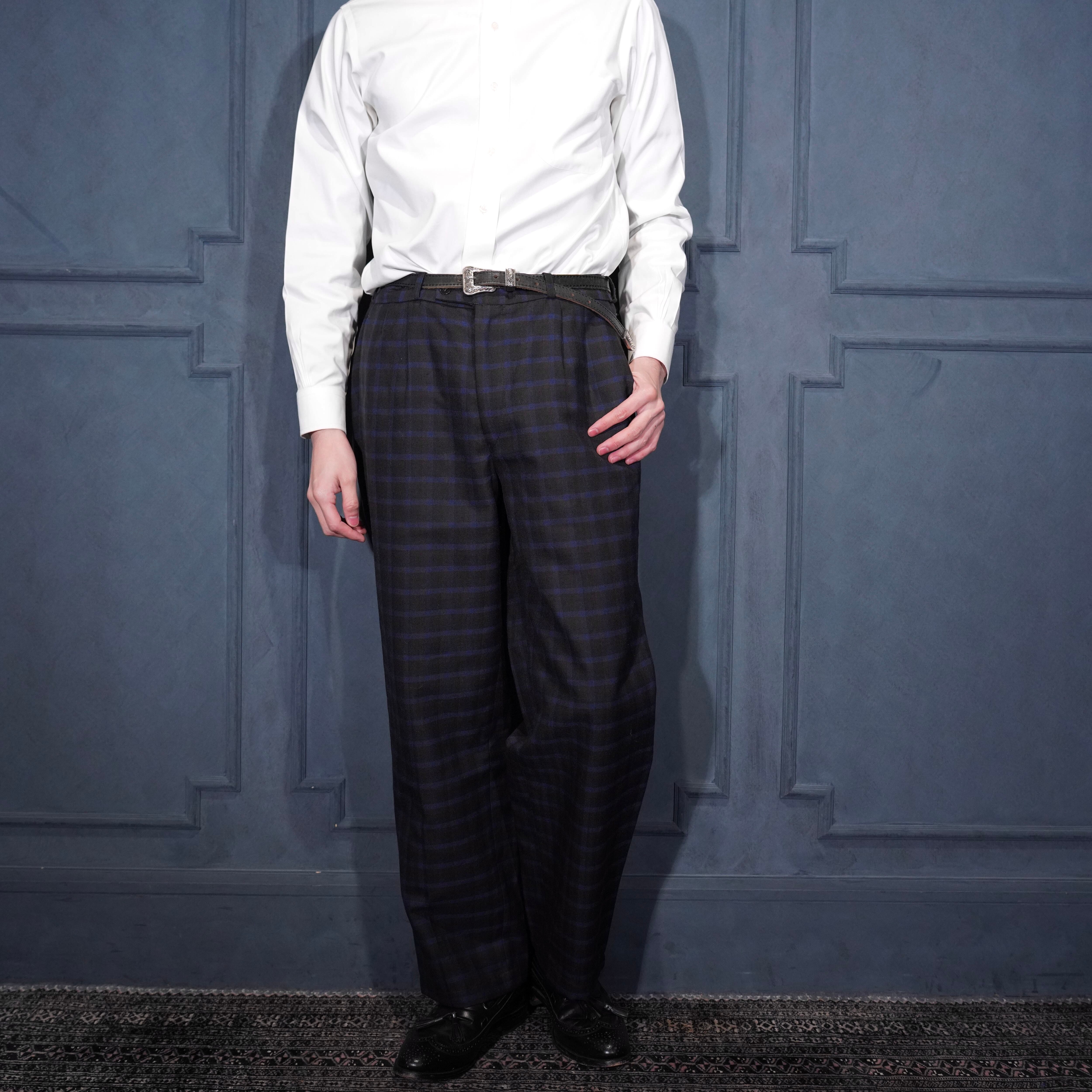 EU VINTAGE CHECK PATTERNED TUCK DESIGN SLACKS PANTS/ヨーロッパ古着チェック柄ダックデザインスラックス