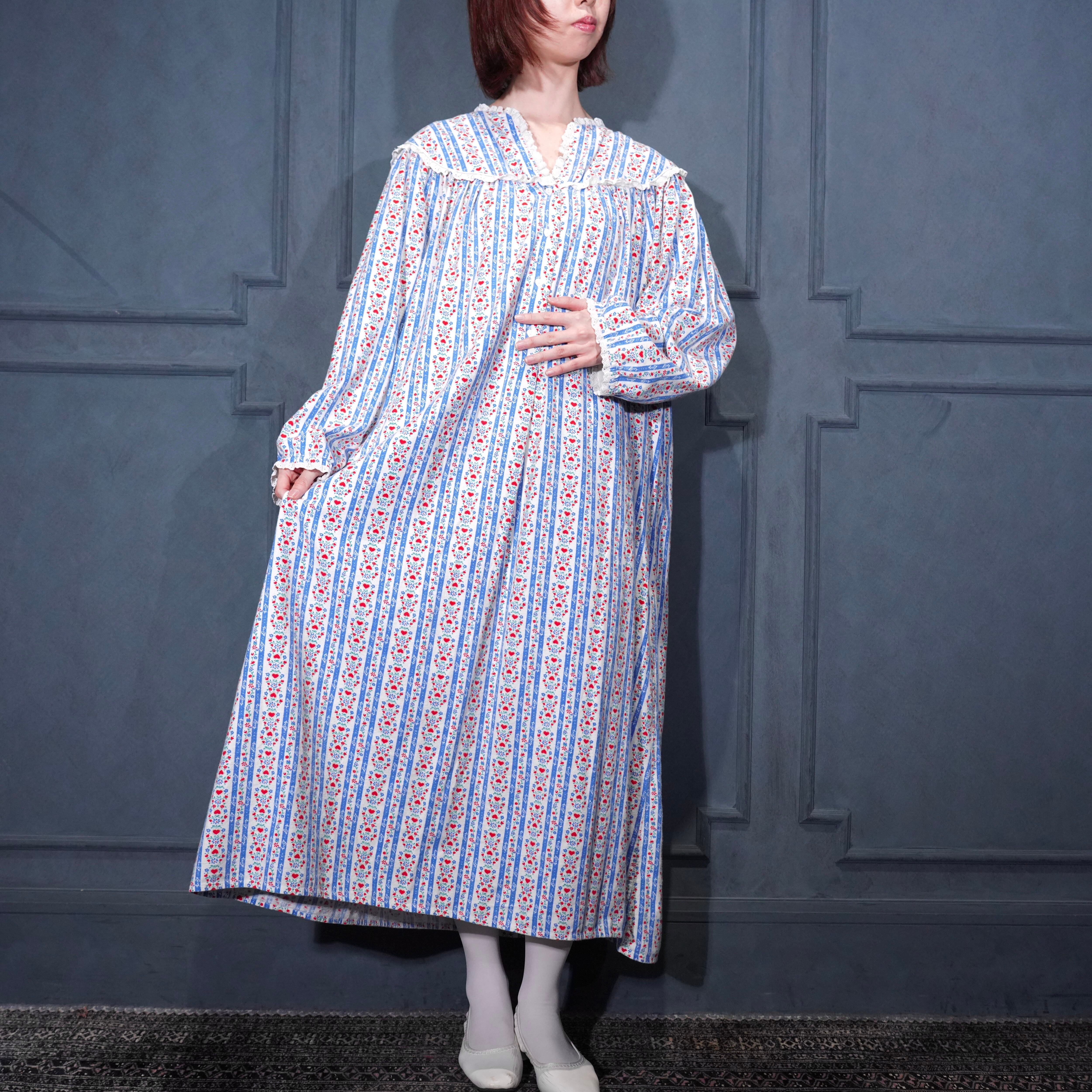 80’s EU VINTAGE Lanz of Salzburg HEART STRIPE PATTERNED HEART BUTTON DESIGN COTTON NIGHTY ONE PIECE/80年代ヨーロッパ古着ハートストライプ柄ハートボタンデザインコットンナイティワンピース